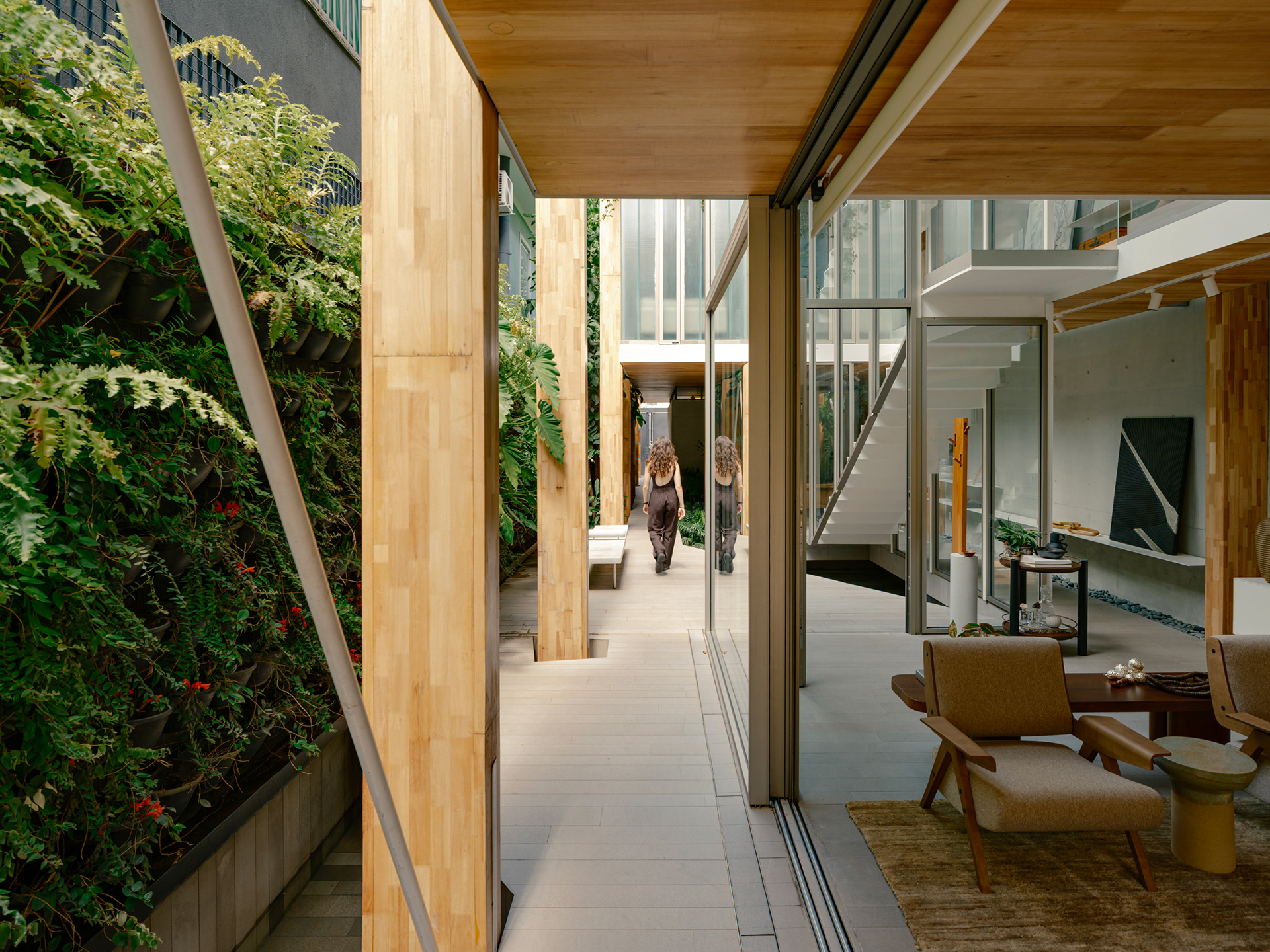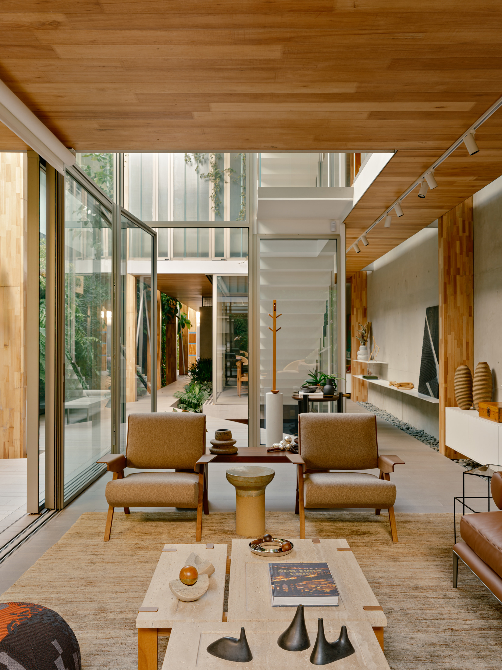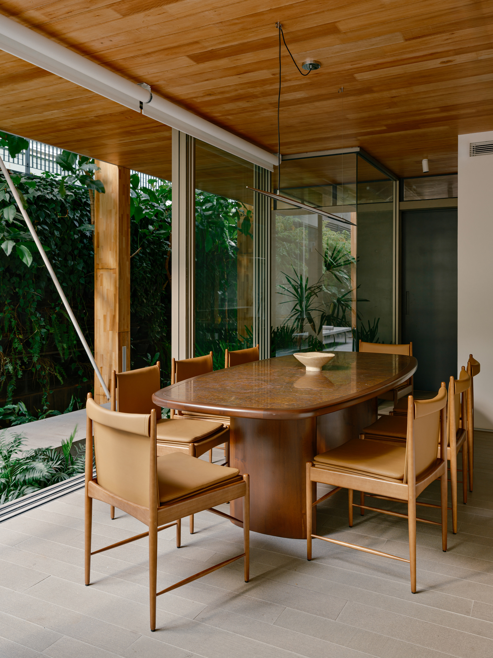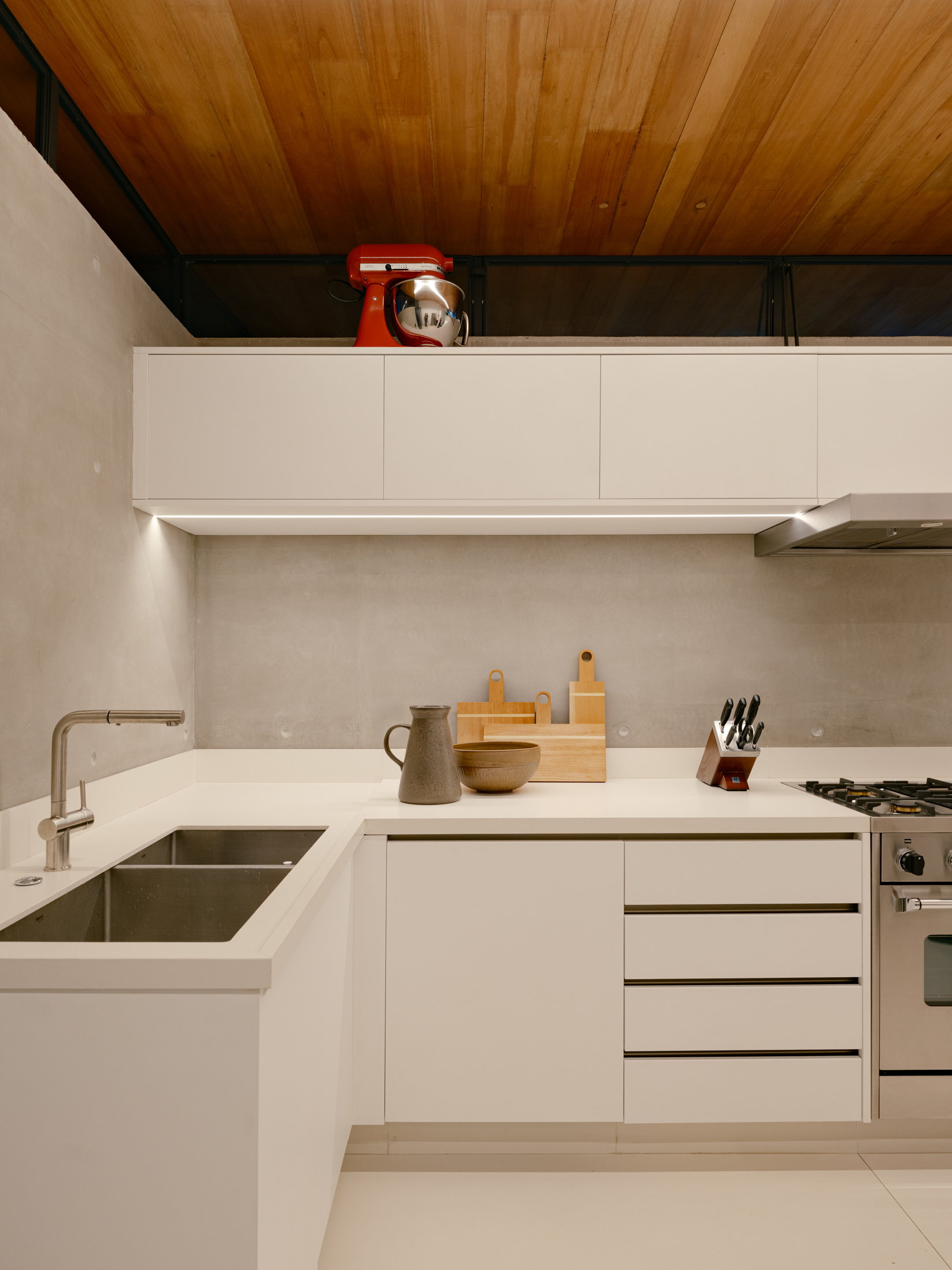 Os pórticos seguem por cima da casa e apoiam-se junto a uma parede de concreto aparente, que define o limite com o vizinho da esquerda. Os elementos de MLC são complementados com lajes CLT nos dois pavimentos superiores da casa. Tratadas para ficarem aparentes, as lajes ressaltam o sistema construtivo em quase todos os ambientes da casa.