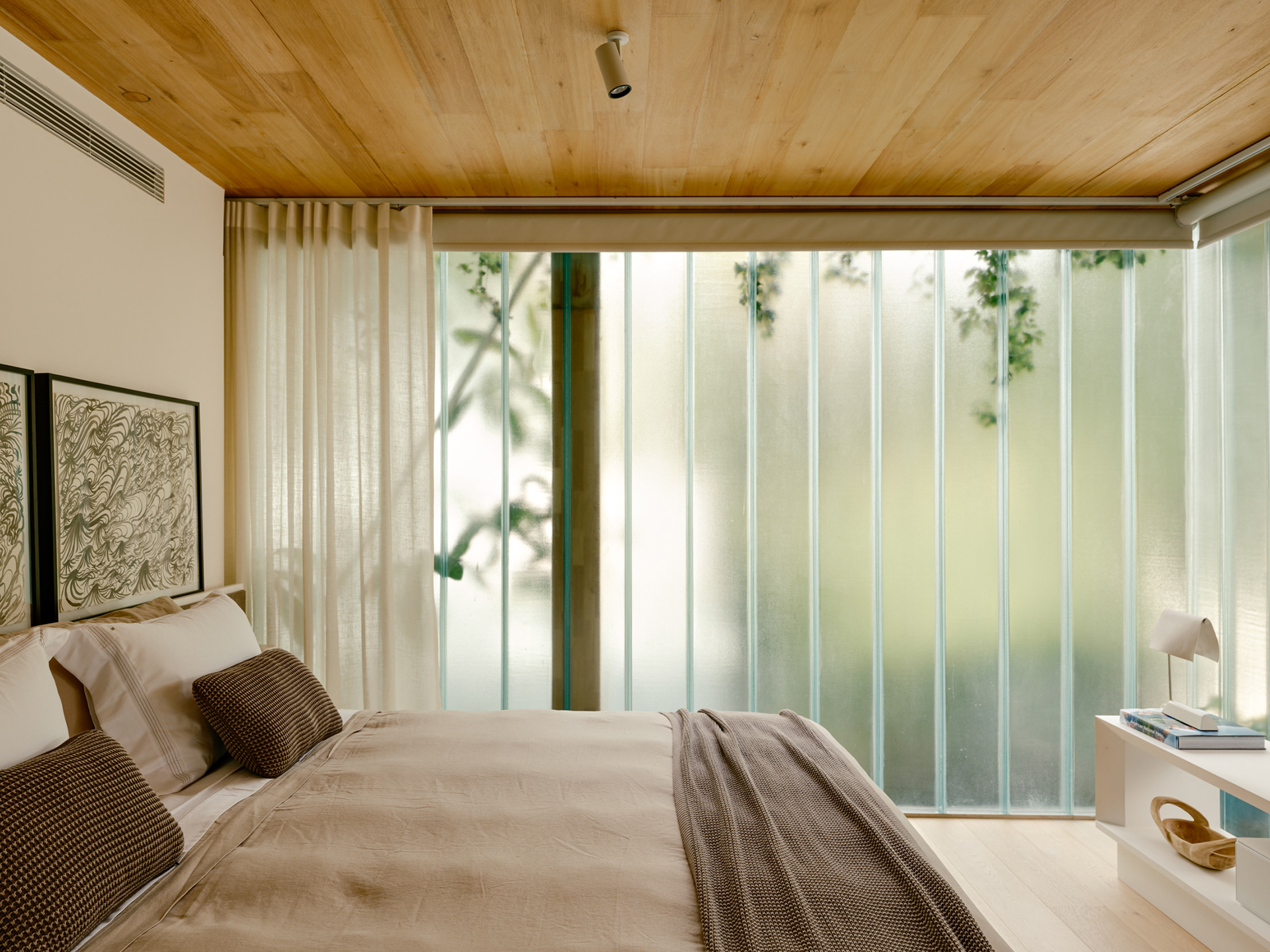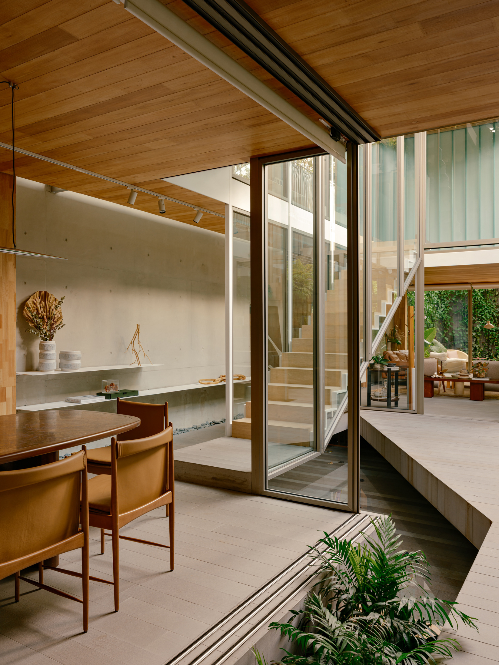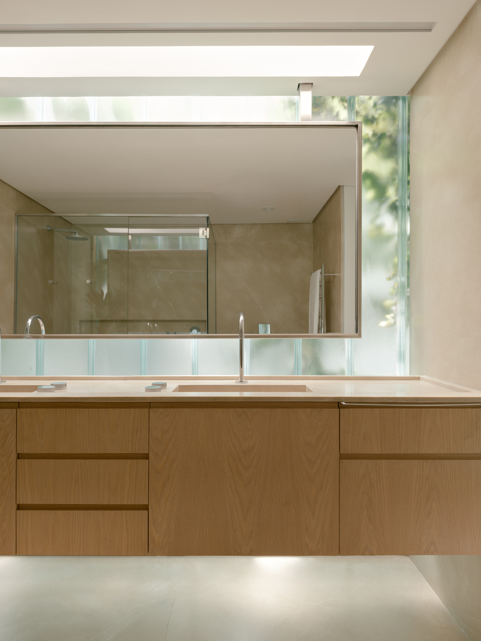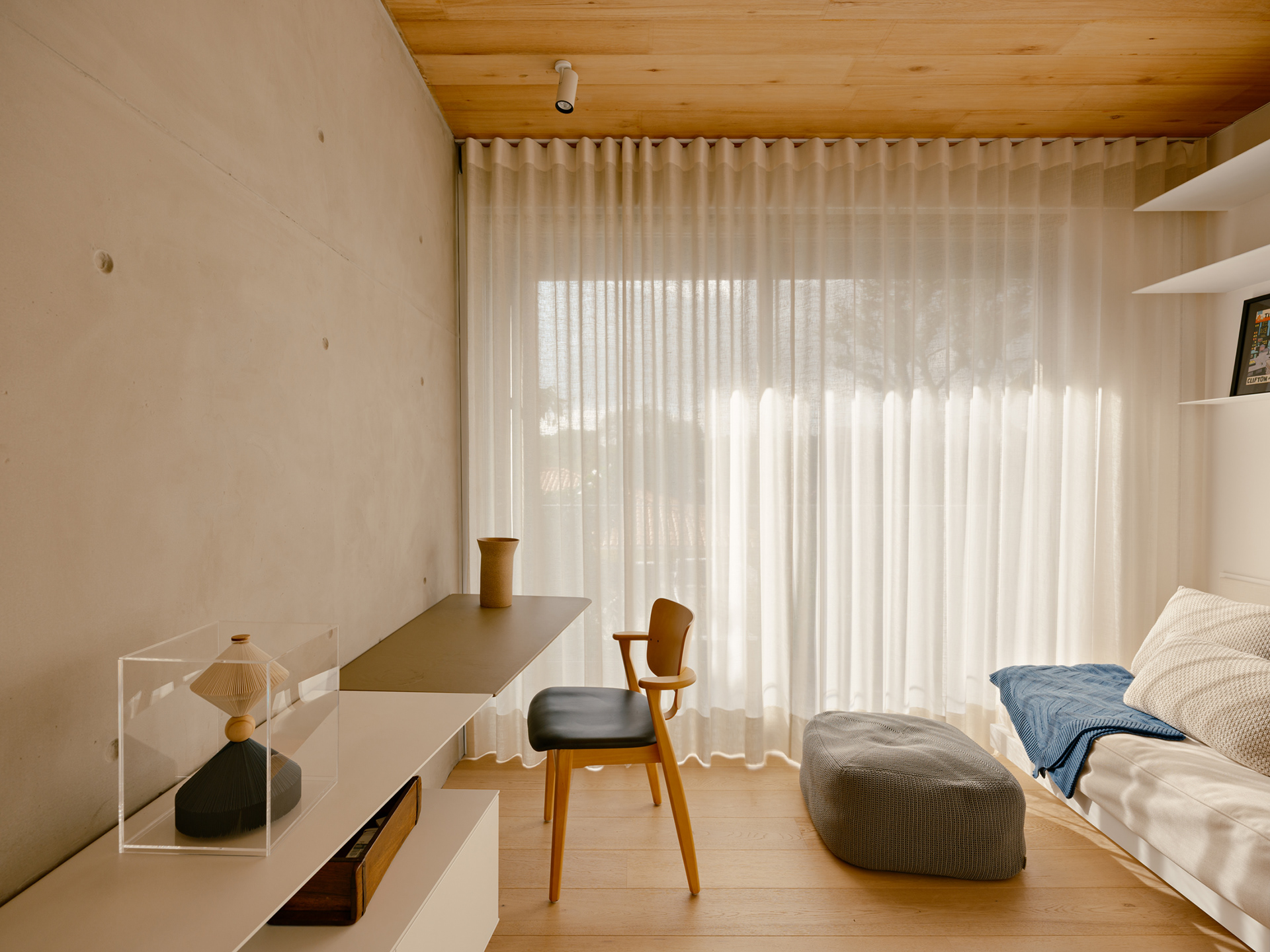 Os pórticos seguem por cima da casa e apoiam-se junto a uma parede de concreto aparente, que define o limite com o vizinho da esquerda. Os elementos de MLC são complementados com lajes CLT nos dois pavimentos superiores da casa. Tratadas para ficarem aparentes, as lajes ressaltam o sistema construtivo em quase todos os ambientes da casa.