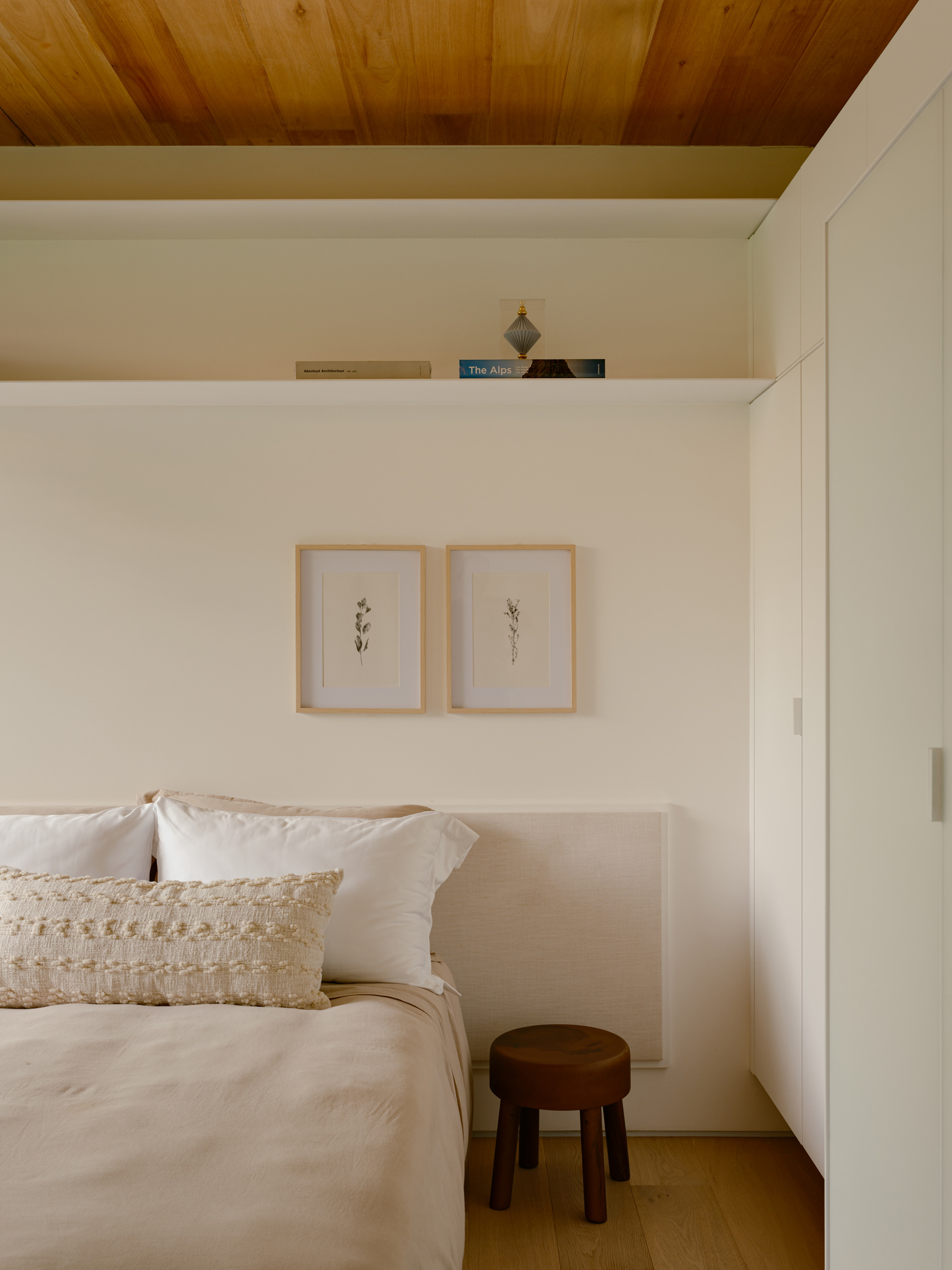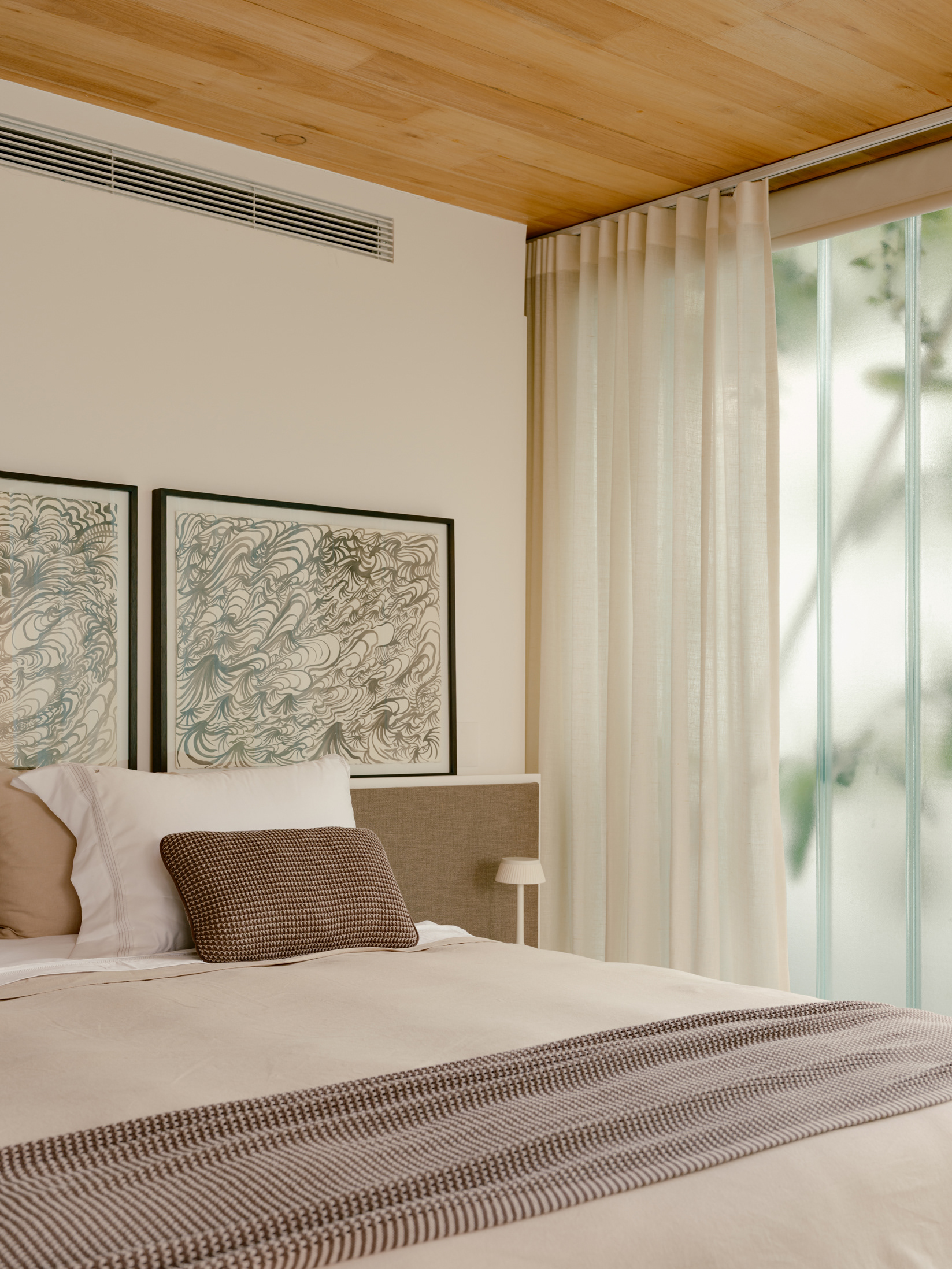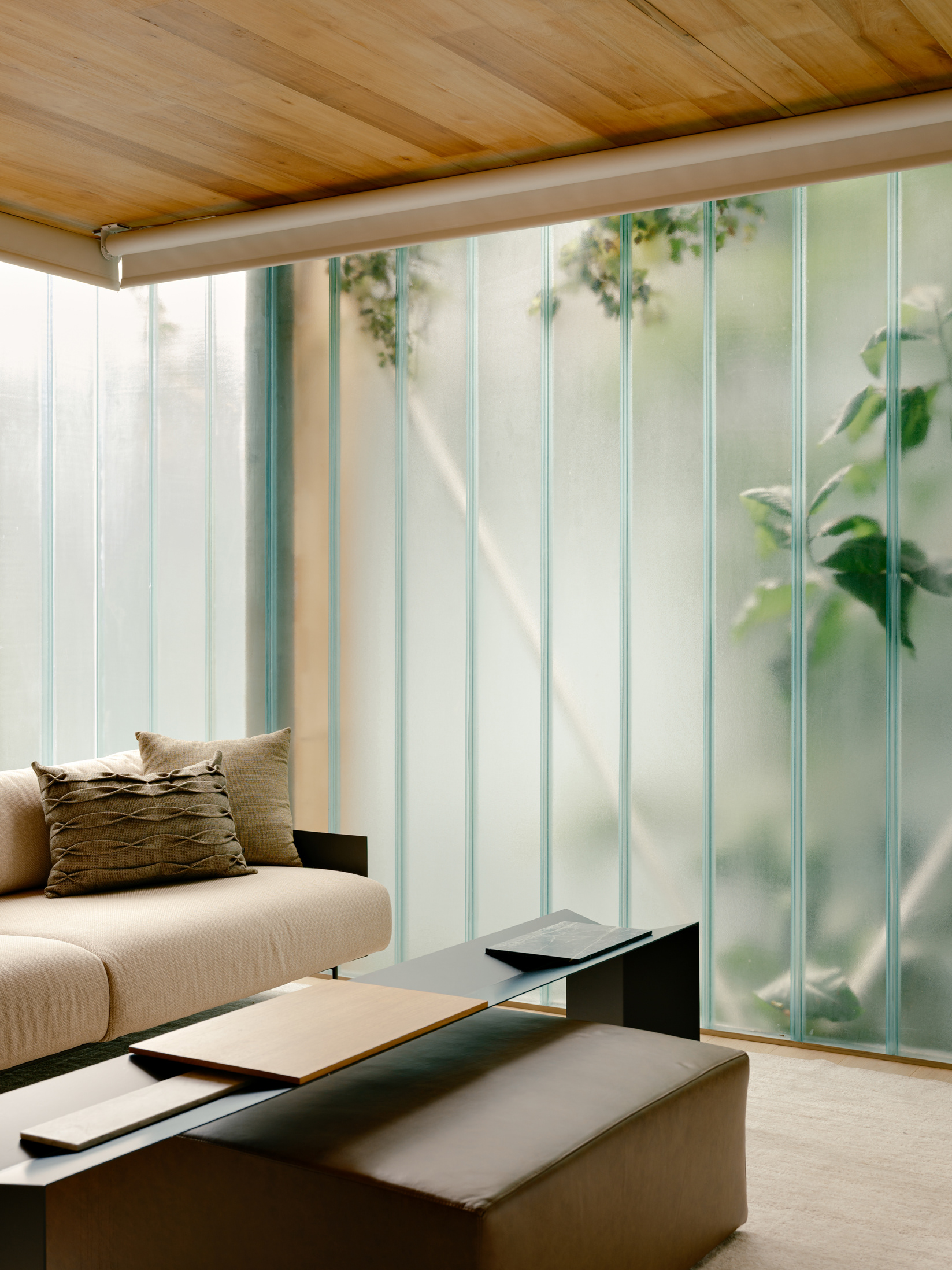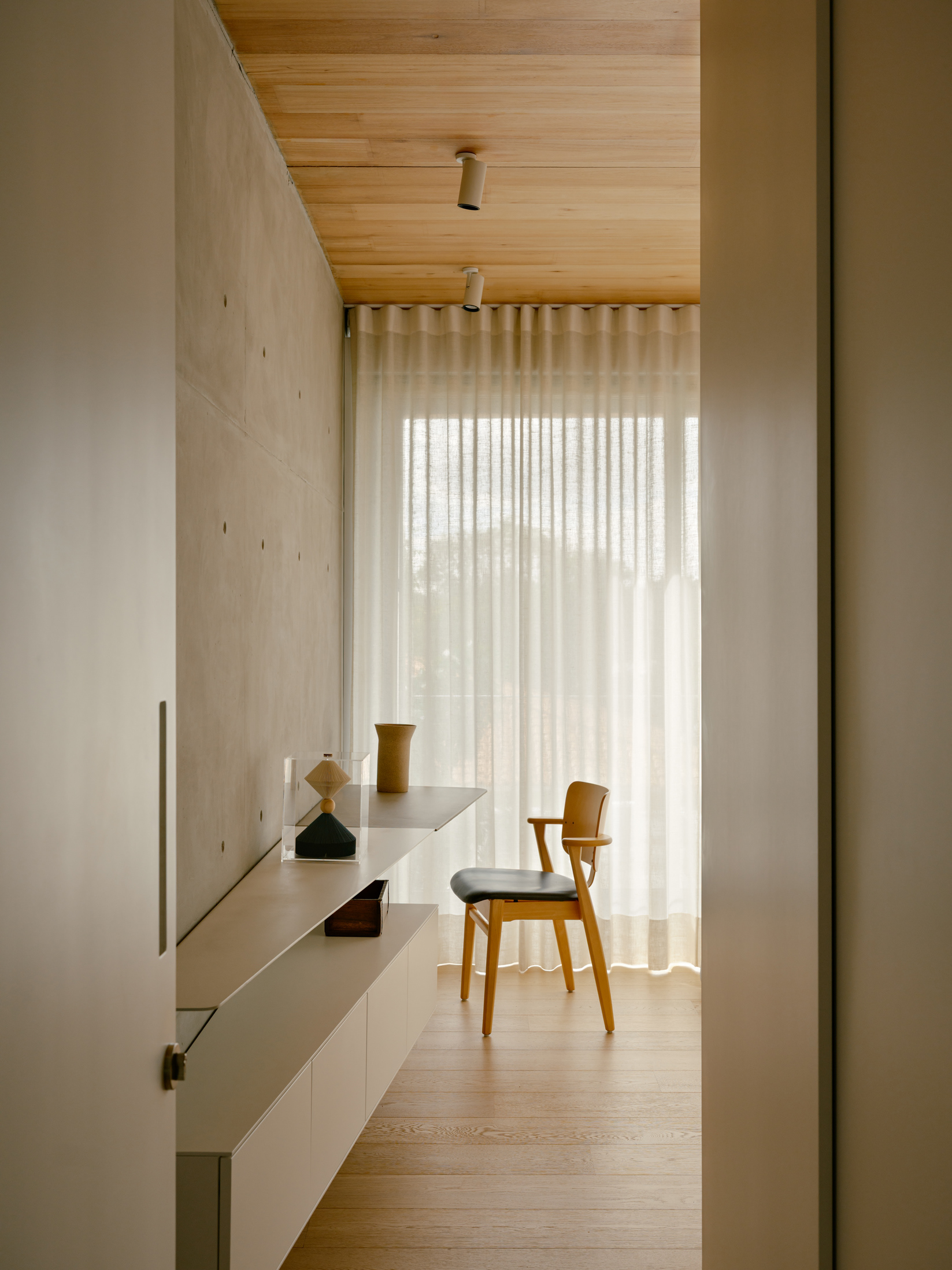 Os pórticos seguem por cima da casa e apoiam-se junto a uma parede de concreto aparente, que define o limite com o vizinho da esquerda. Os elementos de MLC são complementados com lajes CLT nos dois pavimentos superiores da casa. Tratadas para ficarem aparentes, as lajes ressaltam o sistema construtivo em quase todos os ambientes da casa.