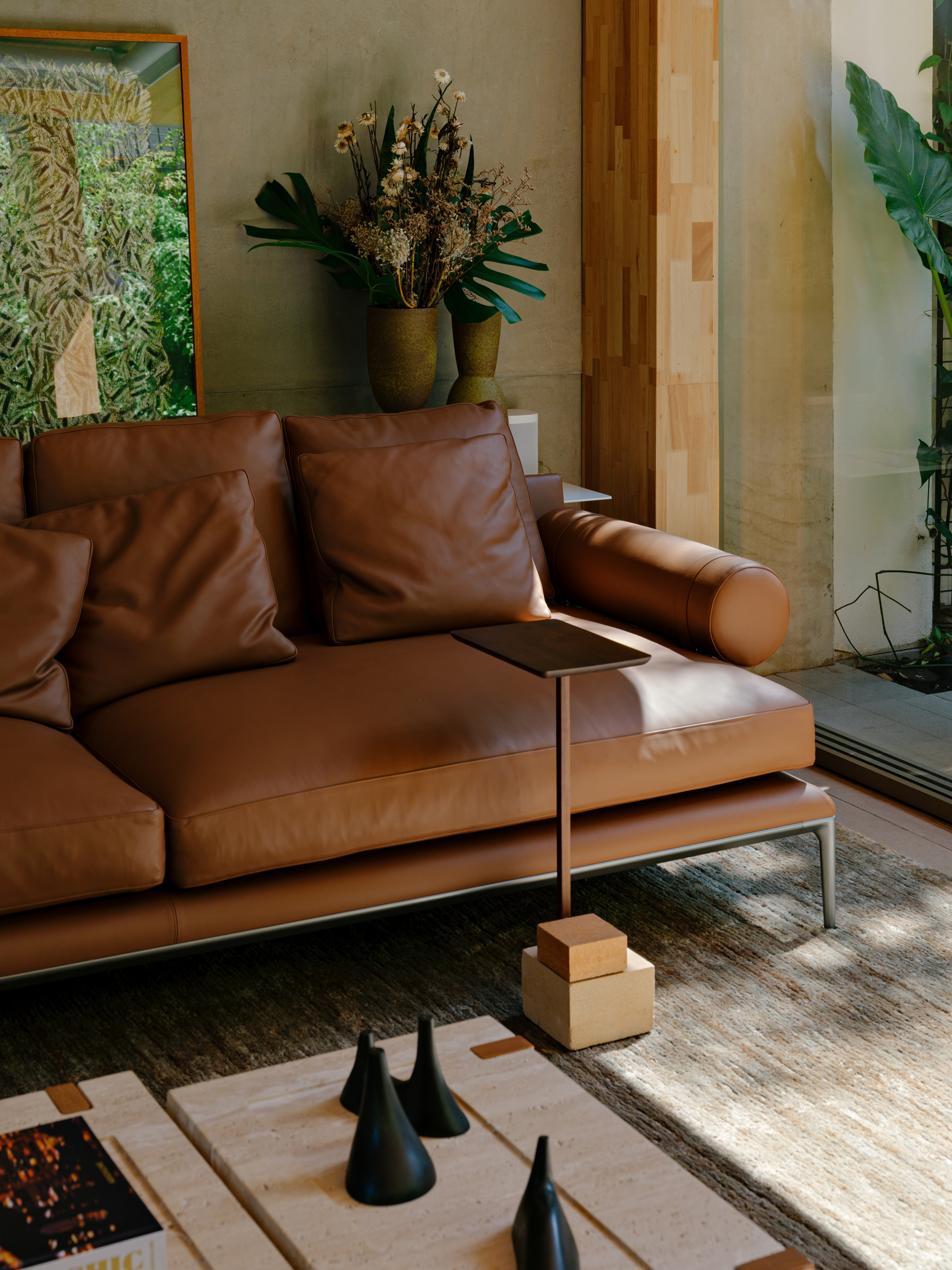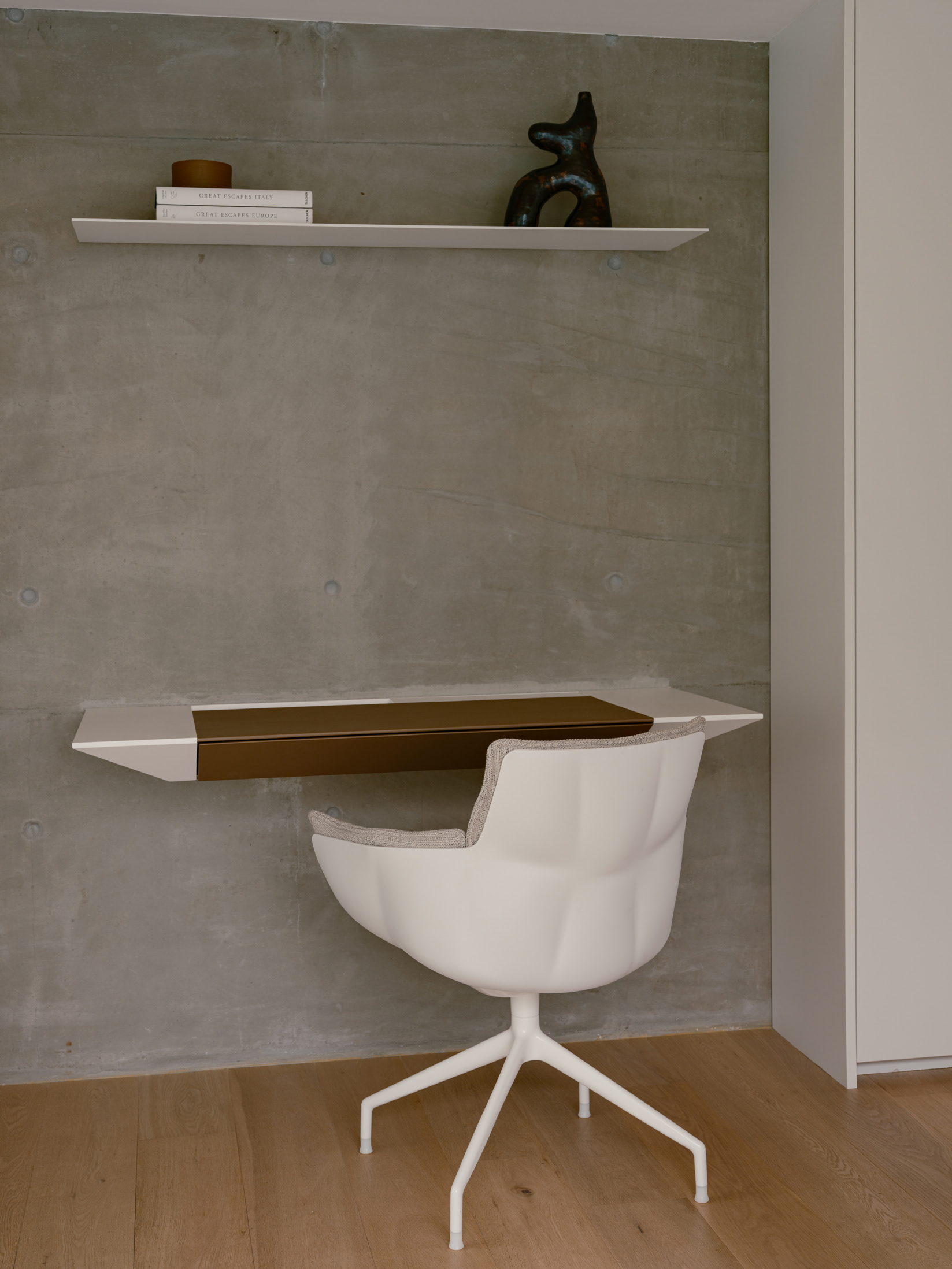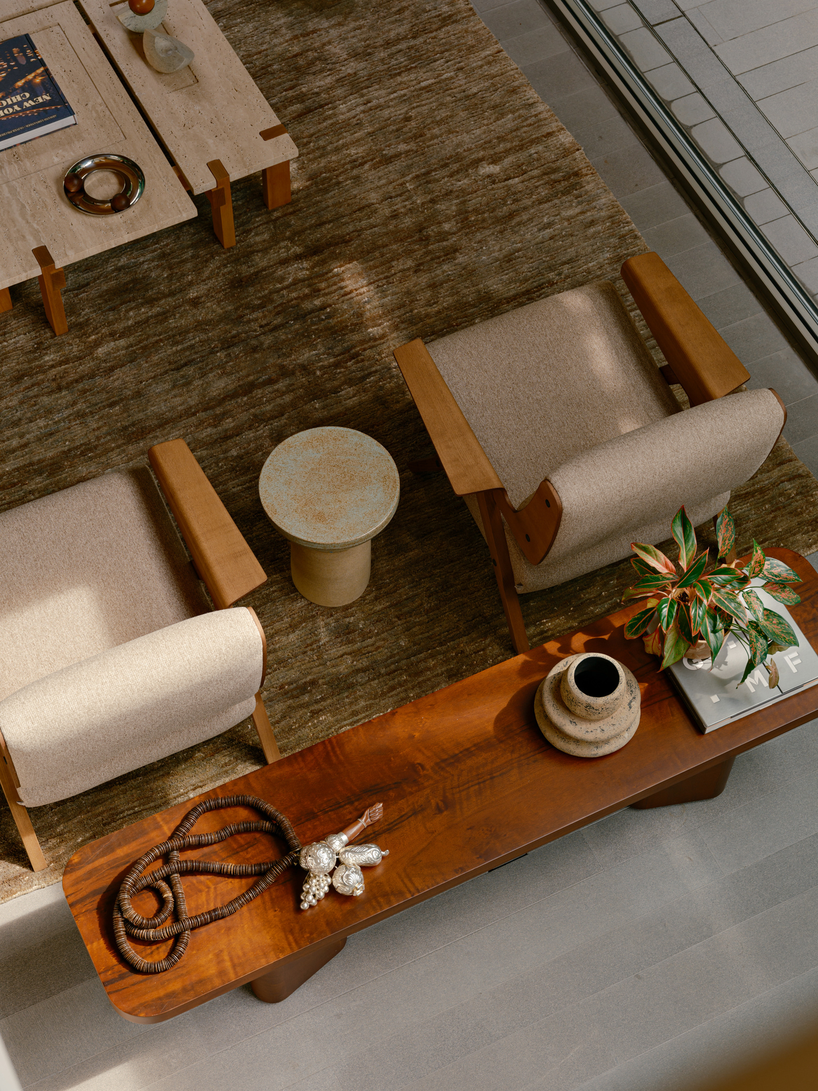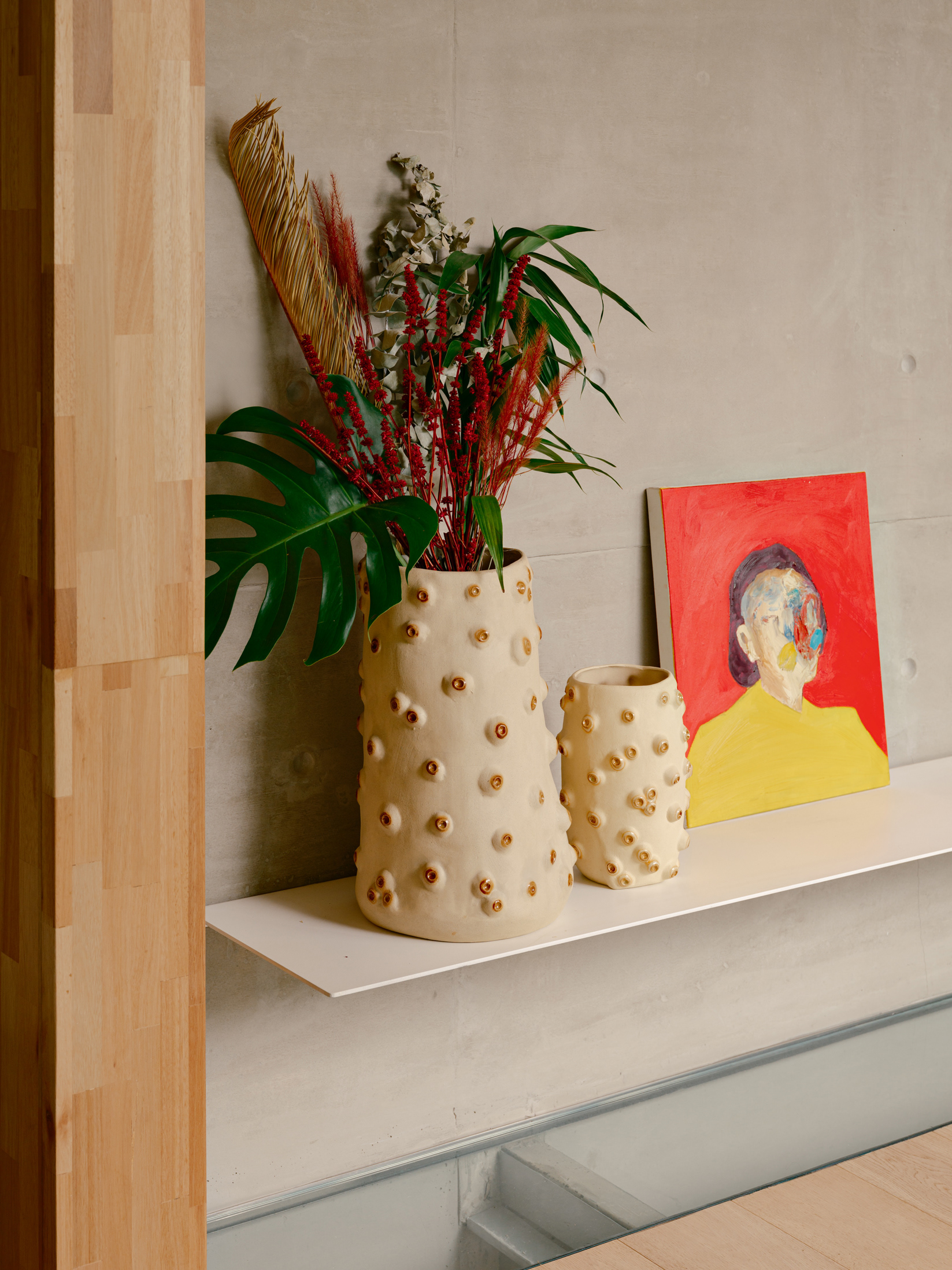 Os pórticos seguem por cima da casa e apoiam-se junto a uma parede de concreto aparente, que define o limite com o vizinho da esquerda. Os elementos de MLC são complementados com lajes CLT nos dois pavimentos superiores da casa. Tratadas para ficarem aparentes, as lajes ressaltam o sistema construtivo em quase todos os ambientes da casa.