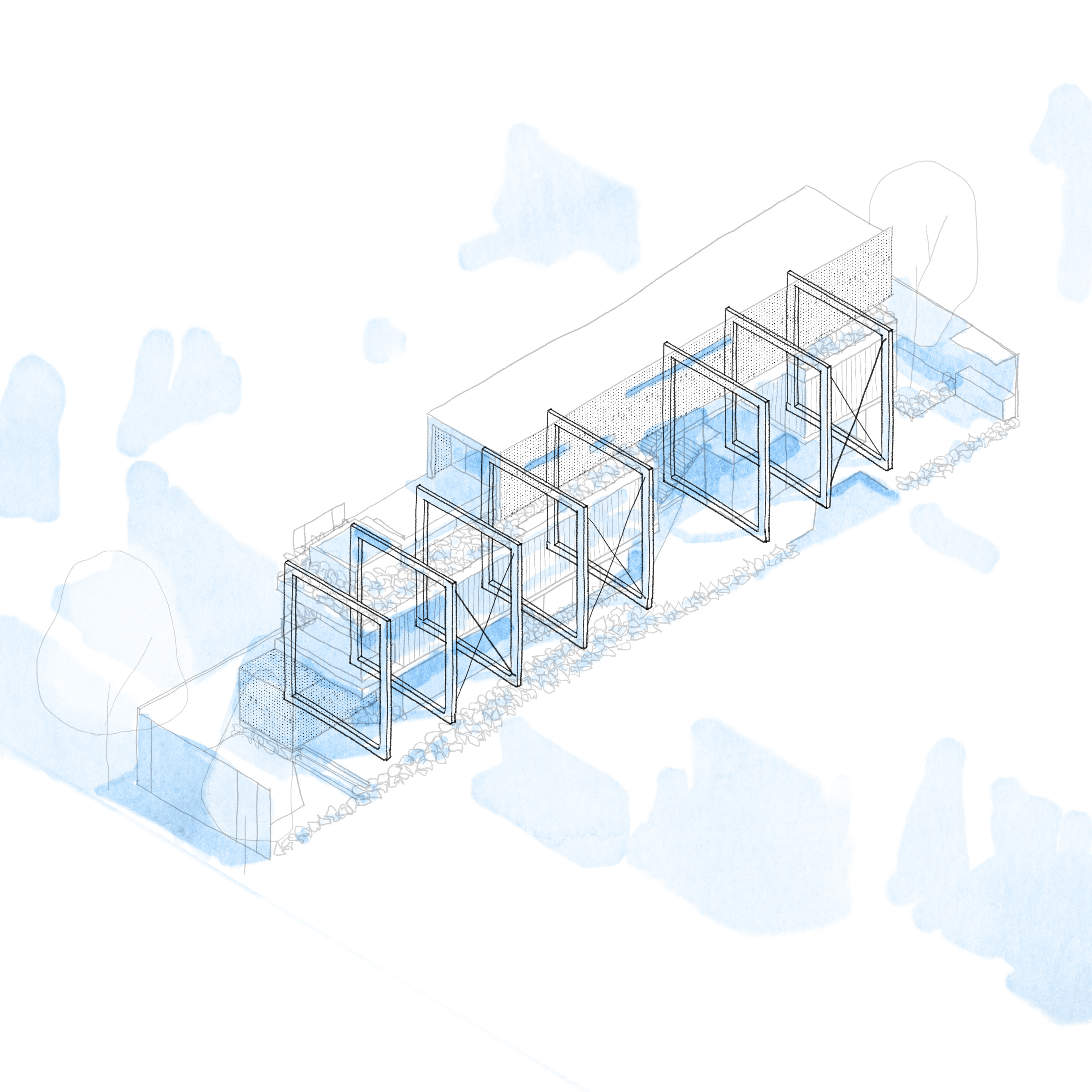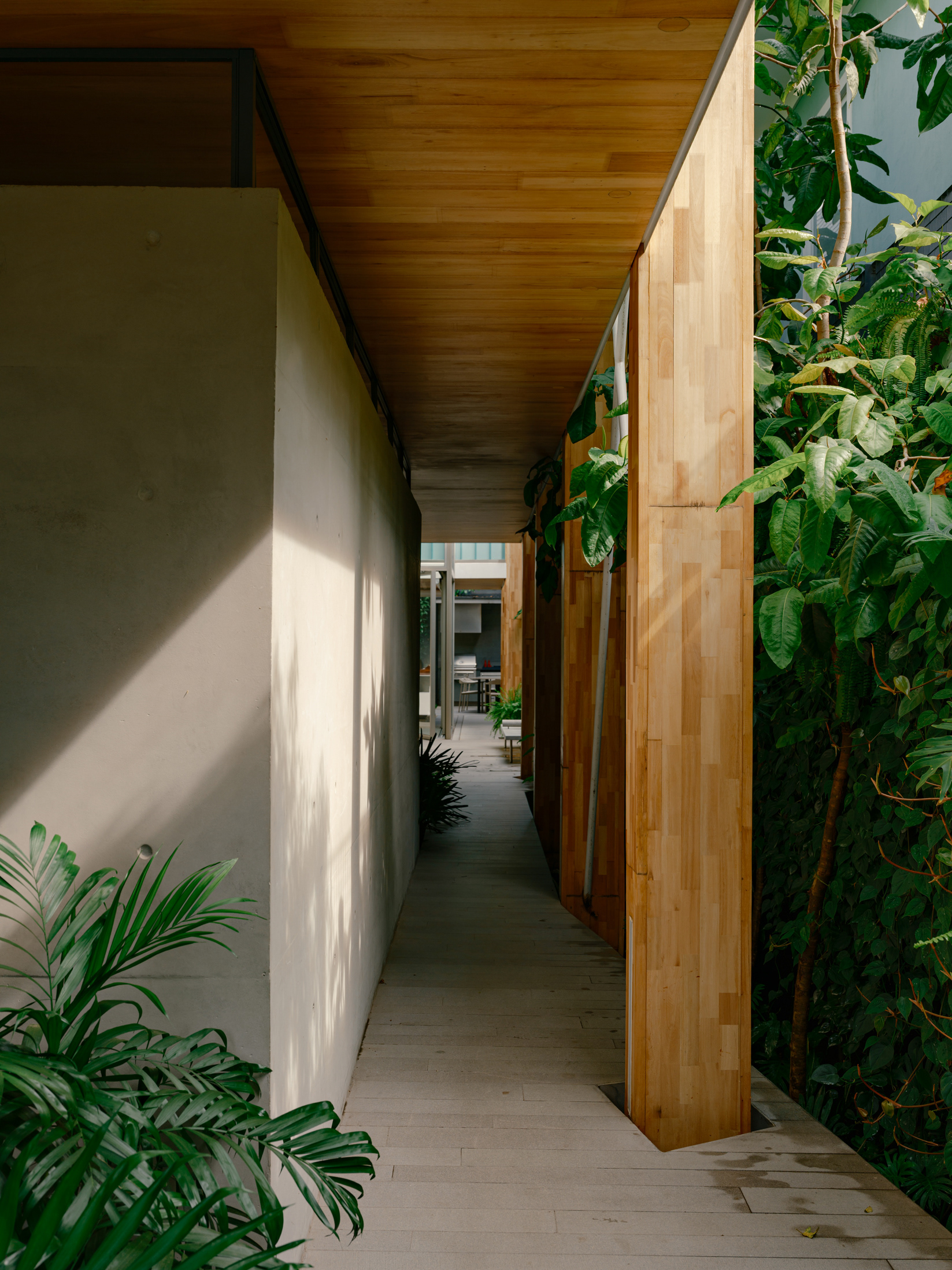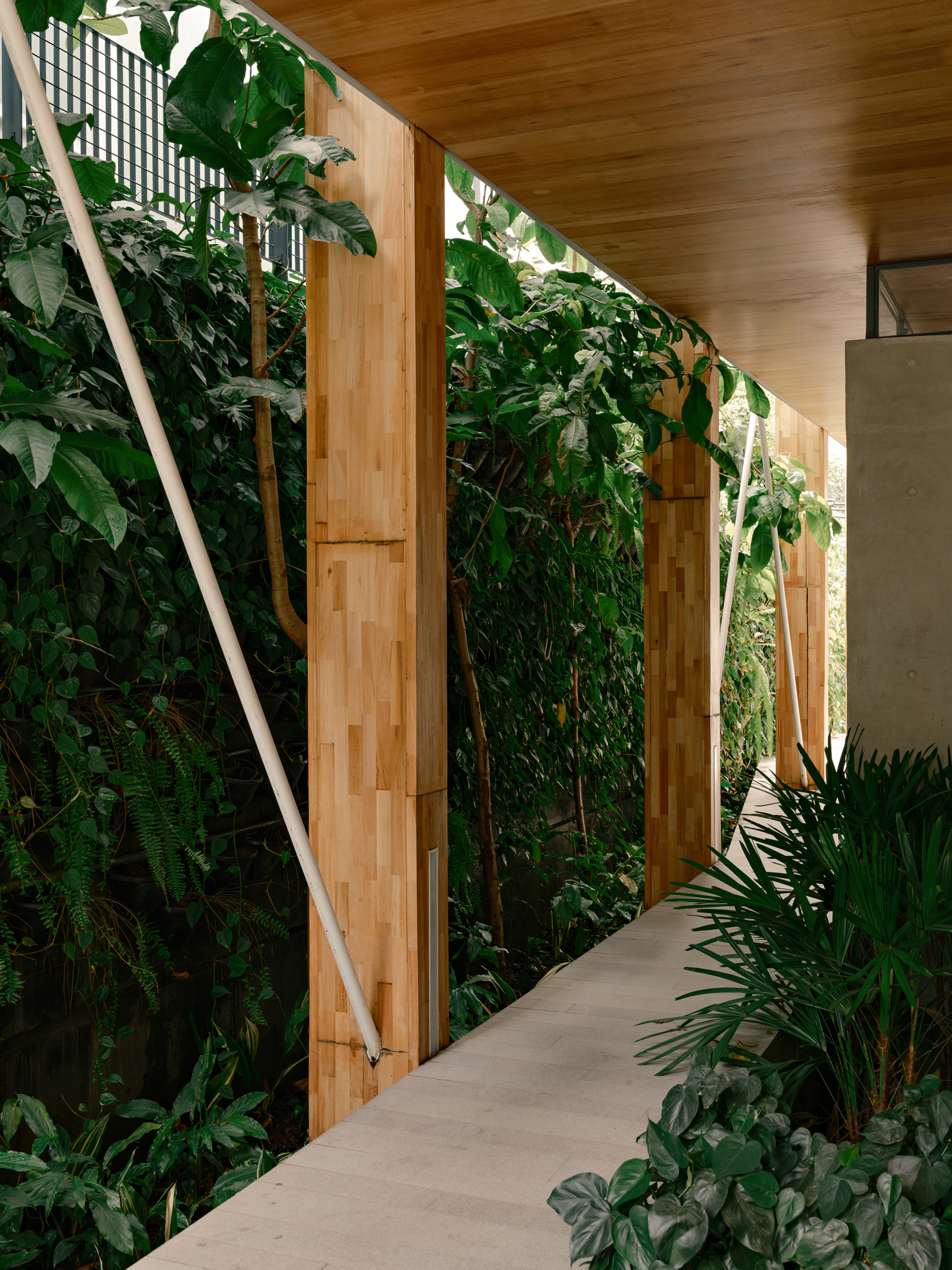 Uma sequência de pórticos em estrutura de madeira criam um ritmo no percurso, fazendo da madeira um material presente desde a entrada do visitante. Leves e espaçados, soltos do volume principal da casa, fazem parte tanto da casa quanto do jardim, definindo o percurso como um espaço de transição entre o dentro e o fora da casa. Tratam-se de elementos de MLC que, por ficarem expostos a intempéries, recebem uma capa de sacrifício também em madeira. O contraventamento dos pórticos é feito em hastes de aço, o que permite que a solução estrutural seja uma parte fundamental da linguagem arquitetônica da casa.