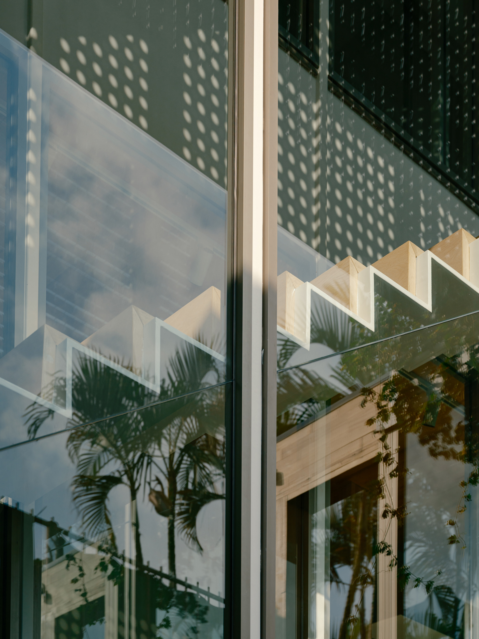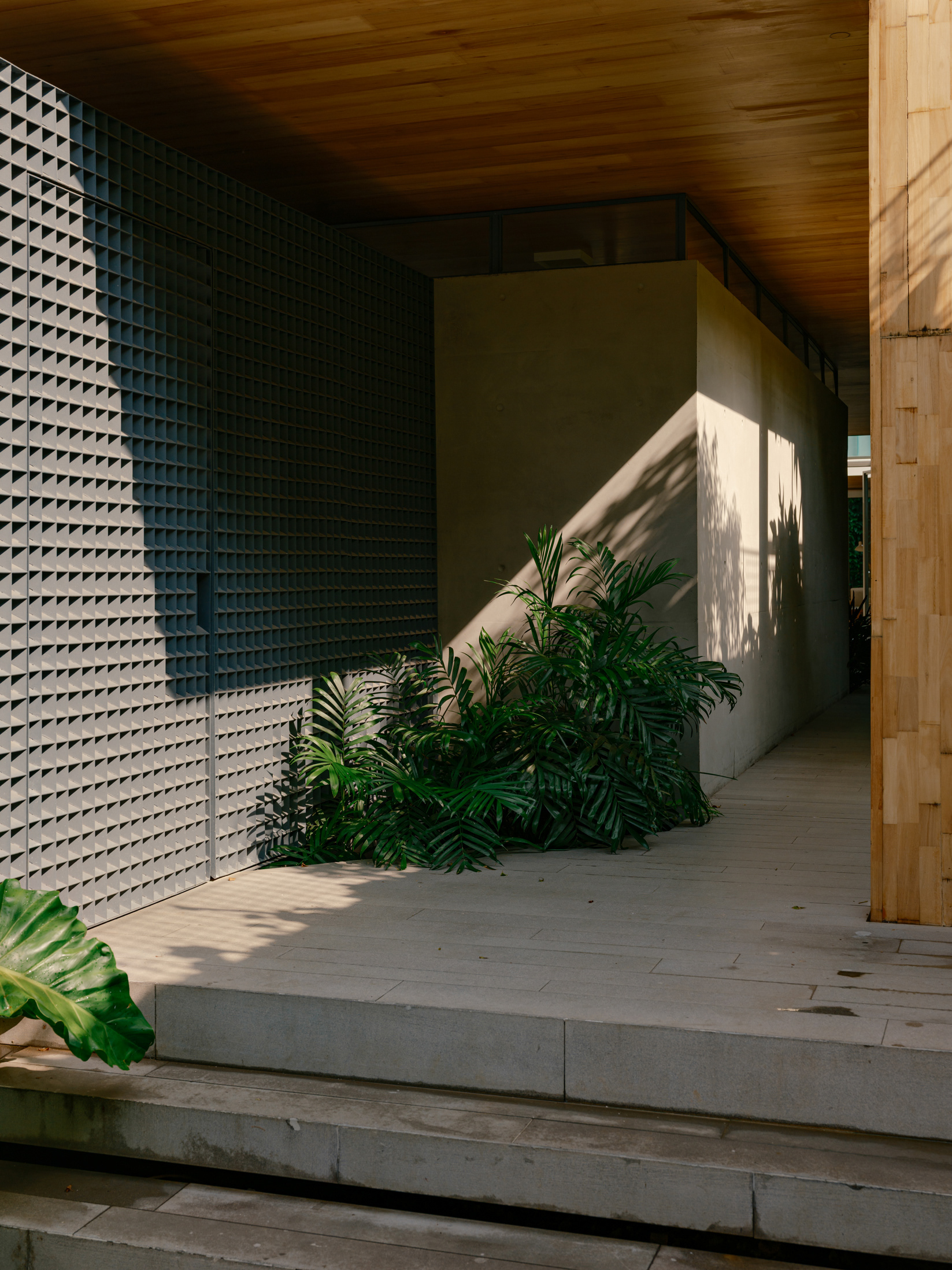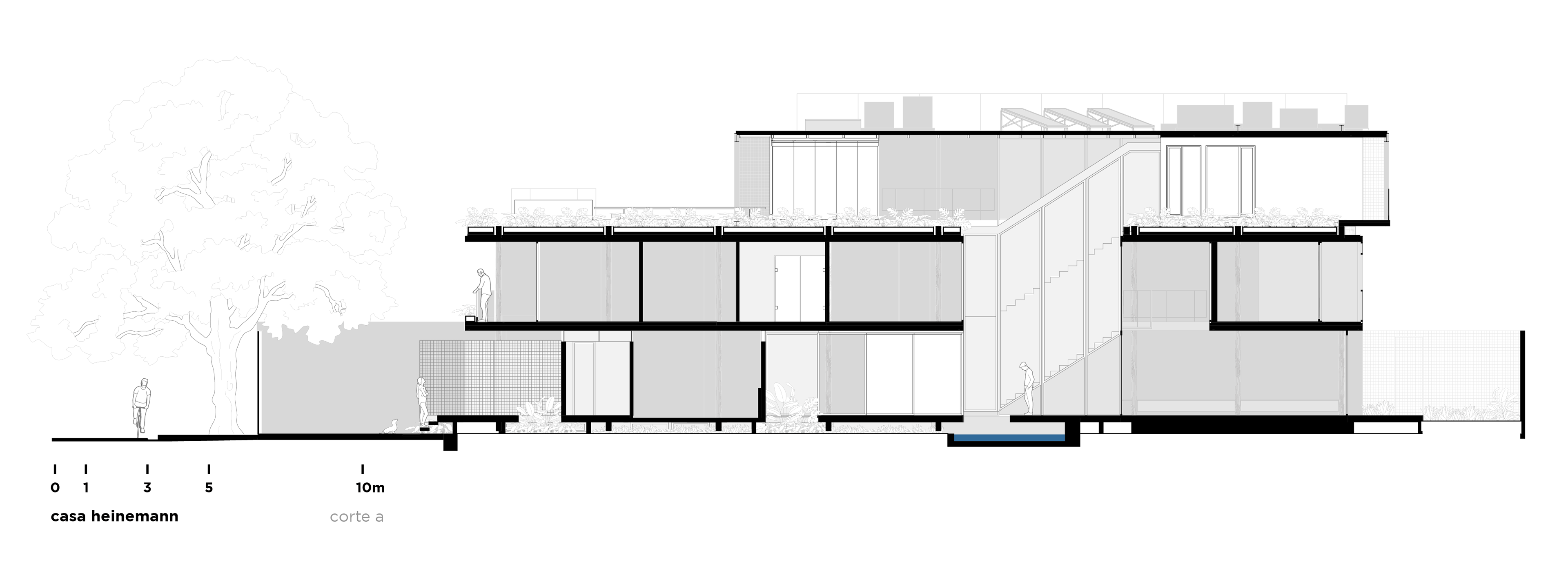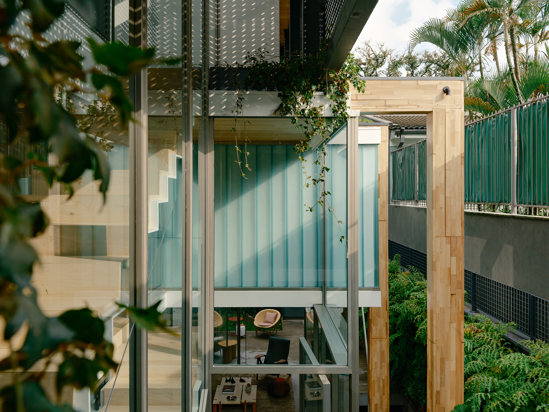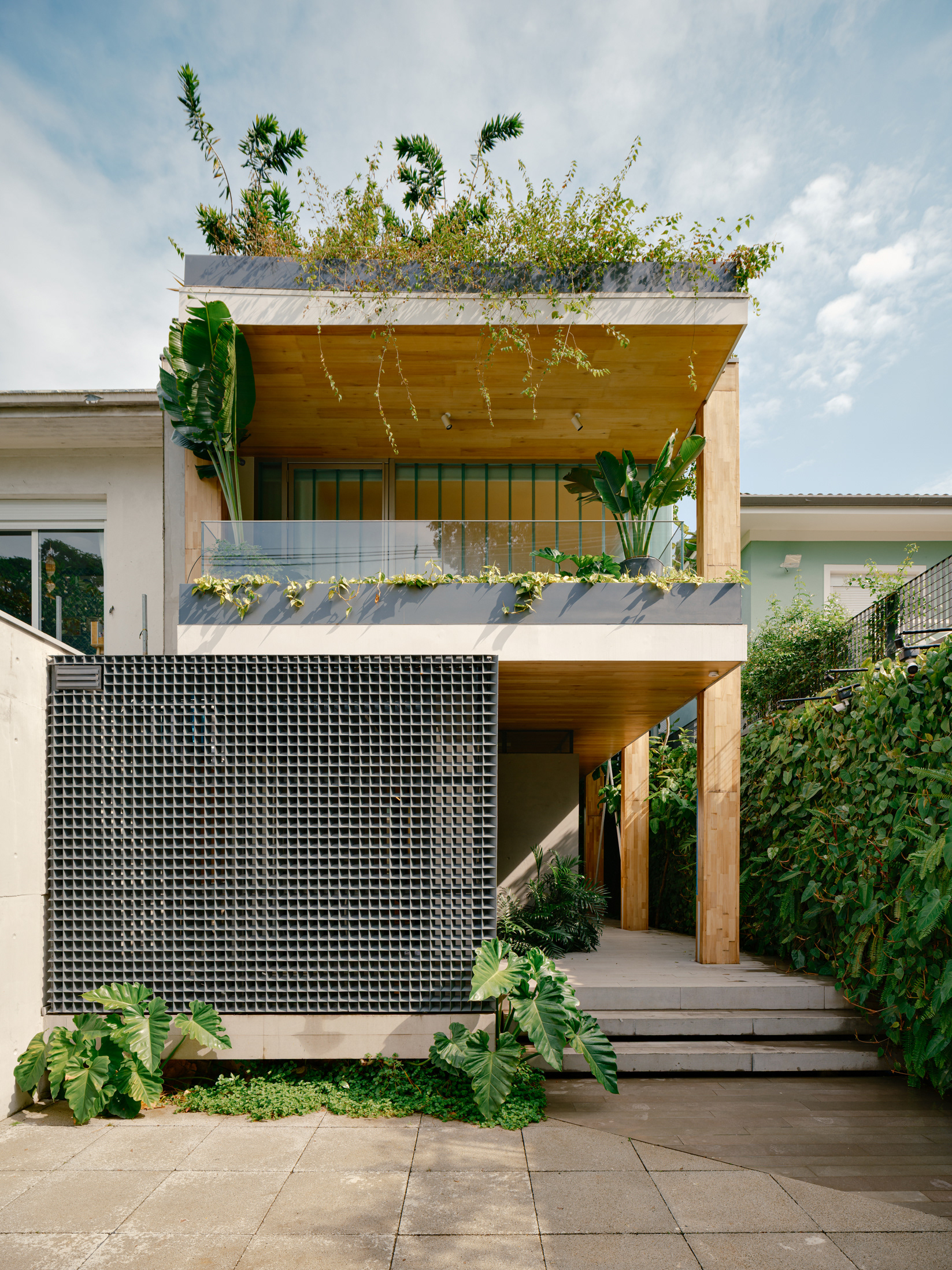 Composta de 3 pavimentos, o último pavimento acomoda um espaço de lazer com um spa na altura das árvores da rua. Protegido da insolação por um cobogó metálico, este pavimento se apoia sobre o pórtico de madeira e constitui um elemento à parte dos dois pavimentos logo abaixo.