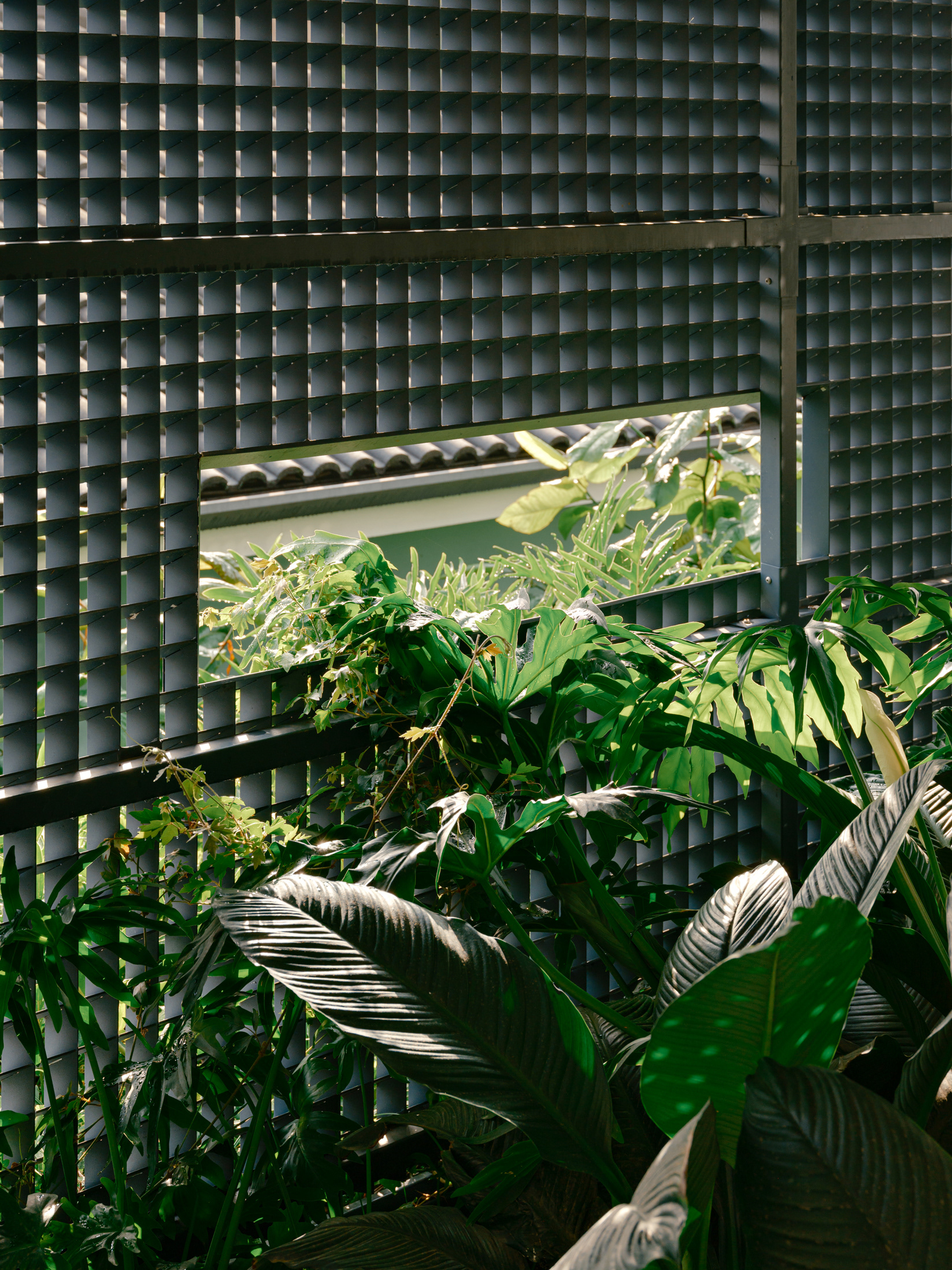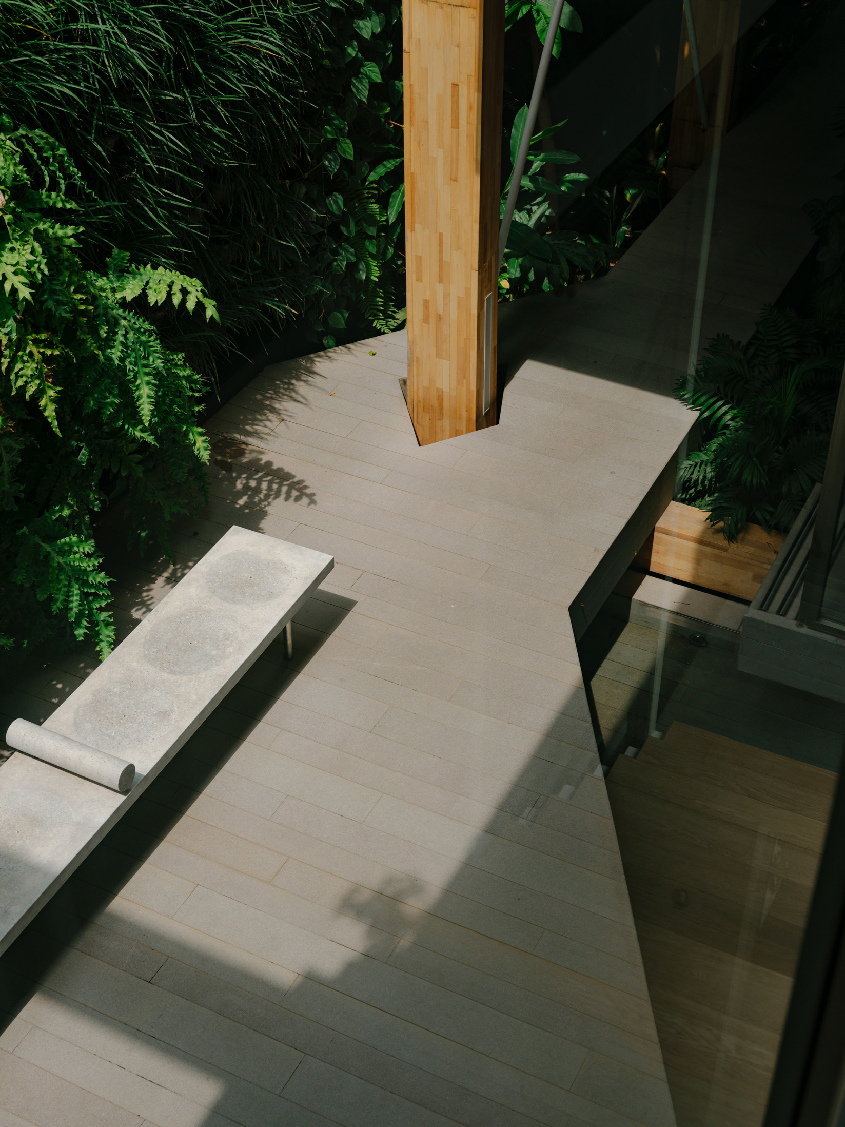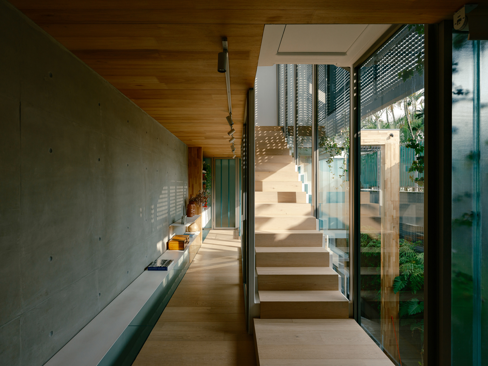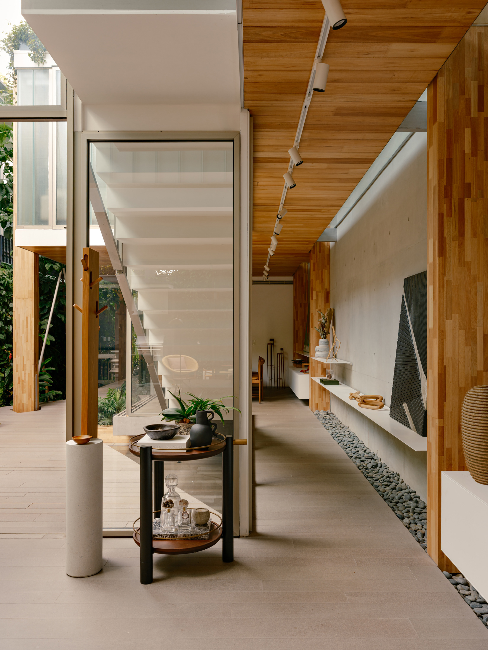 Composta de 3 pavimentos, o último pavimento acomoda um espaço de lazer com um spa na altura das árvores da rua. Protegido da insolação por um cobogó metálico, este pavimento se apoia sobre o pórtico de madeira e constitui um elemento à parte dos dois pavimentos logo abaixo.