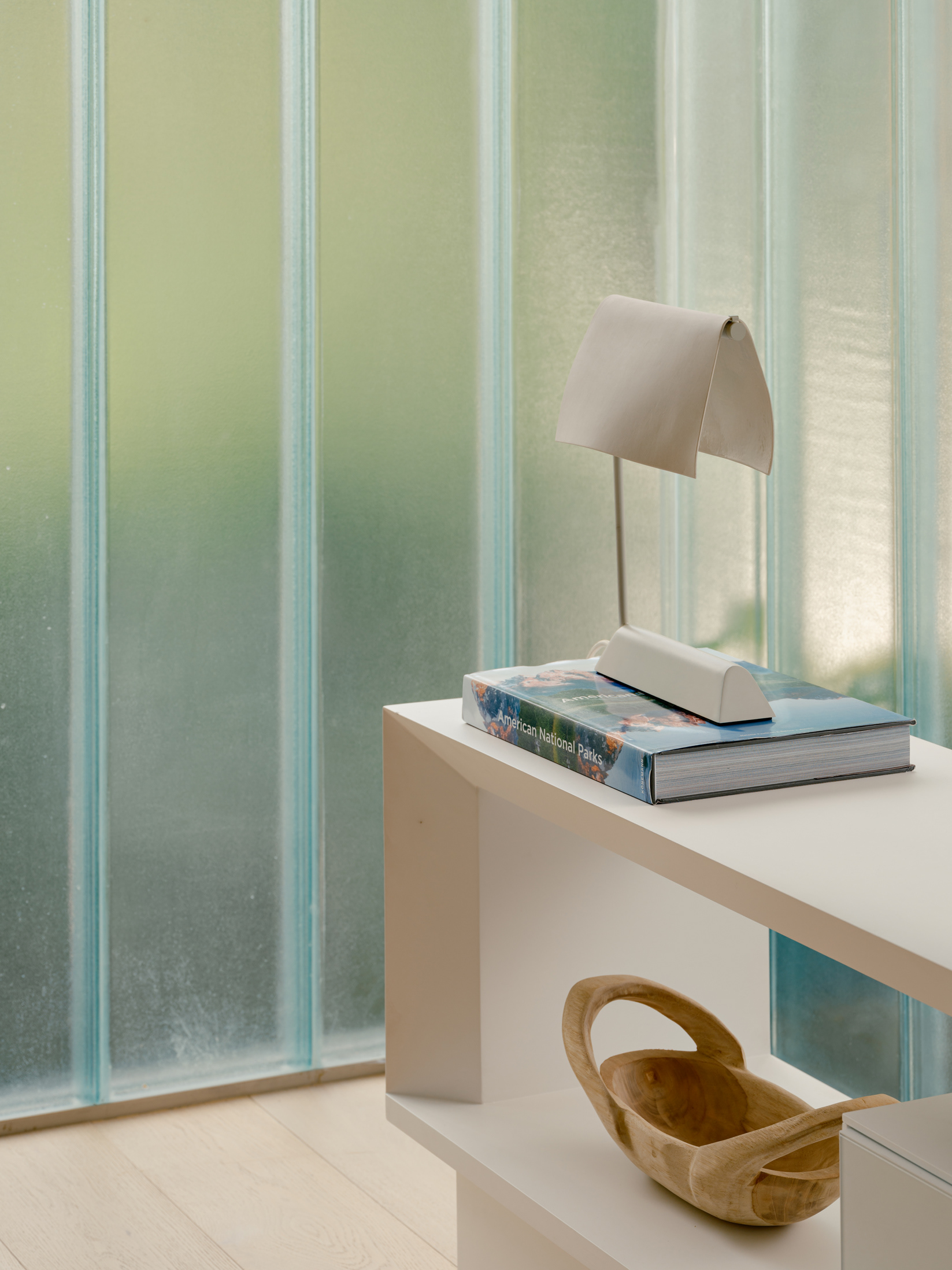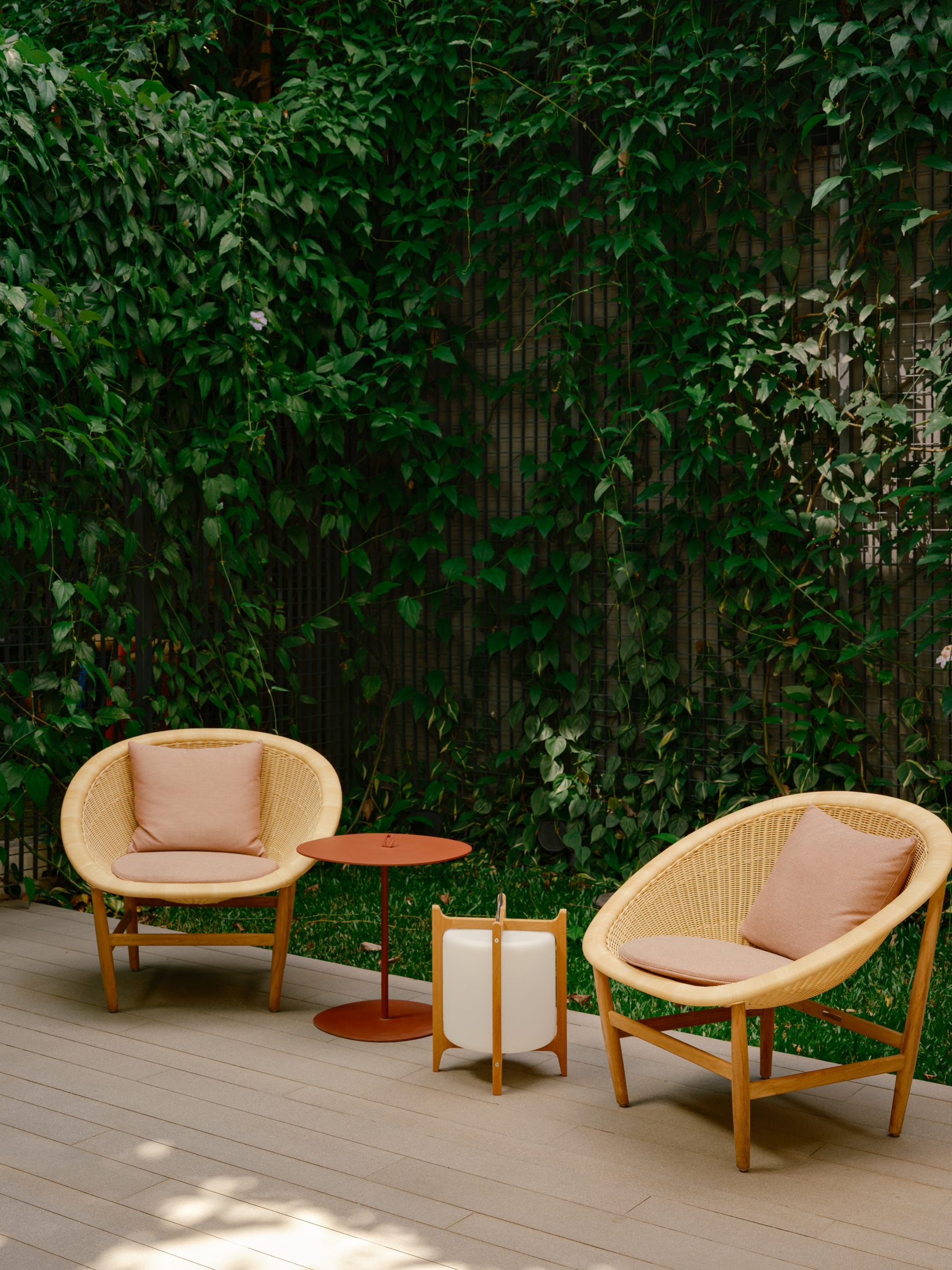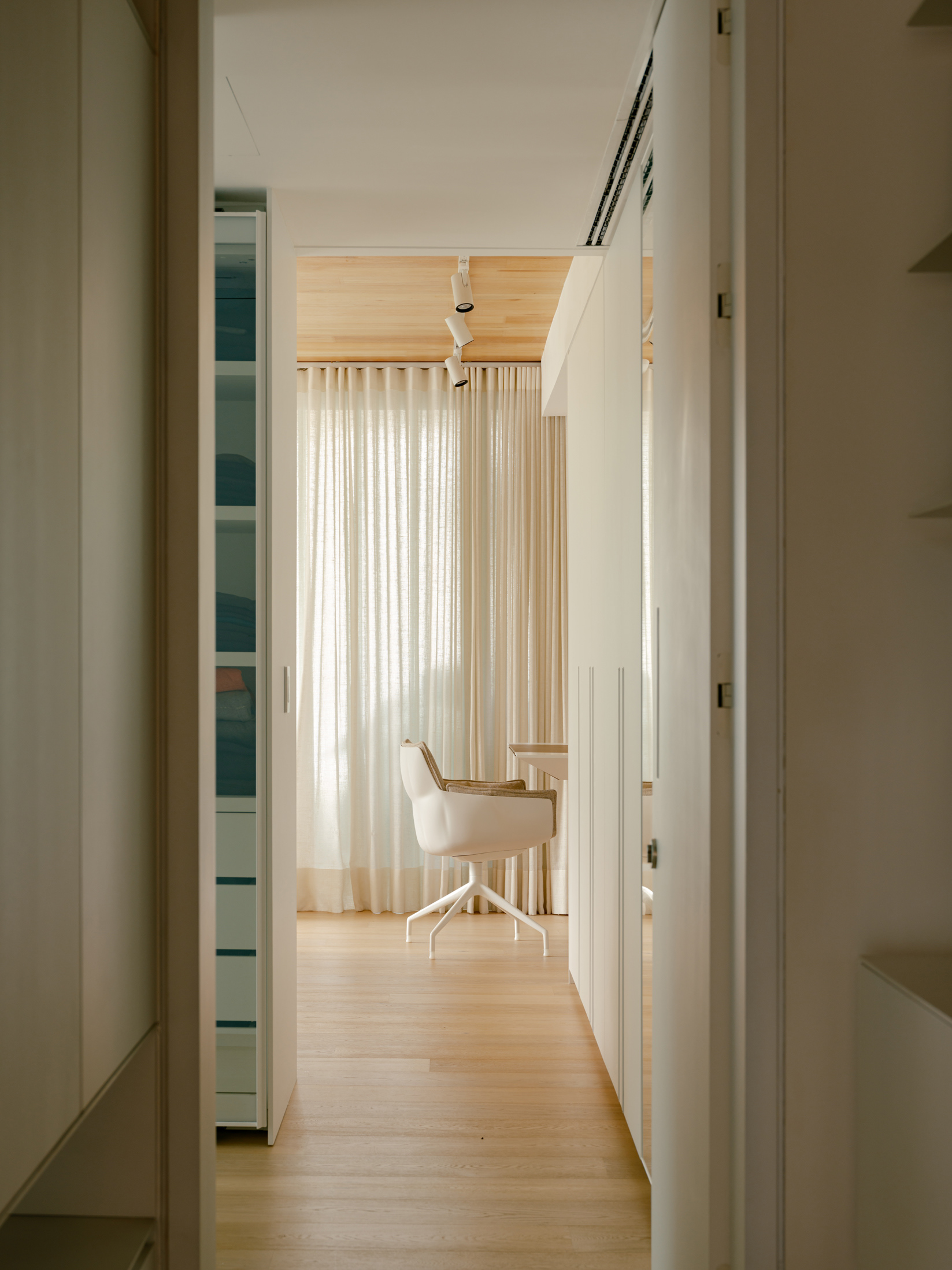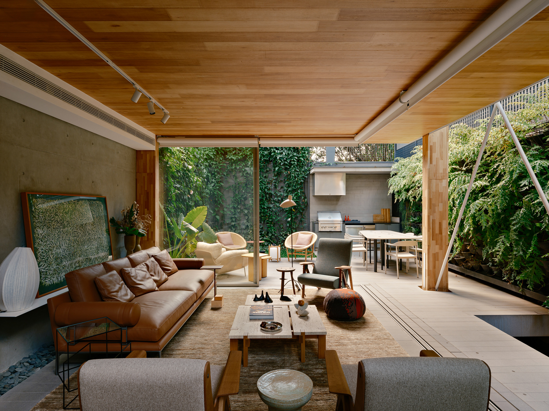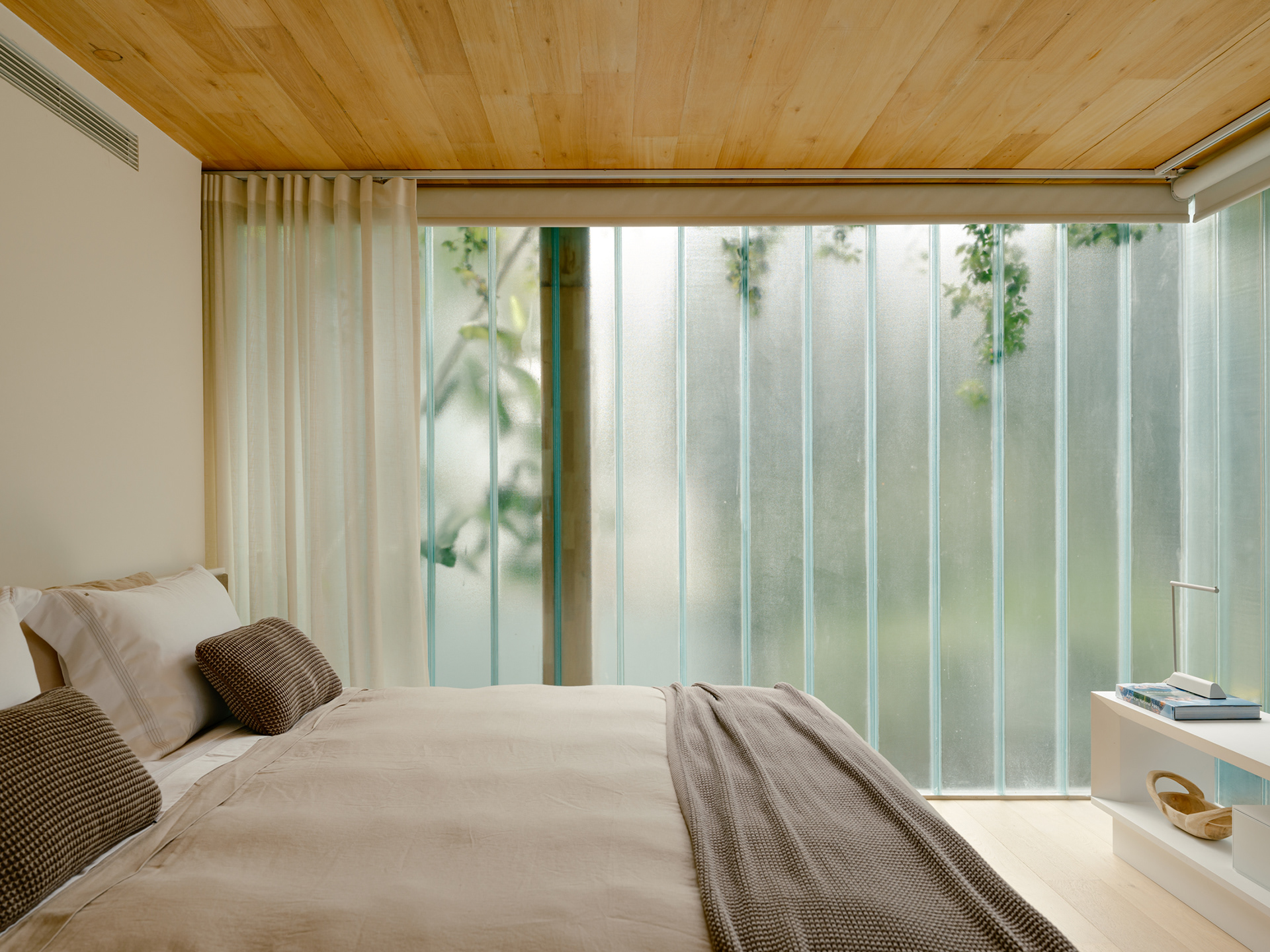 Composta de 3 pavimentos, o último pavimento acomoda um espaço de lazer com um spa na altura das árvores da rua. Protegido da insolação por um cobogó metálico, este pavimento se apoia sobre o pórtico de madeira e constitui um elemento à parte dos dois pavimentos logo abaixo.