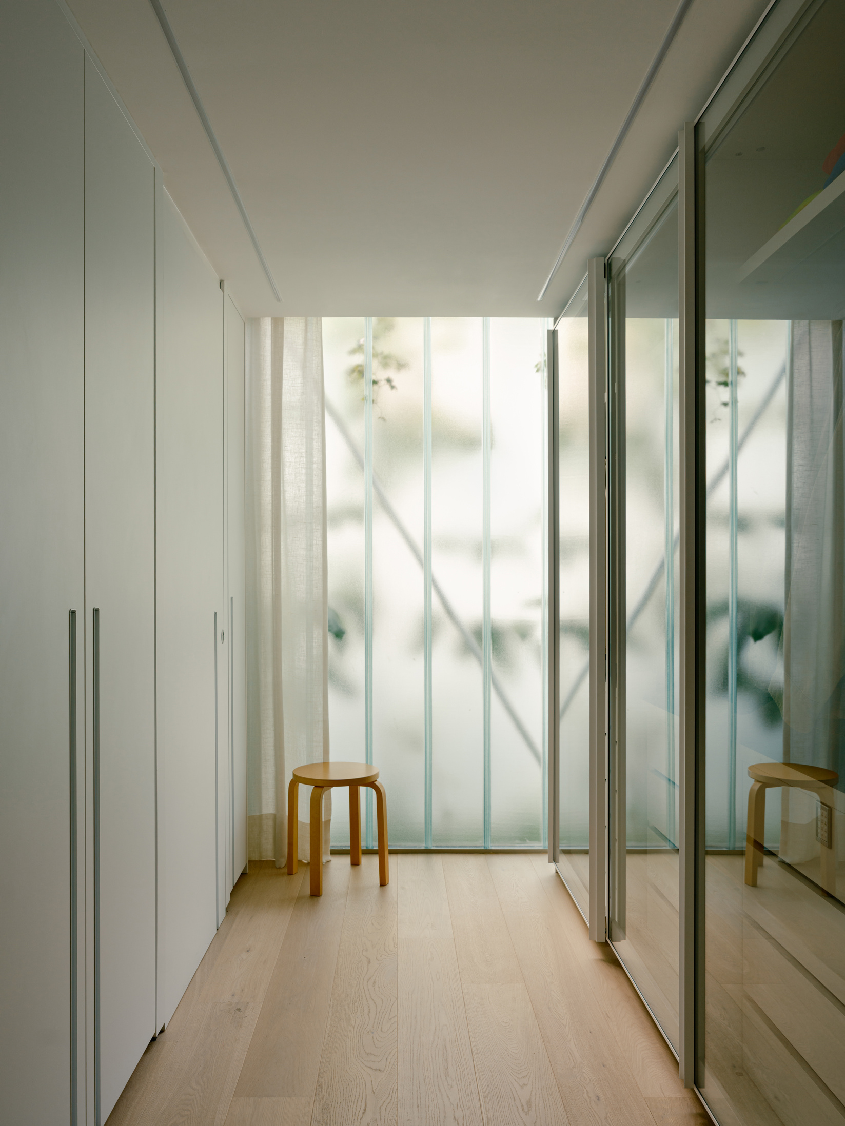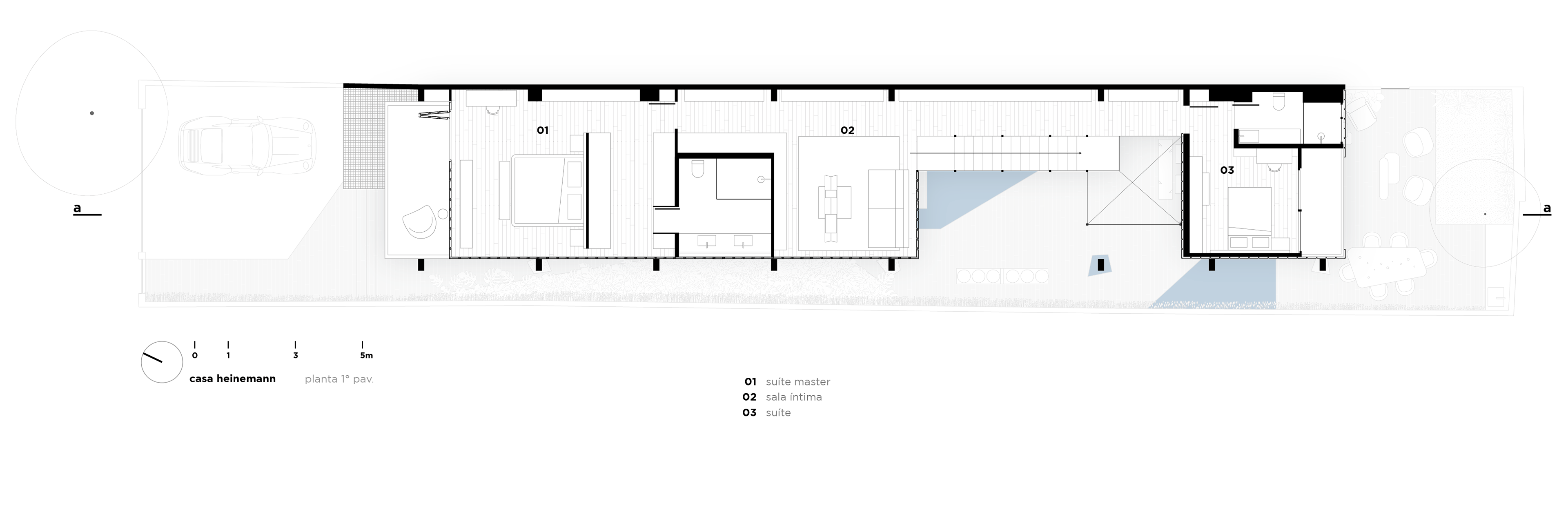 Uma casa aberta e integrada ao jardim, com espaços fluidos e generosos. A descrição parece razoável, não fosse o desafio de projetar num terreno de apenas 280m². Situado em São Paulo, num bairro com muito verde, o terreno retangular e fino foi aproveitado em toda a sua extensão. Concentrada na porção esquerda do lote, geminada à construção vizinha, liberamos a porção direita como um jardim linear que conduz os visitantes diretamente até o fundo da casa, onde concentramos as áreas sociais e uma porção mais ampla de jardim. Este percurso acontece num piso elevado e cercado de jardim e espelho d'água rebaixados, dando a sensação de que a casa flutua ao longo do jardim vertical que ocupa o muro direito todo.