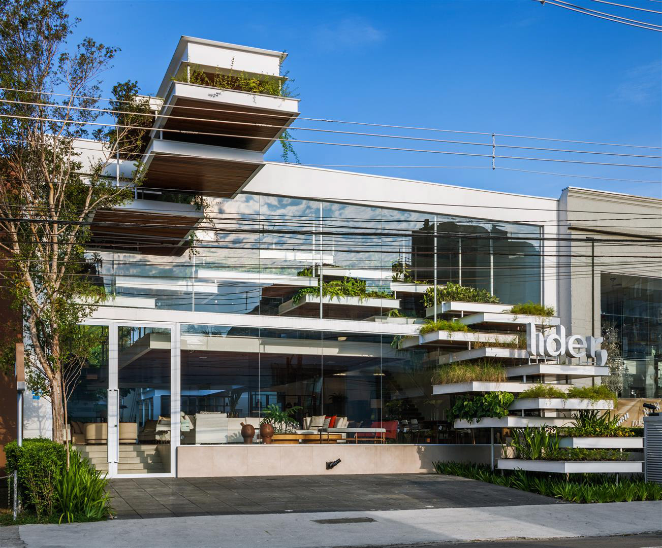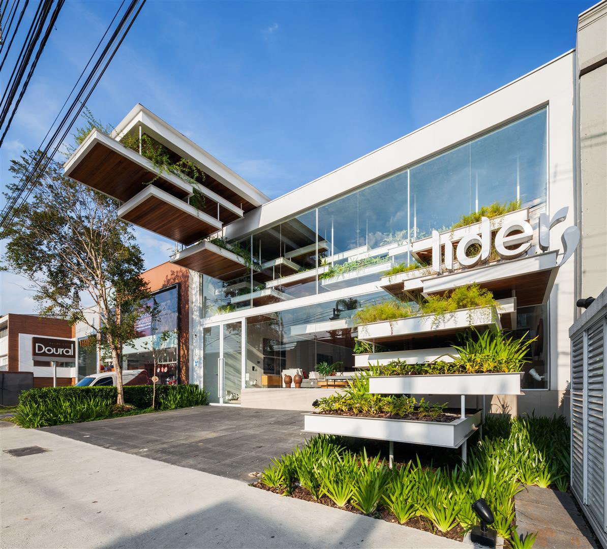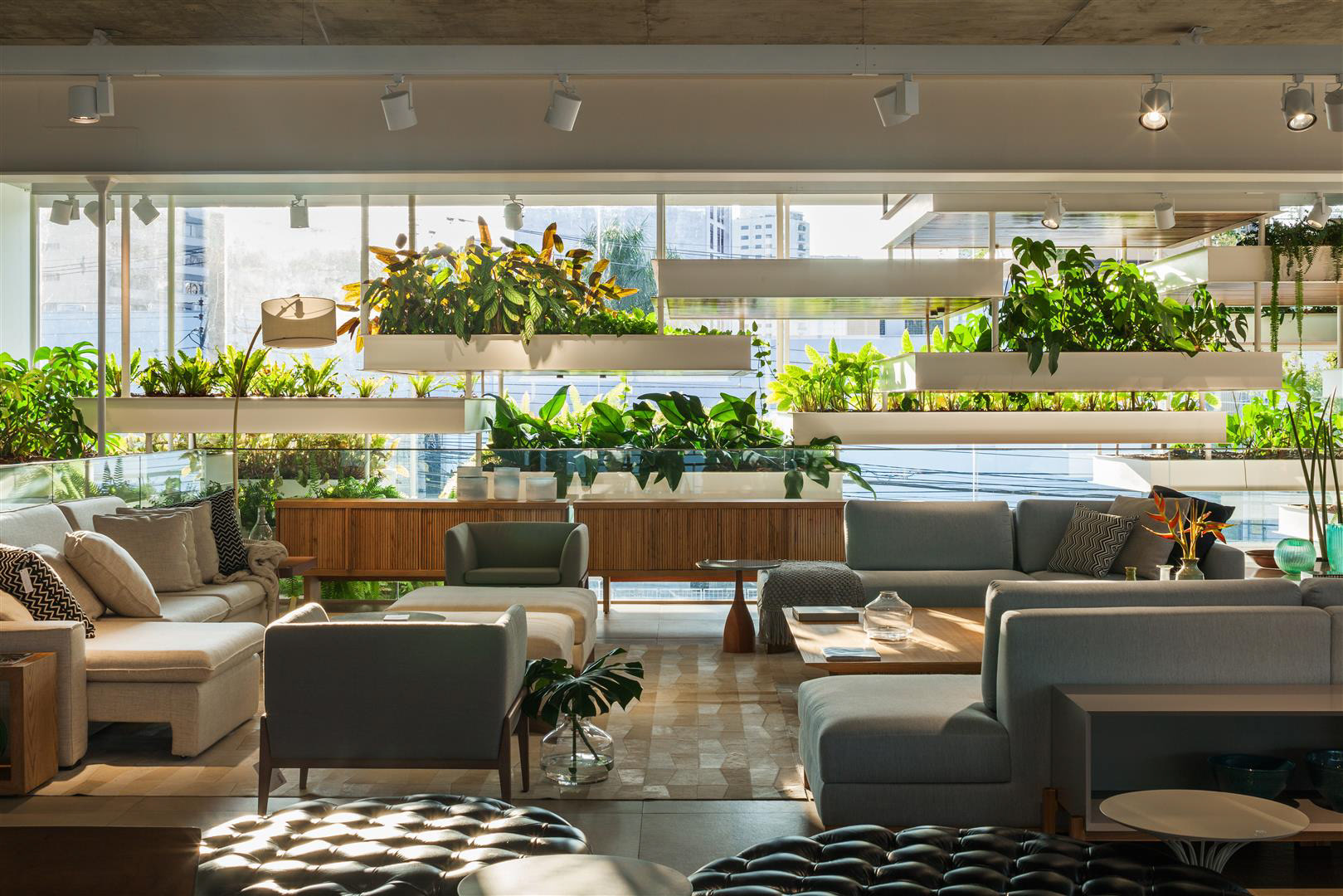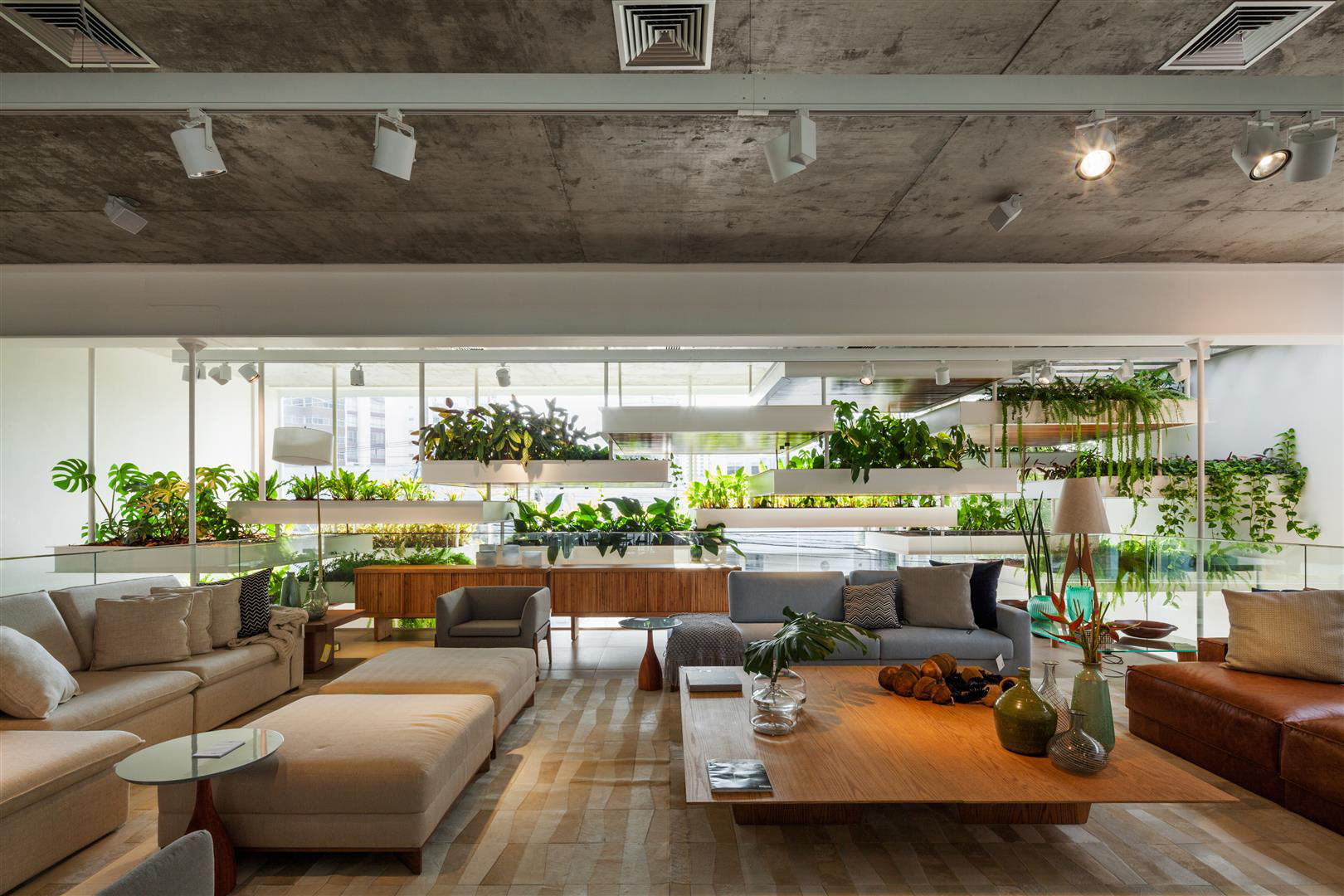 Um amplo espaço com pé direito duplo, envidraçado nas fachadas frontais e posterior, foi o nosso ponto de partida para o projeto, com base nas necessidades de exposição dessa loja de mobiliário. Um grande mezanino suspenso por apenas 6 delgados tirantes em meio ao espaço principal marca a intervenção e caracteriza de forma mais contundente a estrutura, mista de metálica e concreto moldado in loco. Jardineiras suspensas em estrutura metálica começam junto a calçada do lado de fora, penetram a loja e em uma espécie de curva se projetam de novo para fora, a mais de 6 metros de altura, se tornando uma marquise e marco de entrada, quase como um quebra cabeça sobreposto. Esses jardins, que também ocorrem na porção posterior da loja são uma espécie de jardineira/forro/brise que marca a loja, garantindo sua necessária transparência de sua vitrine, convida o visitante para adentrar o espaço e marca sua identidade.