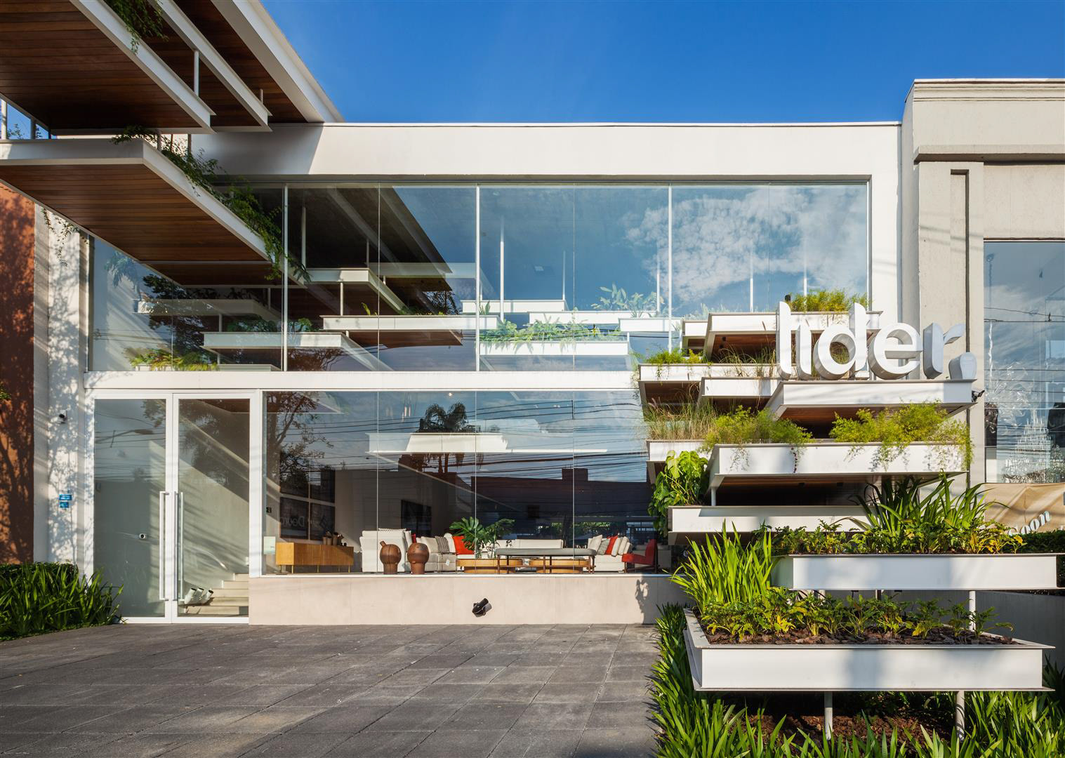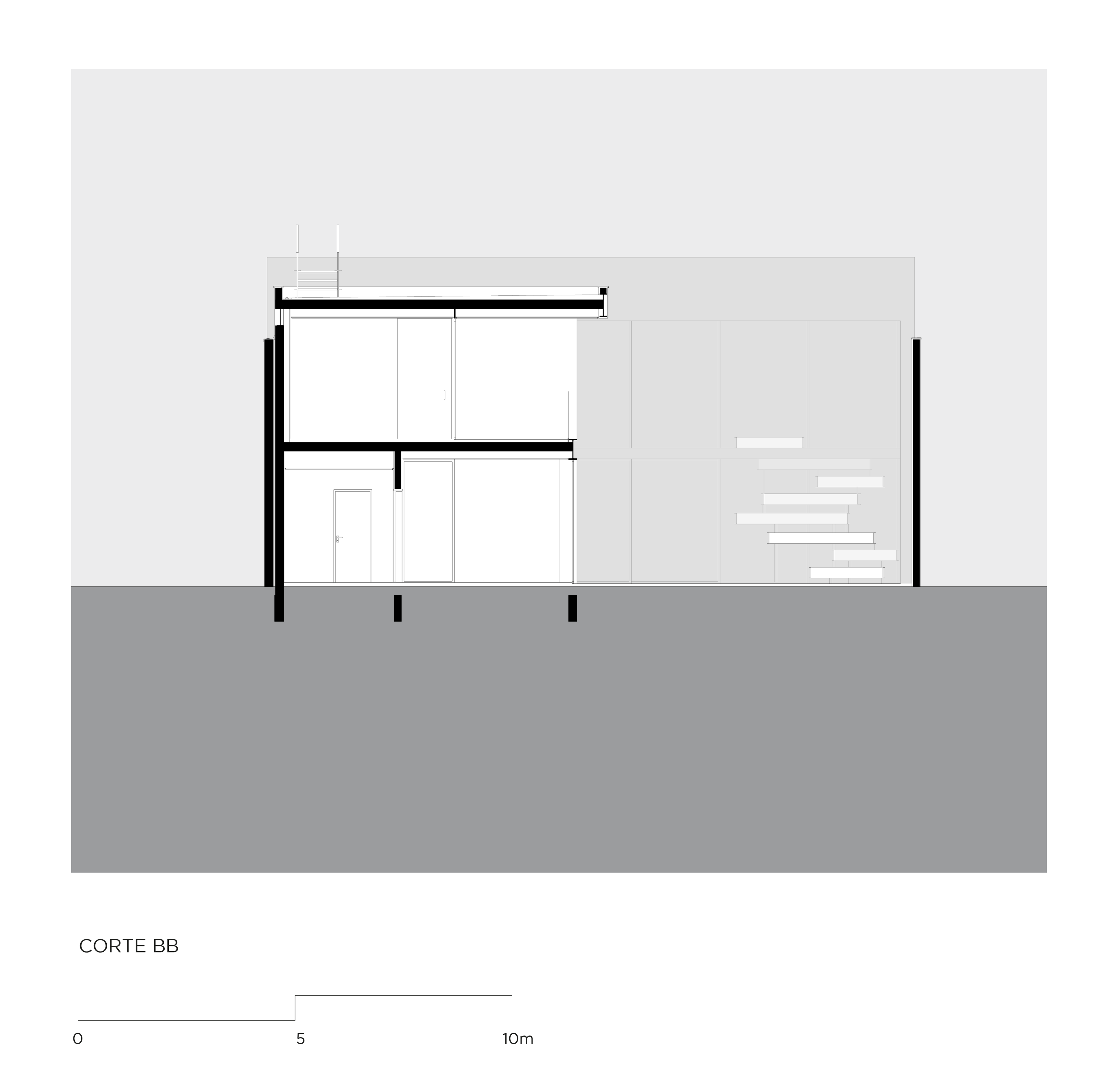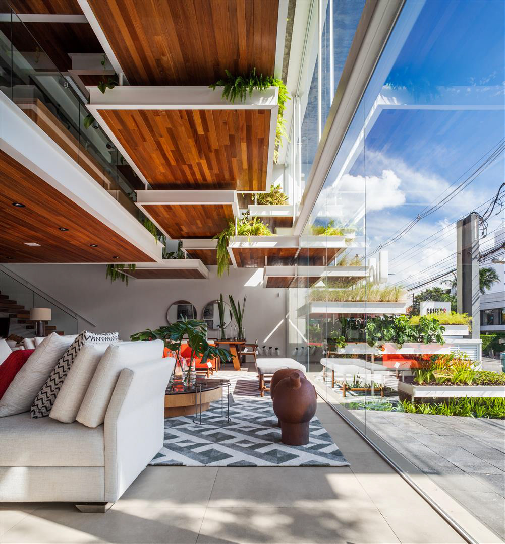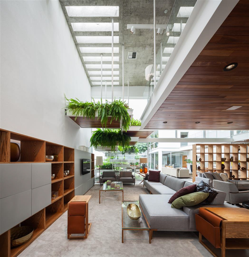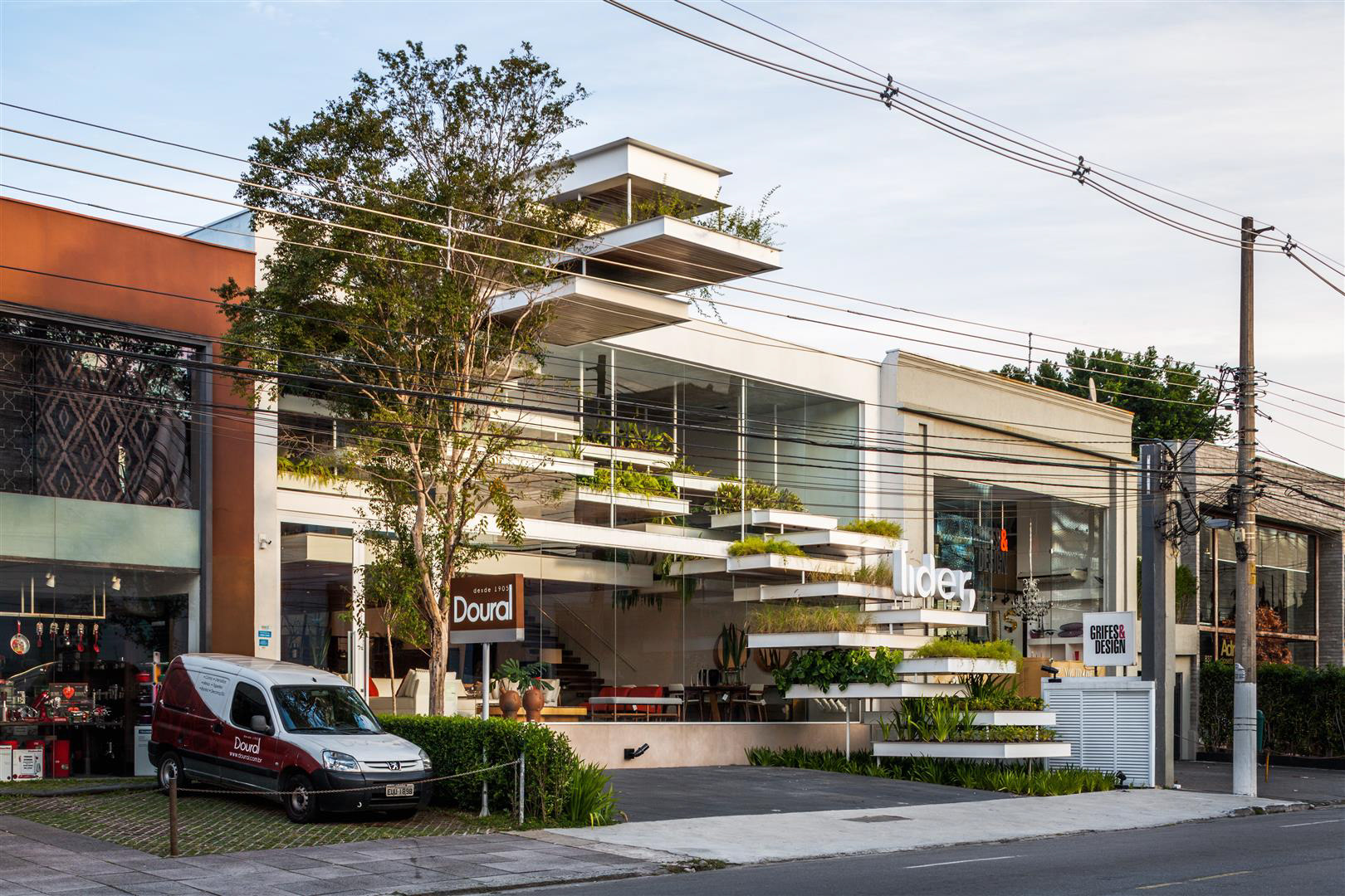Um amplo espaço com pé direito duplo, envidraçado nas fachadas frontais e posterior, foi o nosso ponto de partida para o projeto, com base nas necessidades de exposição dessa loja de mobiliário. Um grande mezanino suspenso por apenas 6 delgados tirantes em meio ao espaço principal marca a intervenção e caracteriza de forma mais contundente a estrutura, mista de metálica e concreto moldado in loco. Jardineiras suspensas em estrutura metálica começam junto a calçada do lado de fora, penetram a loja e em uma espécie de curva se projetam de novo para fora, a mais de 6 metros de altura, se tornando uma marquise e marco de entrada, quase como um quebra cabeça sobreposto. Esses jardins, que também ocorrem na porção posterior da loja são uma espécie de jardineira/forro/brise que marca a loja, garantindo sua necessária transparência de sua vitrine, convida o visitante para adentrar o espaço e marca sua identidade.