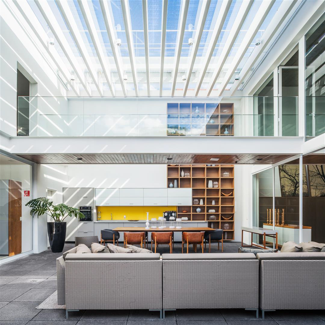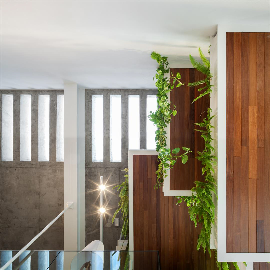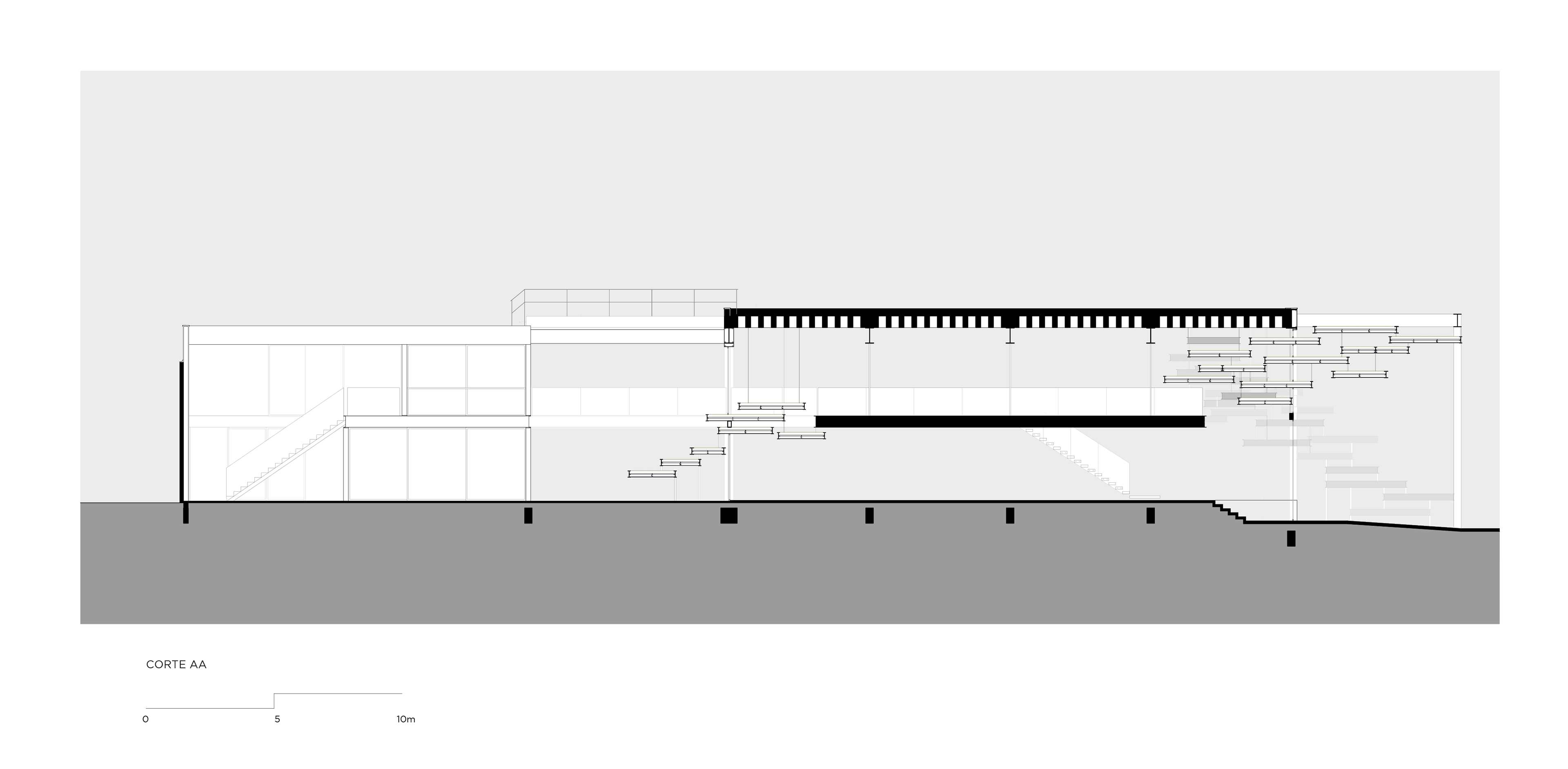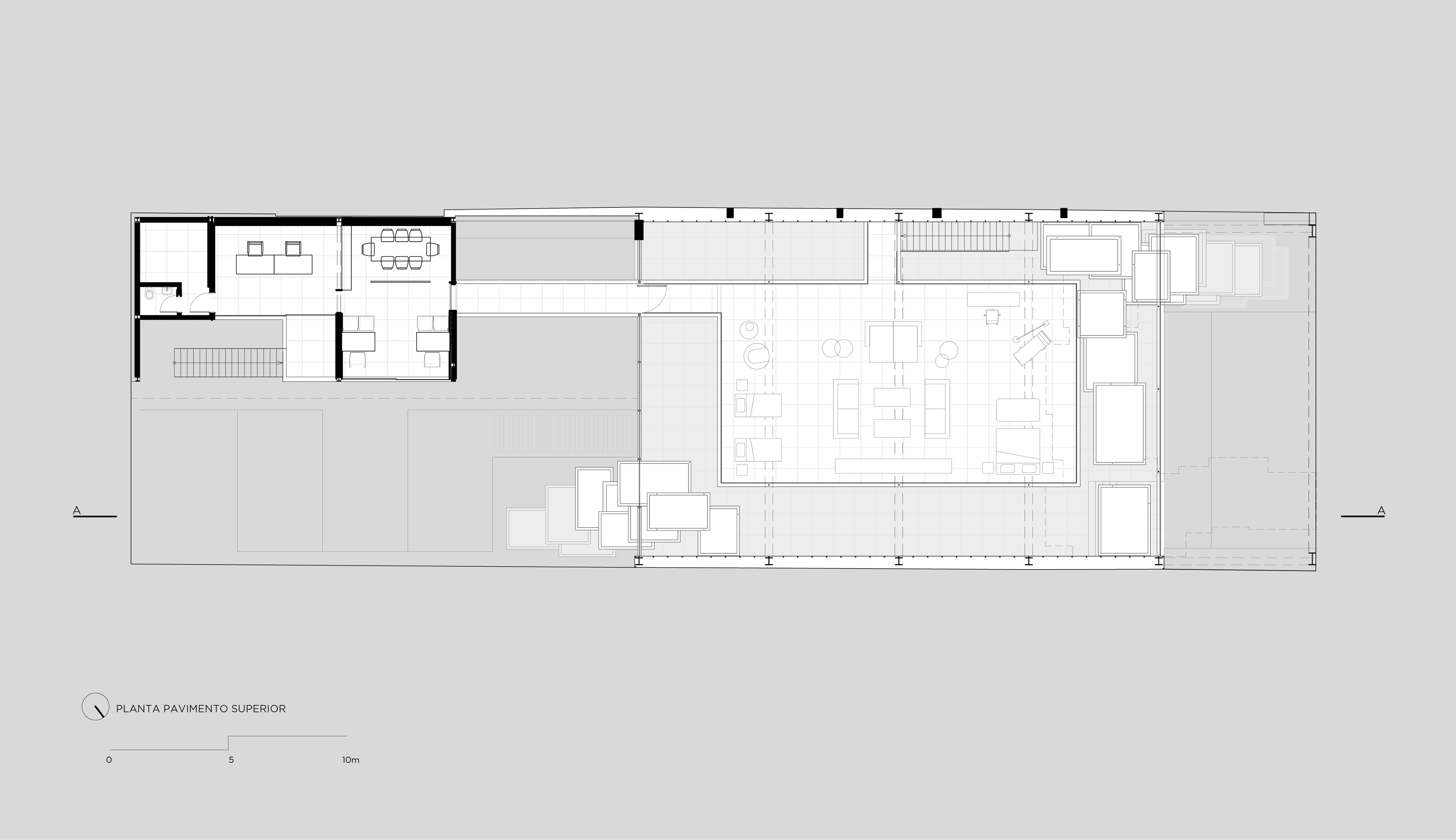 Um amplo espaço com pé direito duplo, envidraçado nas fachadas frontais e posterior, foi o nosso ponto de partida para o projeto, com base nas necessidades de exposição dessa loja de mobiliário. Um grande mezanino suspenso por apenas 6 delgados tirantes em meio ao espaço principal marca a intervenção e caracteriza de forma mais contundente a estrutura, mista de metálica e concreto moldado in loco. Jardineiras suspensas em estrutura metálica começam junto a calçada do lado de fora, penetram a loja e em uma espécie de curva se projetam de novo para fora, a mais de 6 metros de altura, se tornando uma marquise e marco de entrada, quase como um quebra cabeça sobreposto. Esses jardins, que também ocorrem na porção posterior da loja são uma espécie de jardineira/forro/brise que marca a loja, garantindo sua necessária transparência de sua vitrine, convida o visitante para adentrar o espaço e marca sua identidade.