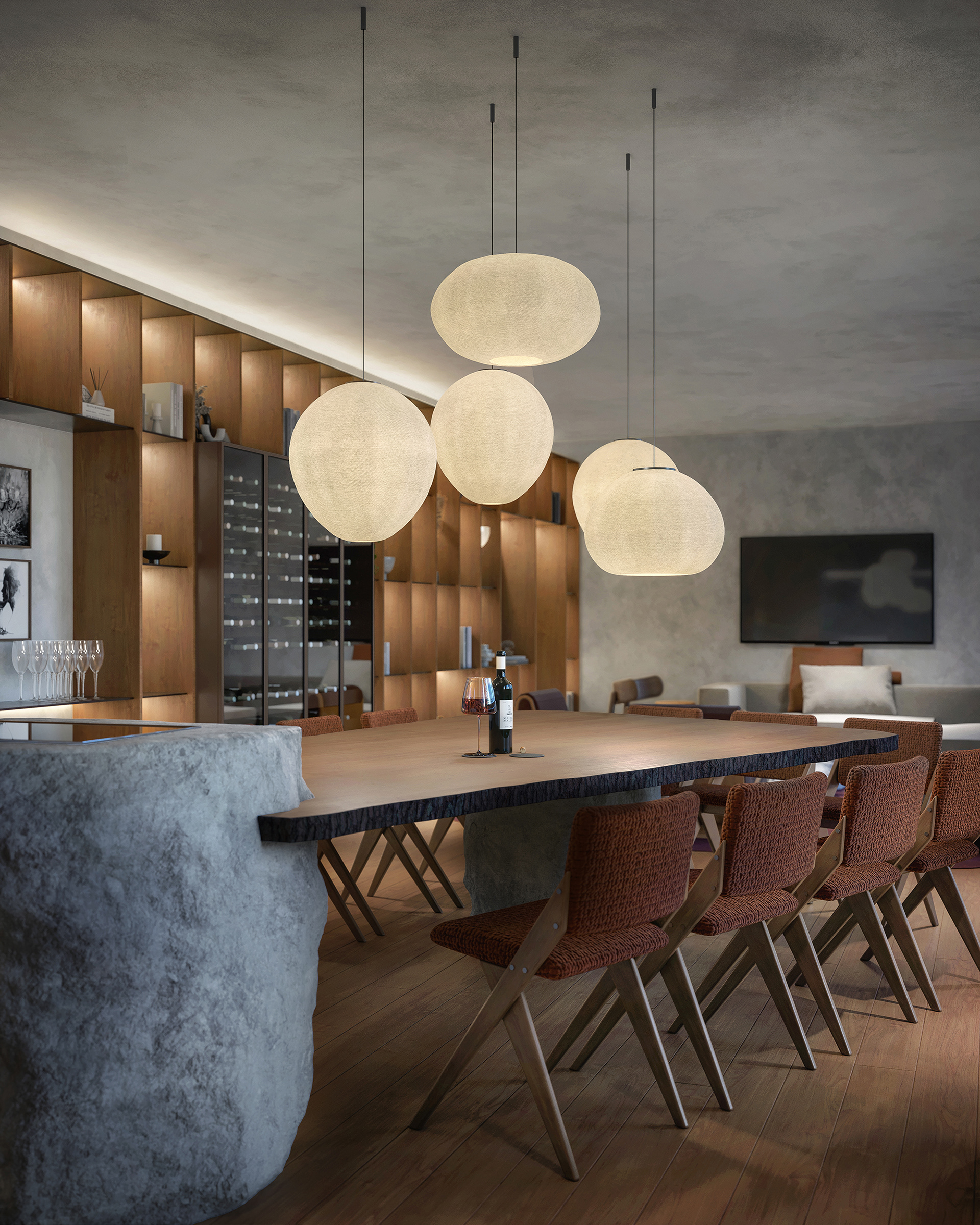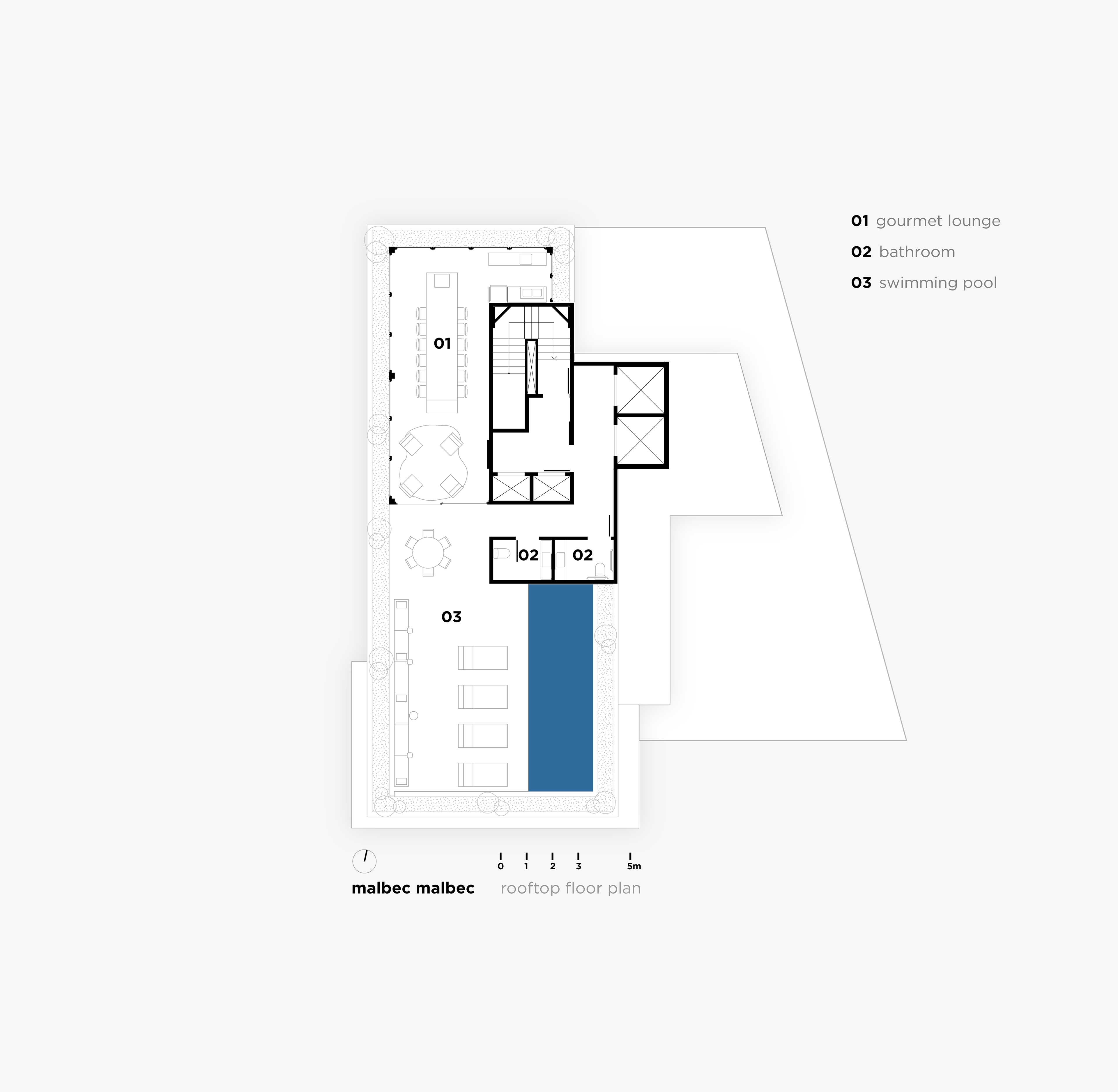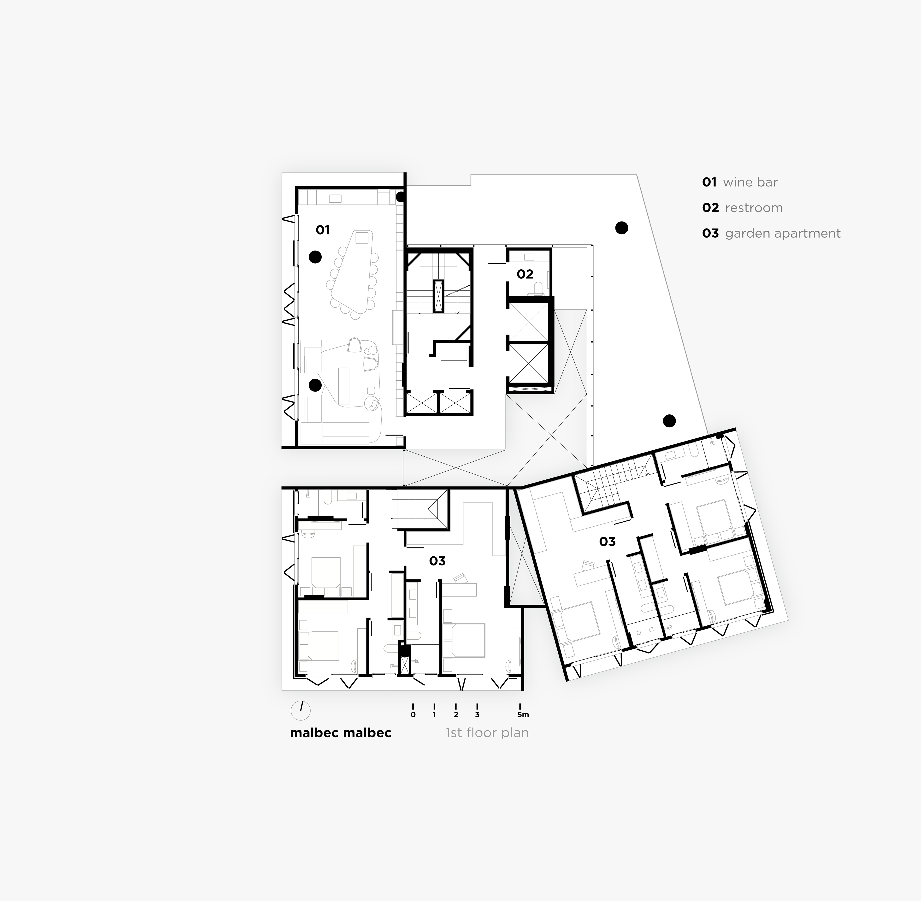 Logo acima desse vazio de pé direito duplo, 53 unidades de tamanhos entre 84 e 386m² acomodam-se agrupadas em pequenos blocos de 2 ou 3 pavimentos. Dispostos uns sobre os outros, cada bloco tem geometria própria, combinando o programa e as diretrizes legais ao desejo de criar conjuntos de casas flutuantes, cercadas de terraços, vazios, pérgolas e jardins.