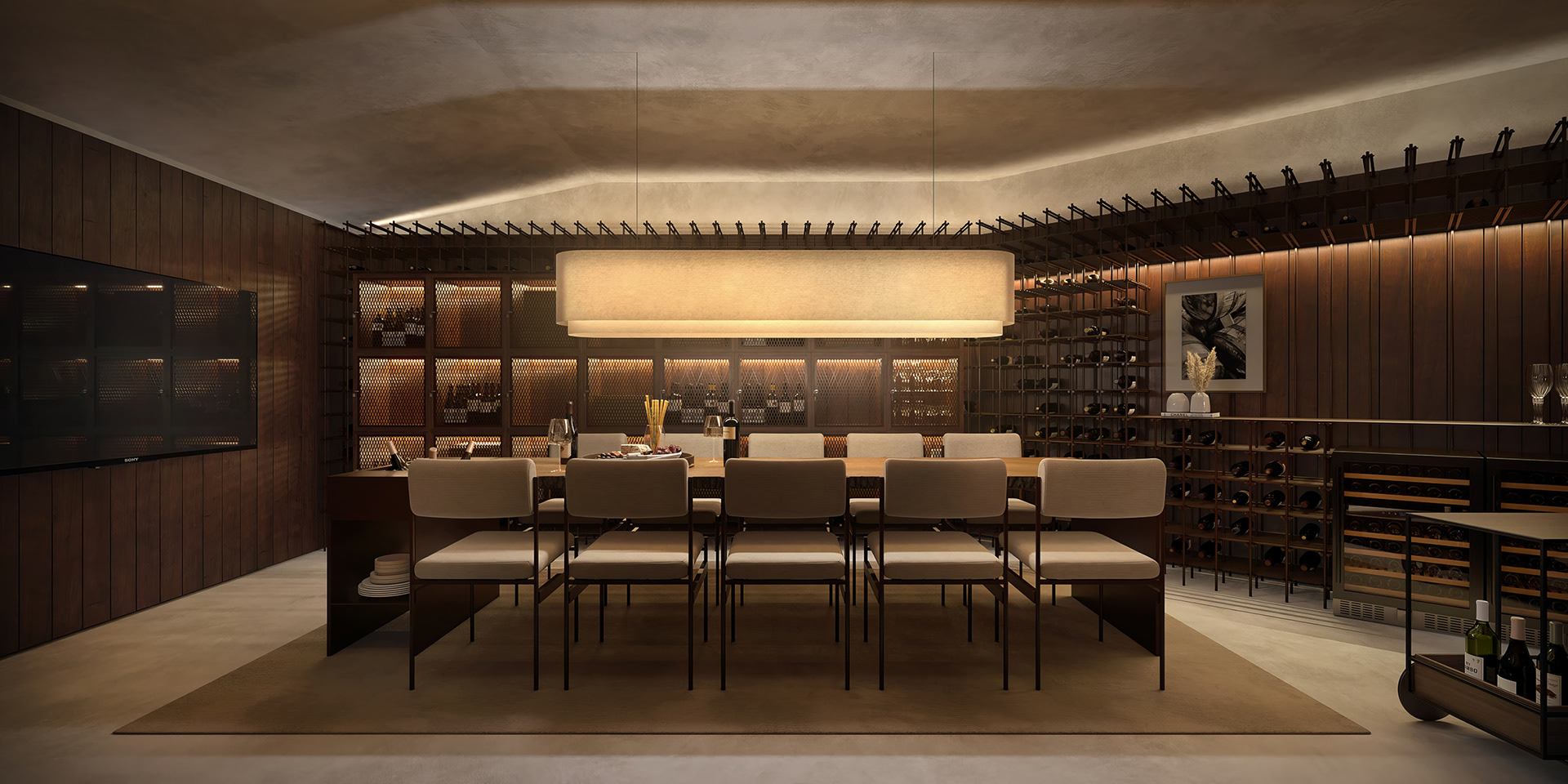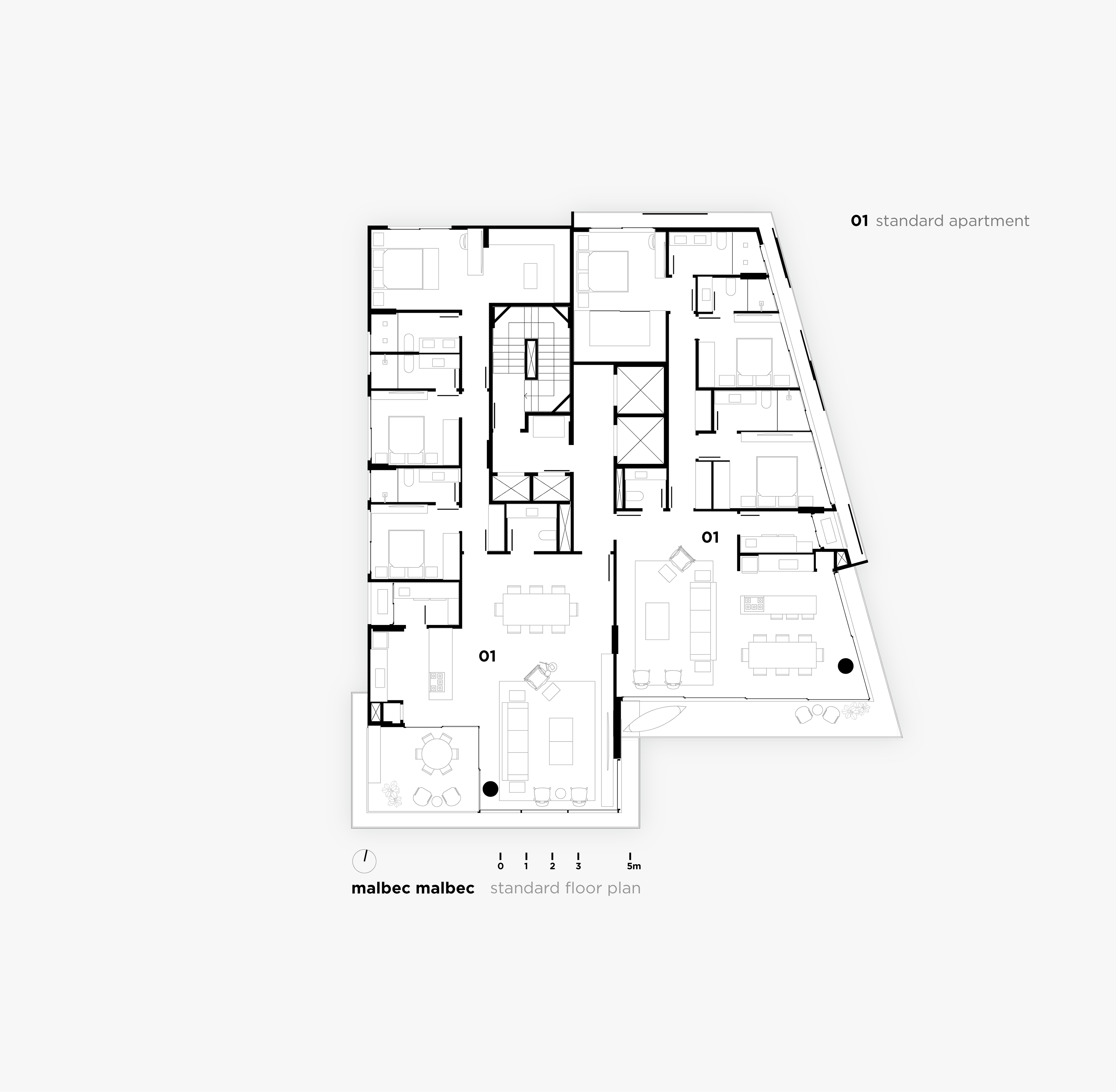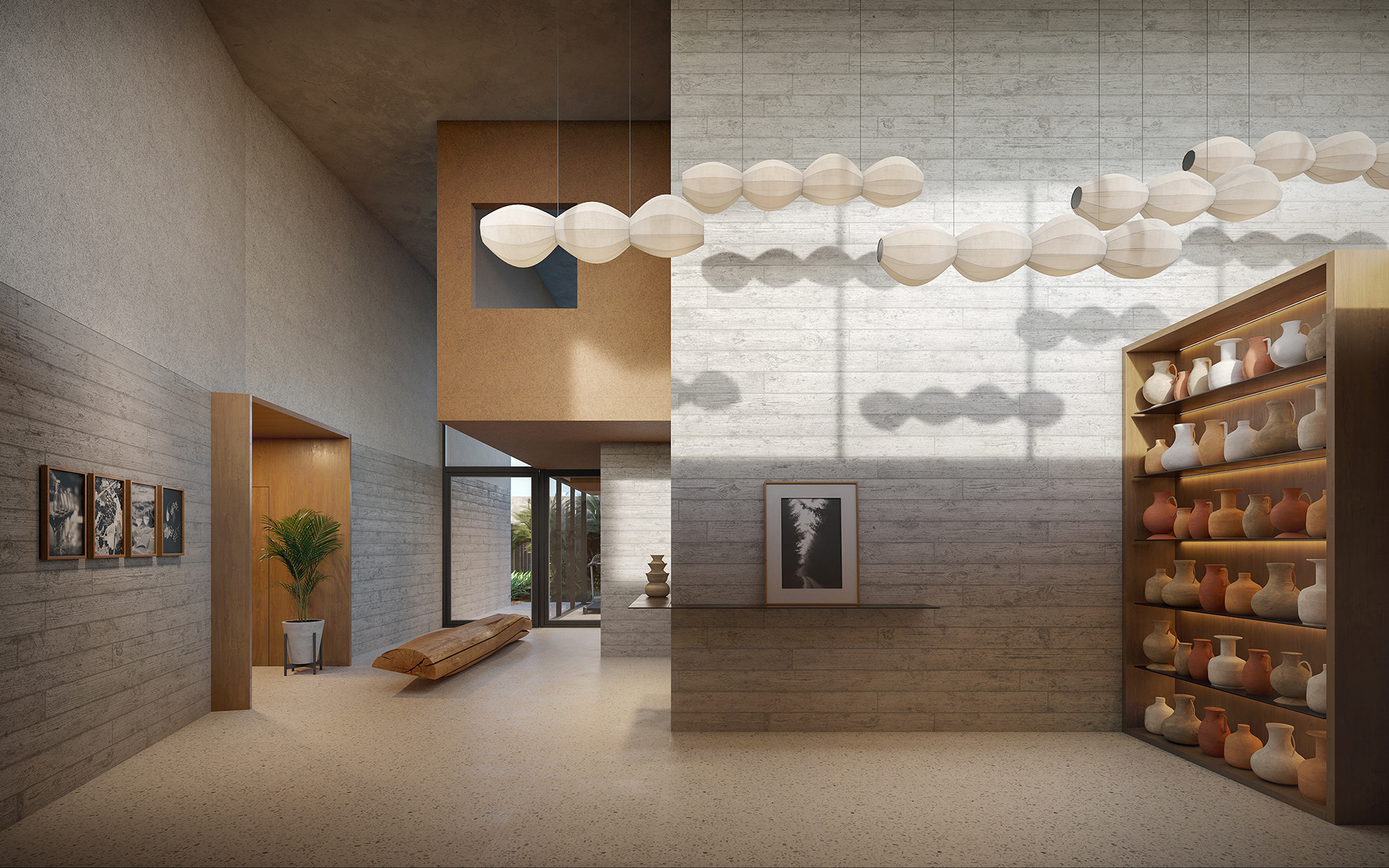 Logo acima desse vazio de pé direito duplo, 53 unidades de tamanhos entre 84 e 386m² acomodam-se agrupadas em pequenos blocos de 2 ou 3 pavimentos. Dispostos uns sobre os outros, cada bloco tem geometria própria, combinando o programa e as diretrizes legais ao desejo de criar conjuntos de casas flutuantes, cercadas de terraços, vazios, pérgolas e jardins.