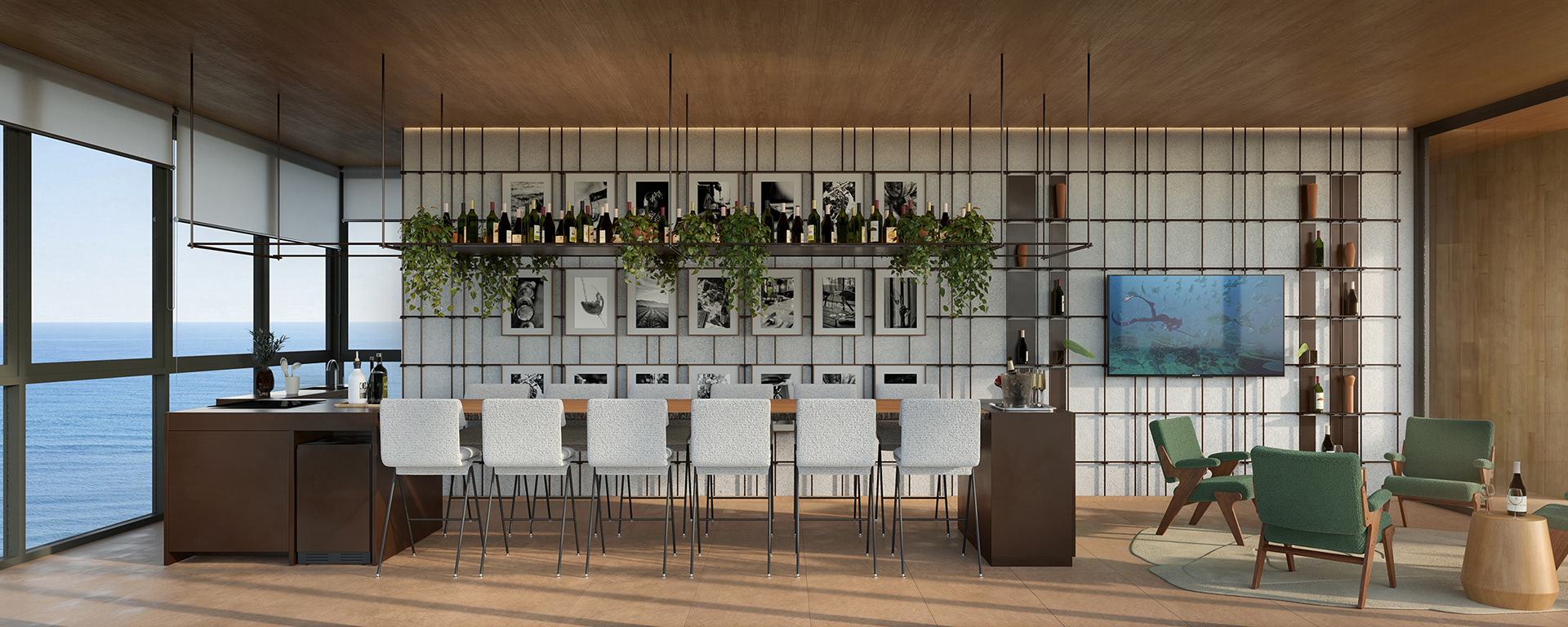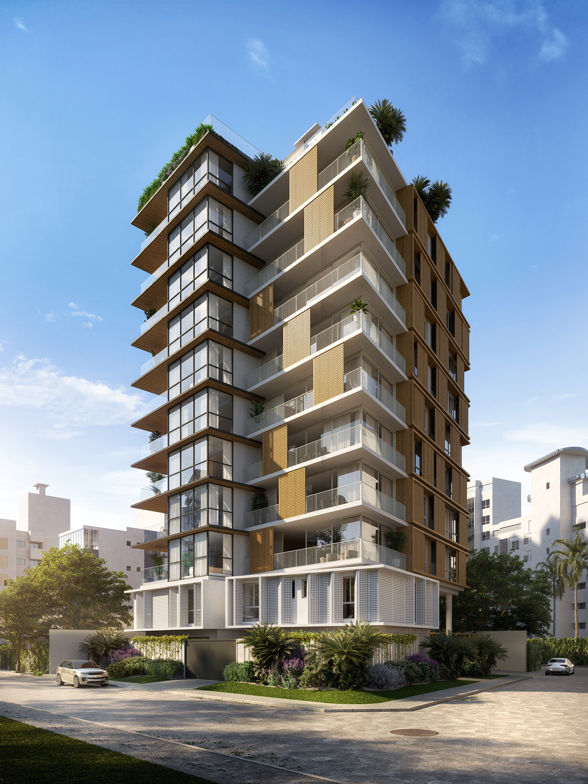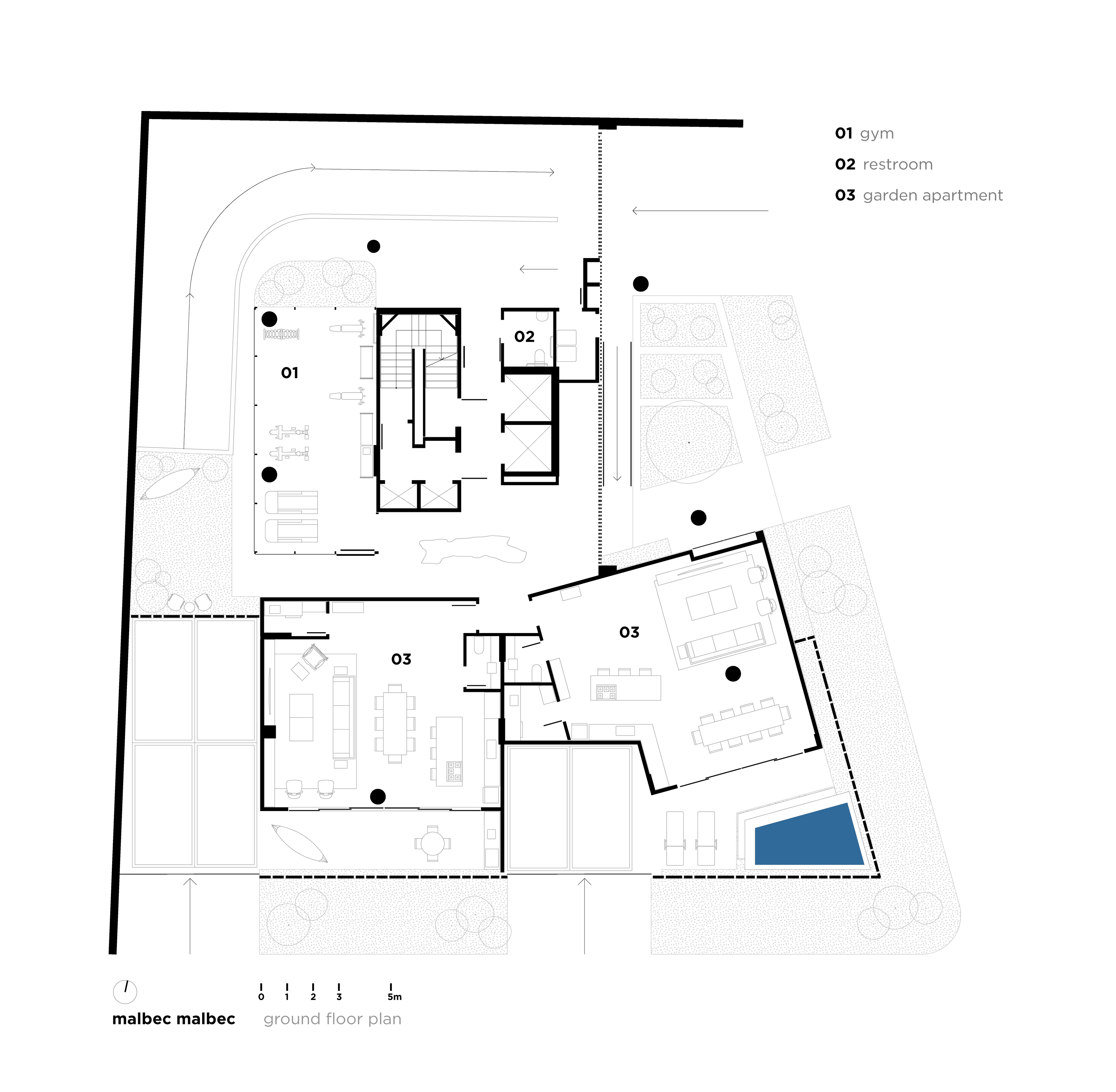 O empreendimento se oferece de maneira delicada: no térreo, ao invés de grades e muros, temos um jardim generosamente aberto para a cidade com vedação em vidro limitando, sem alarde, o acesso à área privativa. O espelho d'água que deságua junto à calçada invade o interior do térreo: ele separa o hall e o salão de festas ao mesmo tempo em que conduz o olhar transversalmente entre o interior e o exterior na frente e no fundo do lote.