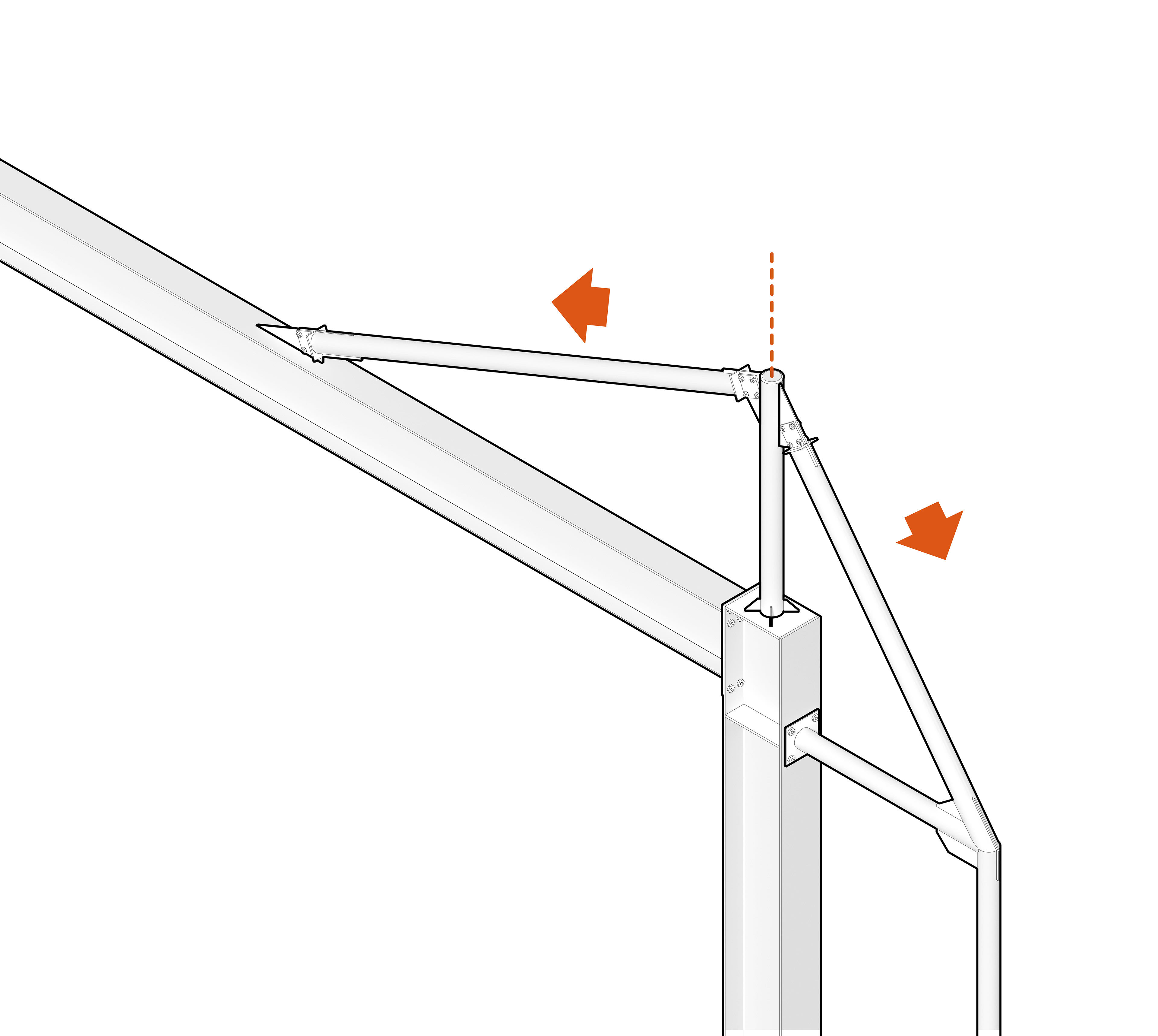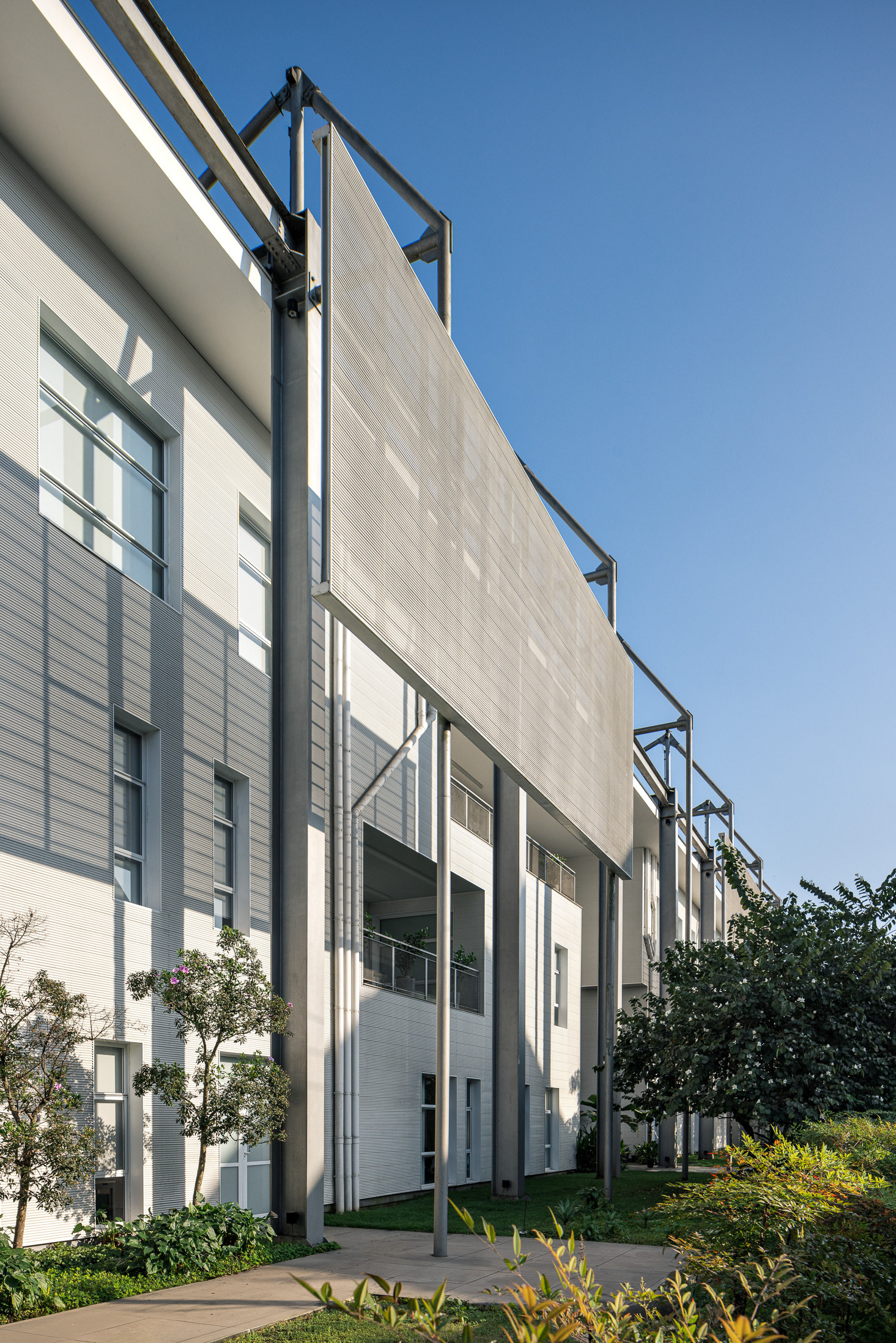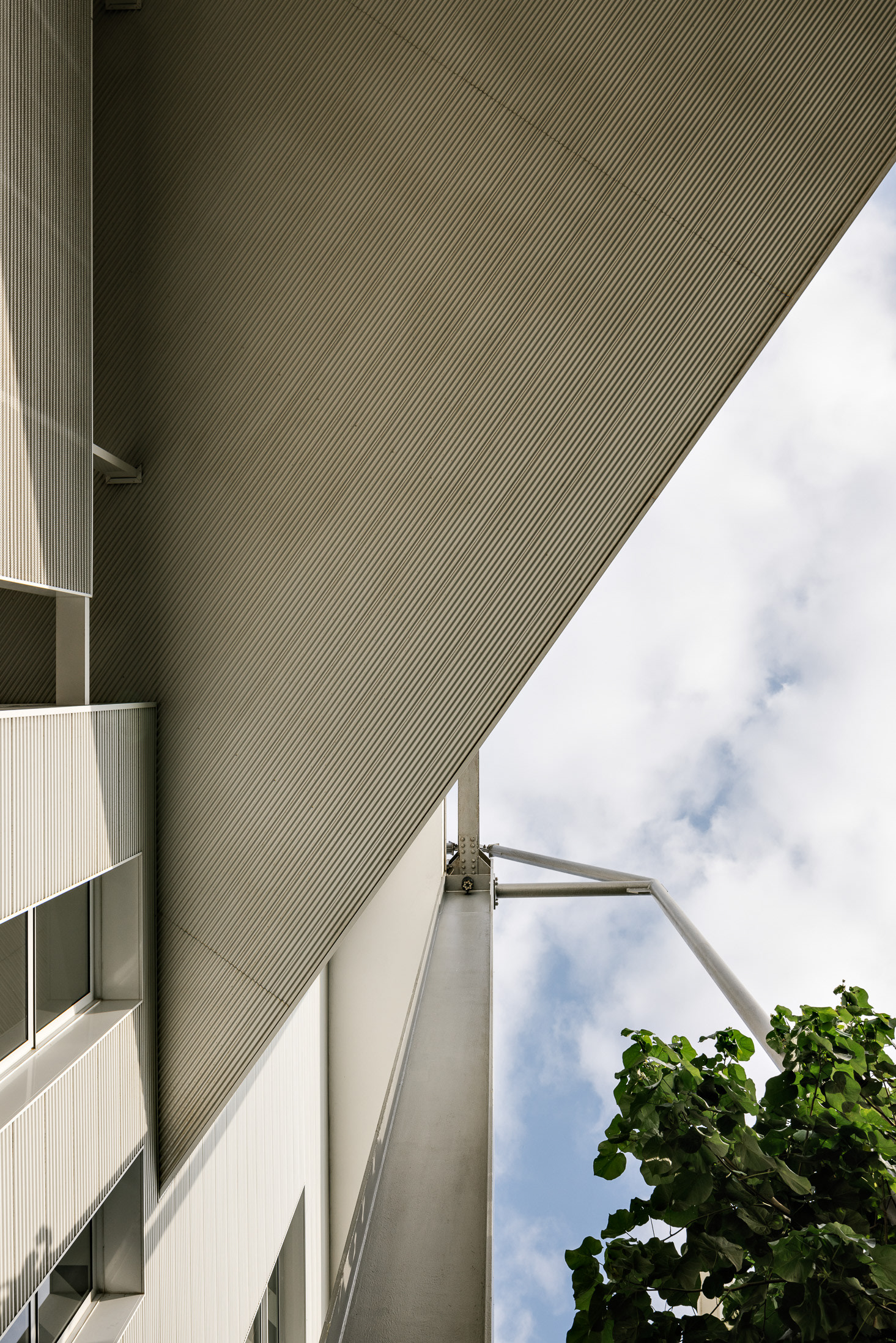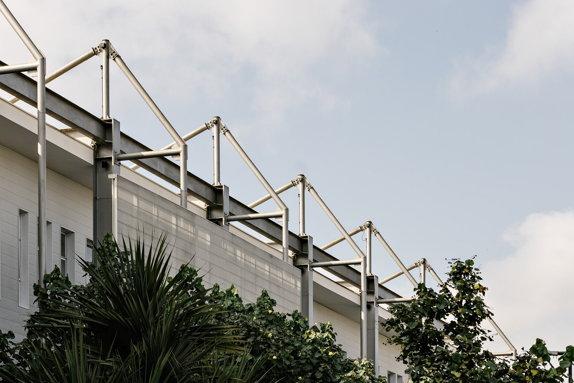 A lógica construtiva do edifício é a construção de uma grande cobertura apoiada em pilares e vigas metálicas e que abriga uma série de volumes com estrutura de concreto abaixo de si. Esses volumes são empilhados de modo quase que randômico, deixando buracos entre si, onde se situam varandas e vazios. Os volumes fechados abrigam os diversos departamentos da empresa, enquanto as varandas são ao mesmo tempo espaços de lazer e pulmão para futuras ampliações dos escritórios.