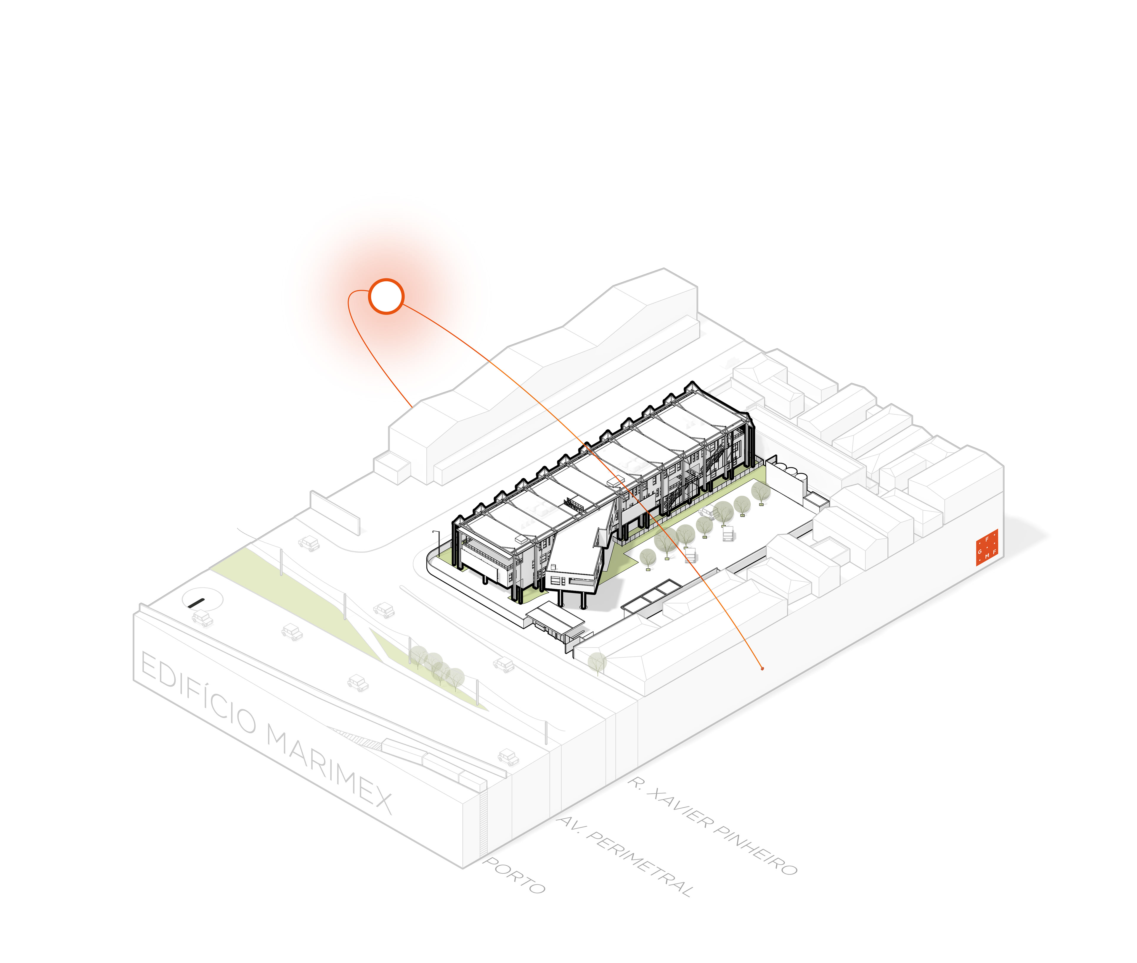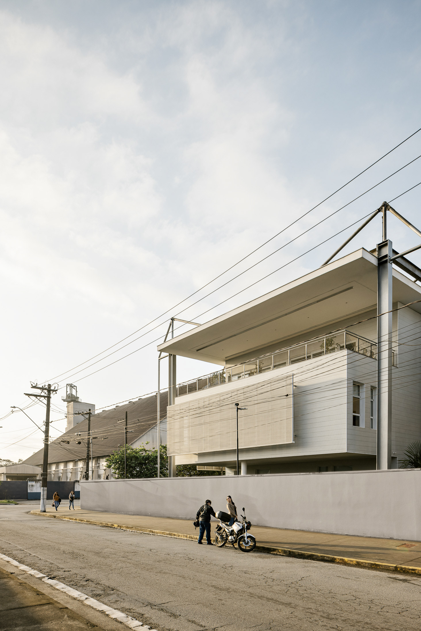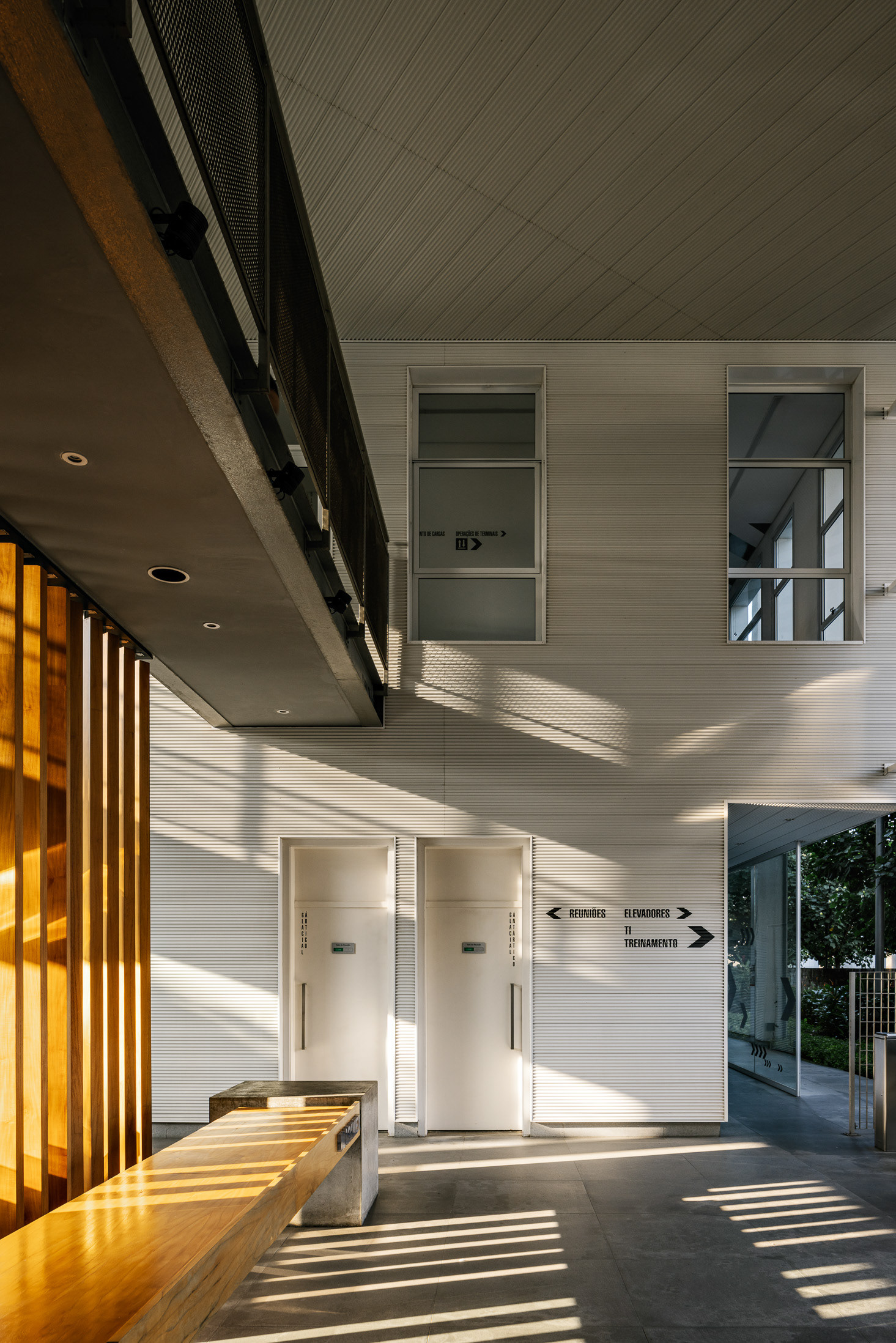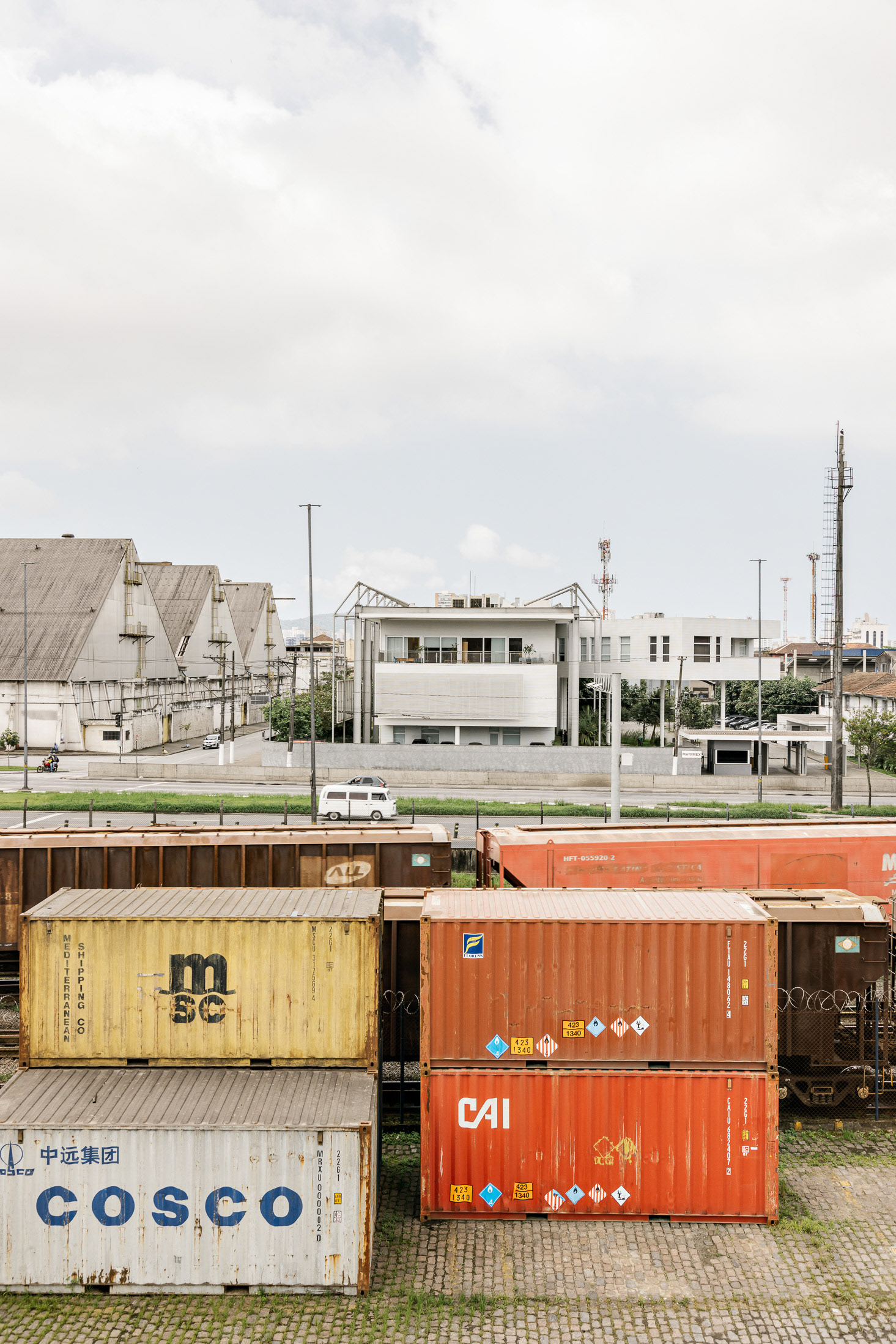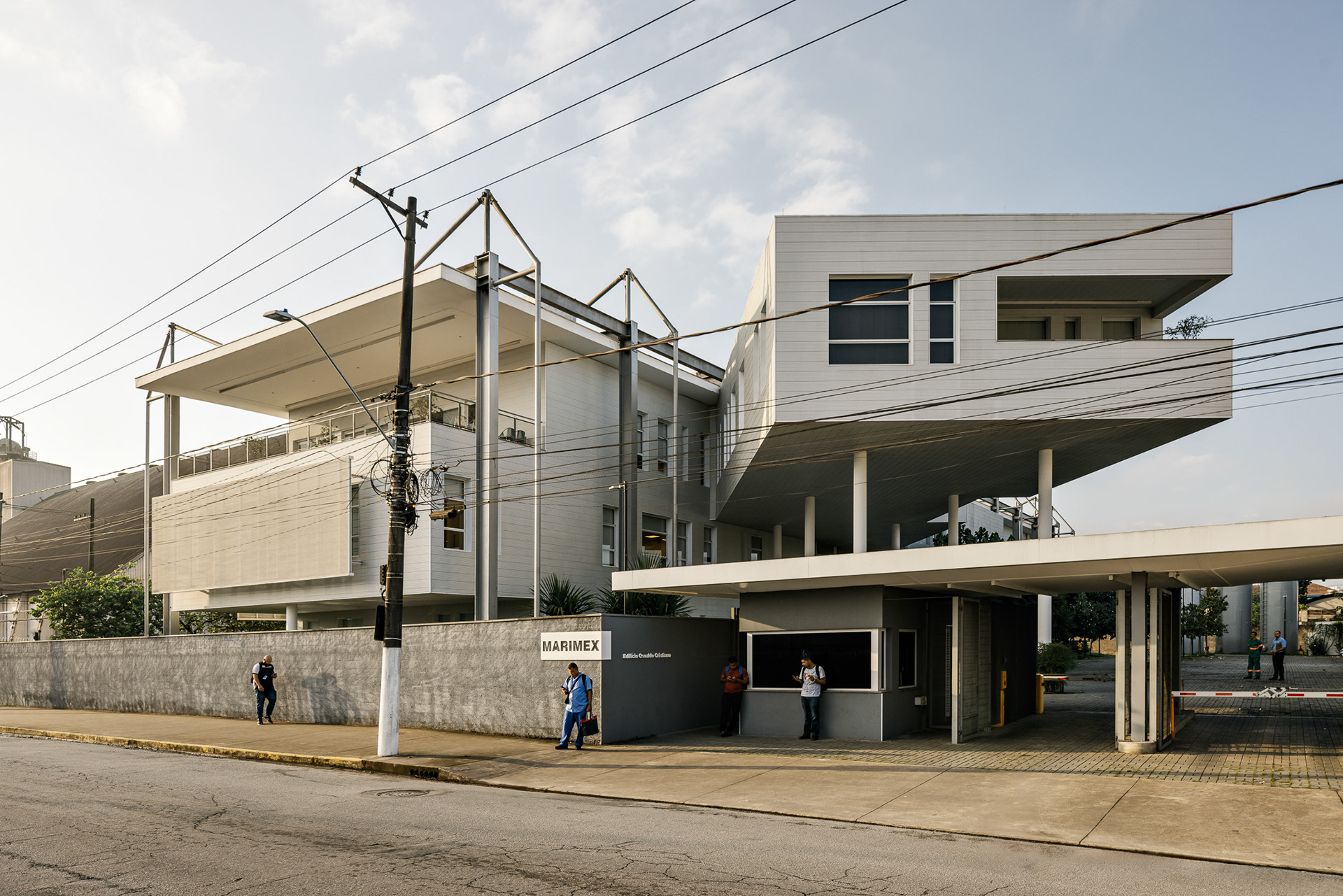 Localizado ao lado do porto de Santos, este edifício traz em sua arquitetura a estética do armazém e do container, elementos intrínsecos da forma de atuação da empresa de inteligência portuária Marimex, que realiza transportes marítimos e rodoviários, entre outras atividades.