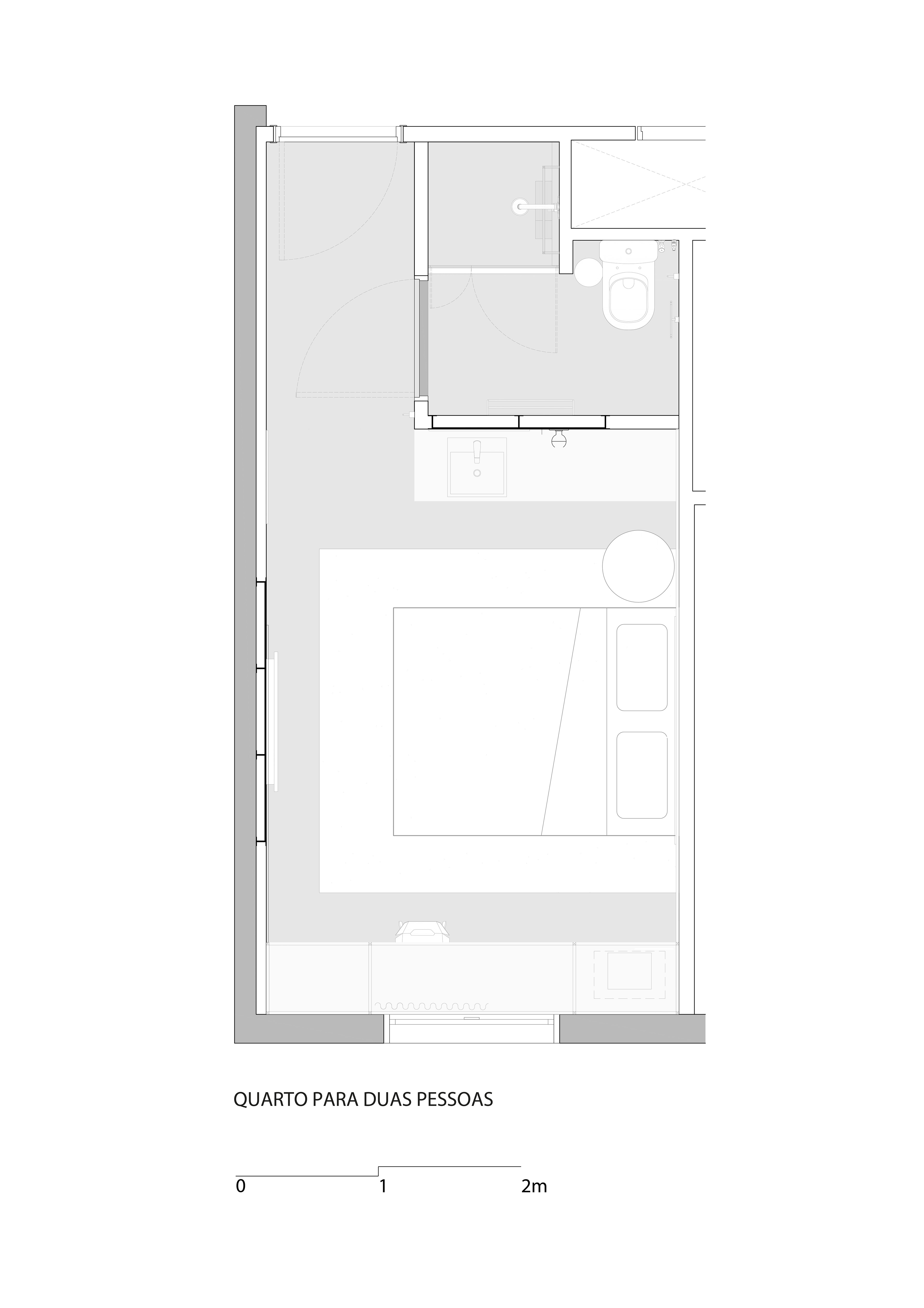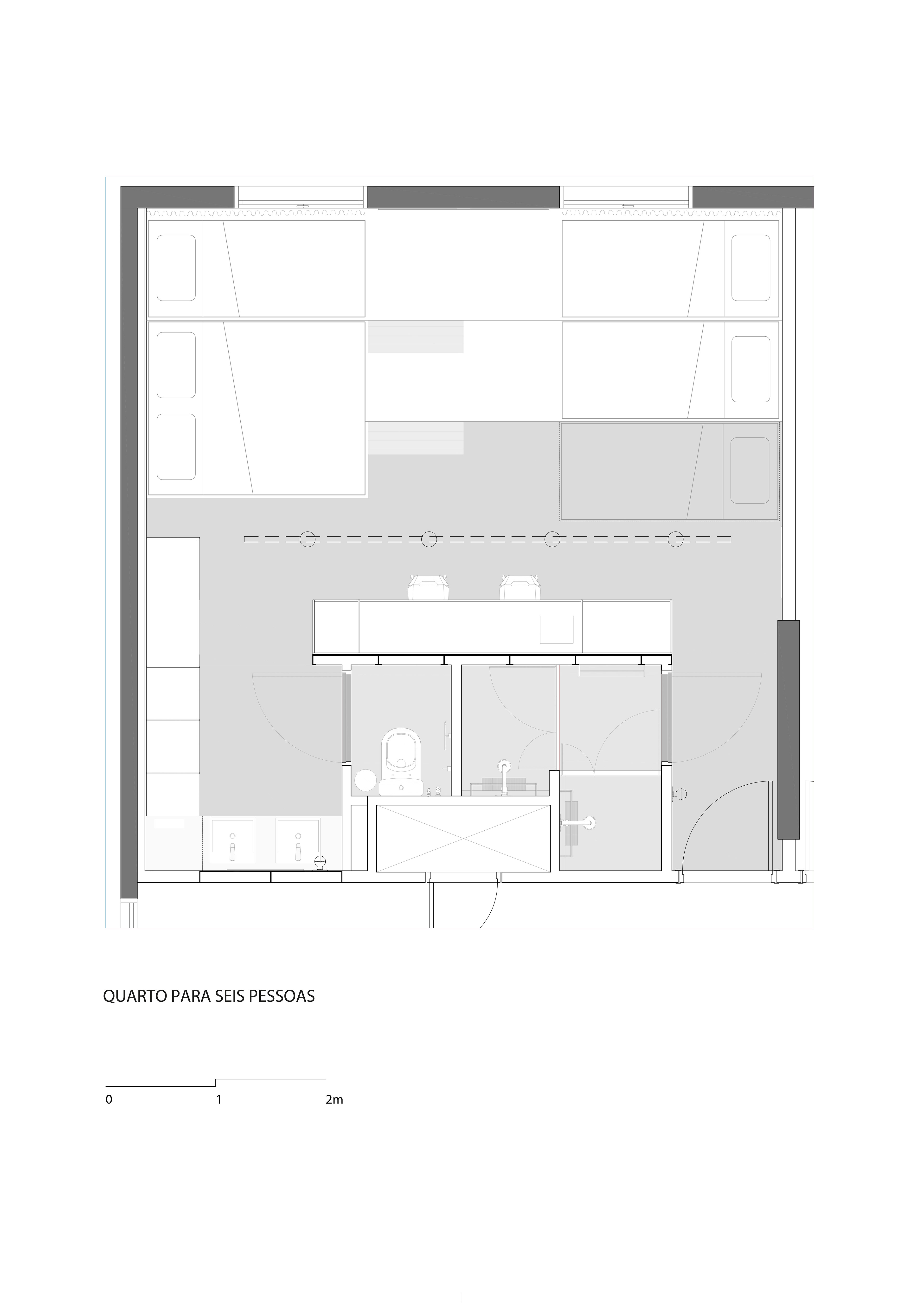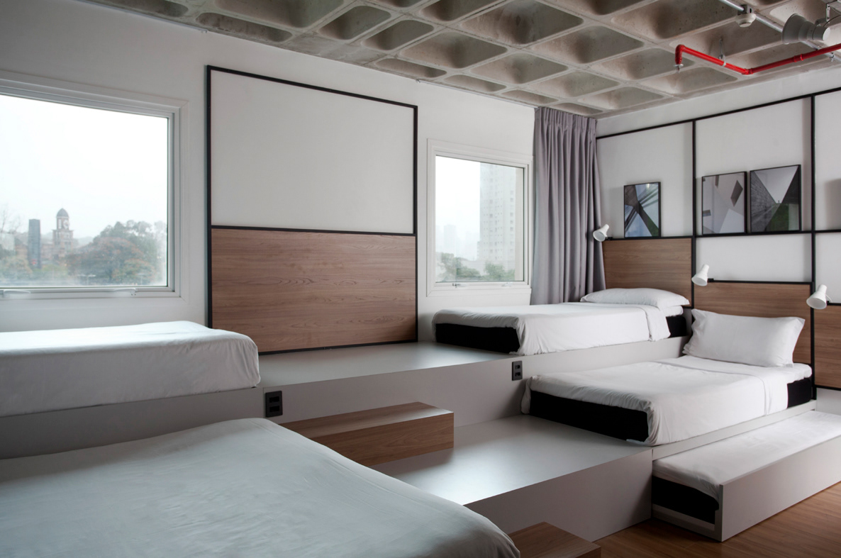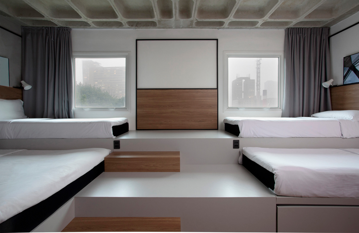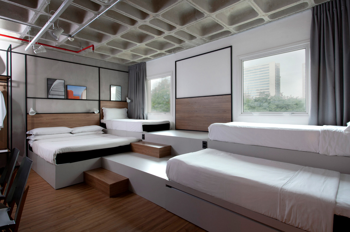 Pensando em famílias e grupos maiores que optam por compartilhar um quarto, desenvolvemos quartos com 4 e 6 camas e um banheiro adicional, bem como quartos-conceito com tetos duplos. A variedade de layouts é uma agenda tendência nessa nova filosofia, instigando a curiosidade dos hóspedes e contribuindo para um novo nível de hospitalidade.