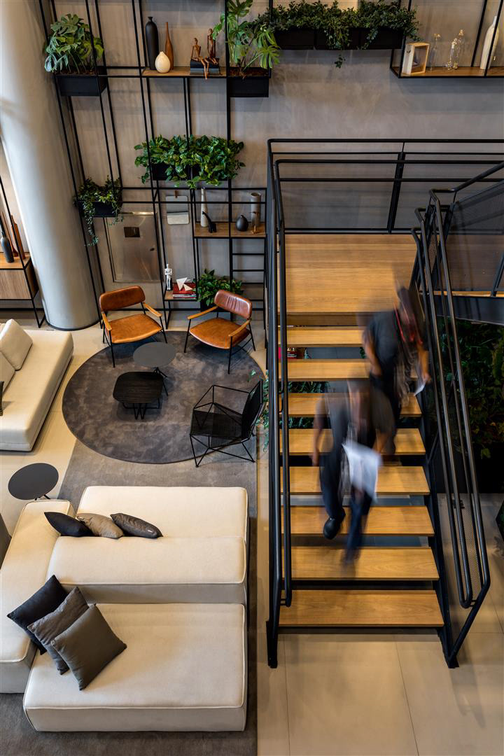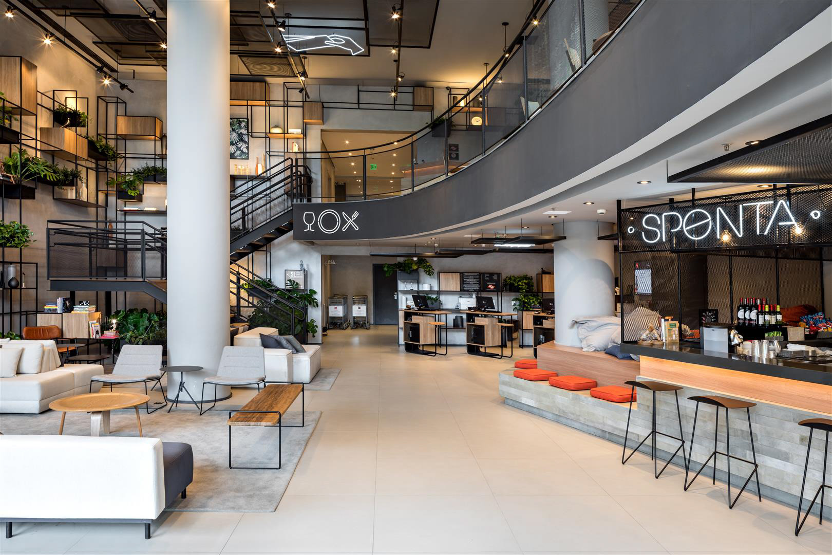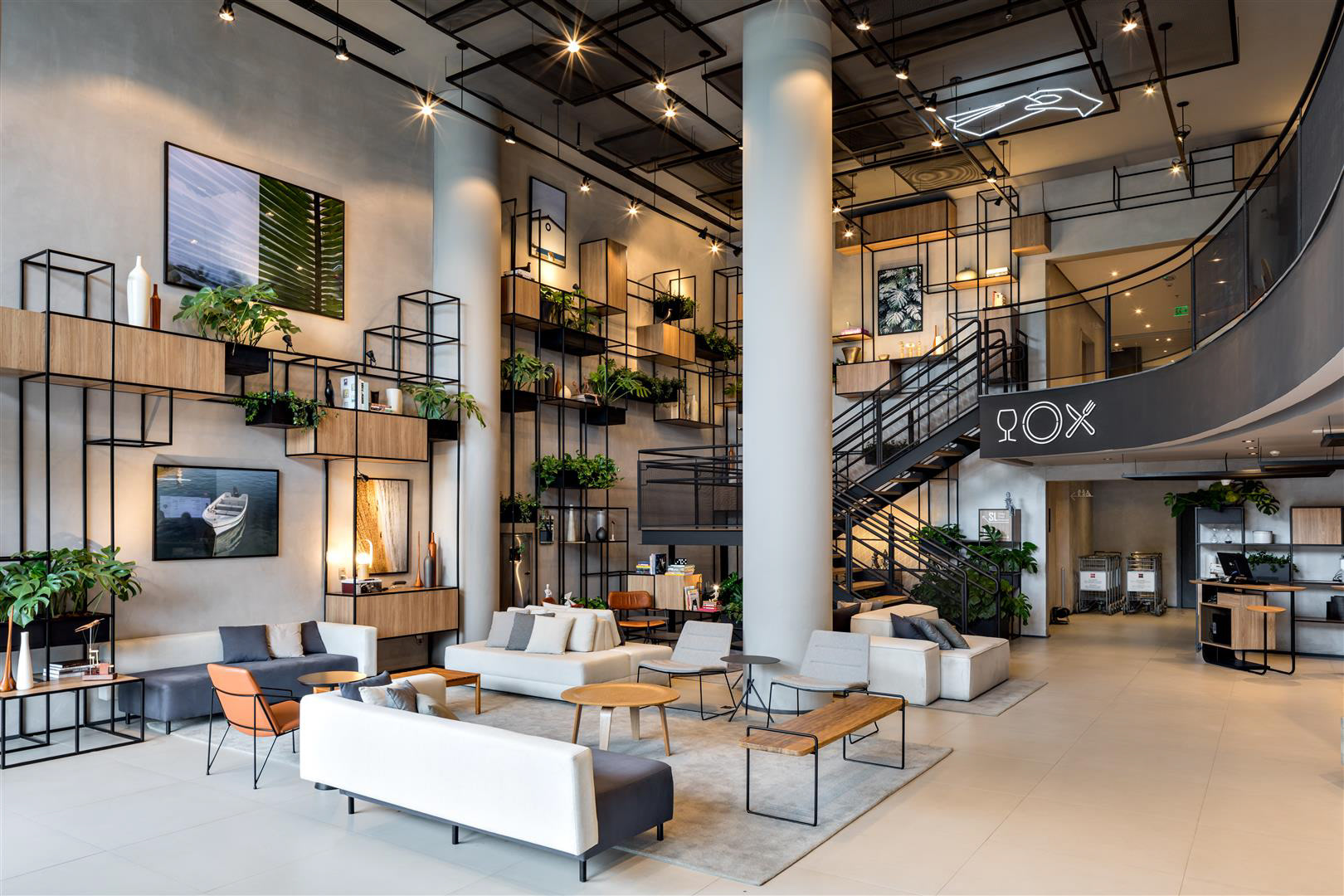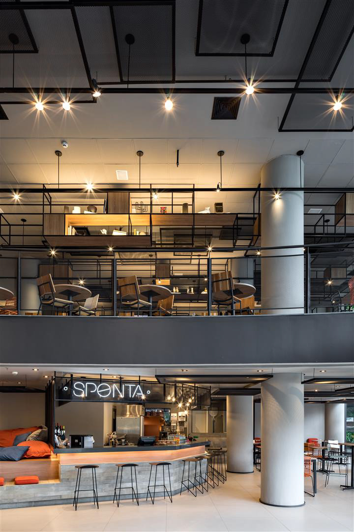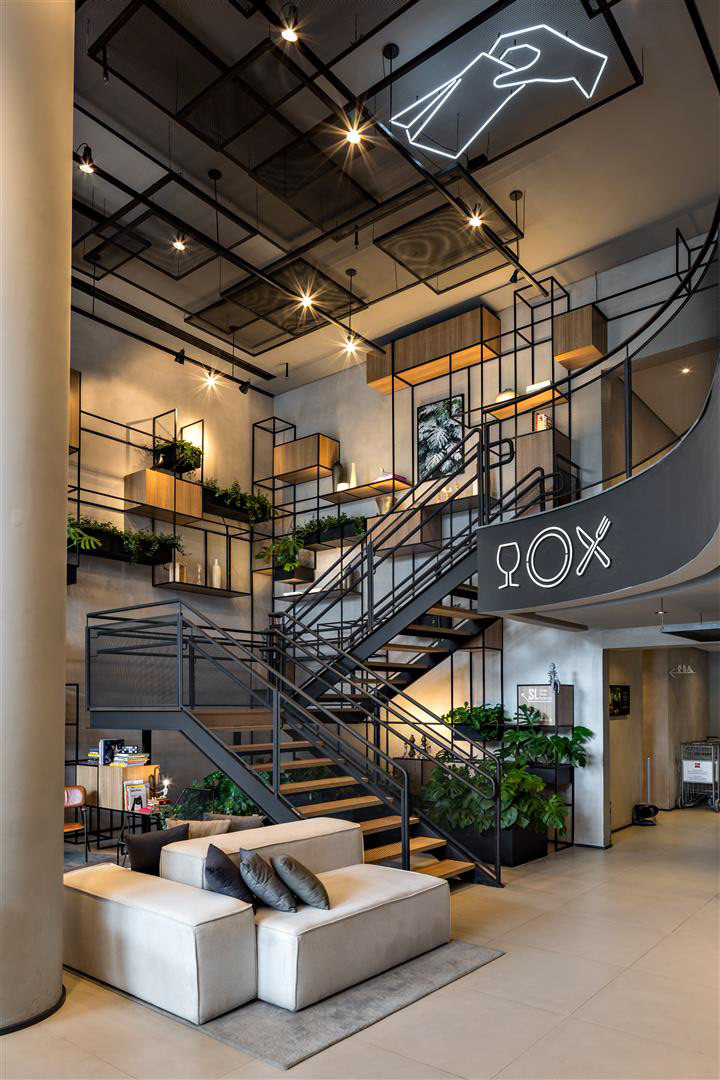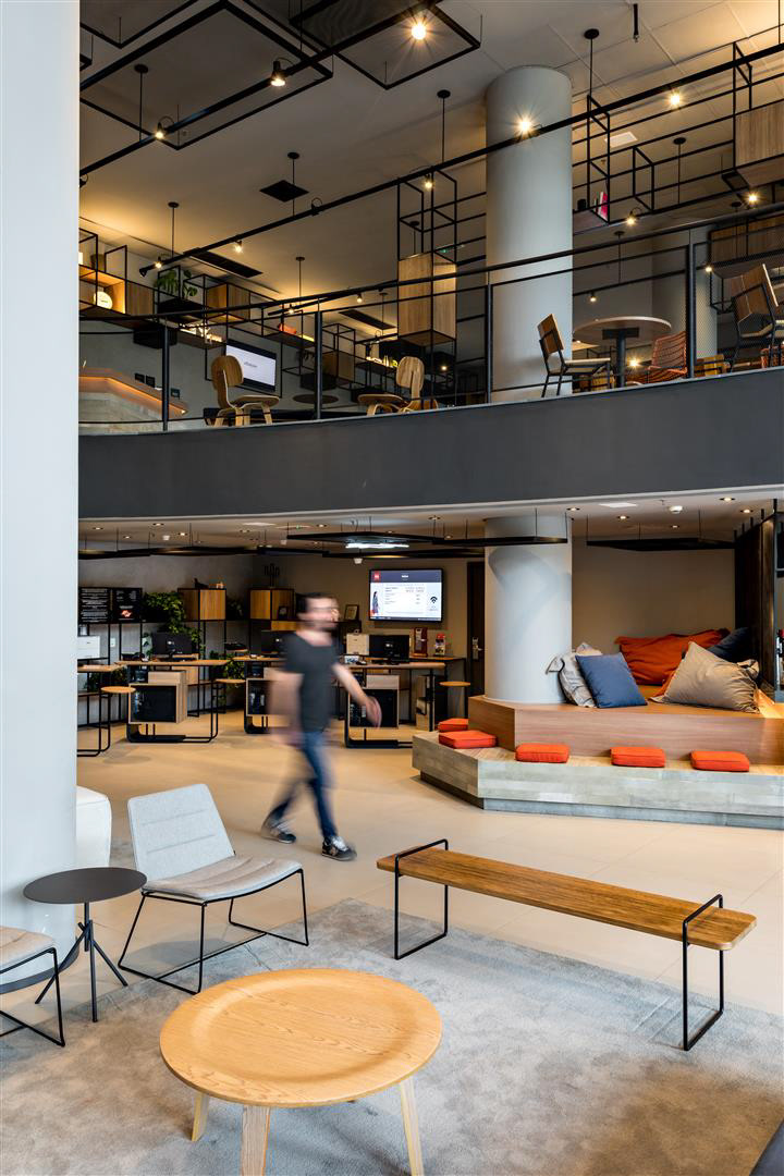 A luz do dia inunda o lobby, as áreas de café da manhã/restaurante e o Coworking. À noite, os spots direcionais criam um ambiente contemporâneo complementado por luzes de neon. O bar e a área de estar estão localizados tanto dentro quanto fora do lobby, criando uma possibilidade convidativa para apreciar cafés, bebidas e aperitivos. O design de interiores apresenta como núcleo as prateleiras multifuncionais, o sofá linear, as molduras de teto suspensas e o assento de nível duplo projetado especialmente para o Ibis Plaza.