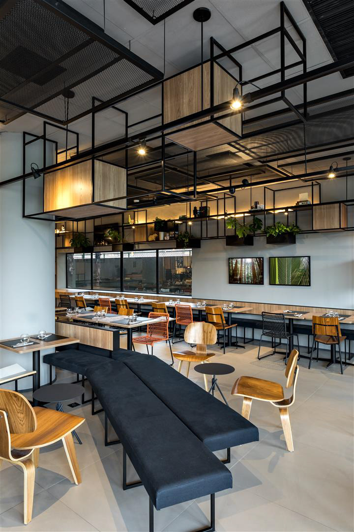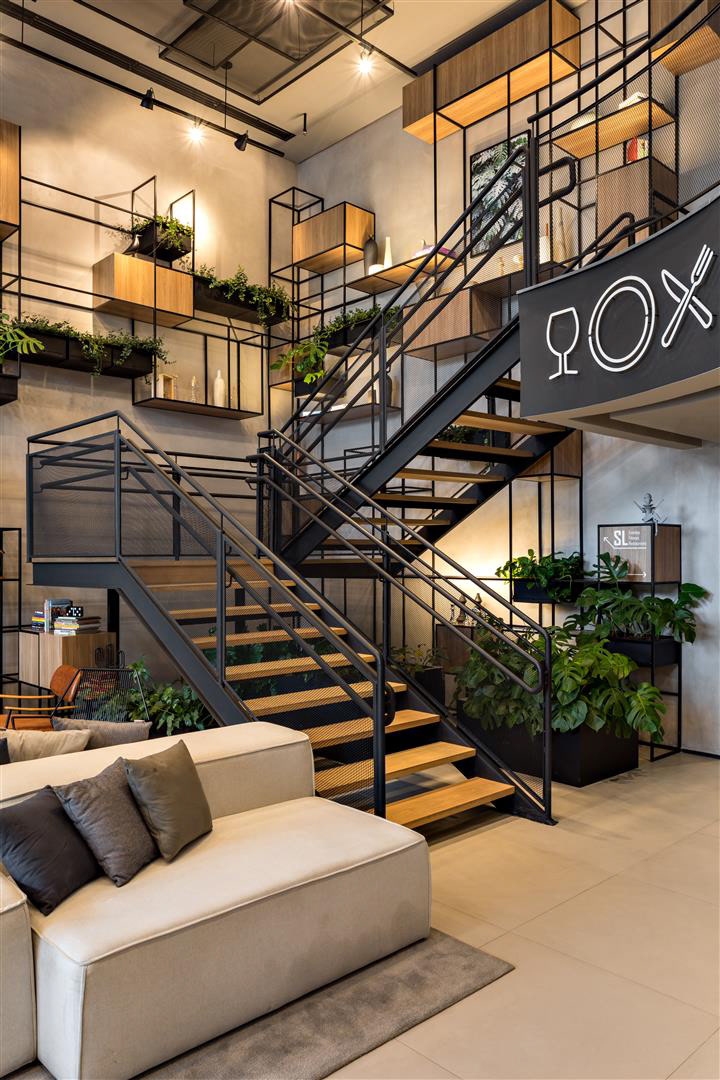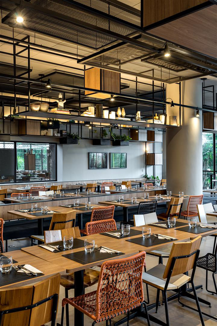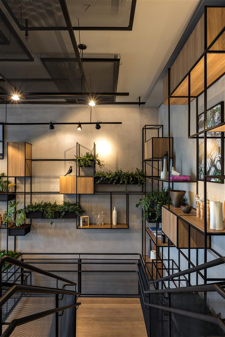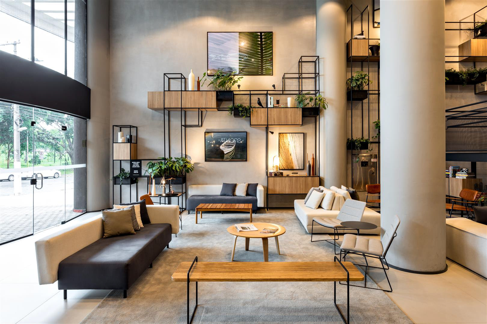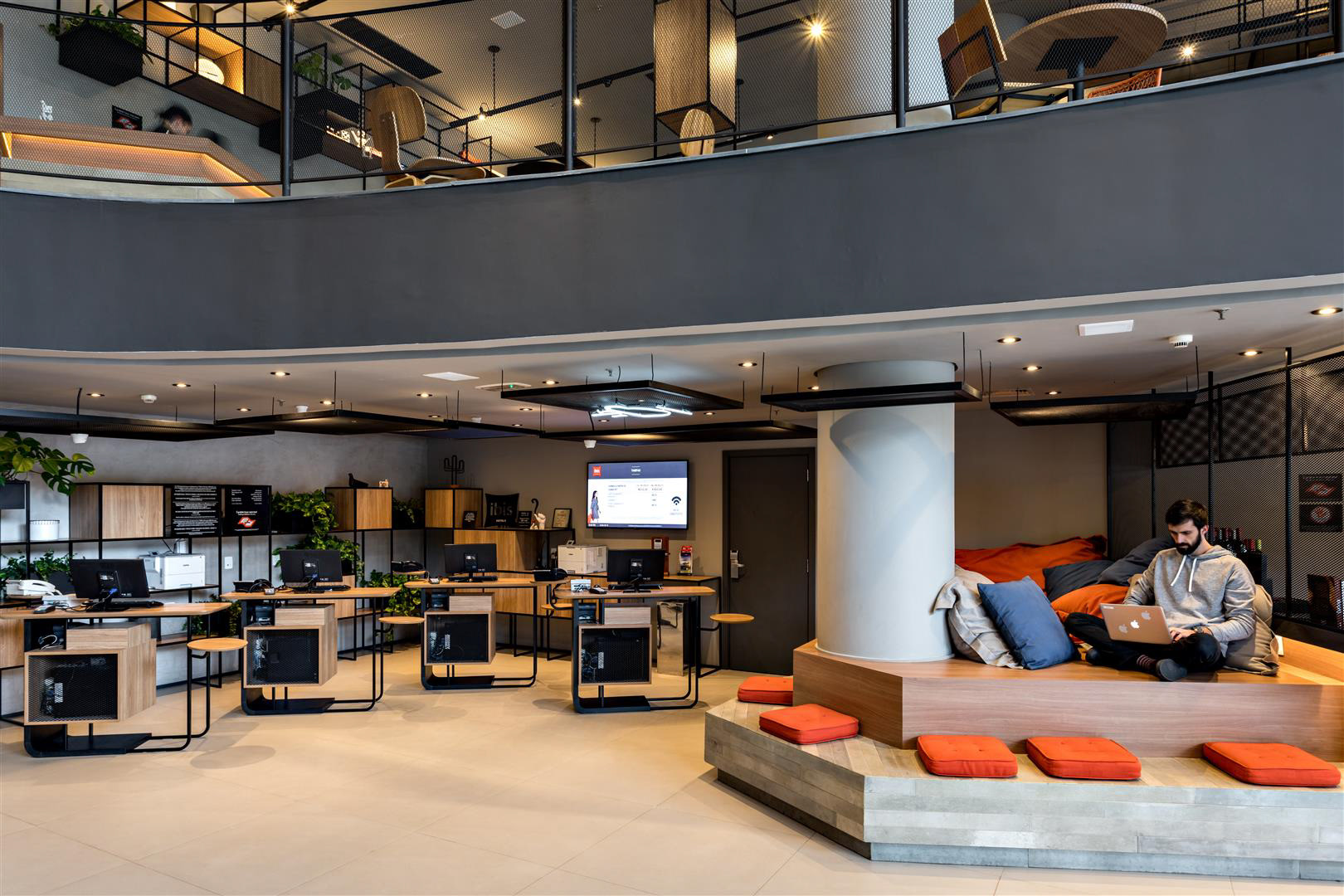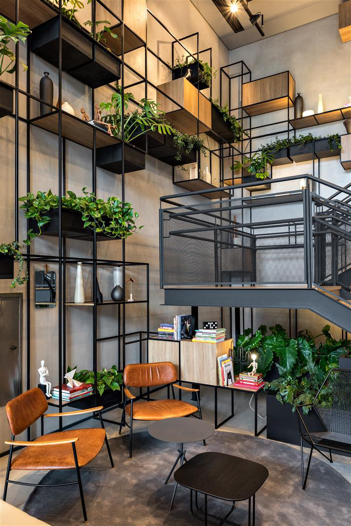A luz do dia inunda o lobby, as áreas de café da manhã/restaurante e o Coworking. À noite, os spots direcionais criam um ambiente contemporâneo complementado por luzes de neon. O bar e a área de estar estão localizados tanto dentro quanto fora do lobby, criando uma possibilidade convidativa para apreciar cafés, bebidas e aperitivos. O design de interiores apresenta como núcleo as prateleiras multifuncionais, o sofá linear, as molduras de teto suspensas e o assento de nível duplo projetado especialmente para o Ibis Plaza.