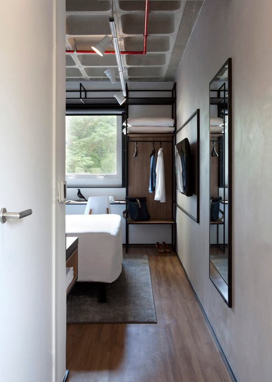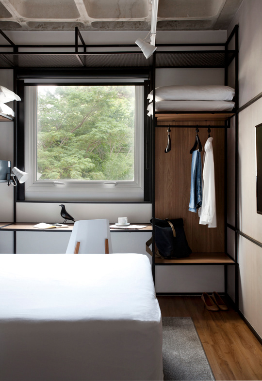 Para os quartos, a empresa projetou cadeiras, cabeceiras e um cabideiro de metal aberto para substituir o armário, criando um quarto mais flexível que os hóspedes podem usar como quiserem. “O cabideiro pode ser usado para guardar objetos, pendurar roupas e até como uma mesa para uma refeição rápida.”