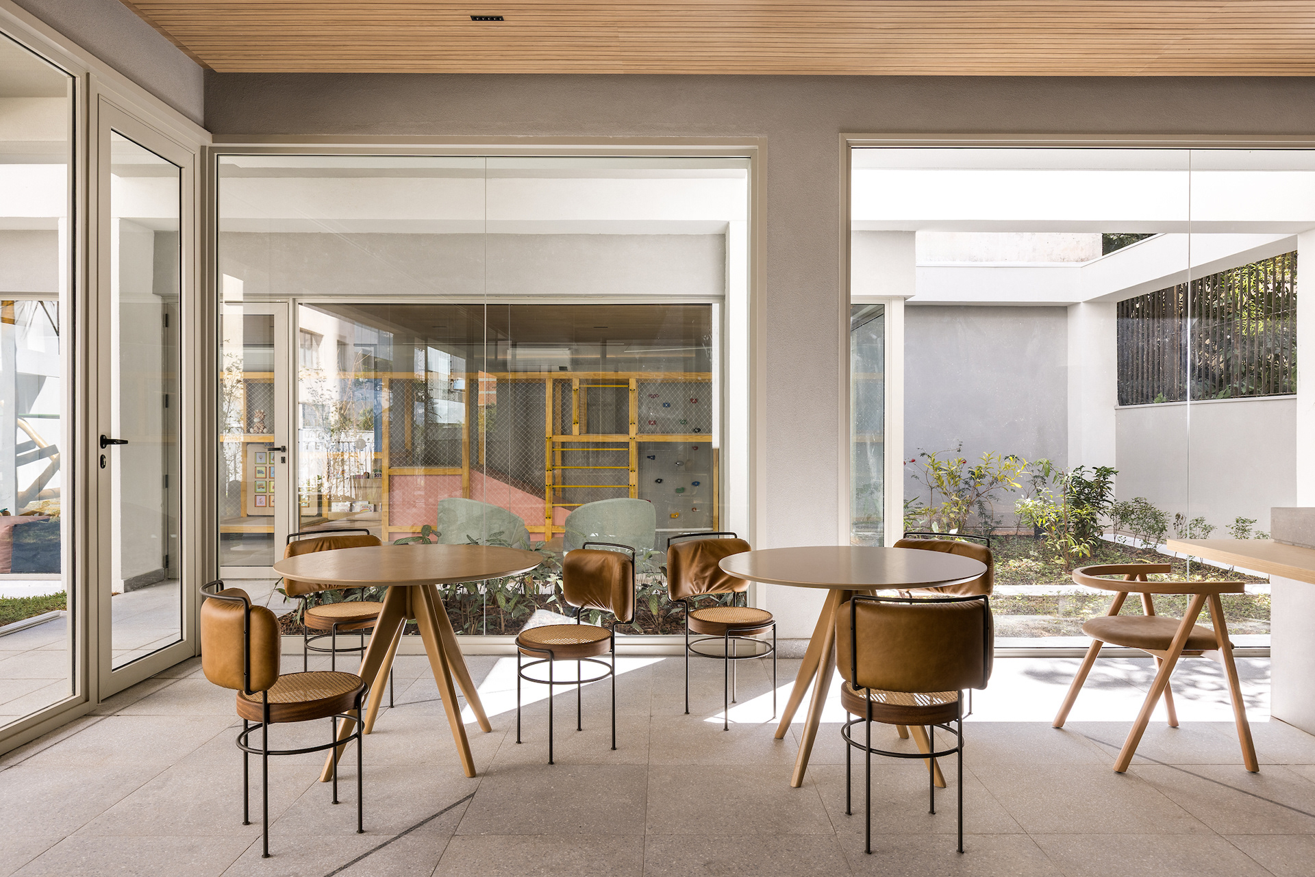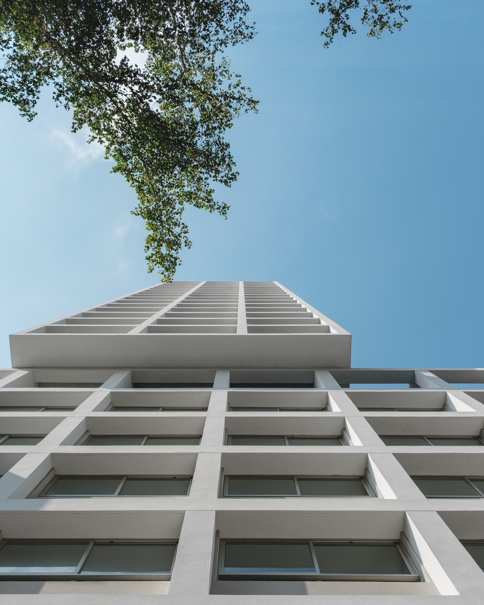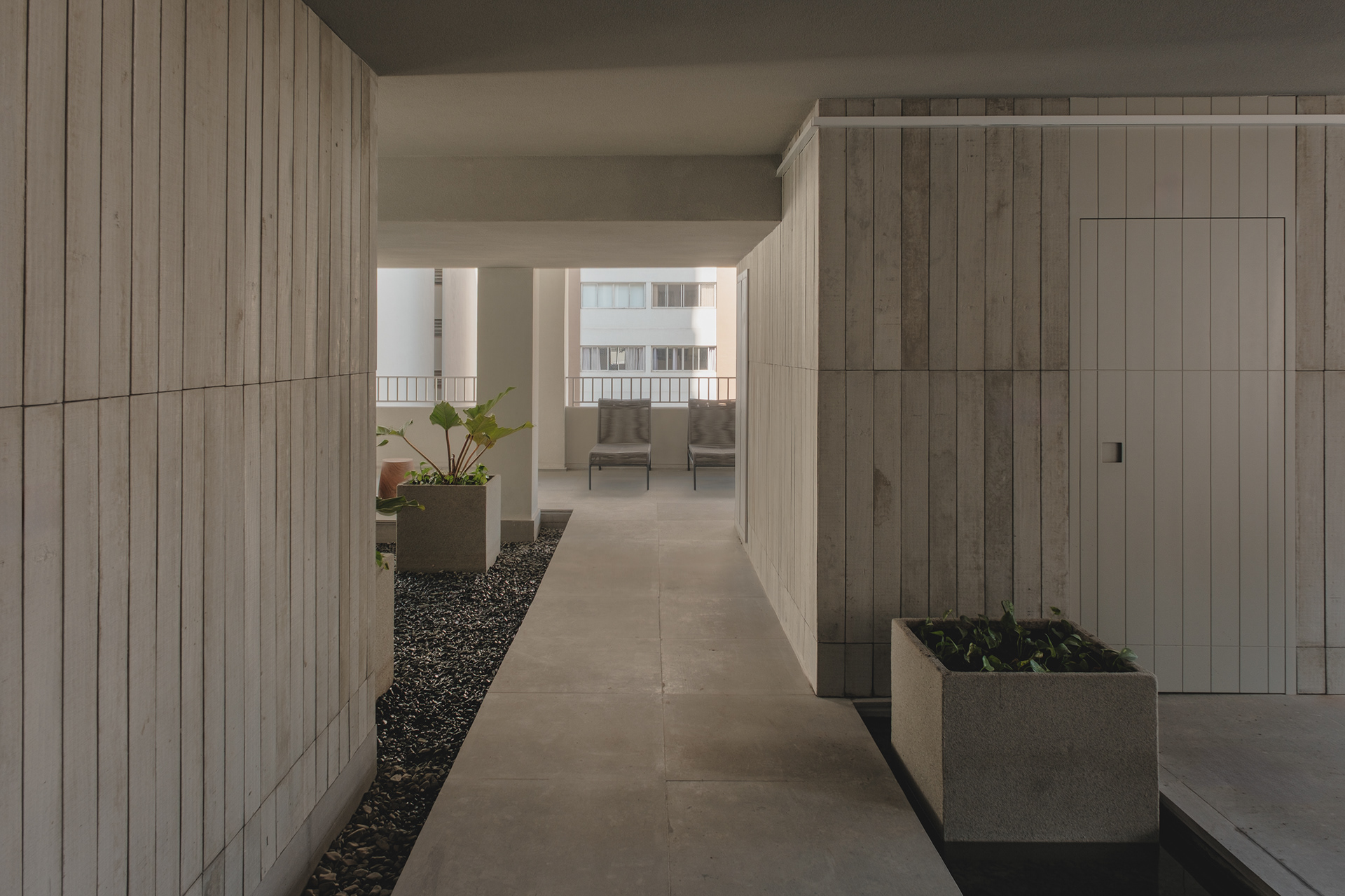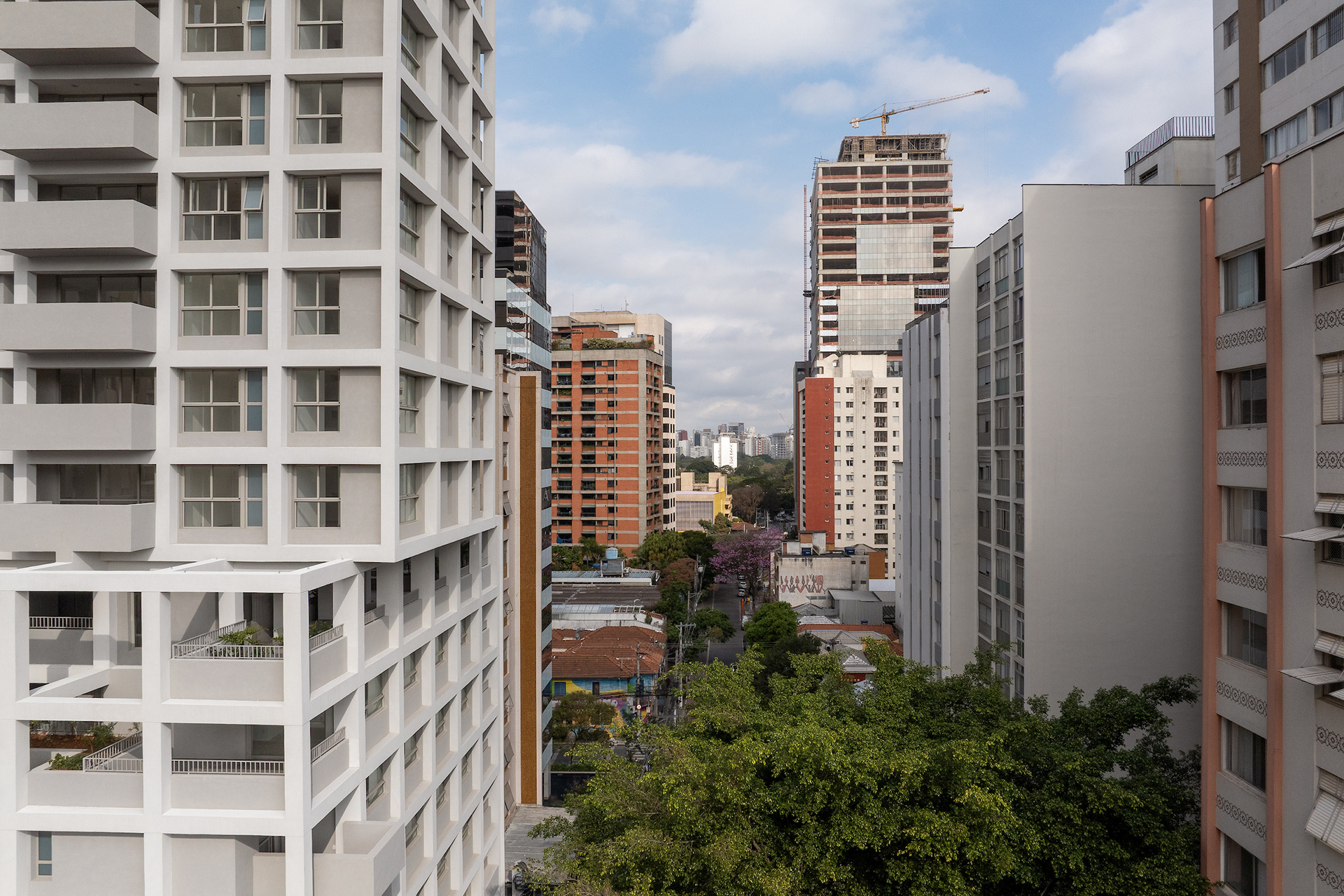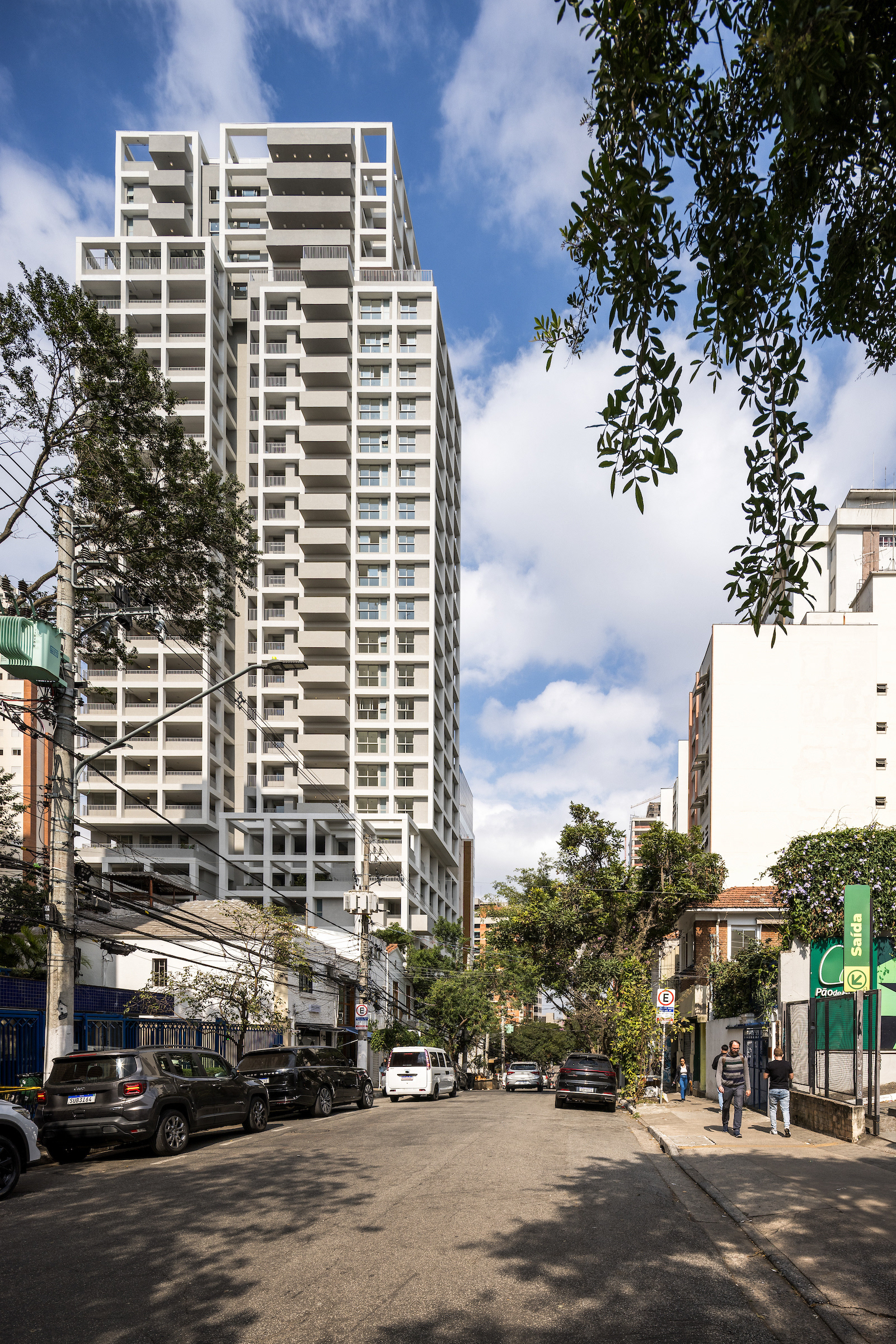 A escolha de cores claras e neutras, como branco e cinza, cumpre o papel de exacerbar a função da luz e da sombra na leitura da grelha e dos volumes. Elas também ressaltam os elementos vegetais que acontecem sempre que possível, sobretudo onde a grelha cria espaços externos de transição, com jardineiras ao mesmo tempo dentro da estrutura, mas também expostas ao tempo. A pureza do branco se alia à rigidez da estrutura para resultar num objeto urbano direto, sintético e claro, sem excessos. Numa paisagem urbana tão complexa quanto a paulistana, às vezes é importante saber falar baixo, sussurrar.