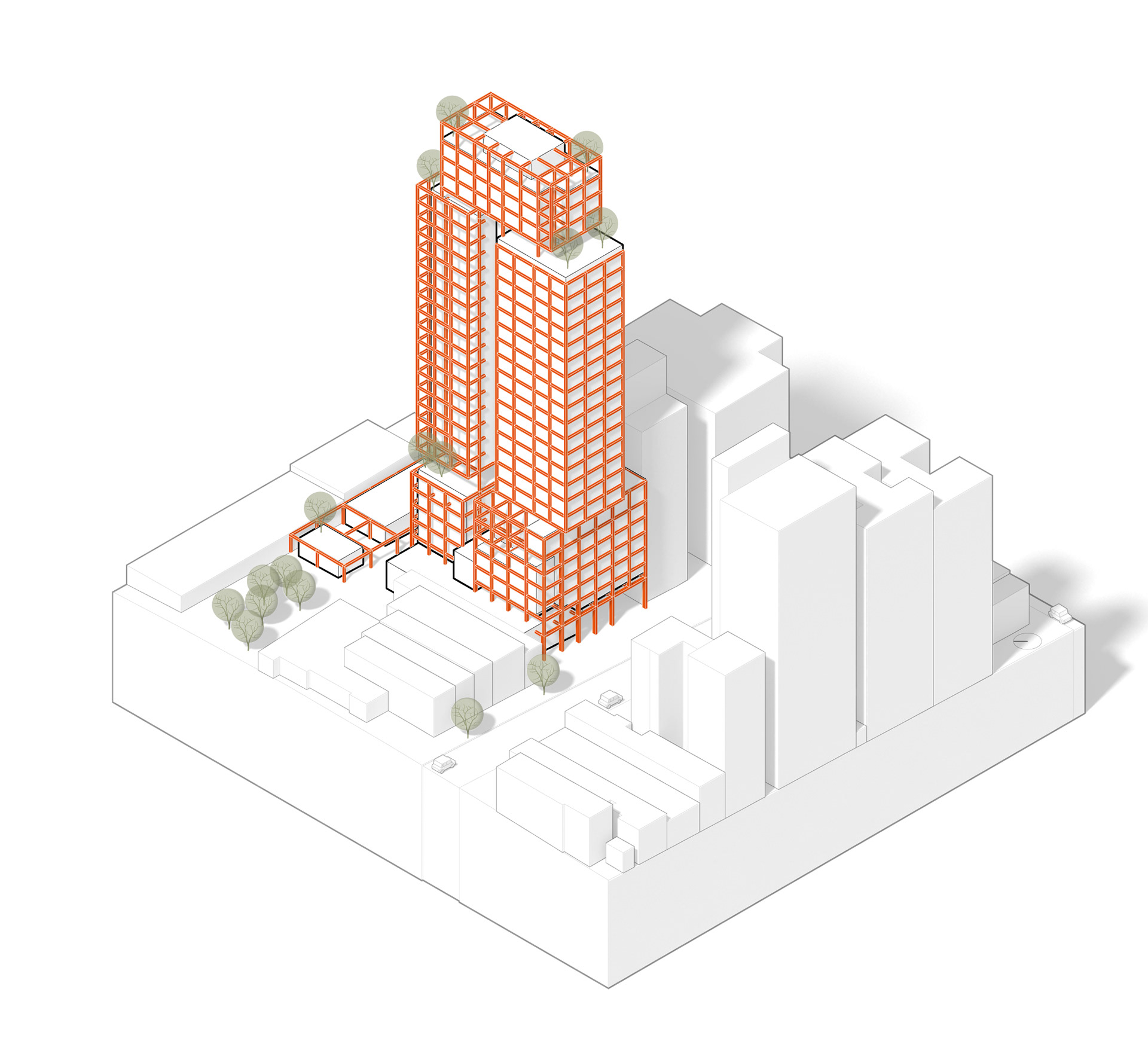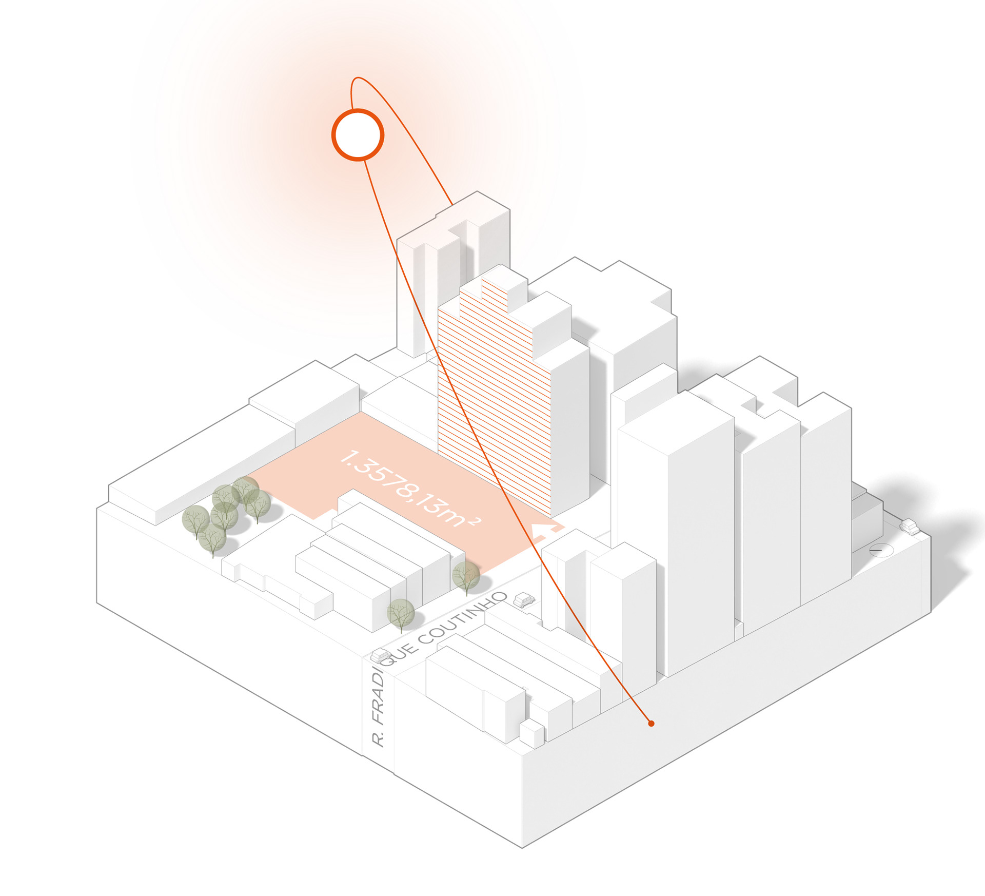 A testada frontal cumpre a difícil tarefa de acomodar uma loja, o acesso aos apartamentos de locação, o acesso para os apartamentos residenciais e a rampa da garagem. Assim como os demais acessos, a loja fica protegida pelo volume das unidades de menor tamanho, formando uma pequena praça coberta que amplifica o espaço público e cria espaço para o edifício se acomodar à declividade da rua. Este primeiro bloco acima do térreo é composto de estúdios, apartamentos com cerca de 30m² que são destinados a hospedagem e moradia. Sua geometria independente dos demais volumes destaca a separação de tipologias, tal como acontece com o restante da torre. Assim, nos andares superiores temos um grande volume que acomoda apartamentos de 2 dormitórios, ladeado por outro que contém unidades de 3 dormitórios. Acima destes, poucas unidades especiais, algumas com terraços maiores, outras com tipologias mais amplas, formam mais um bloco.
