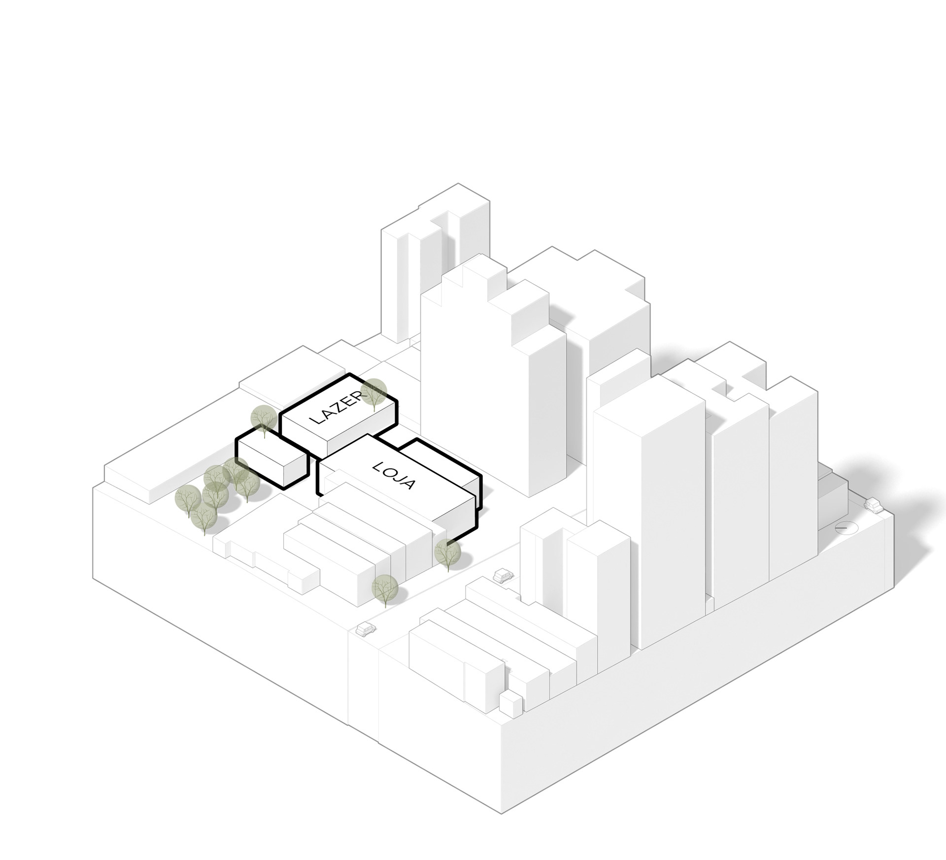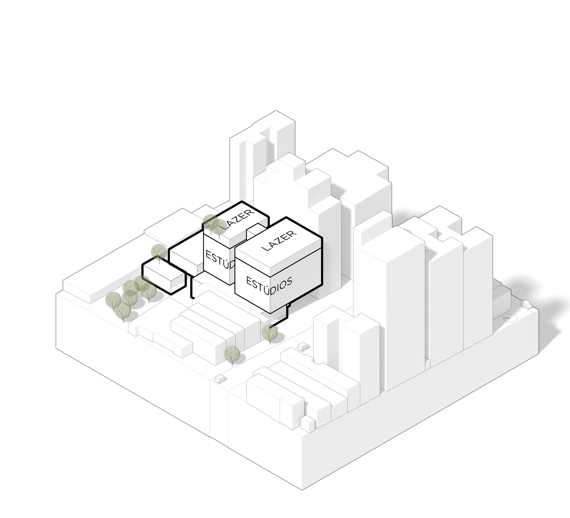 Por fim, ao fundo, isolado no jardim do térreo, temos mais um bloco que contém alguns dos usos de lazer do edifício, como brinquedoteca, salão de festas e piscina. Os espaços comuns de lazer são complementados por um pavimento intermediário entre os blocos de diferentes tipologias, e contém spa e academia.