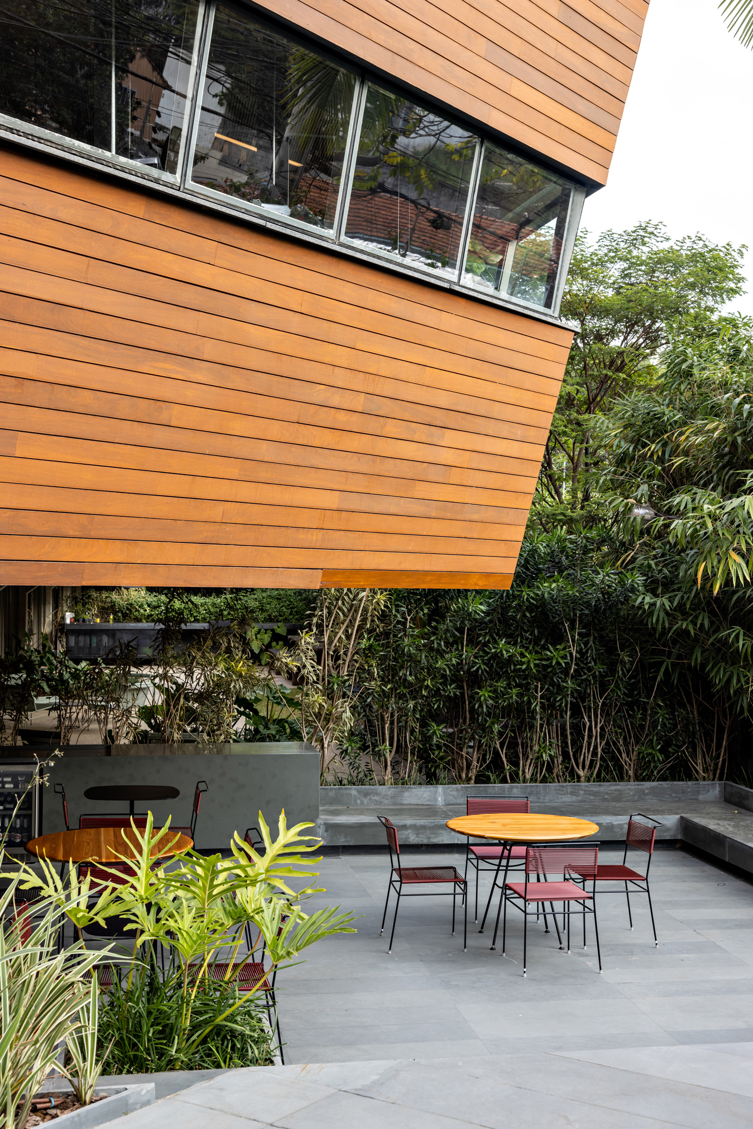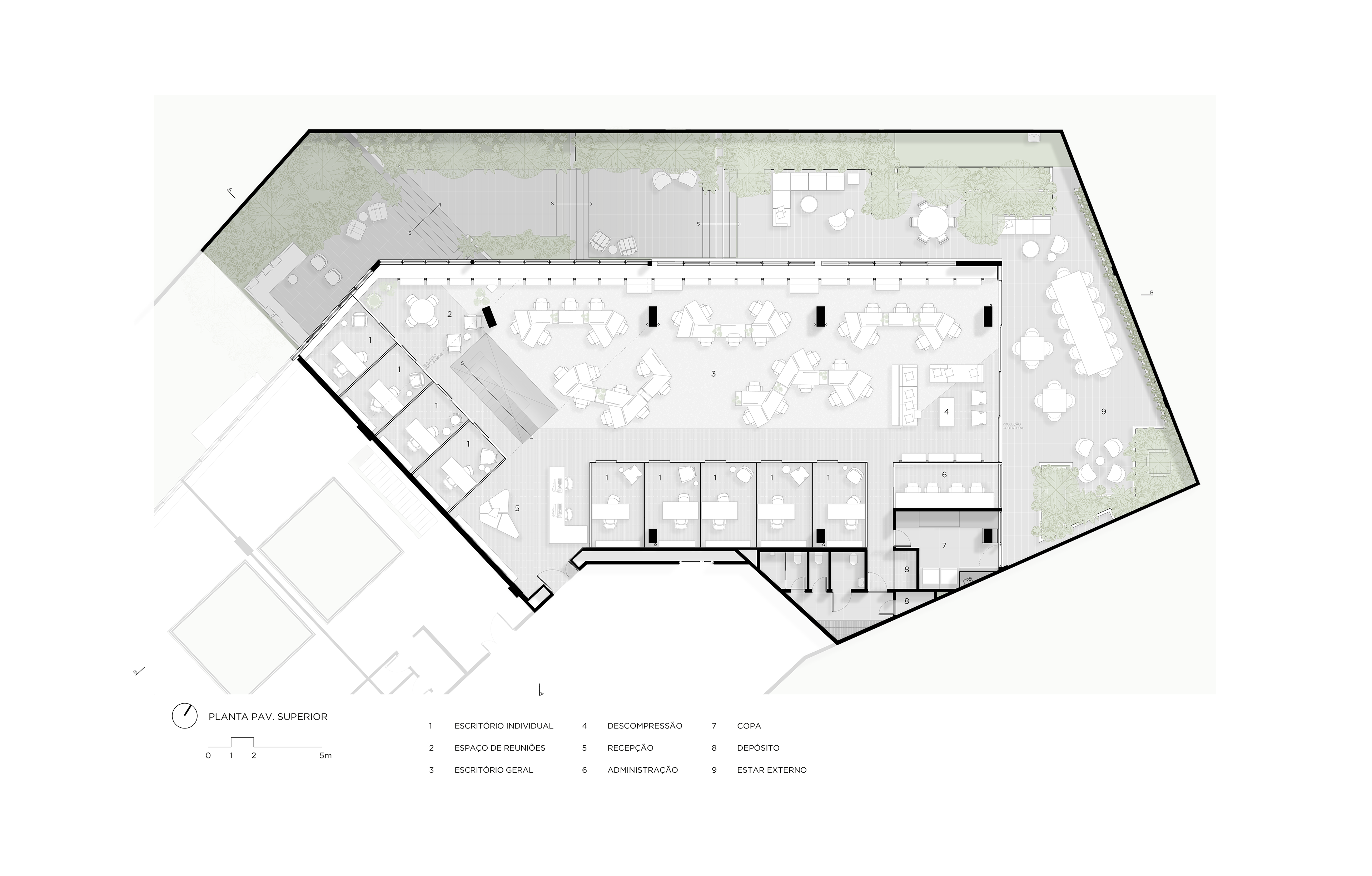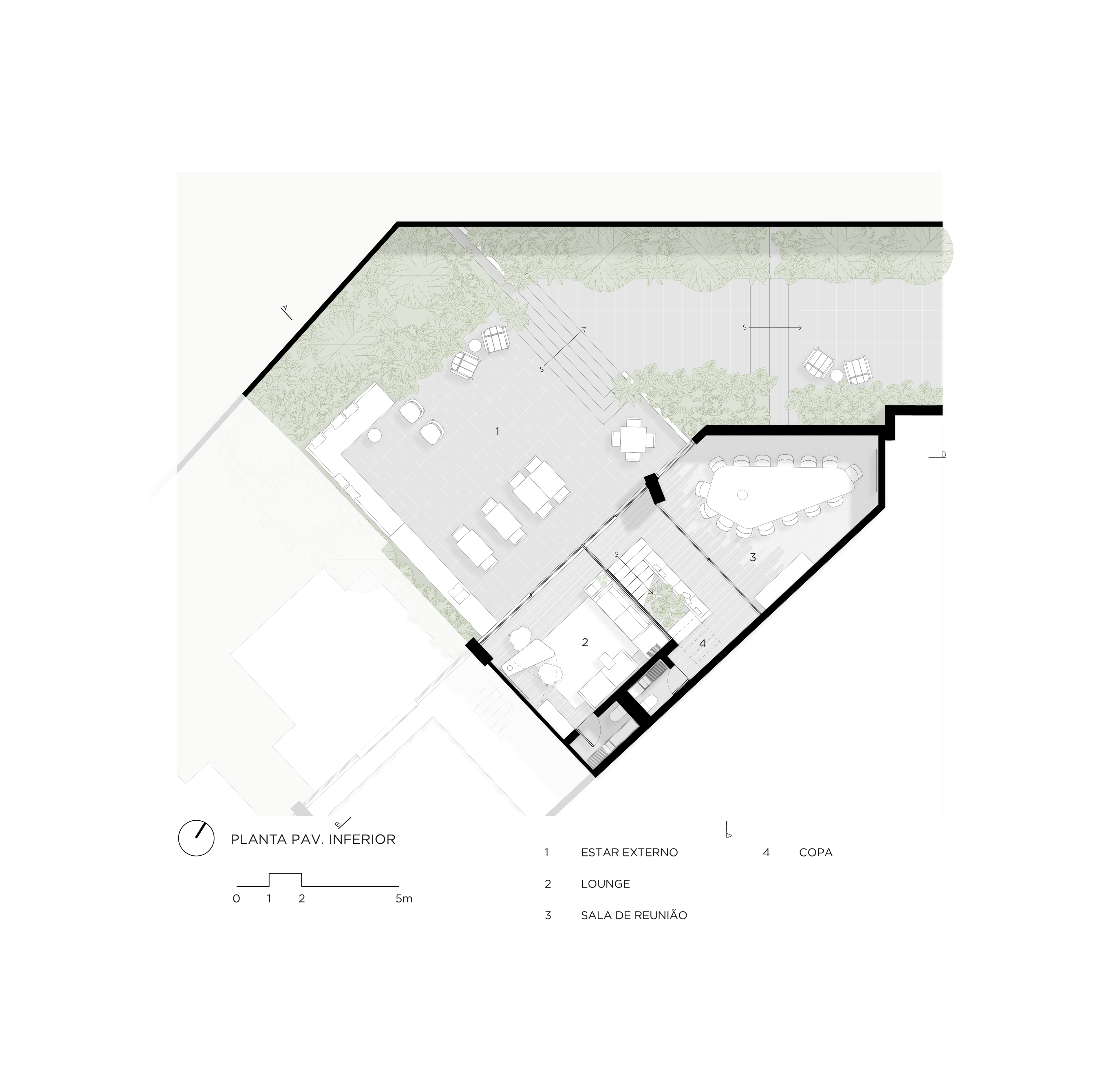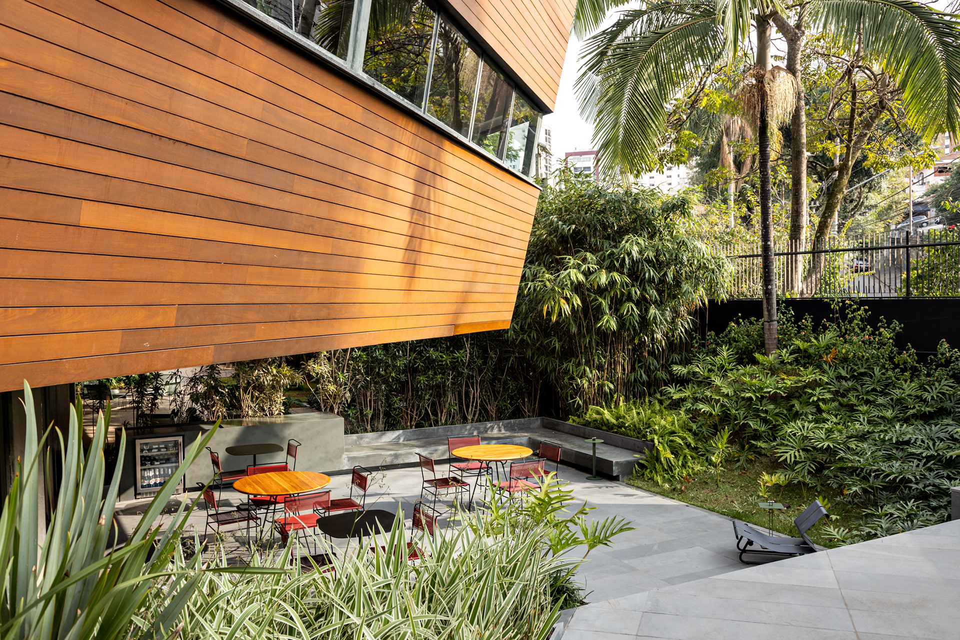 O escritório conta com várias áreas de jardins, integrando o verde ao ambiente de trabalho e proporcionando uma conexão com a natureza. Esses jardins oferecem espaços de relaxamento e convívio, melhorando a qualidade de vida dos usuários do edifício. No térreo, o terraço acomoda uma grande mesa de refeições próximo à cozinha. Outros espaços de estar ao longo do jardim permitem reuniões informais, reuniões de vídeo e telefonemas de maneira integrada ao verde. O maior deles, no pavimento inferior, é visto da sala de estar e de trabalho de um dos sócios e da sala principal de reuniões. Nesta sala, uma grande mesa com pé em concreto e tampo de madeira em balanço foi desenhada pelo FGMF sob medida para o espaço.