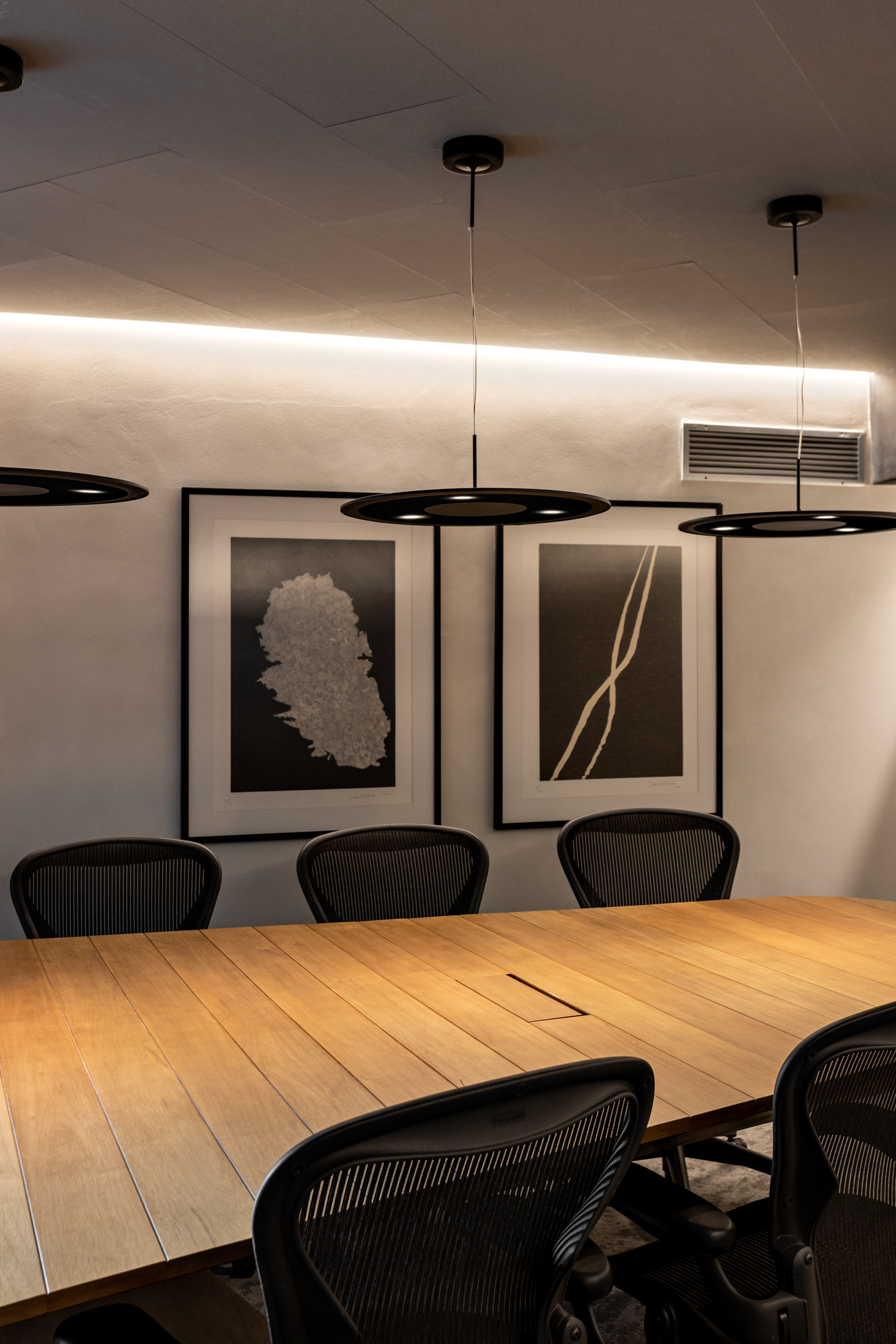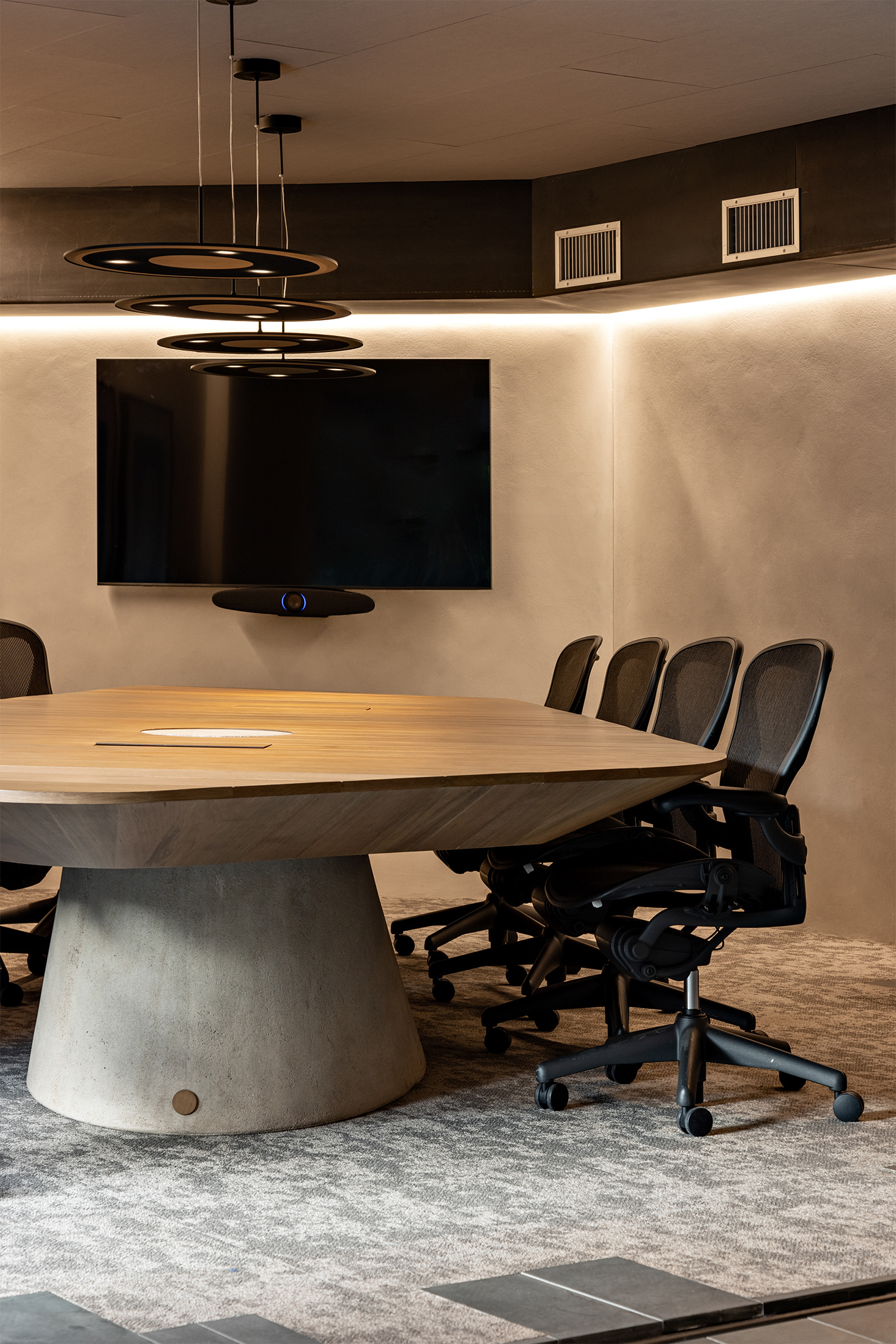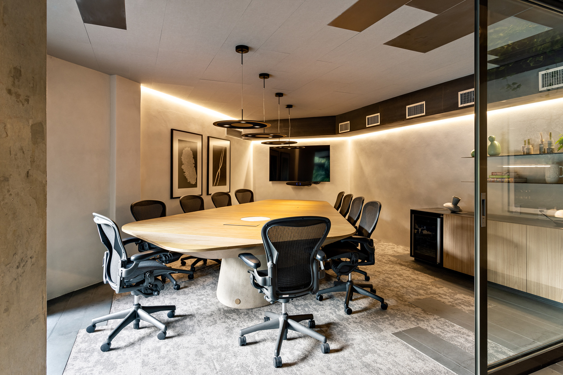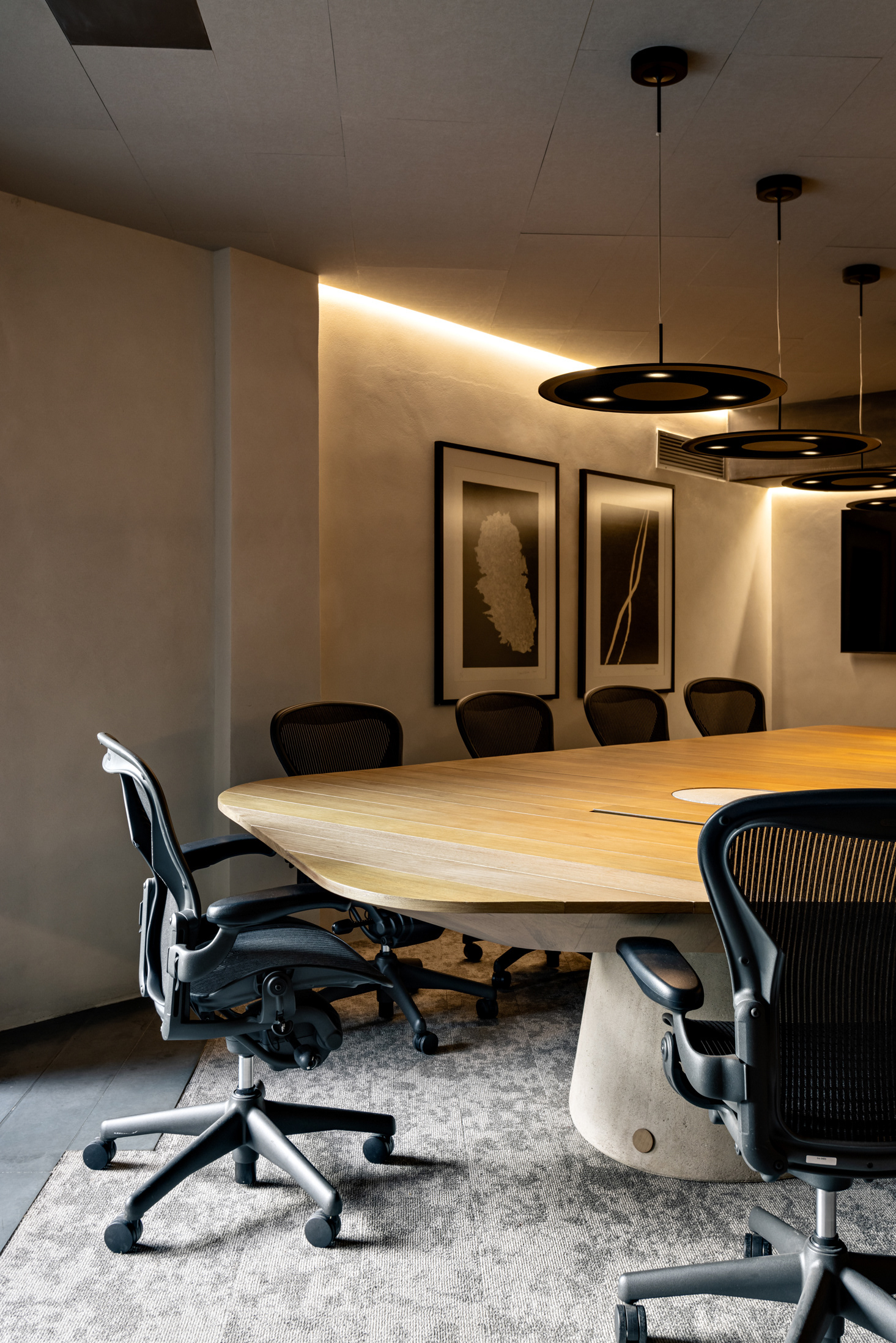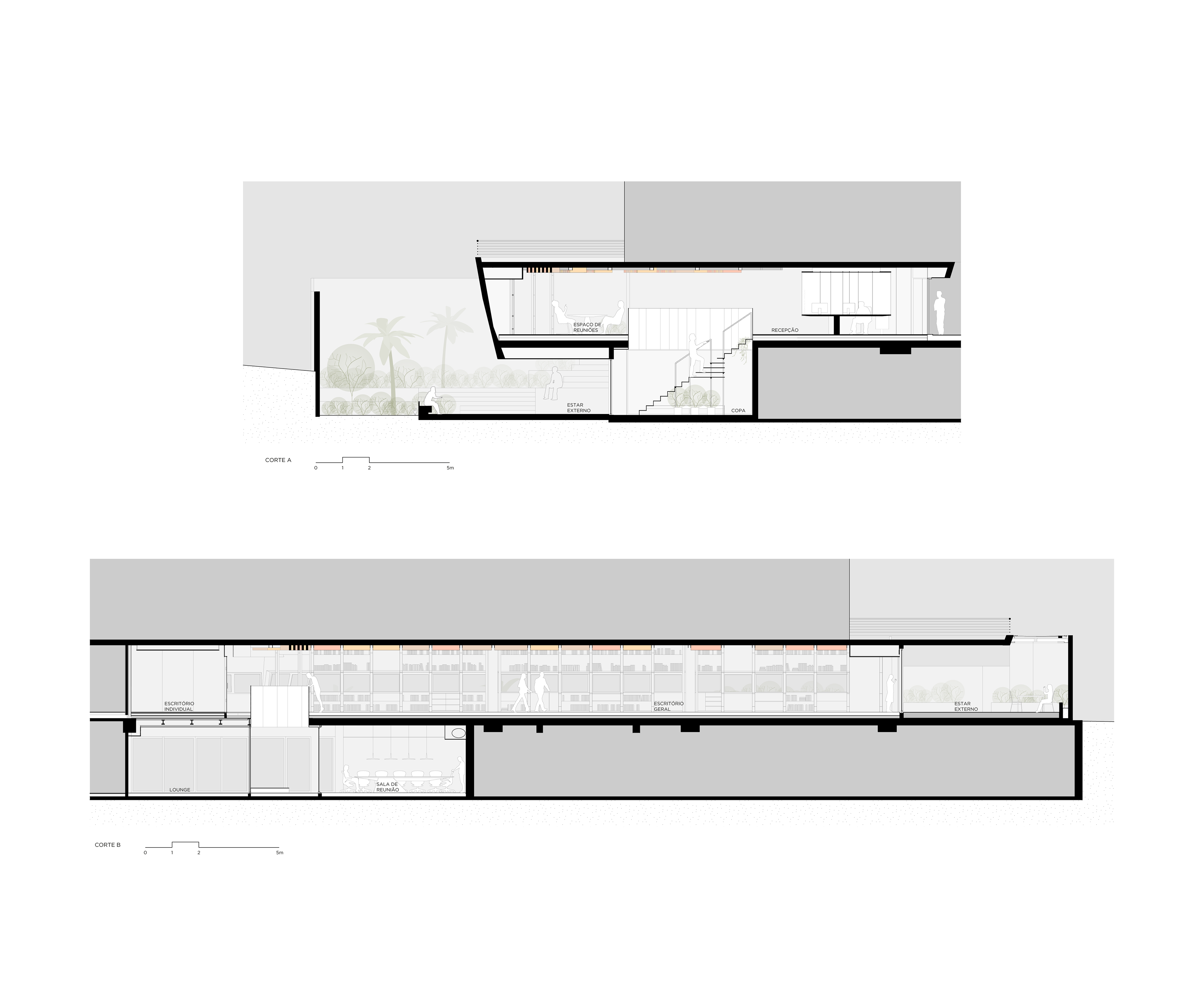 O escritório conta com várias áreas de jardins, integrando o verde ao ambiente de trabalho e proporcionando uma conexão com a natureza. Esses jardins oferecem espaços de relaxamento e convívio, melhorando a qualidade de vida dos usuários do edifício. No térreo, o terraço acomoda uma grande mesa de refeições próximo à cozinha. Outros espaços de estar ao longo do jardim permitem reuniões informais, reuniões de vídeo e telefonemas de maneira integrada ao verde. O maior deles, no pavimento inferior, é visto da sala de estar e de trabalho de um dos sócios e da sala principal de reuniões. Nesta sala, uma grande mesa com pé em concreto e tampo de madeira em balanço foi desenhada pelo FGMF sob medida para o espaço.
