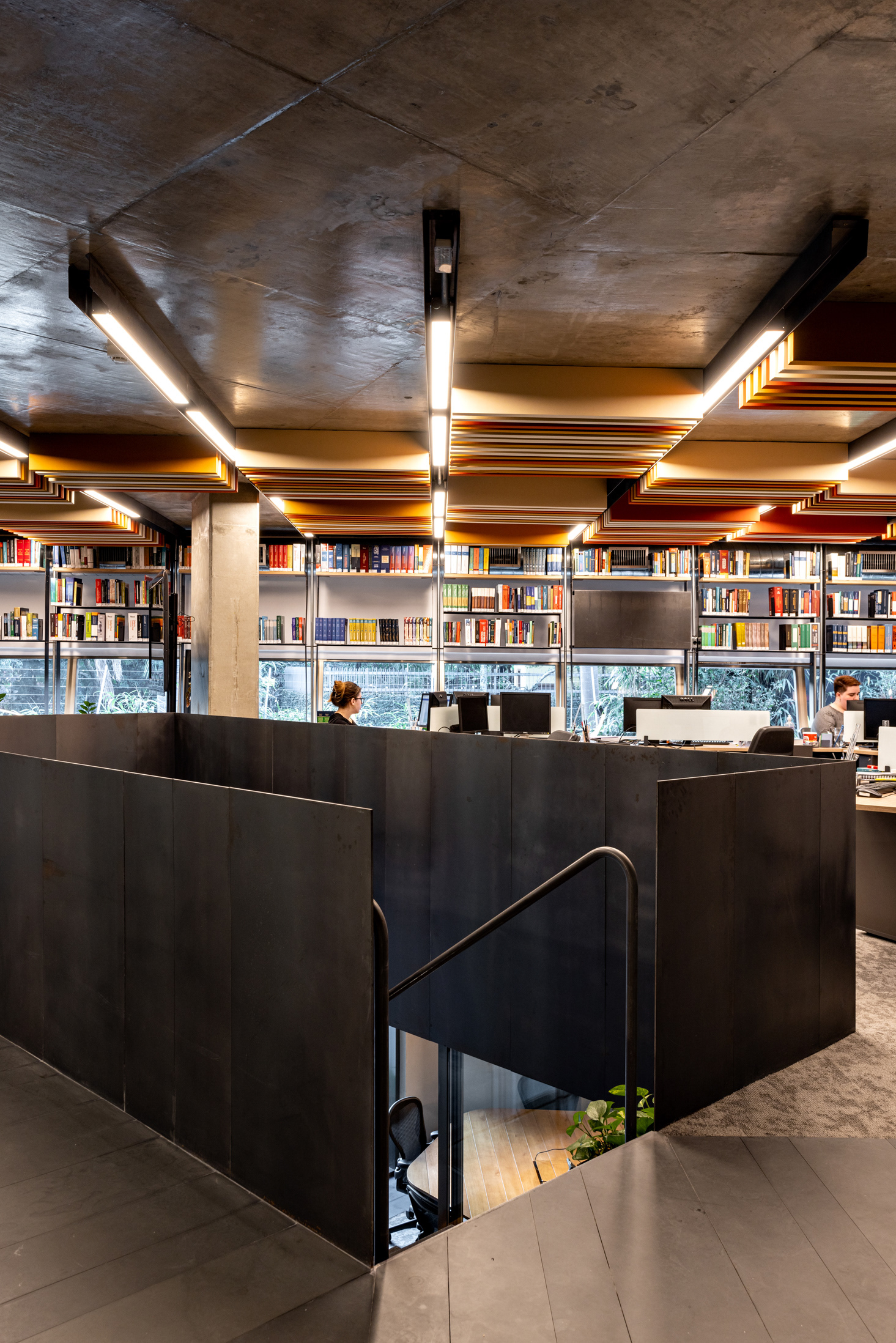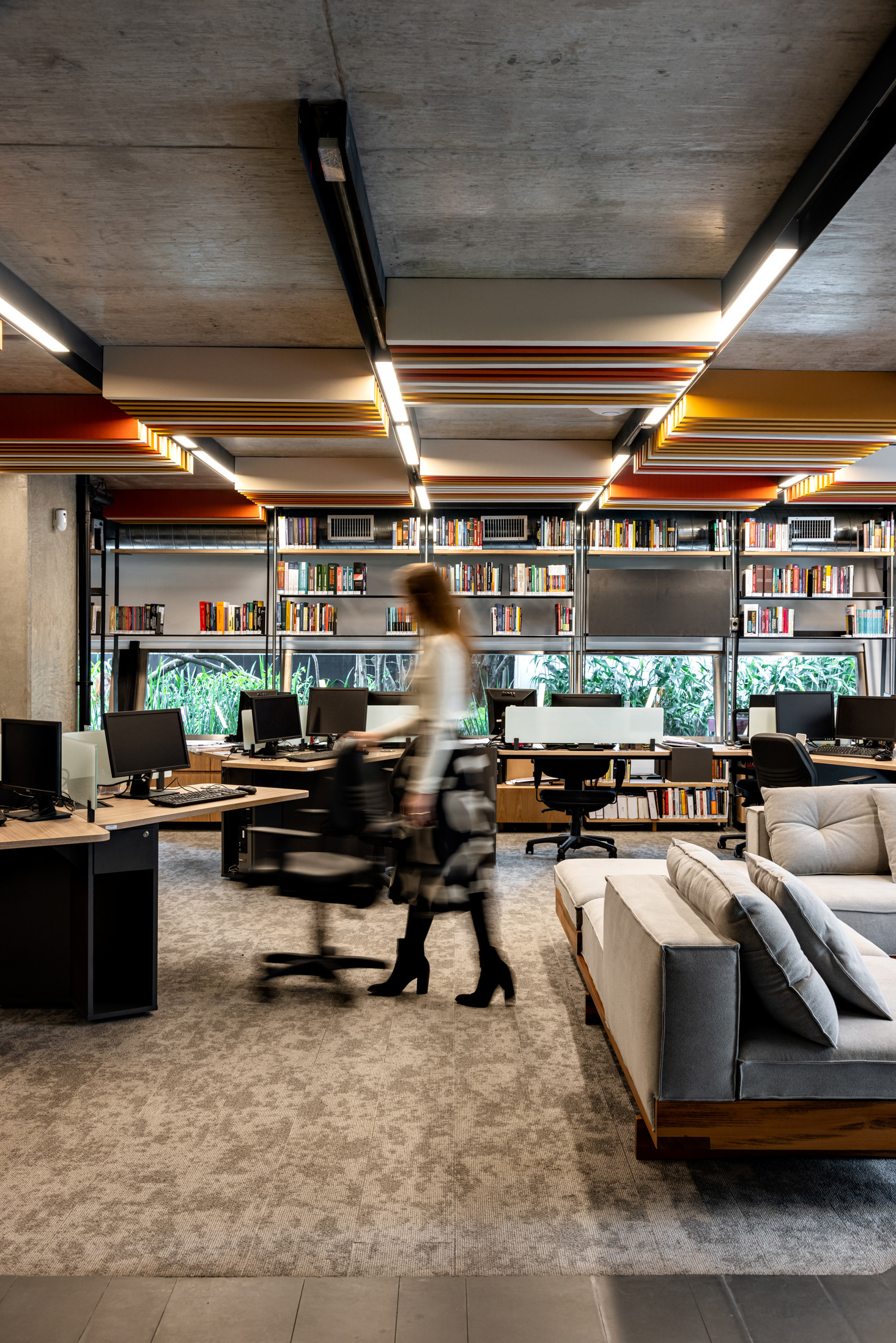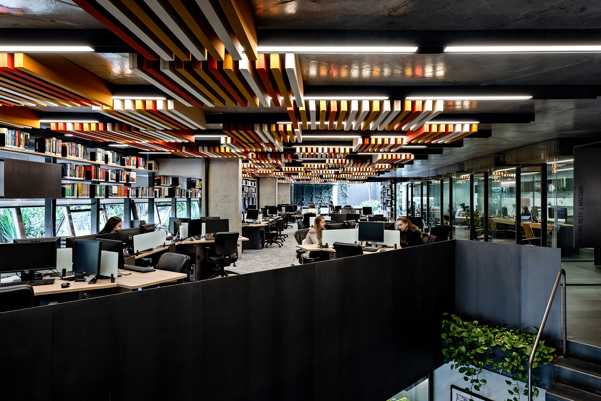Além disso, há um grande terraço com banheiro e uma sala de estar integrada ao espaço do staff, proporcionando um ambiente de trabalho agradável e colaborativo. A área do staff conta um piso de carpete para melhor conforto acústico e com elementos em aço carbono que acomodam luminárias e o forro em baffles (réguas de espuma e tecido) em cores quentes. As chapas que vêm do forro descem junto às janelas e criam a estrutura para prateleiras em aço carbono que são utilizadas para armazenamento de livros, equipamentos e objetos decorativos, unindo todo o open space deste pavimento.