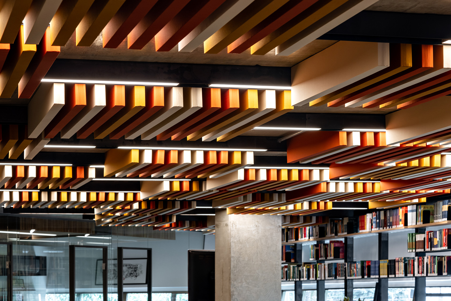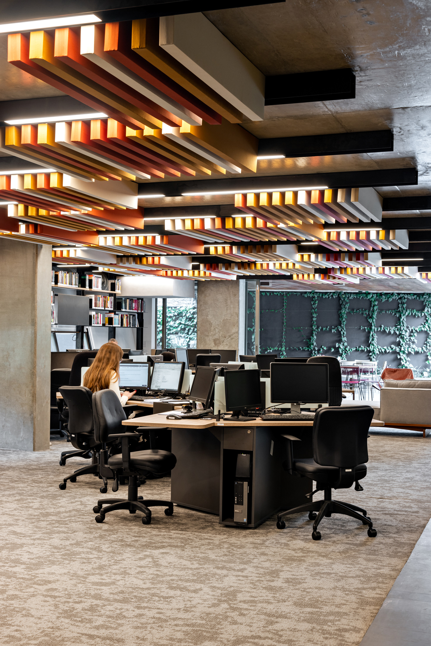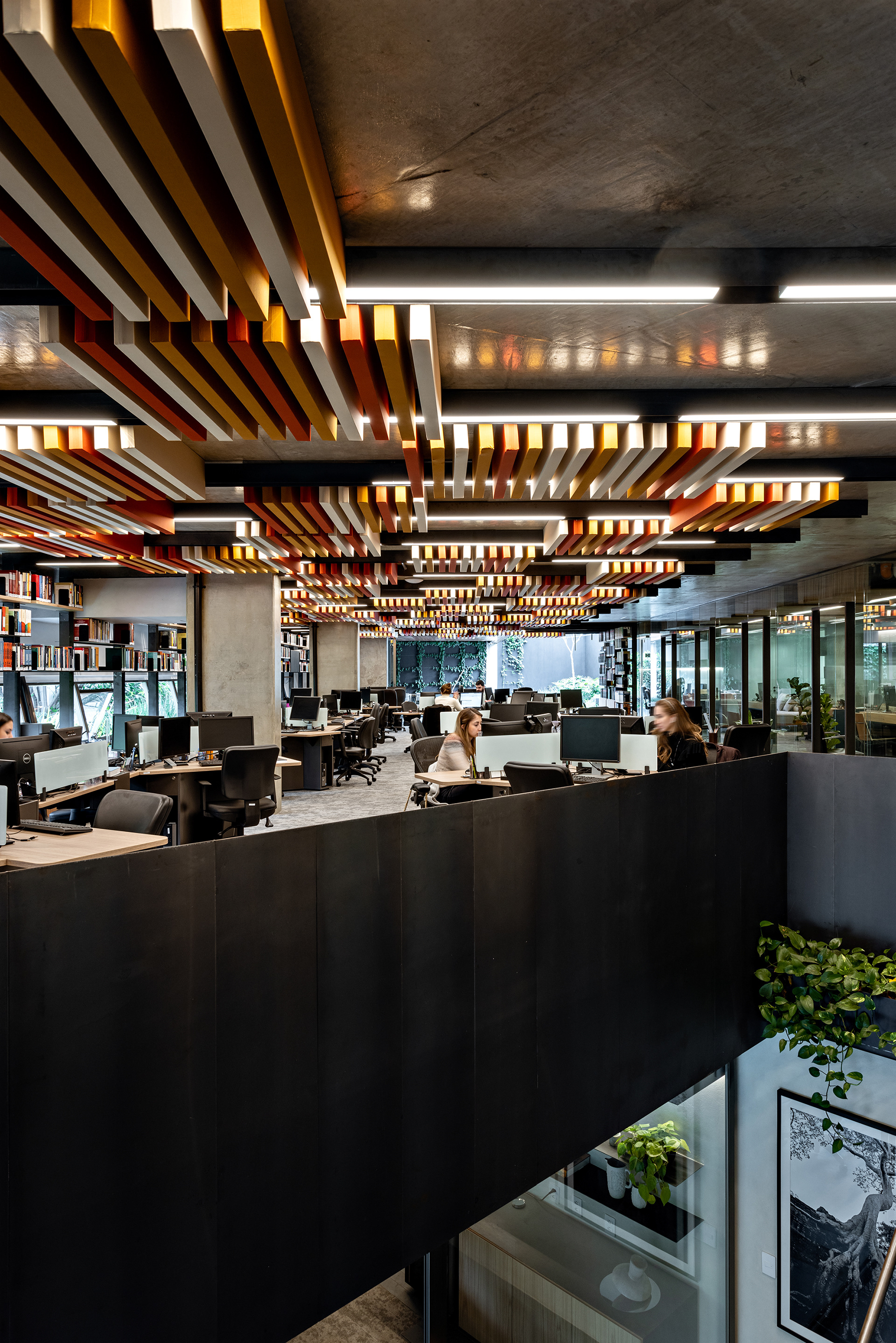 Além disso, há um grande terraço com banheiro e uma sala de estar integrada ao espaço do staff, proporcionando um ambiente de trabalho agradável e colaborativo. A área do staff conta um piso de carpete para melhor conforto acústico e com elementos em aço carbono que acomodam luminárias e o forro em baffles (réguas de espuma e tecido) em cores quentes. As chapas que vêm do forro descem junto às janelas e criam a estrutura para prateleiras em aço carbono que são utilizadas para armazenamento de livros, equipamentos e objetos decorativos, unindo todo o open space deste pavimento.