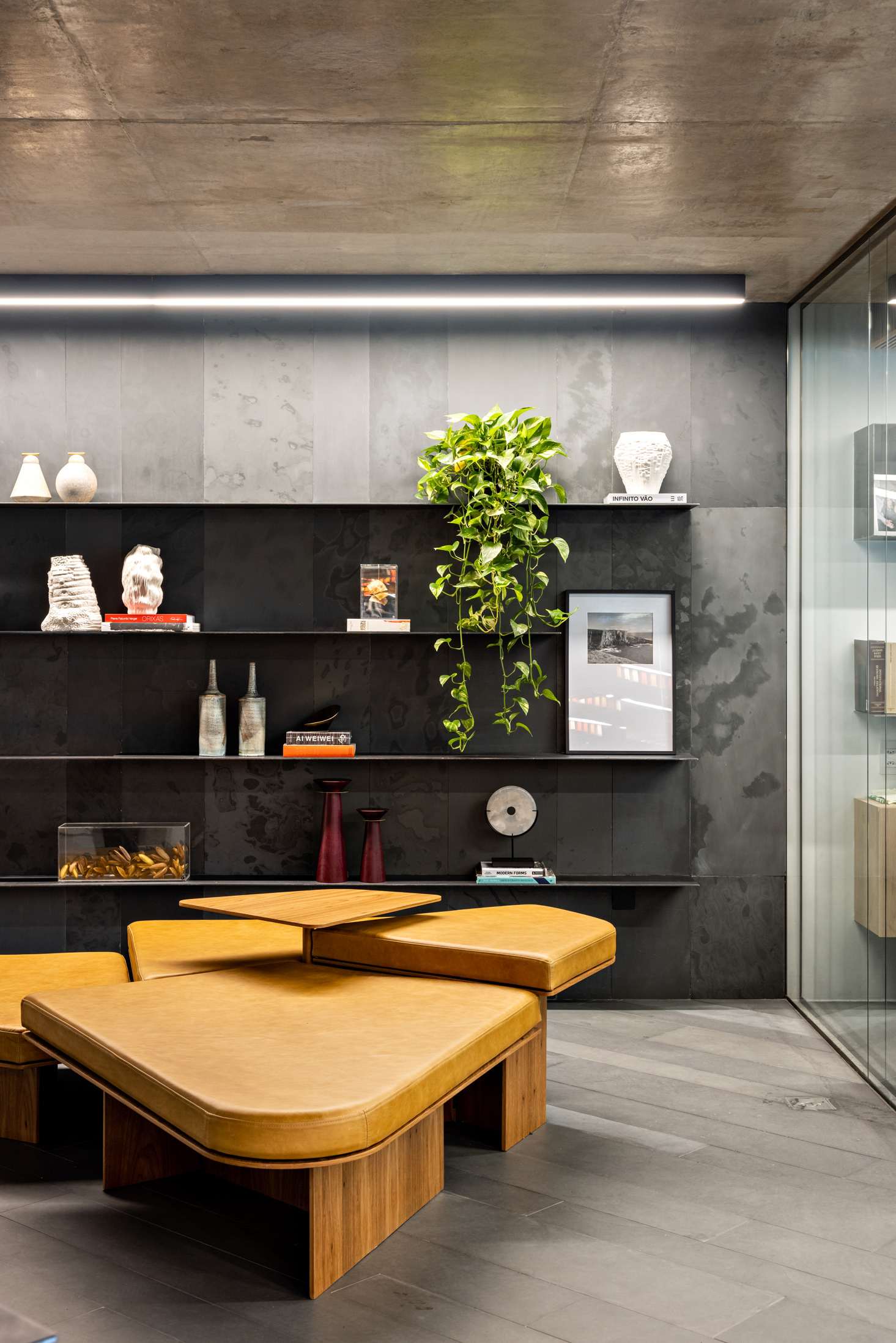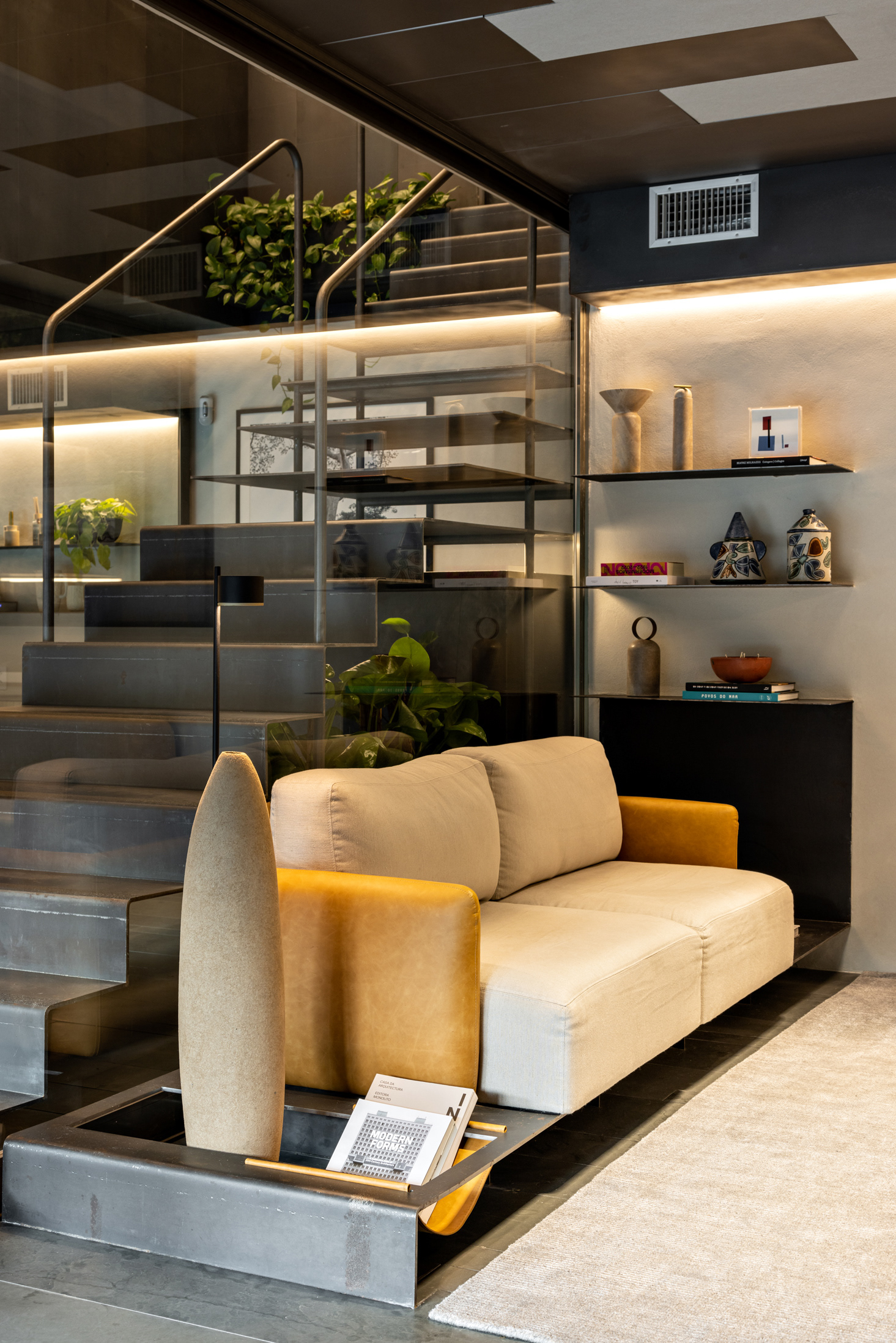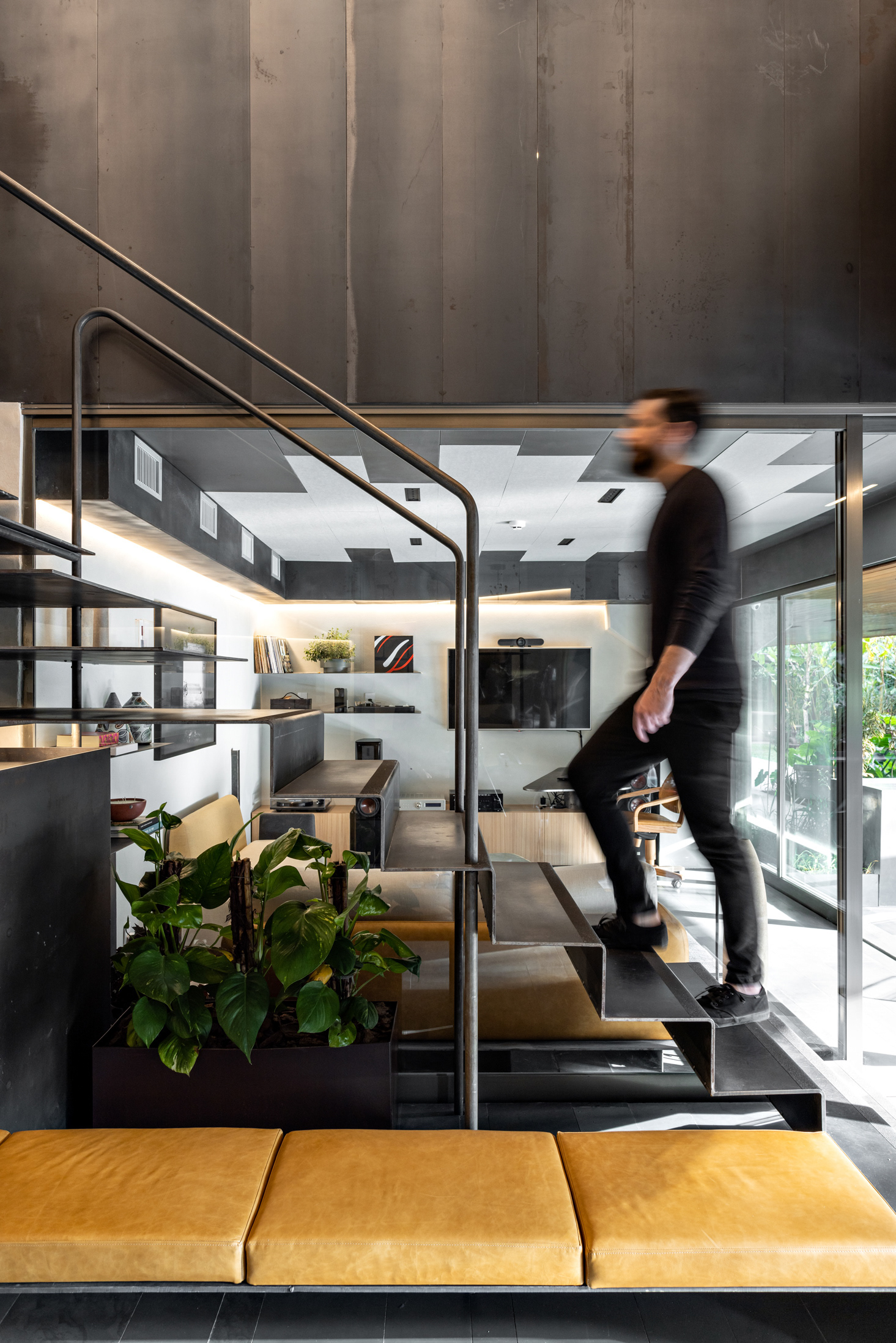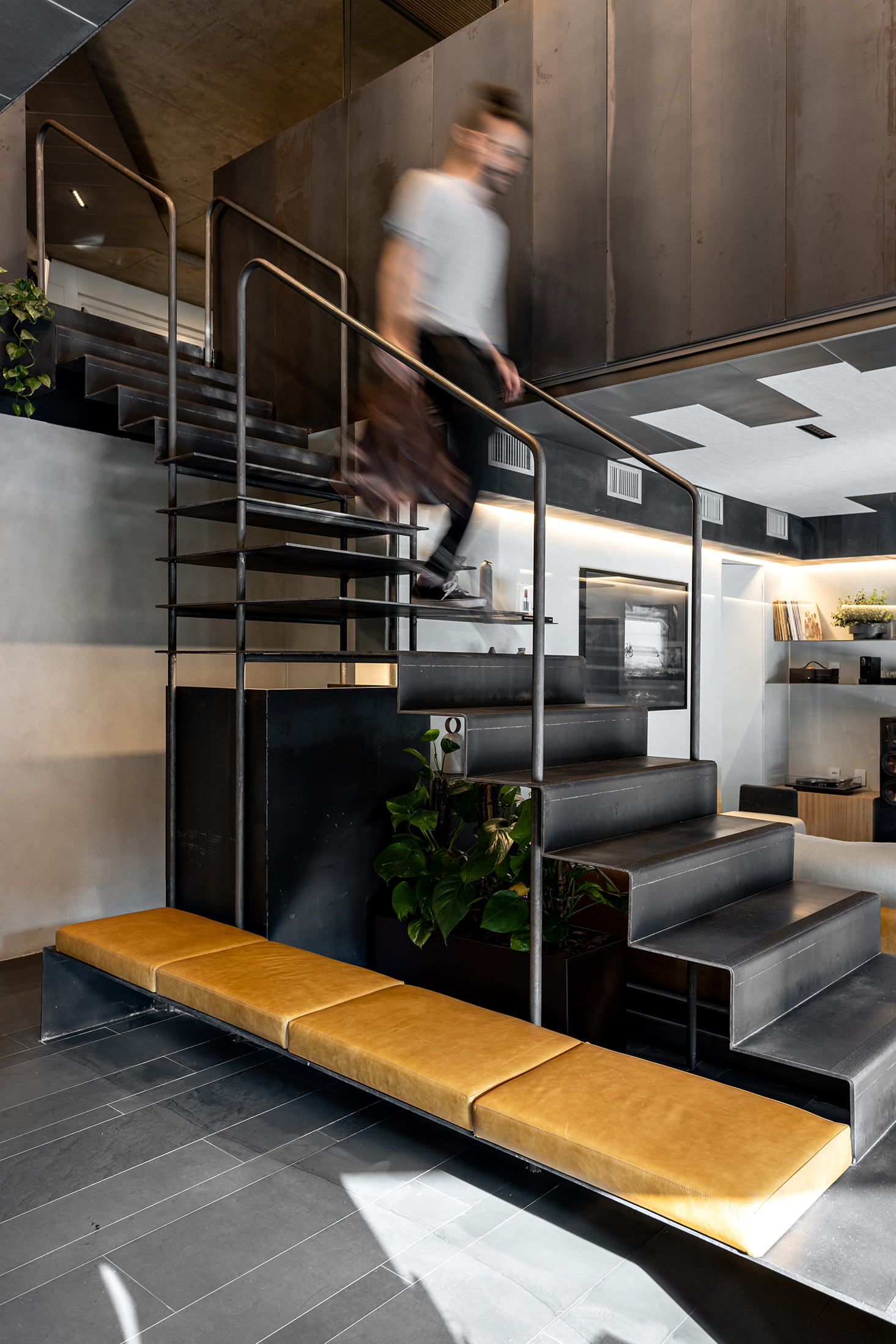 Na entrada, o sóbrio hall é organizado com estantes, mesa das secretárias, painel e forro em chapa de aço carbono e o mesmo piso de réguas de ardósia cinza. Um banco desenhado pela FGMF ocupa o espaço central: em 4 módulos de formatos diferentes e revestidos em couro, o móvel dialoga com a geometria irregular do espaço de recepção. À frente, uma escultural escada liga o pavimento térreo ao inferior. Feita também com chapas de aço carbono, as mesmas que compõem o guarda-corpo do vão, essa escada é mais que um simples meio de circulação: ela acomoda um banco no pavimento inferior, um pequeno espaço para frigobar e máquina de café, tornando-se um elemento de ligação estético e funcional.