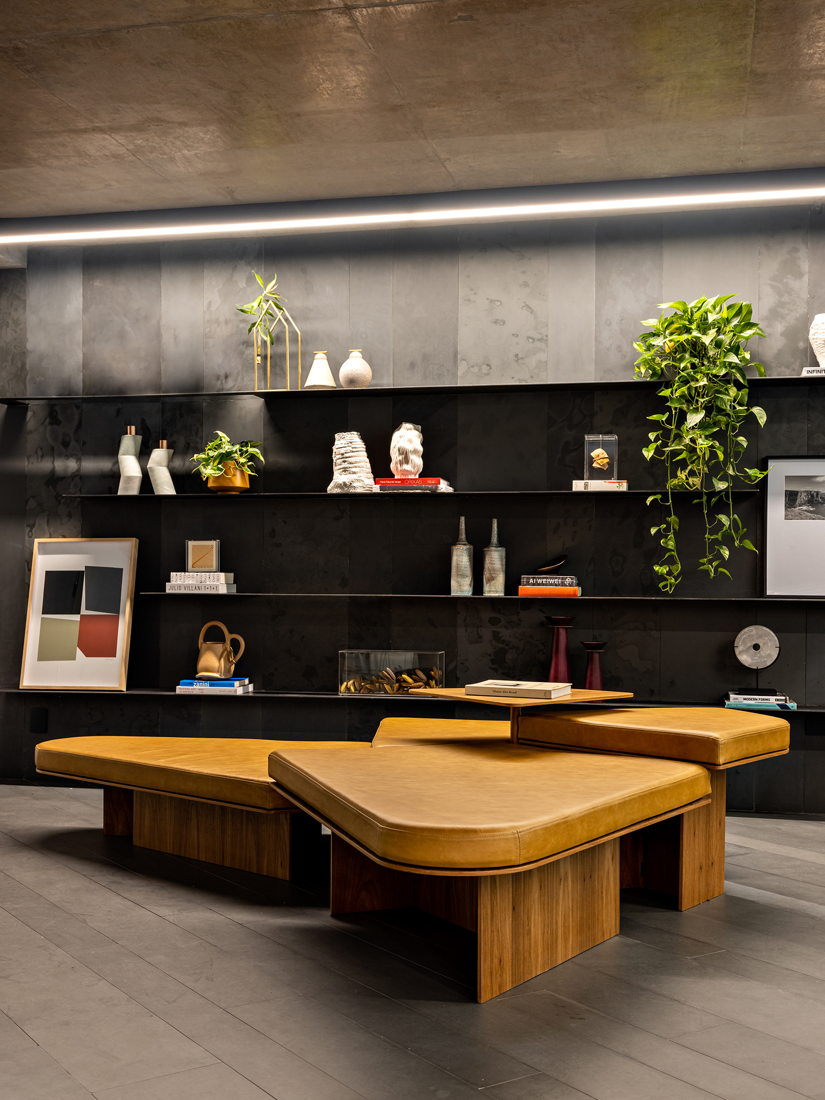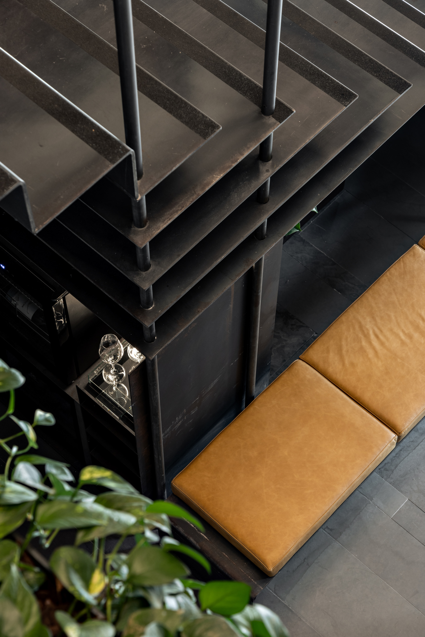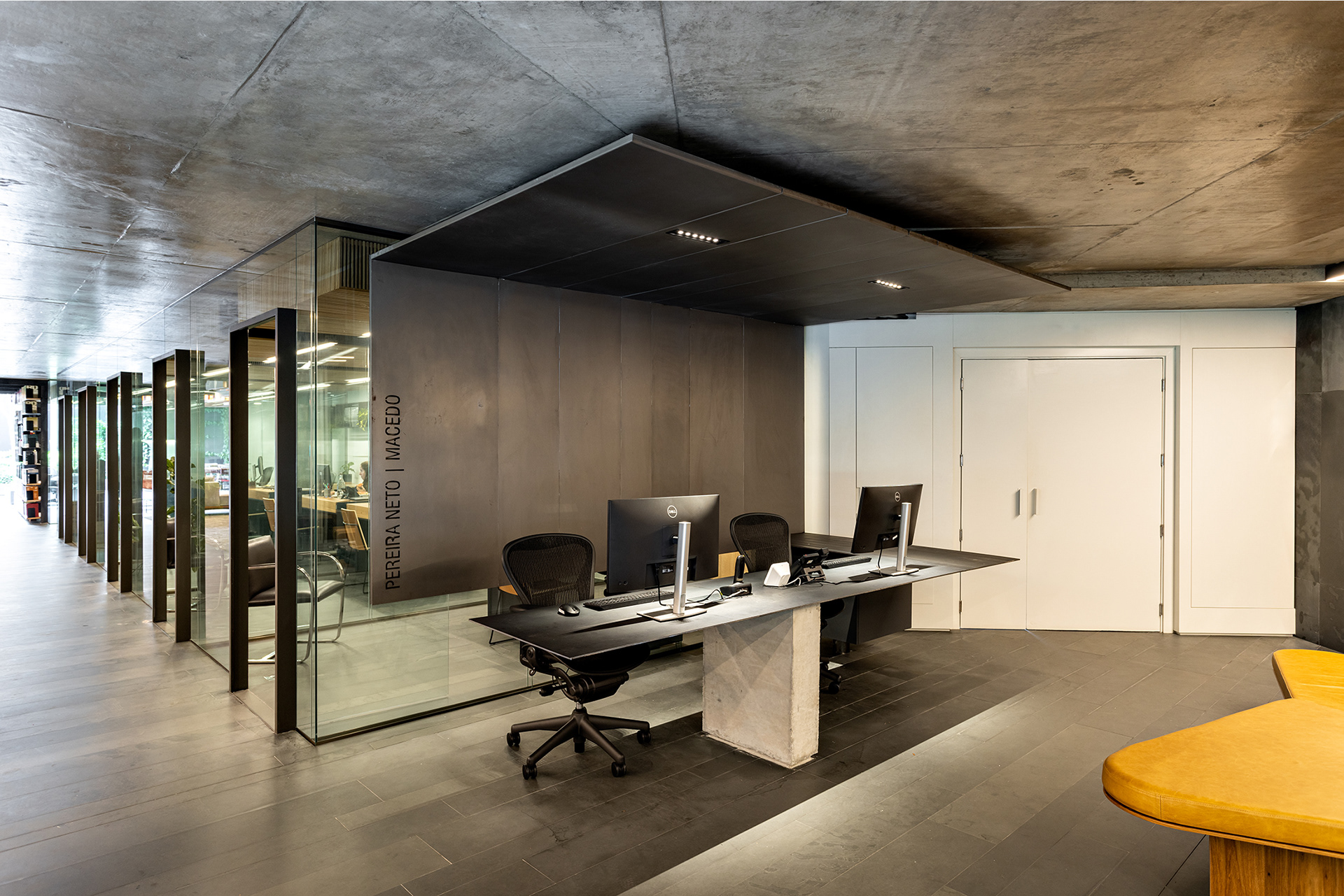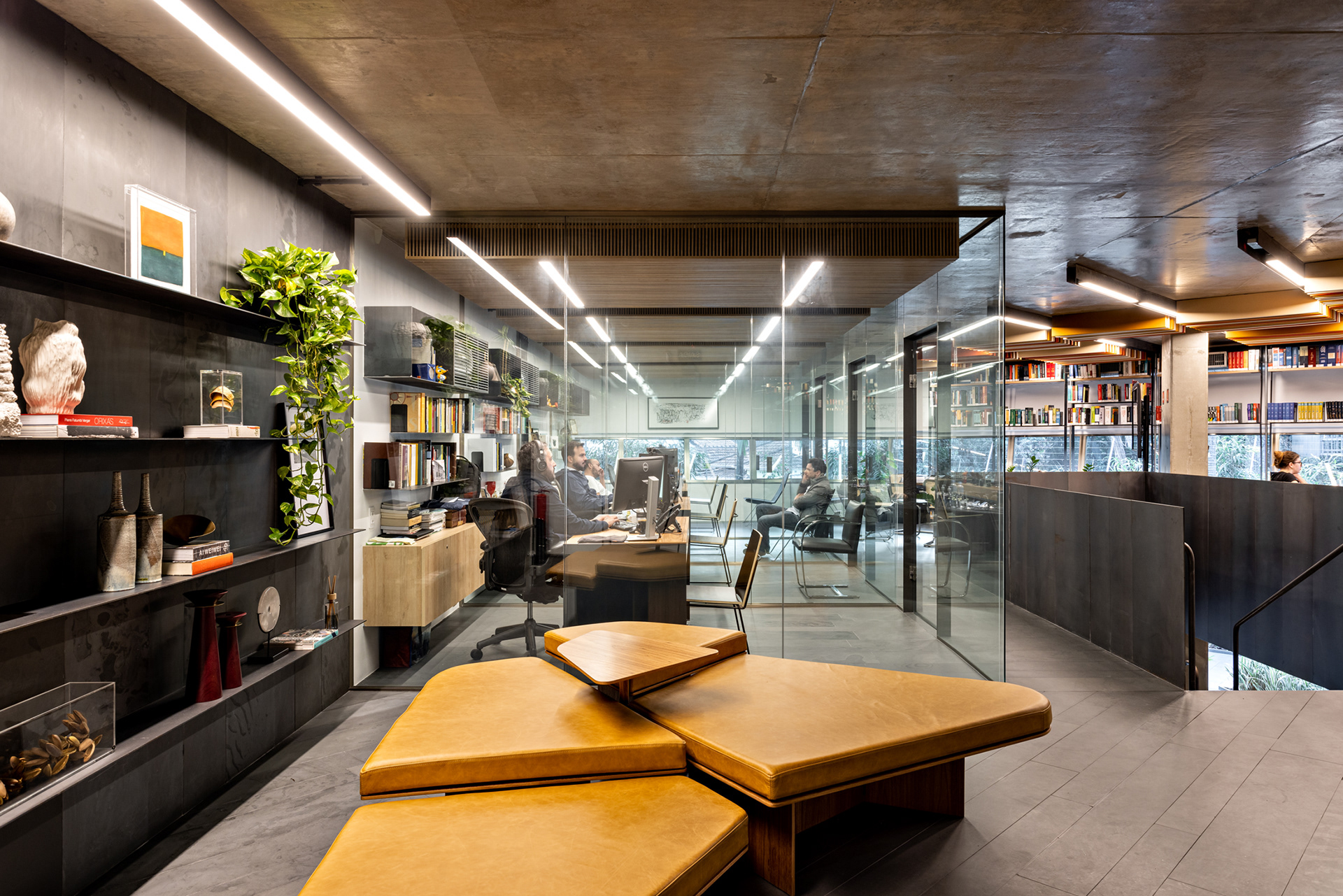 Na entrada, o sóbrio hall é organizado com estantes, mesa das secretárias, painel e forro em chapa de aço carbono e o mesmo piso de réguas de ardósia cinza. Um banco desenhado pela FGMF ocupa o espaço central: em 4 módulos de formatos diferentes e revestidos em couro, o móvel dialoga com a geometria irregular do espaço de recepção. À frente, uma escultural escada liga o pavimento térreo ao inferior. Feita também com chapas de aço carbono, as mesmas que compõem o guarda-corpo do vão, essa escada é mais que um simples meio de circulação: ela acomoda um banco no pavimento inferior, um pequeno espaço para frigobar e máquina de café, tornando-se um elemento de ligação estético e funcional.