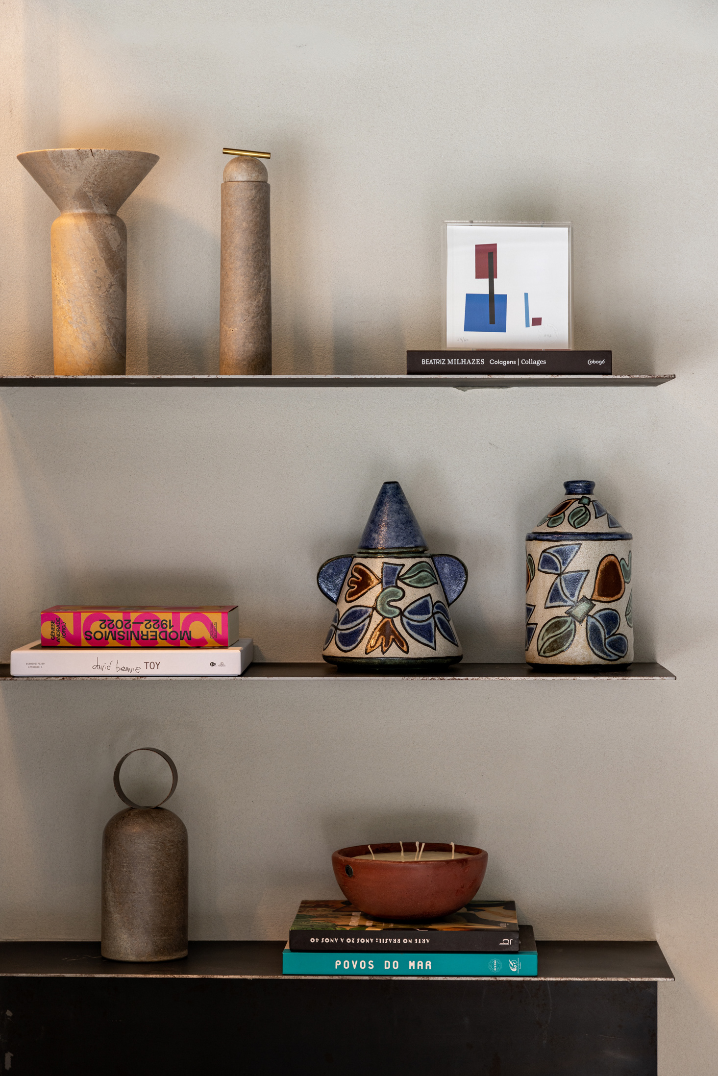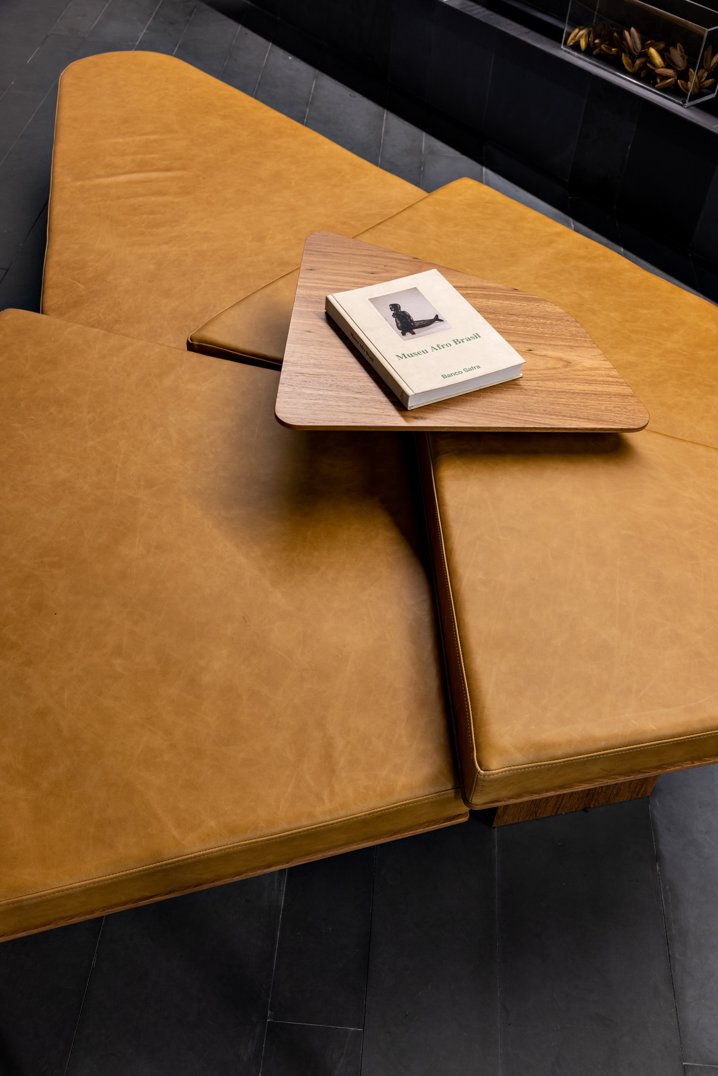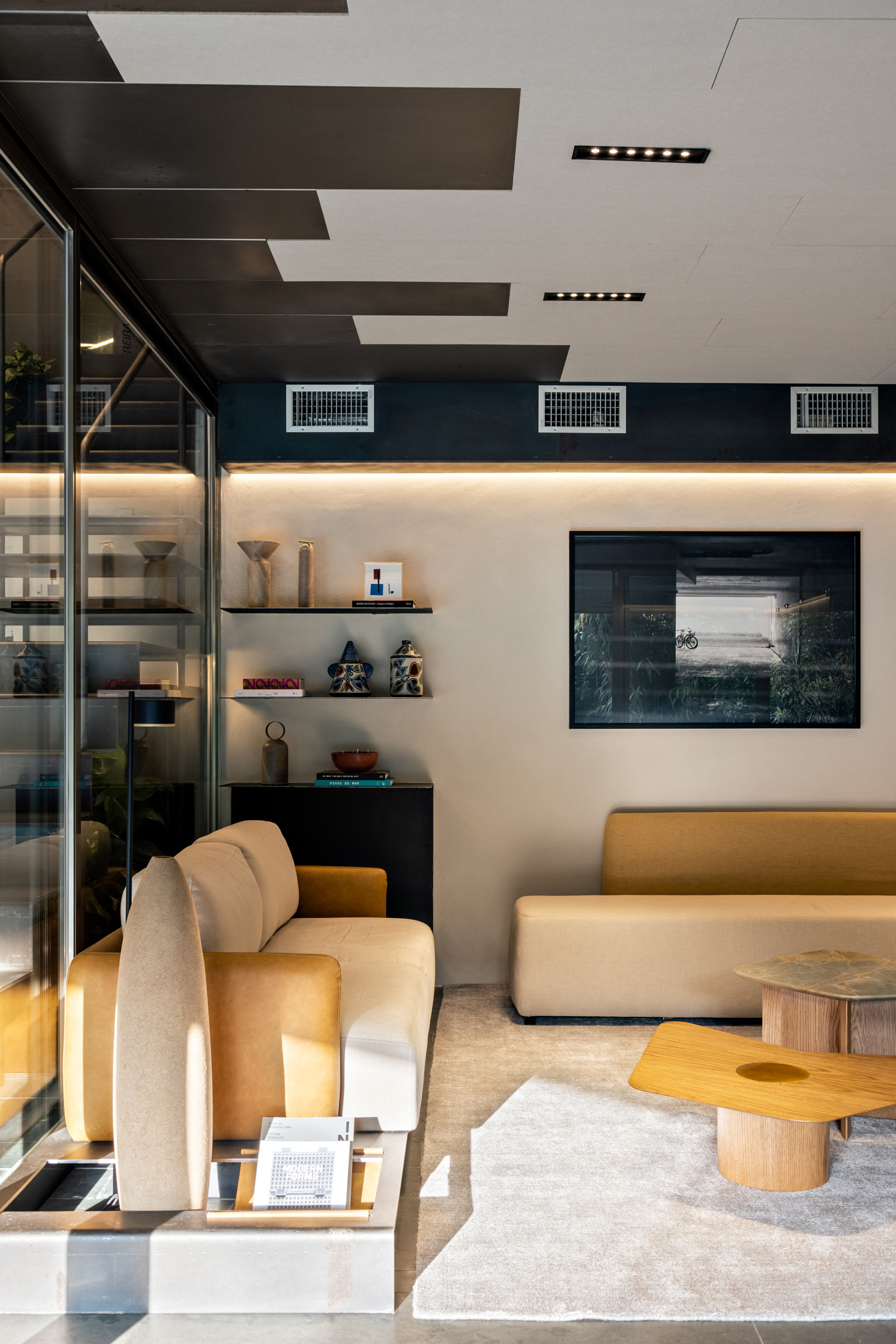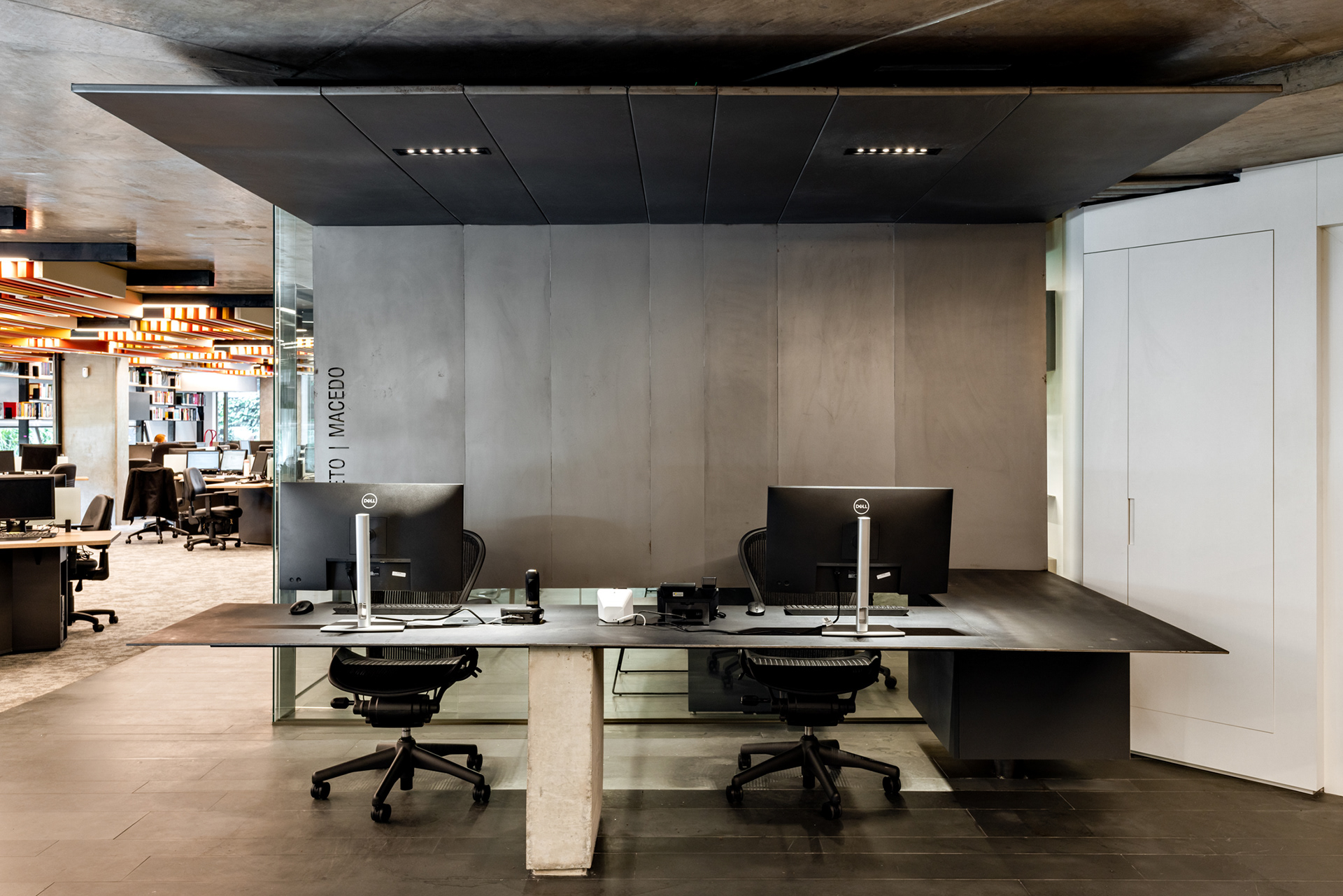 Na entrada, o sóbrio hall é organizado com estantes, mesa das secretárias, painel e forro em chapa de aço carbono e o mesmo piso de réguas de ardósia cinza. Um banco desenhado pela FGMF ocupa o espaço central: em 4 módulos de formatos diferentes e revestidos em couro, o móvel dialoga com a geometria irregular do espaço de recepção. À frente, uma escultural escada liga o pavimento térreo ao inferior. Feita também com chapas de aço carbono, as mesmas que compõem o guarda-corpo do vão, essa escada é mais que um simples meio de circulação: ela acomoda um banco no pavimento inferior, um pequeno espaço para frigobar e máquina de café, tornando-se um elemento de ligação estético e funcional.