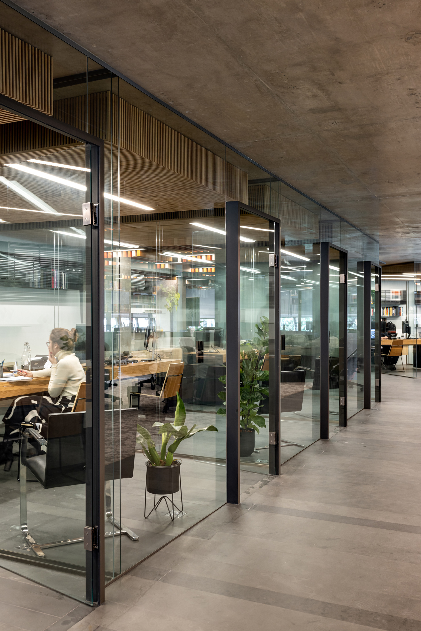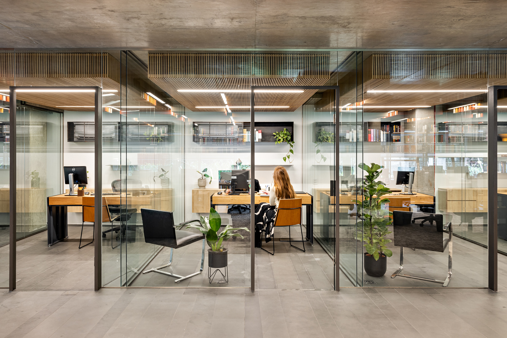 O acesso principal do escritório se dá pelo pavimento térreo do edifício. Neste pavimento, encontramos a maior parte da equipe distribuída em um espaço iluminado e integrado. O staff, a sala da equipe administrativa, as salas dos sócios, os banheiros e a cozinha estão todos localizados aqui. As salas dos sócios são dispostas ao redor do staff, em formato de L, todas em vidro com portas de acesso com batentes de aço carbono que formam elegantes pórticos de acesso no plano contínuo de vidro. Dentro dessas salas, os forros são de madeira e o piso é de réguas de ardósia, o mesmo piso da circulação em frente a elas.