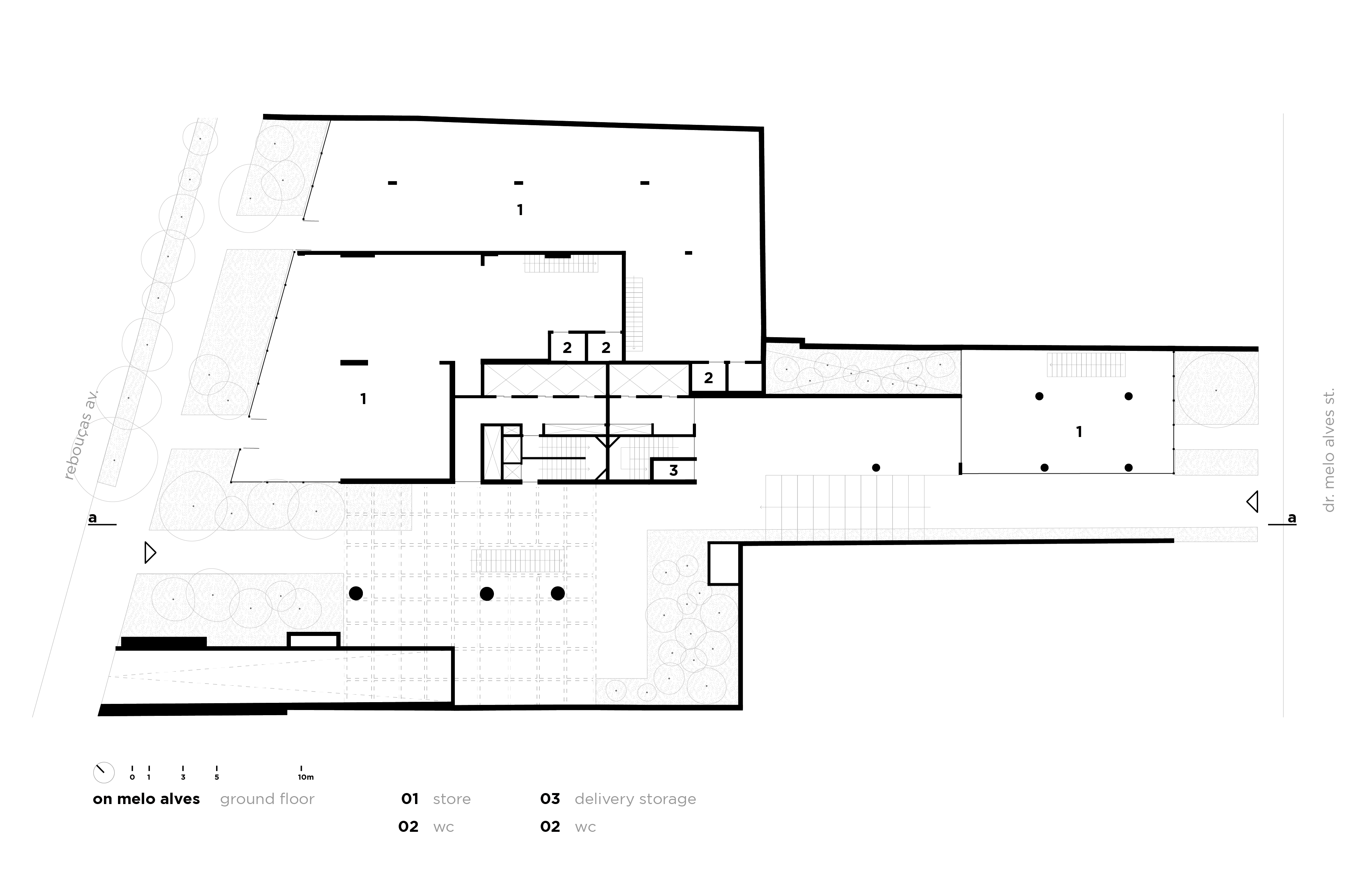 Because of all this, having a plot with two fronts (one facing Rebouças Avenue and the other facing Melo Alves Street) represents a great opportunity to create more urban connections and enhance urban life with public and commercial spaces. The ON project began with this reflection: how could the first floor of the building be transformed into an urban space, open and connected to the two streets? The narrow 12m opening onto Rua Melo Alves is a challenge, but not an obstacle. There, a commercial space activates the sidewalk and indicates the beginning of a passage that leads to Rebouças Avenue. On the avenue, meanwhile, the wide front allows for more commercial uses and a small, covered square that slows down the pace of those coming from Rebouças Avenue. The hall of the residential tower is above this small square, displaced from the first floor and thus giving way to the public.