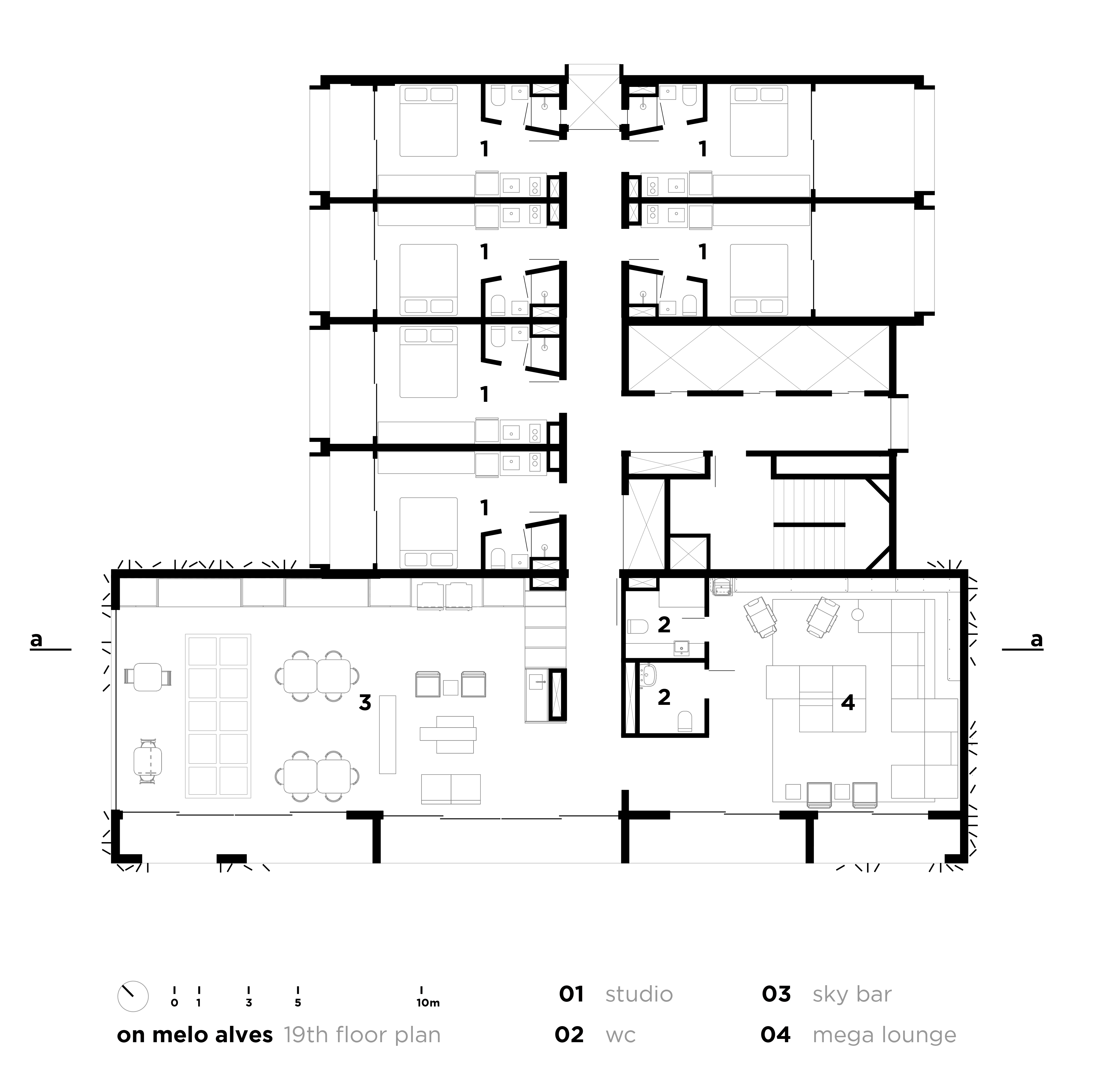 Above this permeable and dynamic first floor is a huge tower of small apartments. Some of them are intended for use as temporary rentals, such as a hotel. The other units, of a similar size, in studio format. As there are many apartments and they all are small, it was a natural choice to take advantage of the repetition and rhythm of the openings in the volume. Thus, the succession of openings in the main volume, marked by moldings, allows the program to be read.