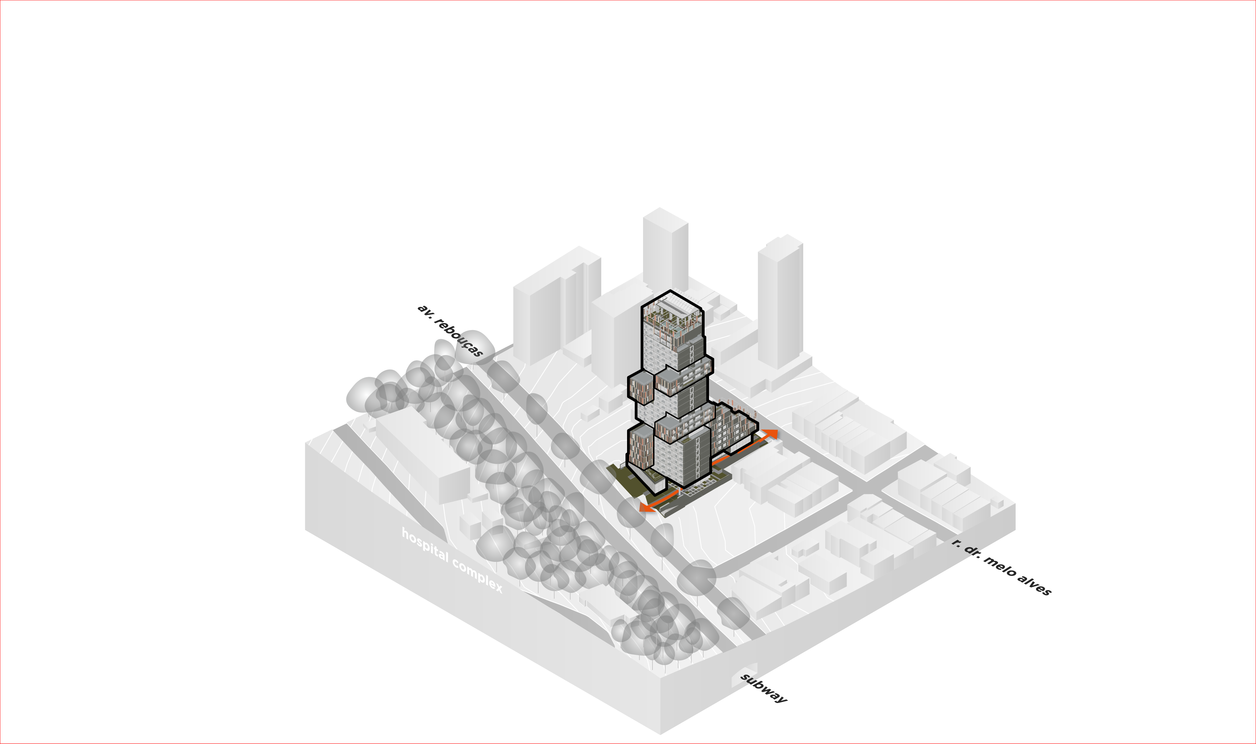 We are in the middle of Avenida Rebouças, an area of São Paulo that has been experiencing a great surge in densification and verticalization. In this stretch near Paulista Avenue, the abundant supply of public transport, with two subway lines and a bus corridor, the large hospital complex of Clínicas and the wide diversity of uses, the neighborhood is configured as a dynamic and thriving space in the metropolis.