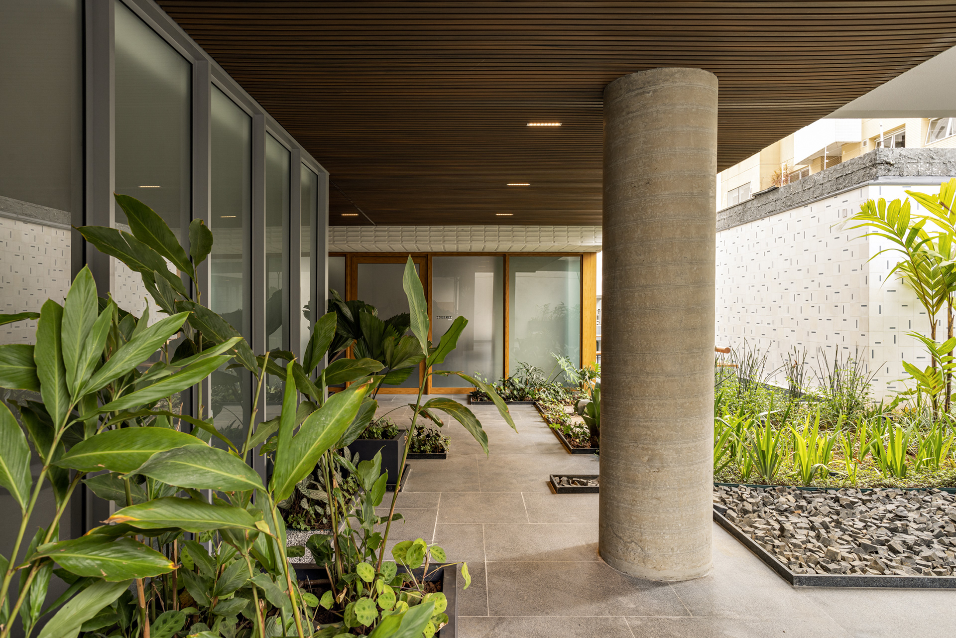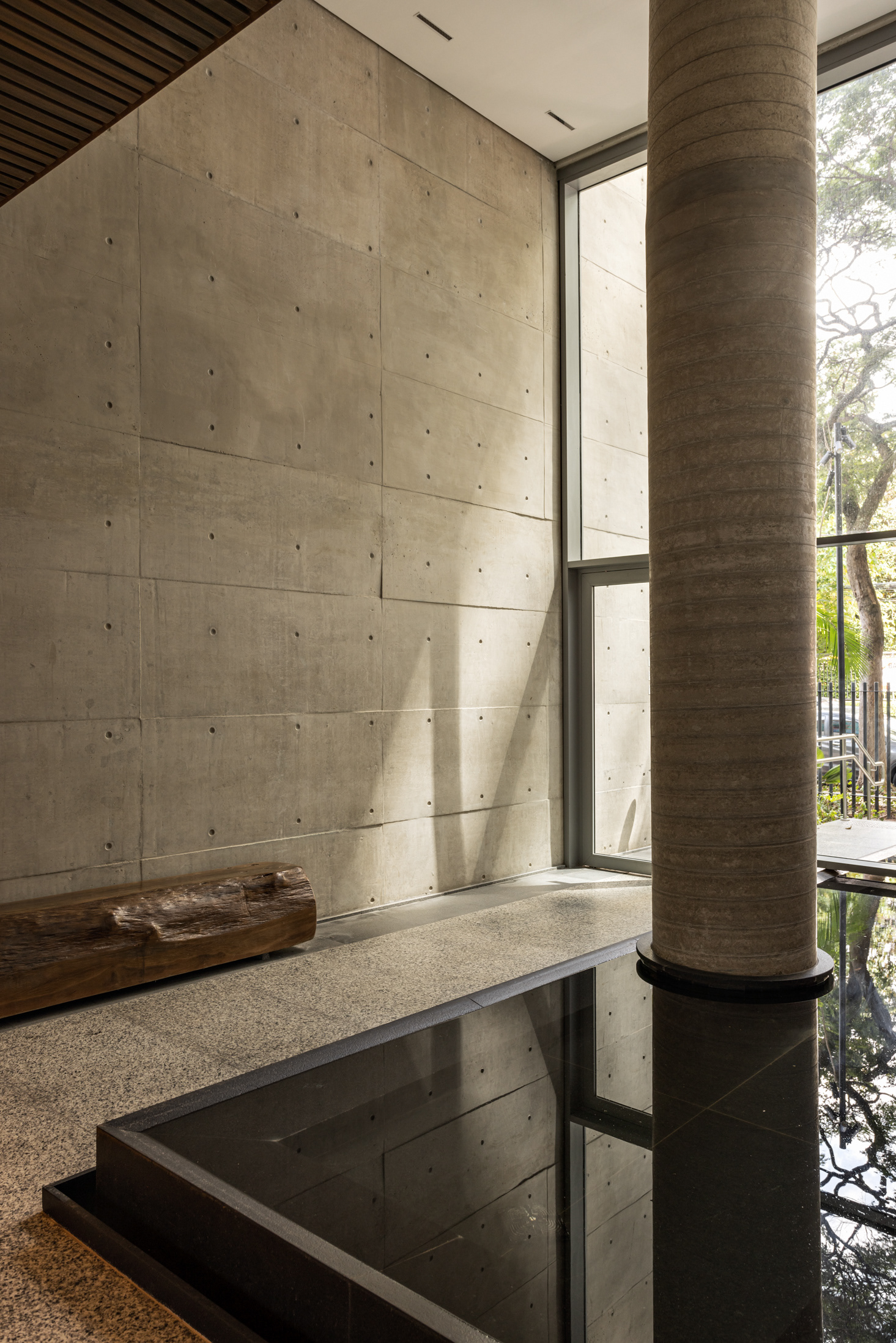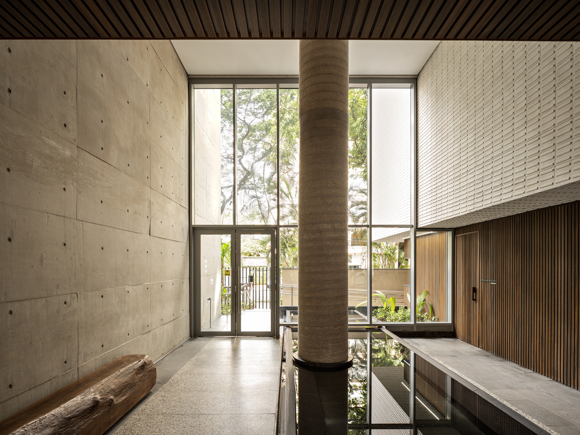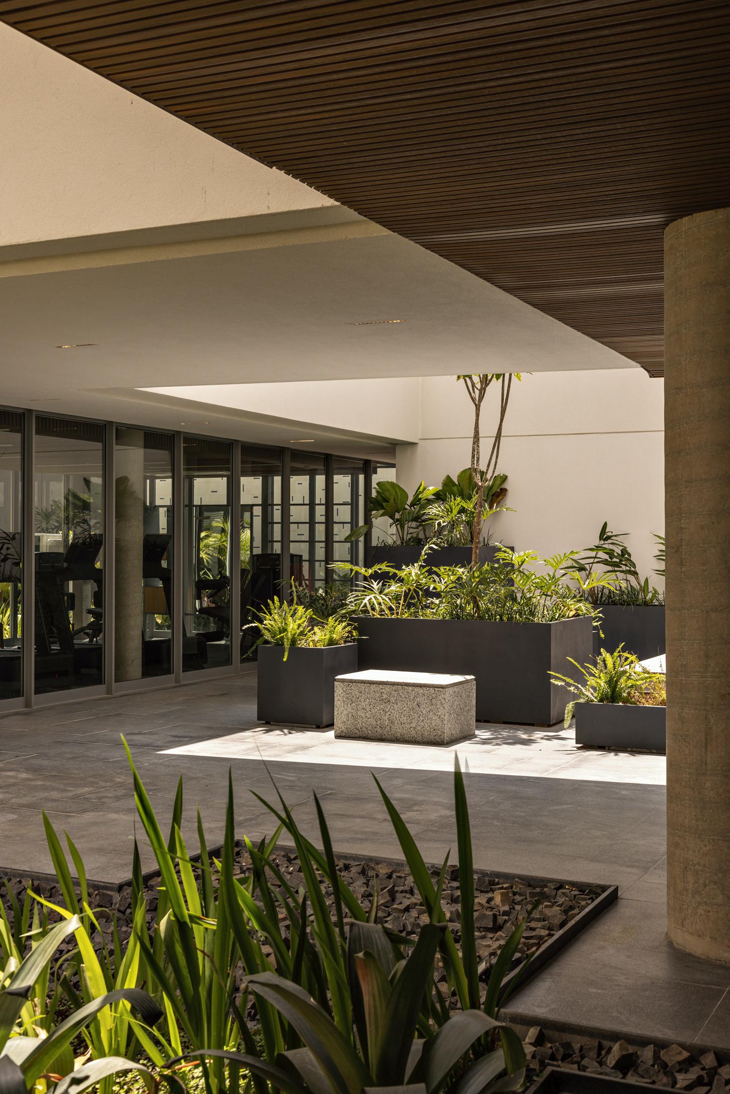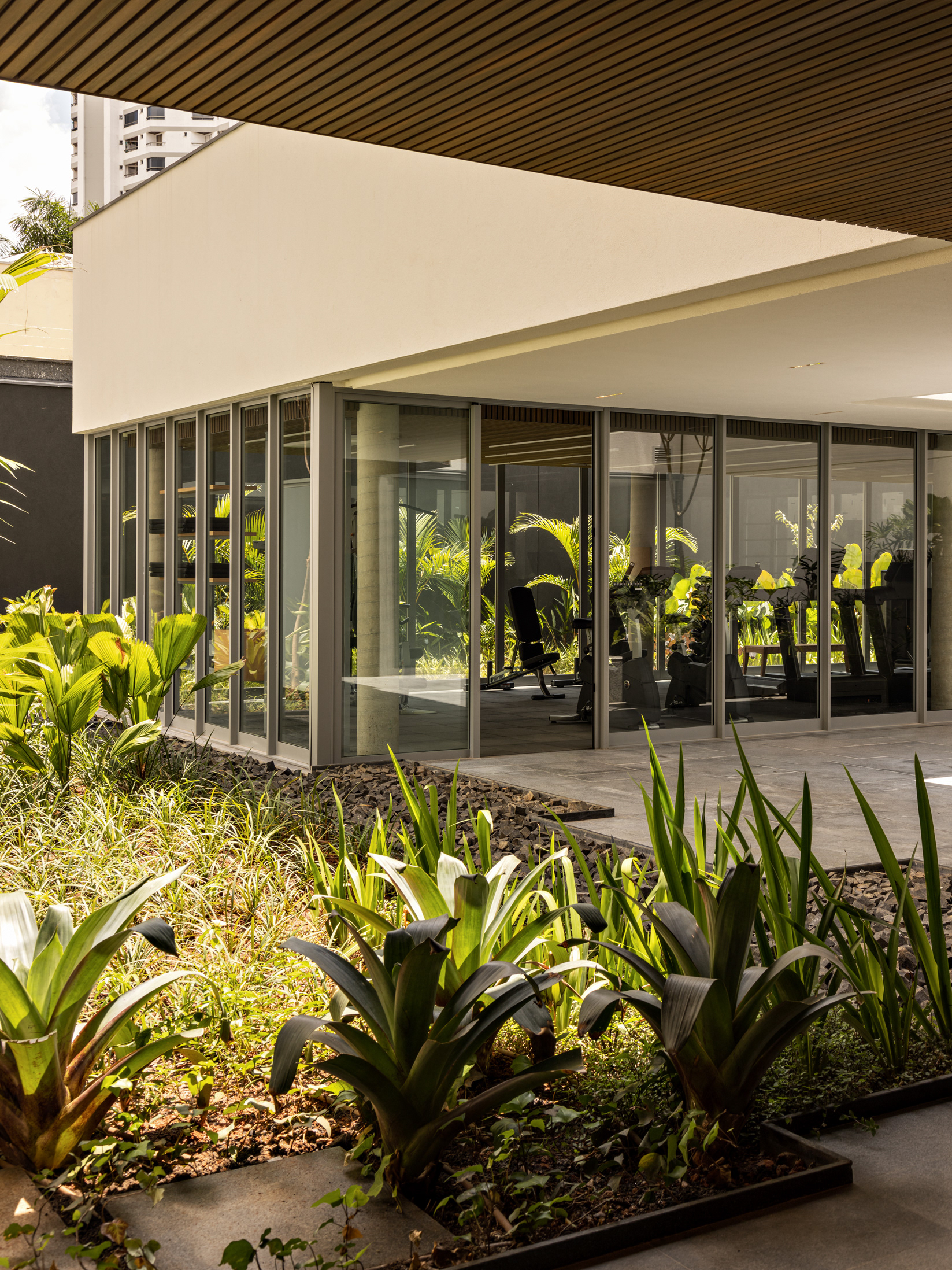 Enquanto o nítido bloco de concreto da prumada leste pousa diretamente no solo, a prumada das salas se apoiam sobre um grande objeto flutuante. O primeiro pavimento do edifício acomoda parte das vagas de veículos, complementando as vagas subterrâneas. Revestido em ladrilhos hidráulicos brancos, a garagem em sobressolo configura um objeto fechado que paira sobre um térreo livre e fluido. A entrada principal para pedestres acontece no hiato entre este bloco branco e a torre de concreto aparente, o que cria um espaço de pé direito alto e dramático. Ao entrar através do jardim integrado à calçada, o visitante acessa o lobby através deste vazio que acomoda tão simplesmente um espelho d’água. Refletido nele, a paisagem do jardim do fundo demonstra a abertura e integração entre a área interna e externa do edifício. A ausência de vedação entre o lobby e o jardim, enfatiza a conexão e amplitude do espaço que abriga o salão de festas, sala de jogos e brinquedoteca. Na área externa, uma ilha de vidro cercada de verde acomoda a academia.