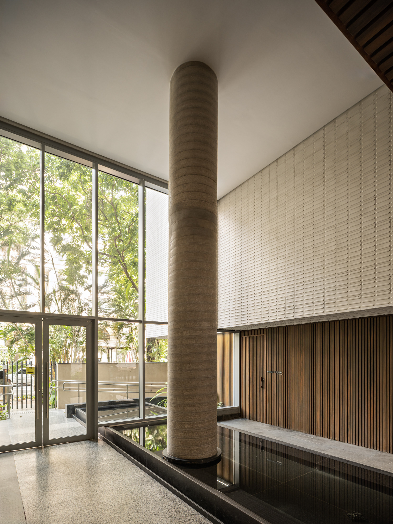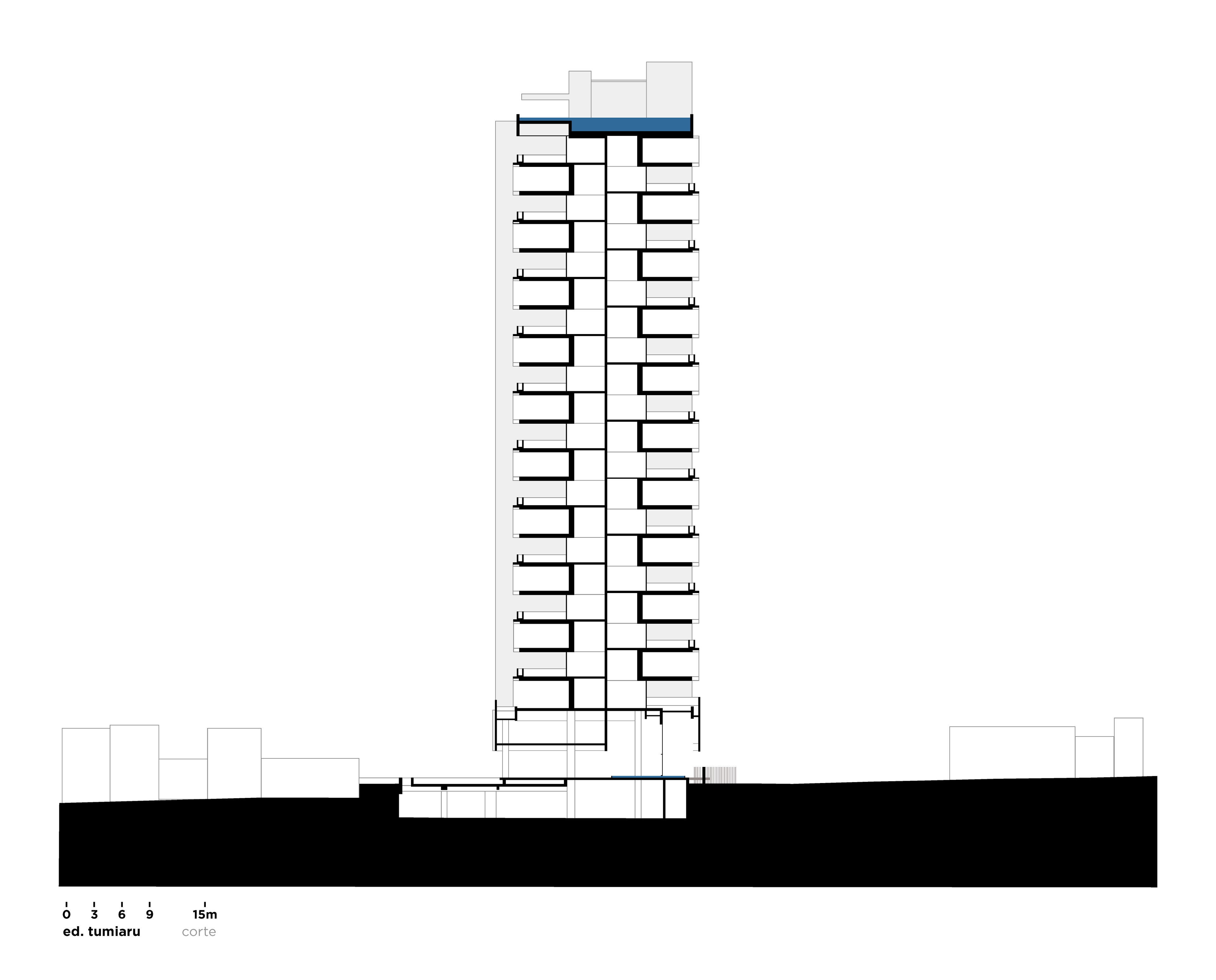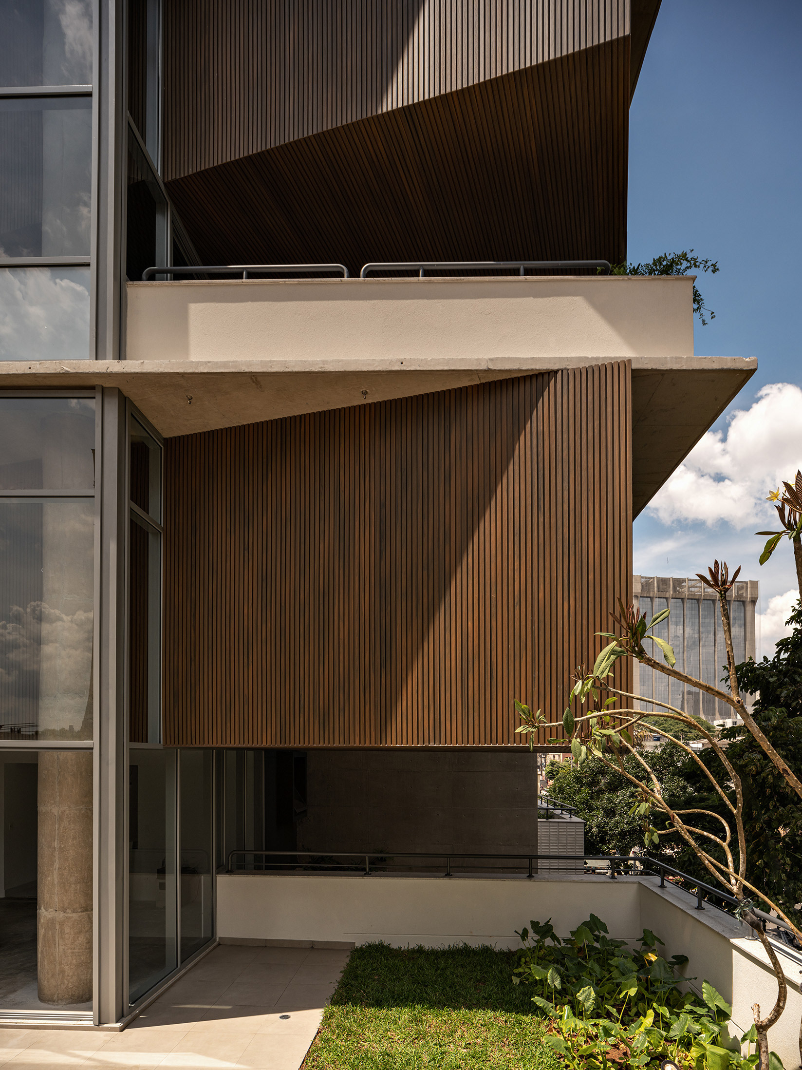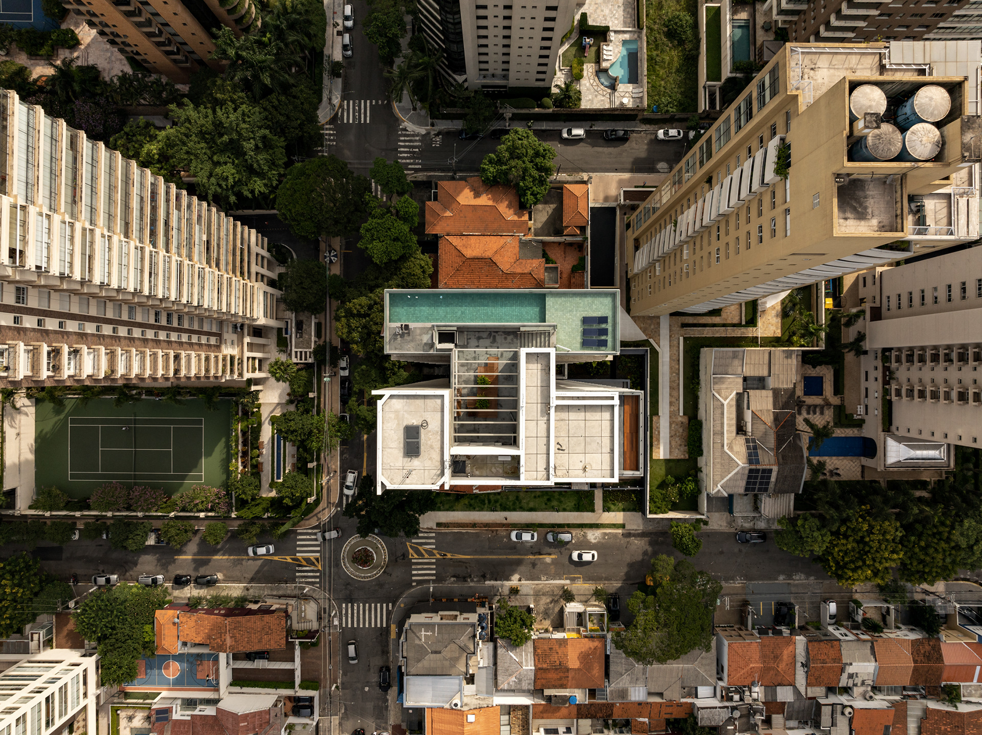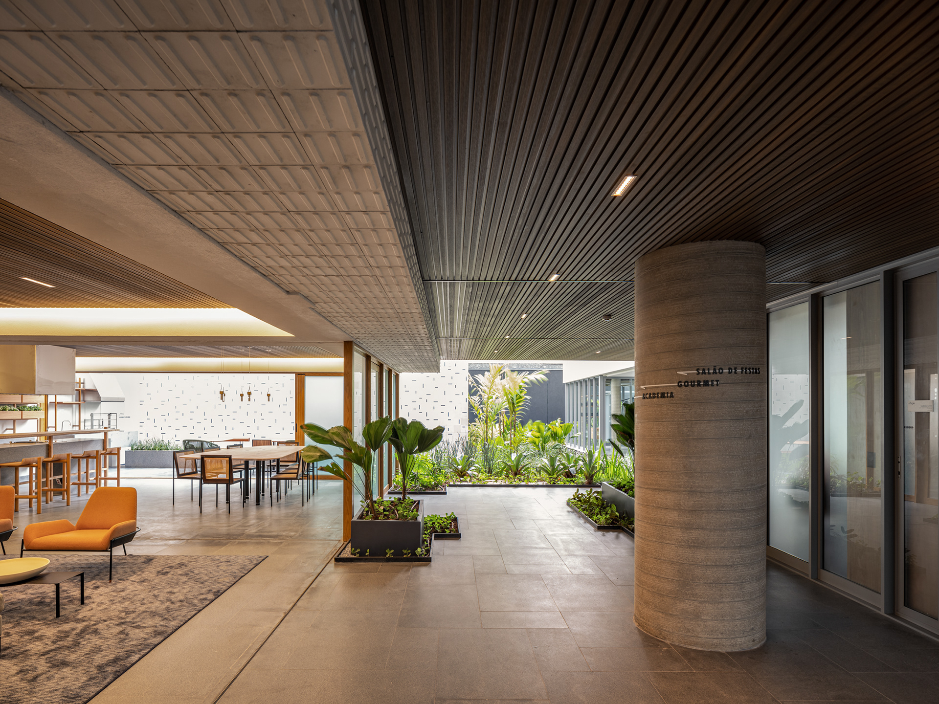 Enquanto o nítido bloco de concreto da prumada leste pousa diretamente no solo, a prumada das salas se apoiam sobre um grande objeto flutuante. O primeiro pavimento do edifício acomoda parte das vagas de veículos, complementando as vagas subterrâneas. Revestido em ladrilhos hidráulicos brancos, a garagem em sobressolo configura um objeto fechado que paira sobre um térreo livre e fluido. A entrada principal para pedestres acontece no hiato entre este bloco branco e a torre de concreto aparente, o que cria um espaço de pé direito alto e dramático. Ao entrar através do jardim integrado à calçada, o visitante acessa o lobby através deste vazio que acomoda tão simplesmente um espelho d’água. Refletido nele, a paisagem do jardim do fundo demonstra a abertura e integração entre a área interna e externa do edifício. A ausência de vedação entre o lobby e o jardim, enfatiza a conexão e amplitude do espaço que abriga o salão de festas, sala de jogos e brinquedoteca. Na área externa, uma ilha de vidro cercada de verde acomoda a academia.