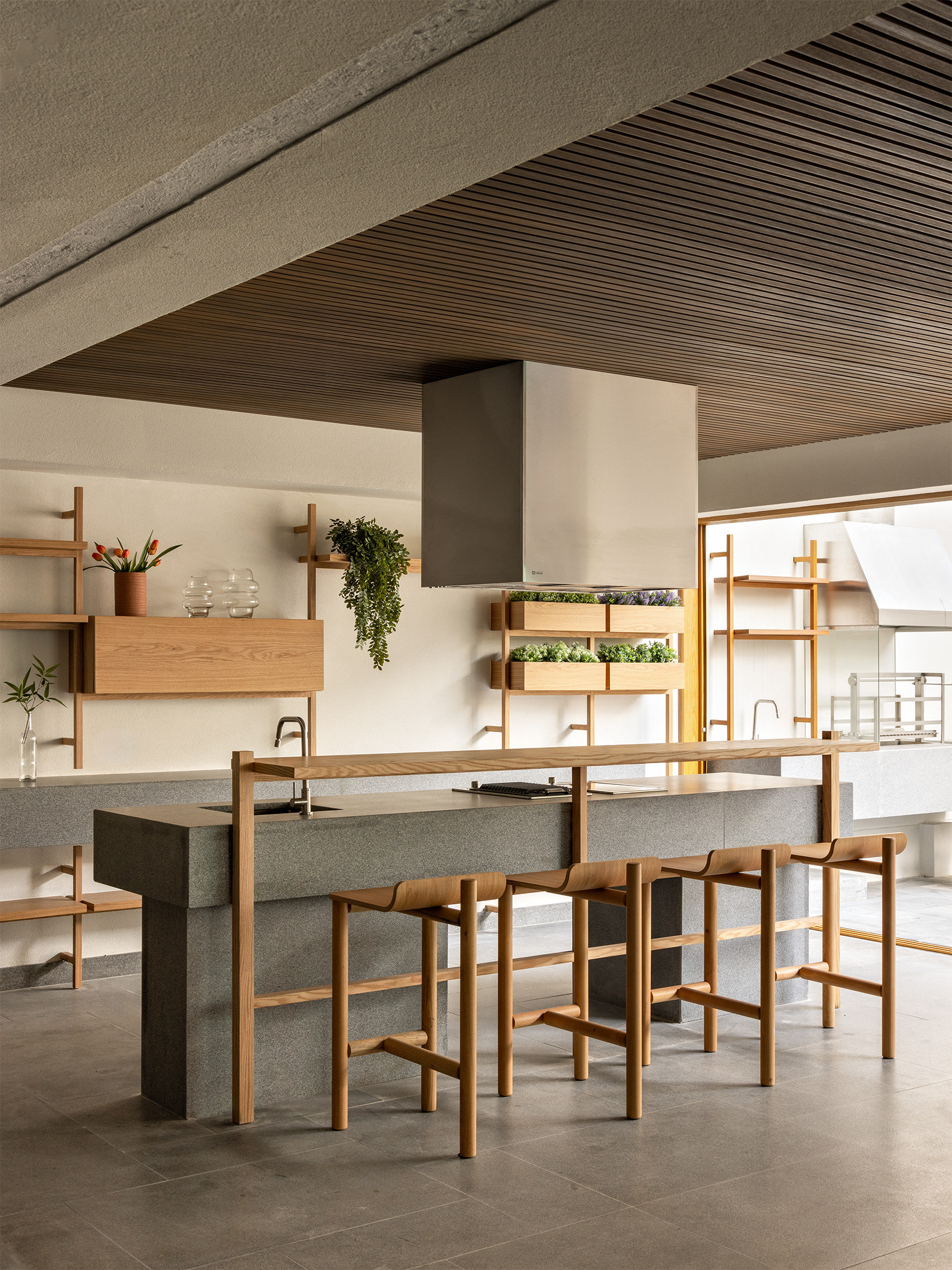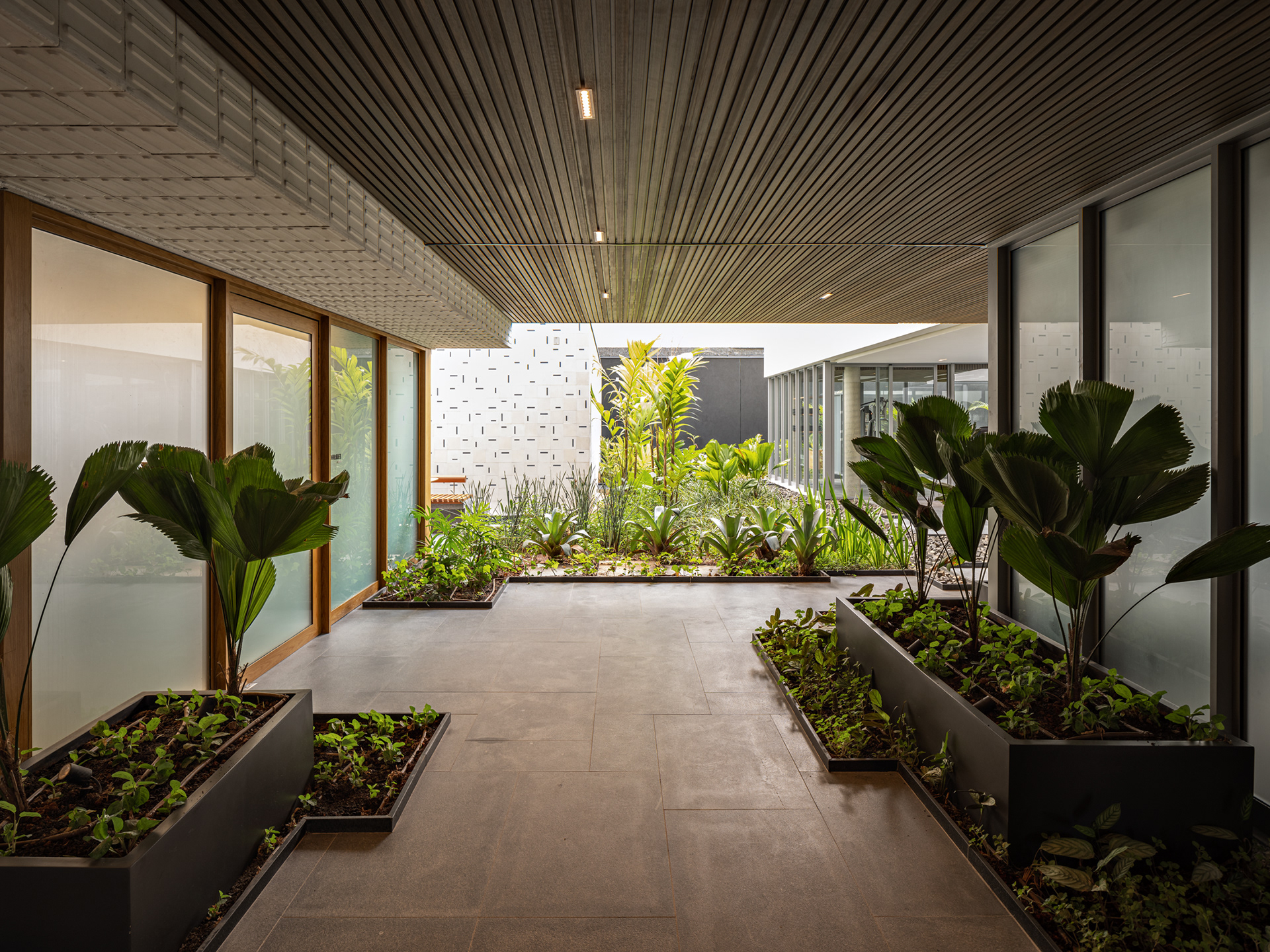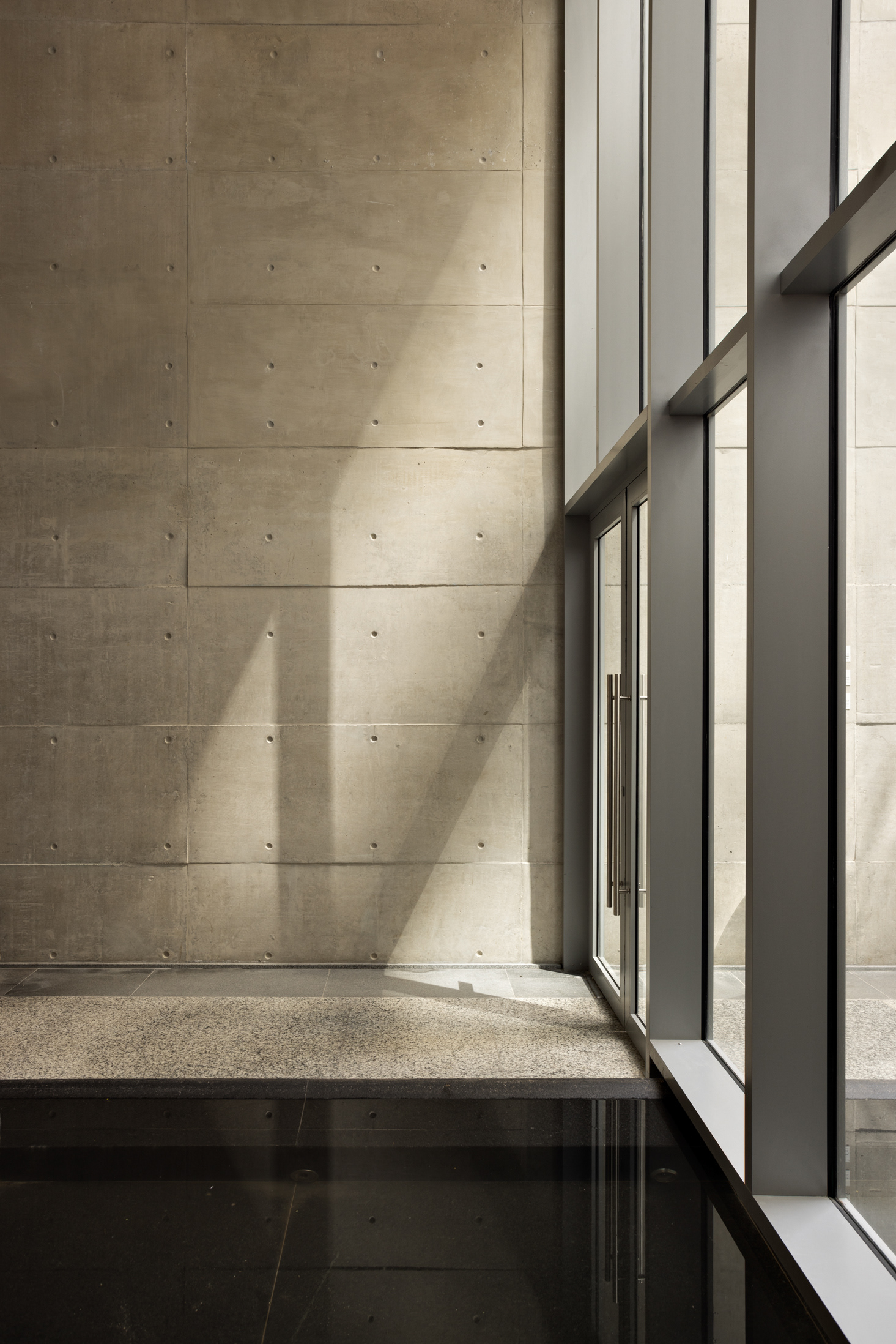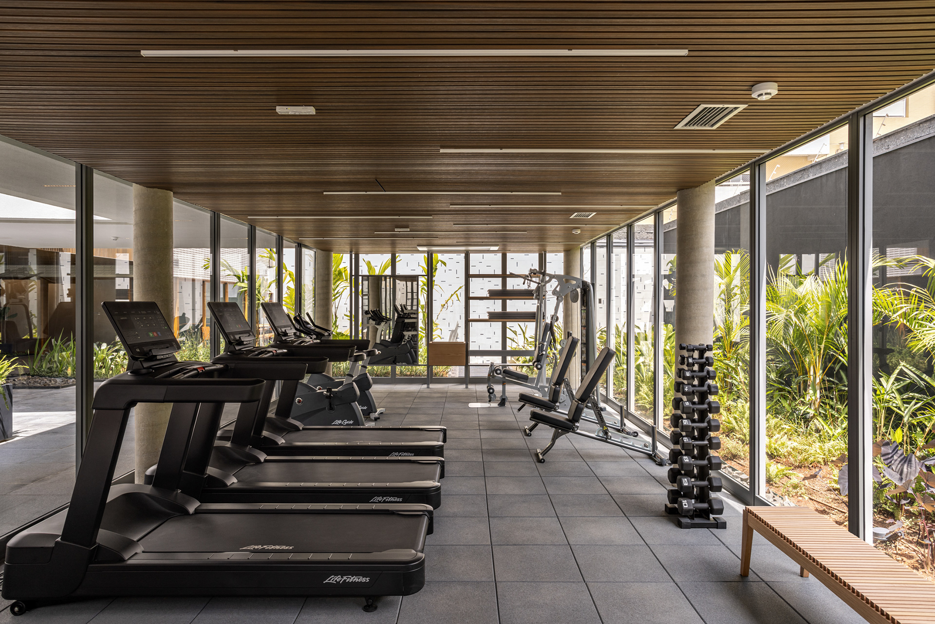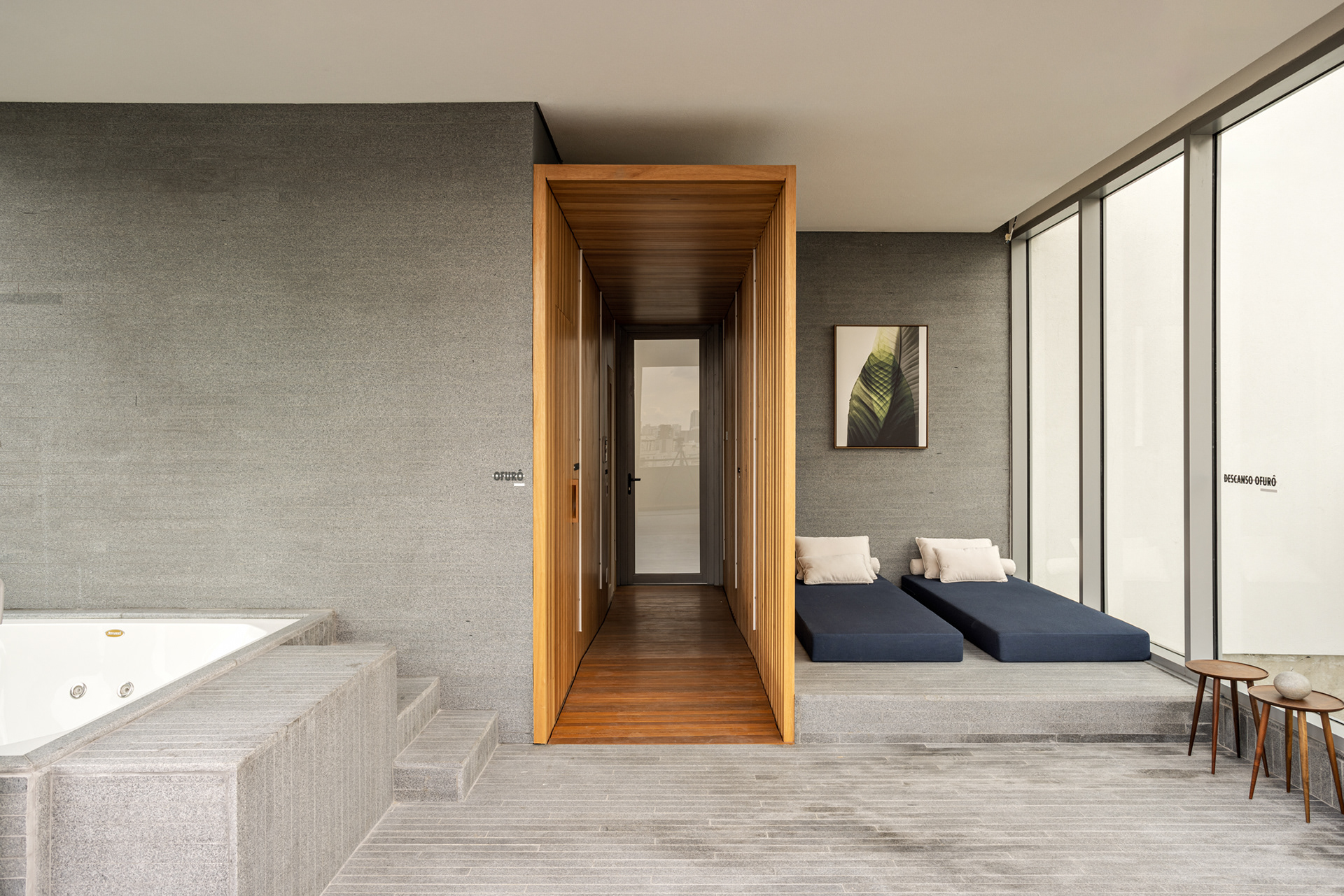 Enquanto o nítido bloco de concreto da prumada leste pousa diretamente no solo, a prumada das salas se apoiam sobre um grande objeto flutuante. O primeiro pavimento do edifício acomoda parte das vagas de veículos, complementando as vagas subterrâneas. Revestido em ladrilhos hidráulicos brancos, a garagem em sobressolo configura um objeto fechado que paira sobre um térreo livre e fluido. A entrada principal para pedestres acontece no hiato entre este bloco branco e a torre de concreto aparente, o que cria um espaço de pé direito alto e dramático. Ao entrar através do jardim integrado à calçada, o visitante acessa o lobby através deste vazio que acomoda tão simplesmente um espelho d’água. Refletido nele, a paisagem do jardim do fundo demonstra a abertura e integração entre a área interna e externa do edifício. A ausência de vedação entre o lobby e o jardim, enfatiza a conexão e amplitude do espaço que abriga o salão de festas, sala de jogos e brinquedoteca. Na área externa, uma ilha de vidro cercada de verde acomoda a academia.