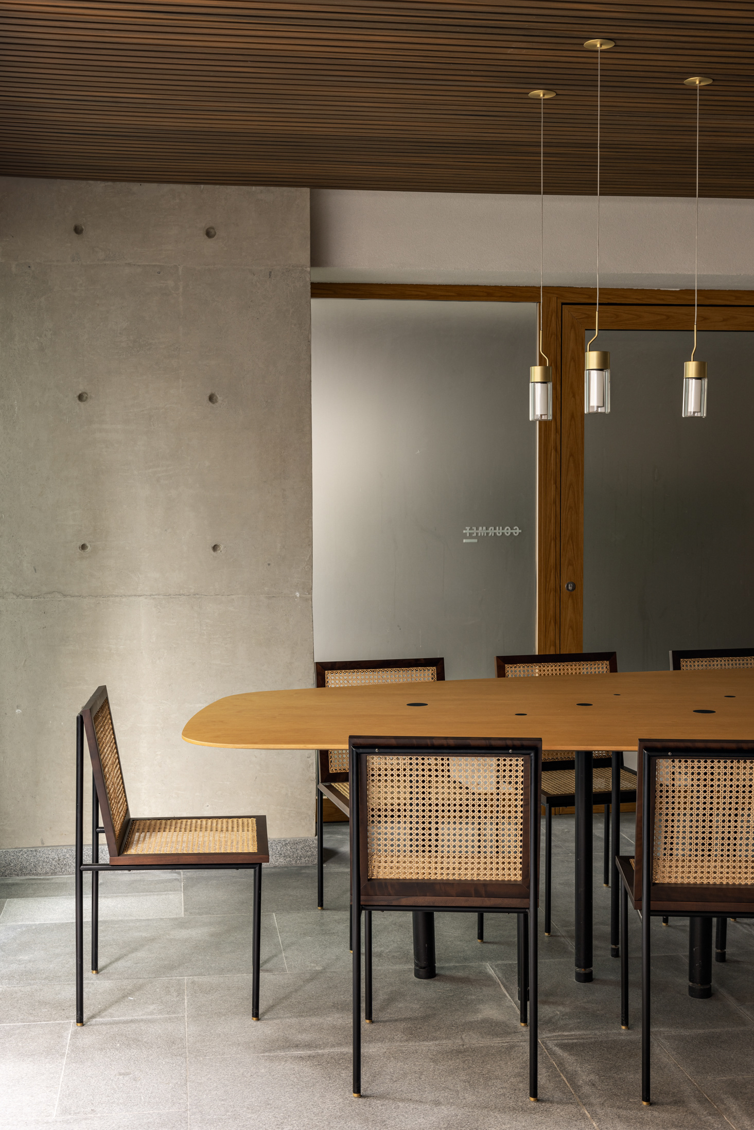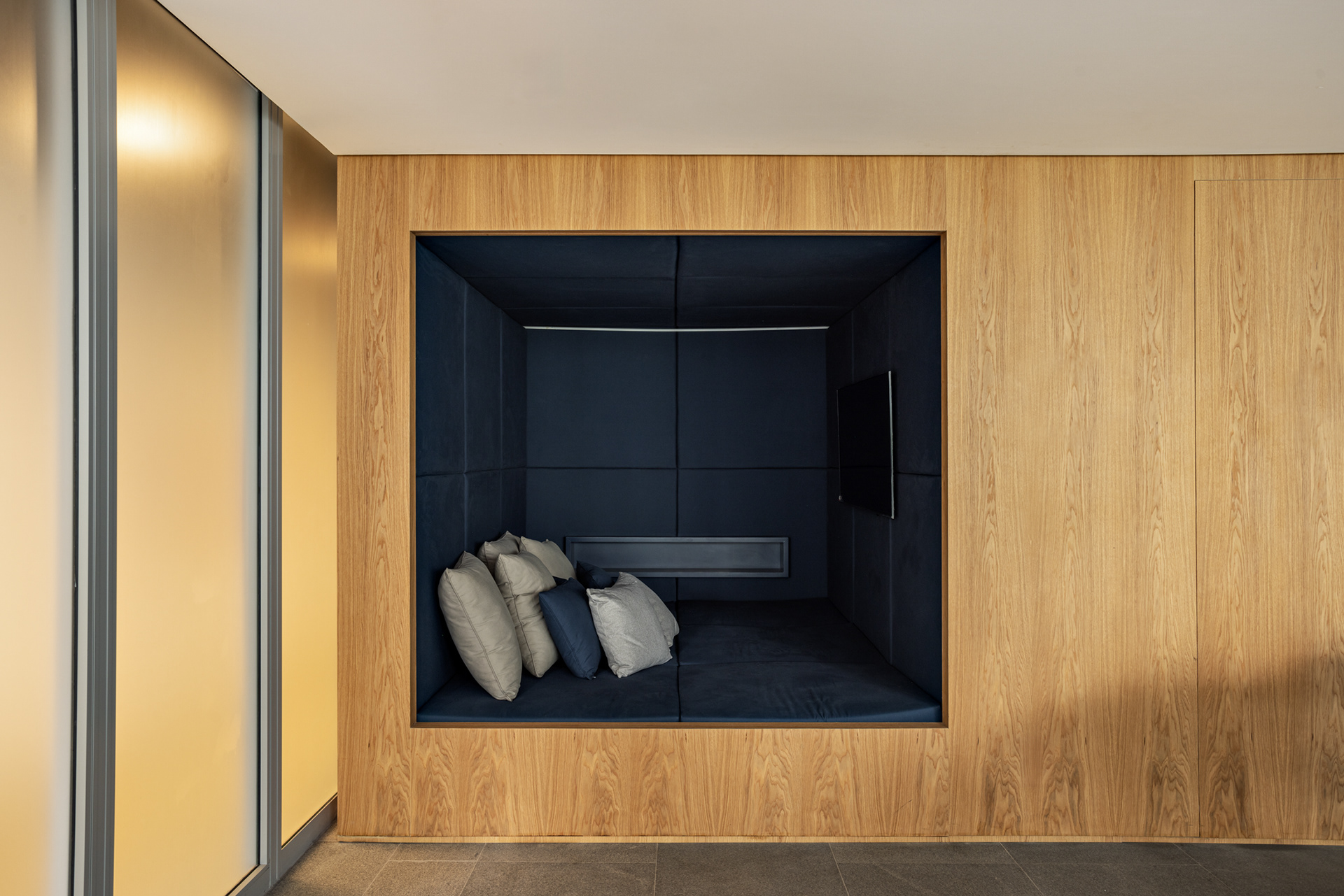 Na área social, para obtermos alguns espaços com o pé direito duplo desejado, a solução foi criar plantas invertidas. Num pavimento, temos a sala de estar envidraçada e voltada à frente do edifício, e a sala de jantar para o fundo, conformando um objeto bem definido. No pavimento seguinte, a inversão faz com que o volume sólido da sala de jantar se projeta sobre a sala de estar do pavimento abaixo, gerando vãos com pé direito mais alto. A inclinação da sala de jantar tem um objetivo duplo: a inclinação enfatiza a independência deste objeto, aumentando o contraste entre sua massa e o vazio envidraçado da sala de jantar; além disso, orienta a abertura da sala de jantar para as frestas entre os edifícios vizinhos, permitindo uma vista em direção ao parque.