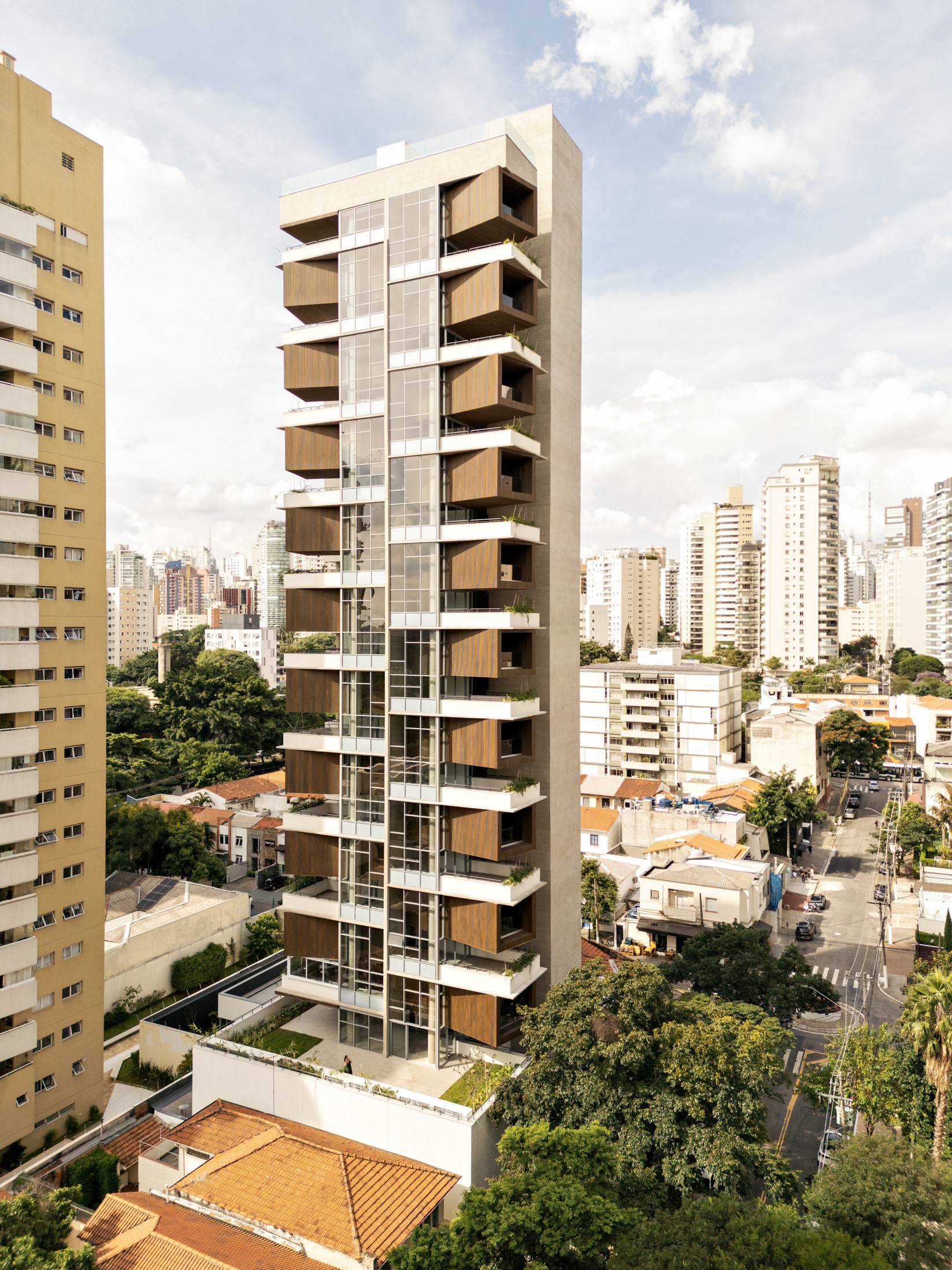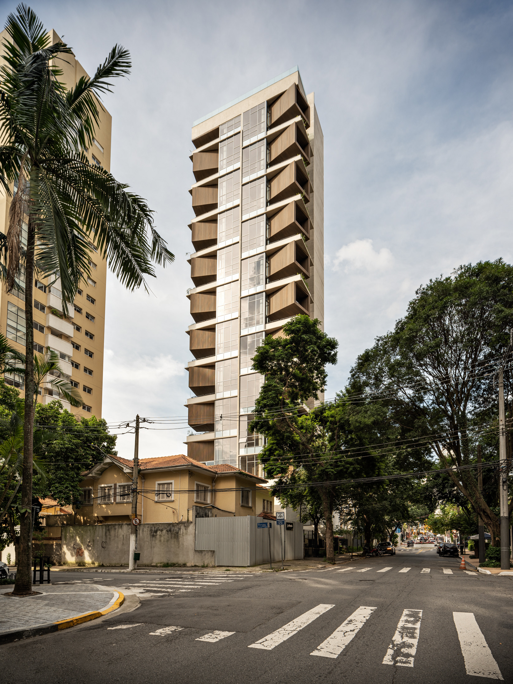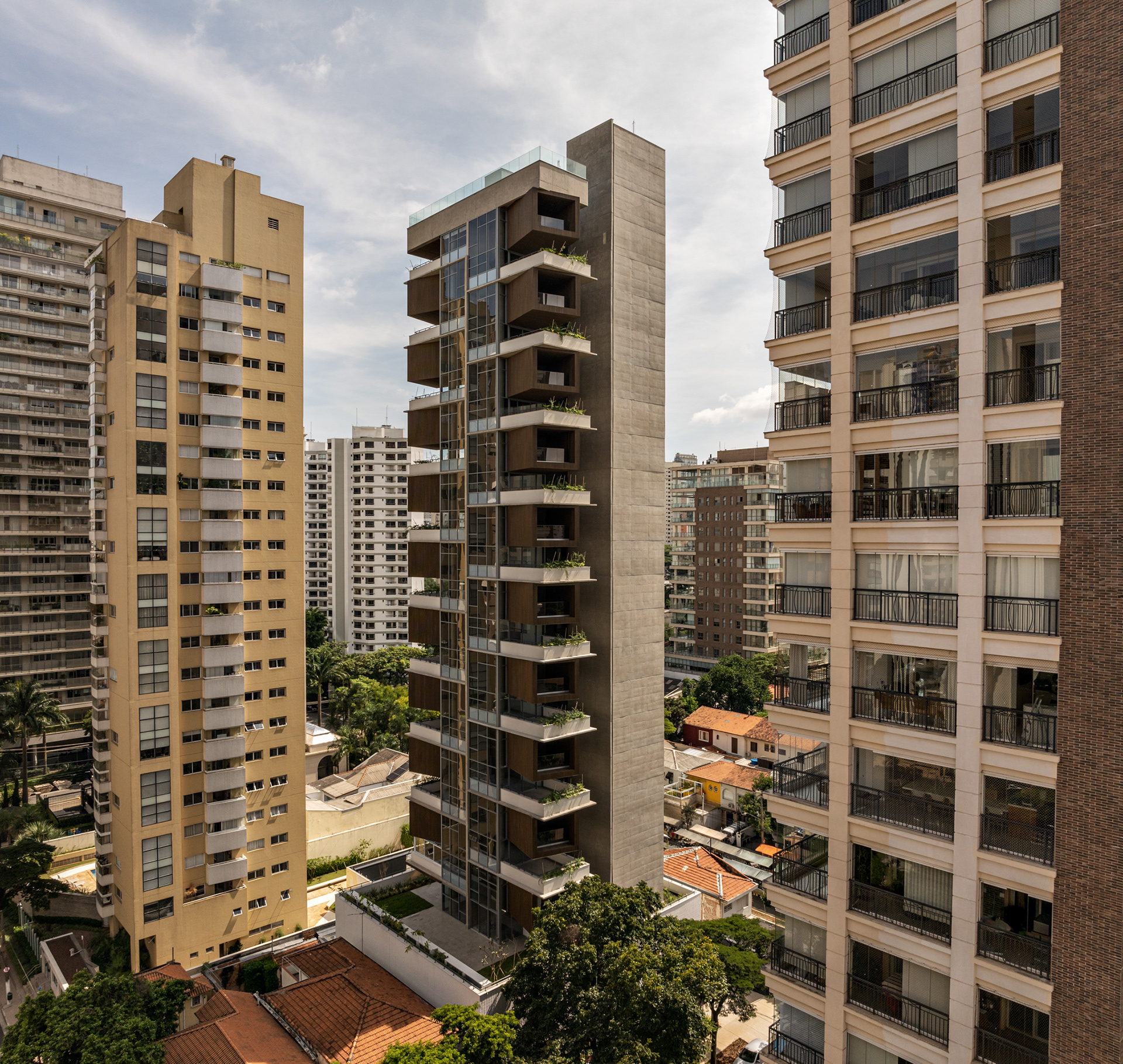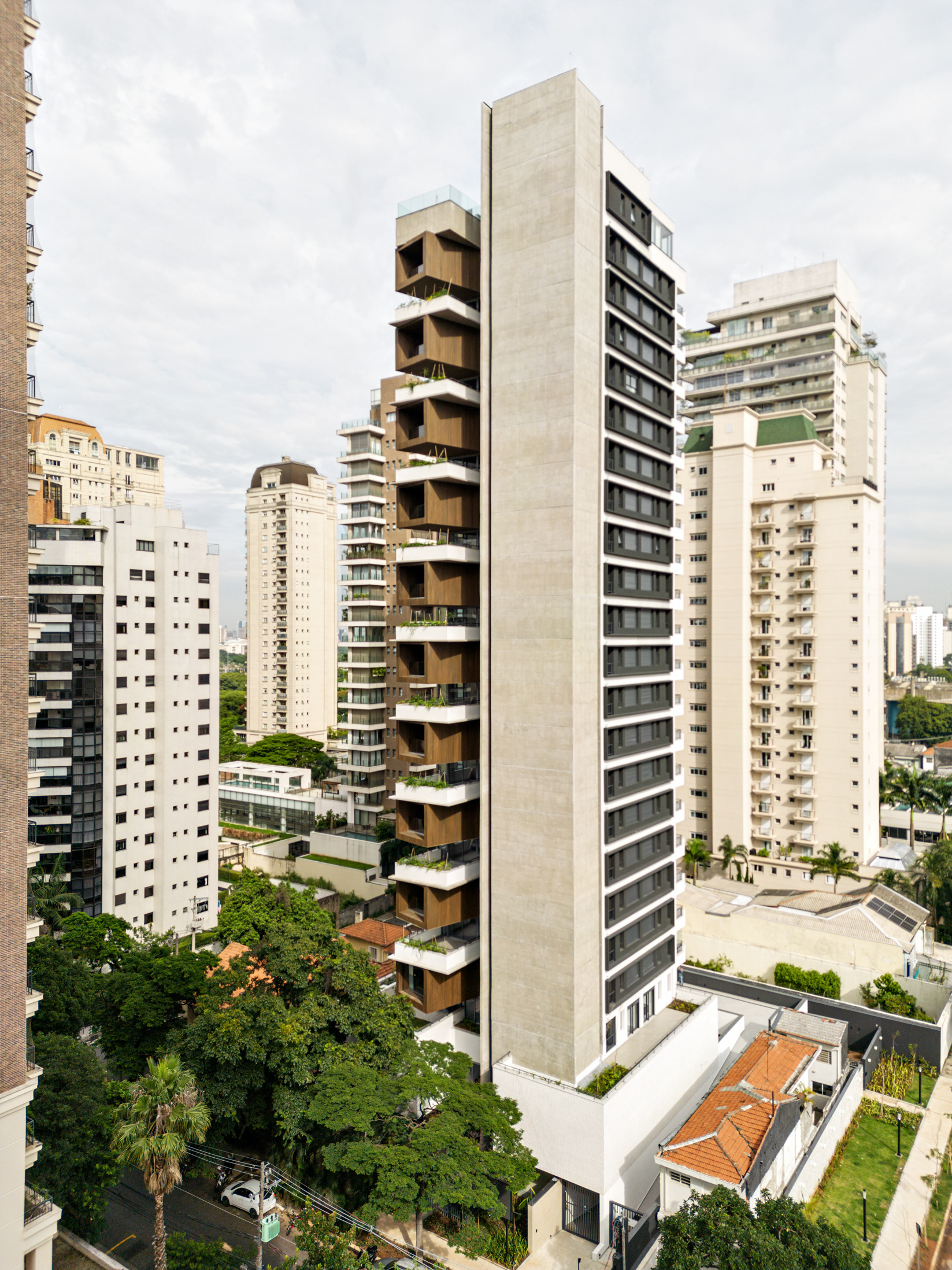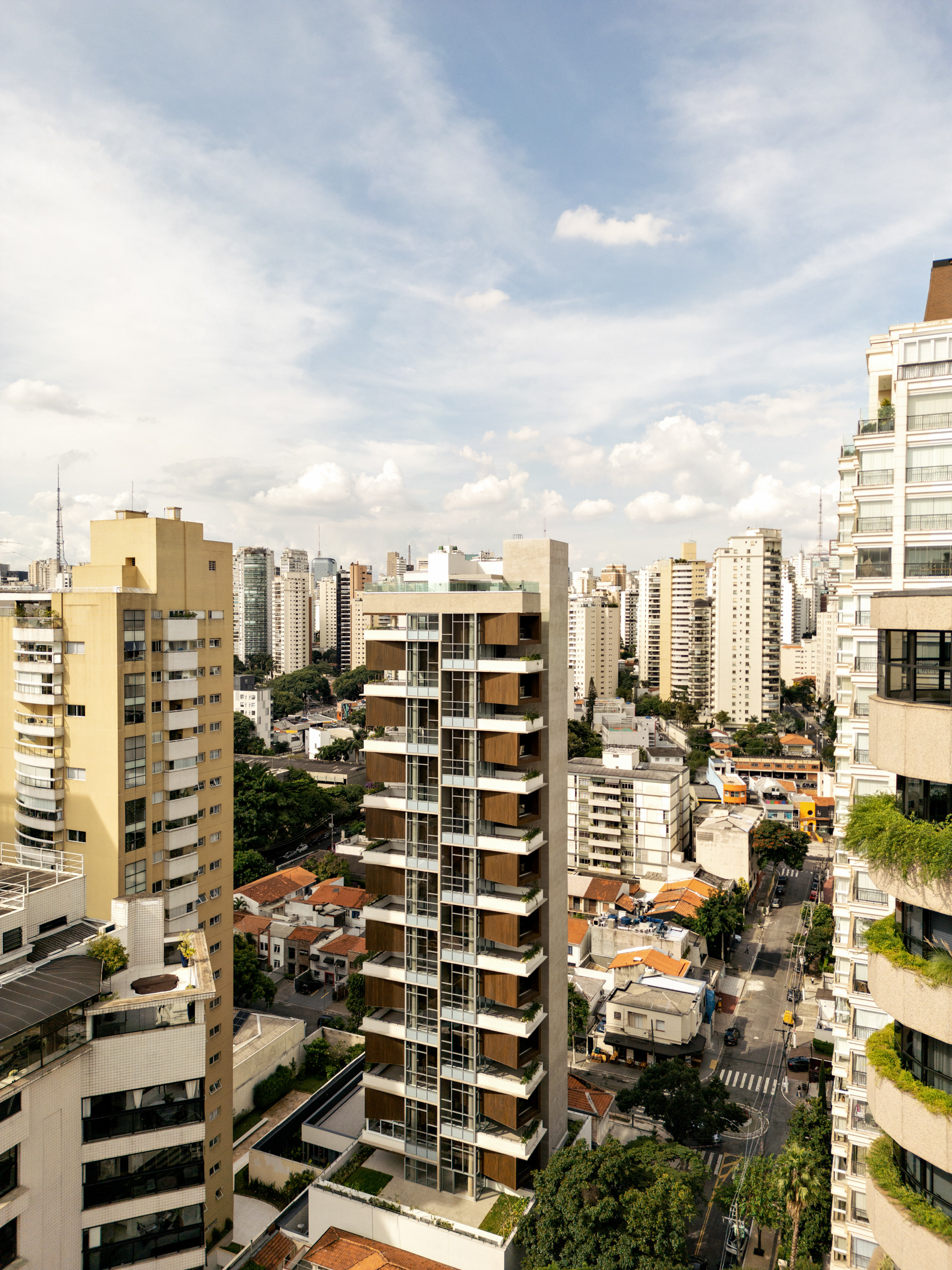 Localizado próximo ao Parque do Ibirapuera, pensamos que seria muito interessante se as áreas sociais dos apartamentos pudessem ter uma vista para o parque. Um desafio adicional foi proporcionar também espaços com pé direito duplo Para alcançar este objetivo, a solução foi buscar as frestas visuais entre os edifícios vizinhos. Desta maneira, os apartamentos de 185m², em pavimentos com um único apartamento, foram organizados em três prumadas: a leste, concentramos os dormitórios em plantas-tipo, em cuja porção frontal acomoda-se a escada de incêndio do prédio, marcando-o com um grande e sólido elemento em concreto aparente; a oeste, as áreas sociais organizadas em plantas invertidas entre si, conformando um elemento mais transparente, contrastando com a prumada dos quartos; e, no centro, de forma mais recuada e atuando como um elemento de separação entre as demais prumadas, temos a cozinha dos apartamentos e o elevador social.
