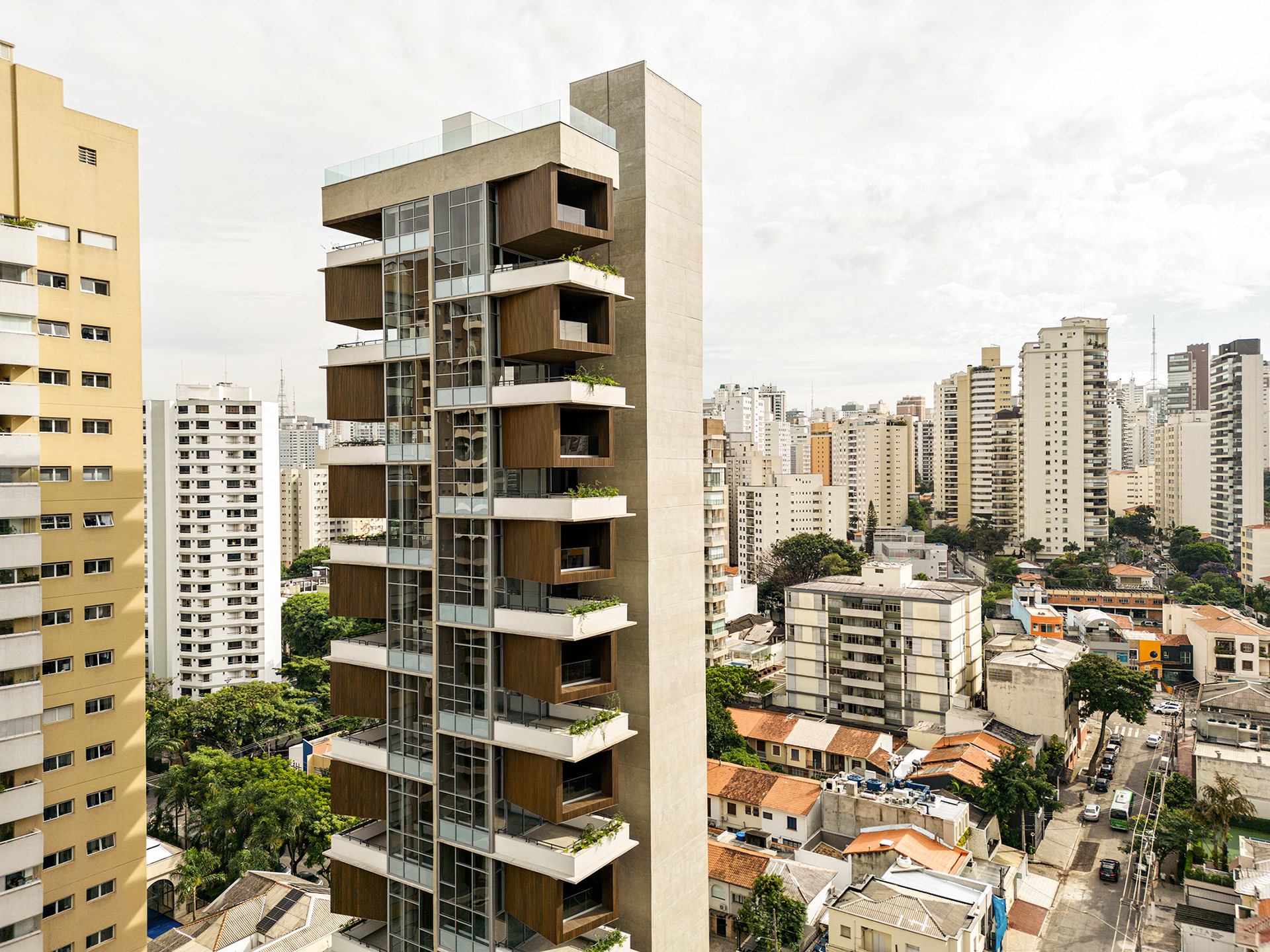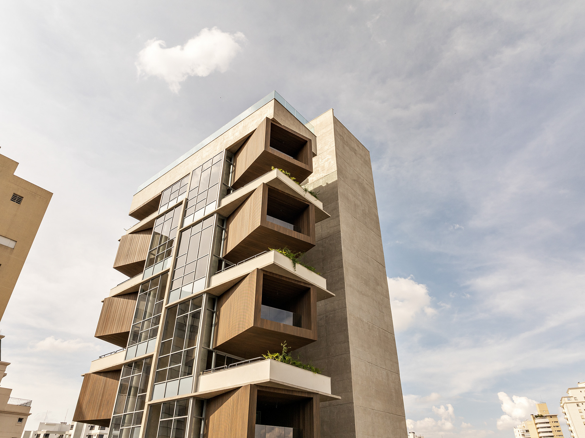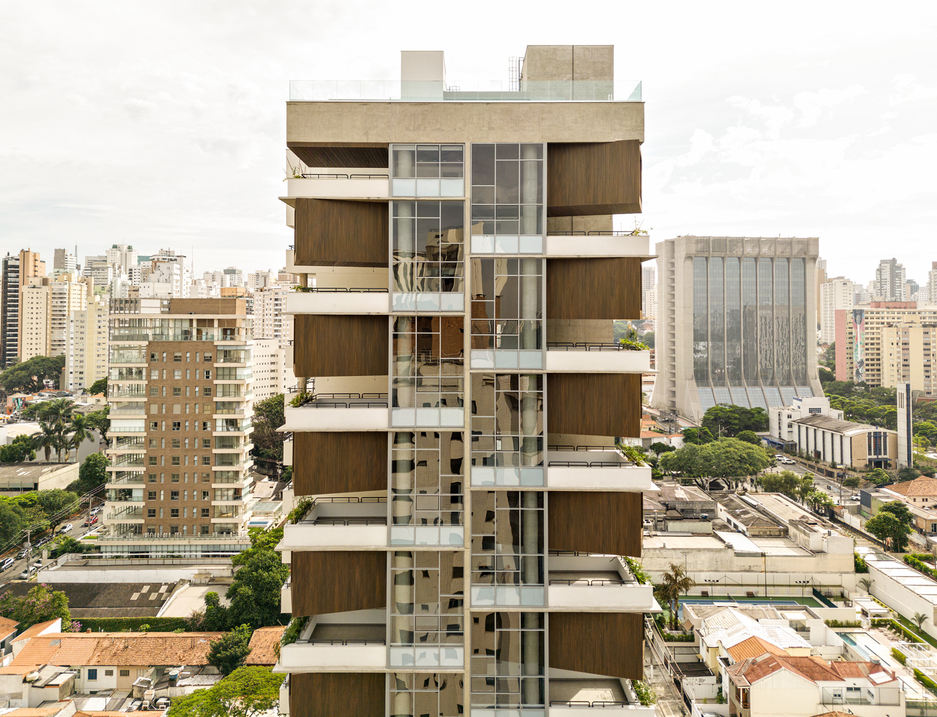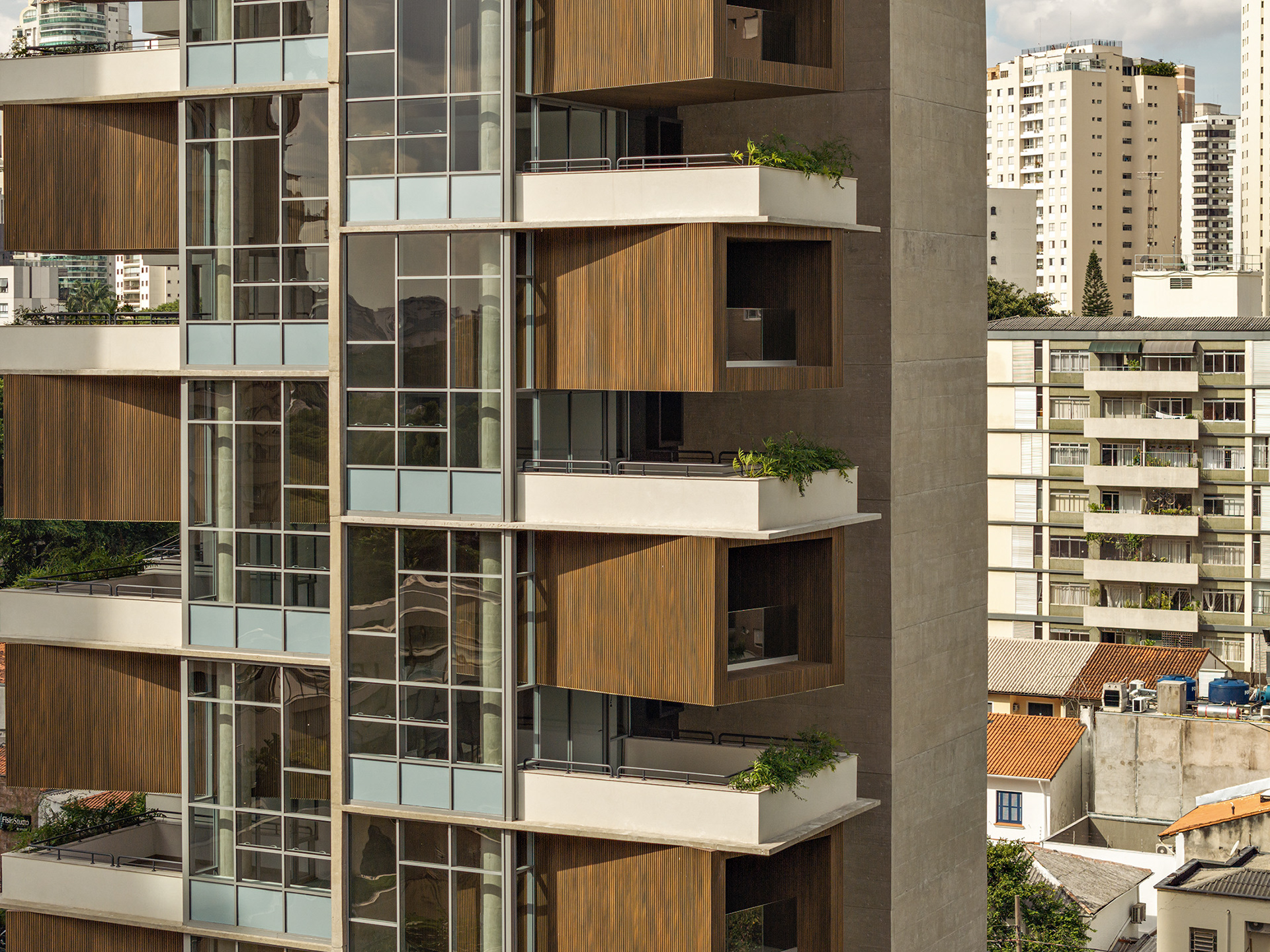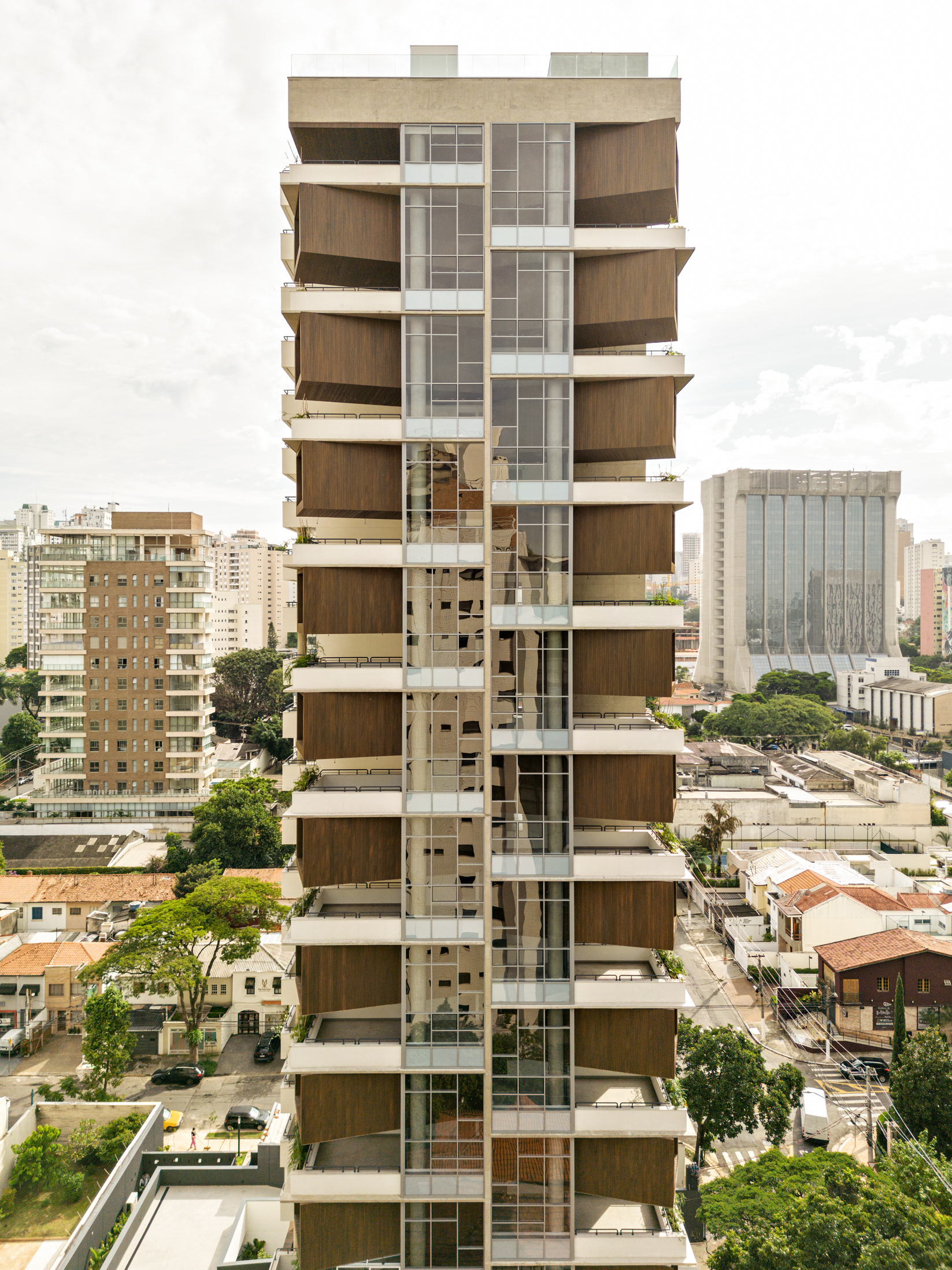 Localizado próximo ao Parque do Ibirapuera, pensamos que seria muito interessante se as áreas sociais dos apartamentos pudessem ter uma vista para o parque. Um desafio adicional foi proporcionar também espaços com pé direito duplo Para alcançar este objetivo, a solução foi buscar as frestas visuais entre os edifícios vizinhos. Desta maneira, os apartamentos de 185m², em pavimentos com um único apartamento, foram organizados em três prumadas: a leste, concentramos os dormitórios em plantas-tipo, em cuja porção frontal acomoda-se a escada de incêndio do prédio, marcando-o com um grande e sólido elemento em concreto aparente; a oeste, as áreas sociais organizadas em plantas invertidas entre si, conformando um elemento mais transparente, contrastando com a prumada dos quartos; e, no centro, de forma mais recuada e atuando como um elemento de separação entre as demais prumadas, temos a cozinha dos apartamentos e o elevador social.