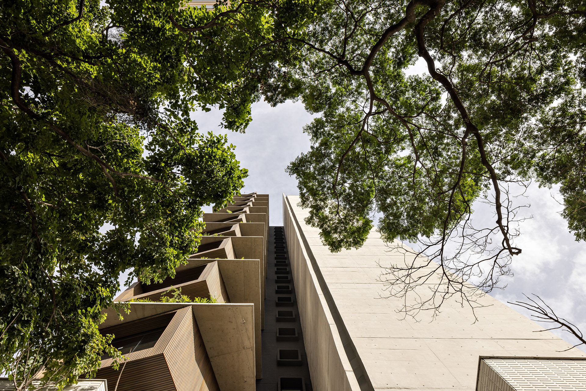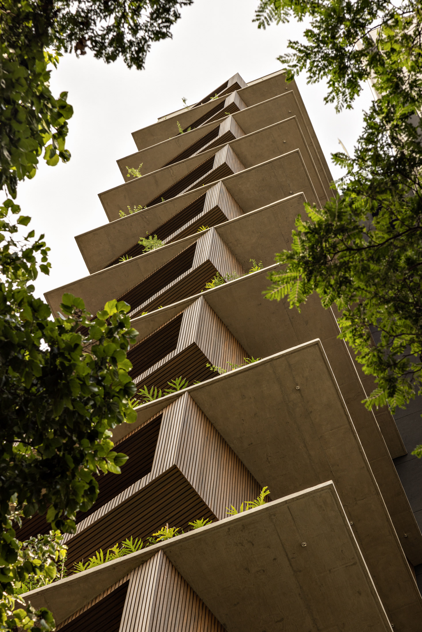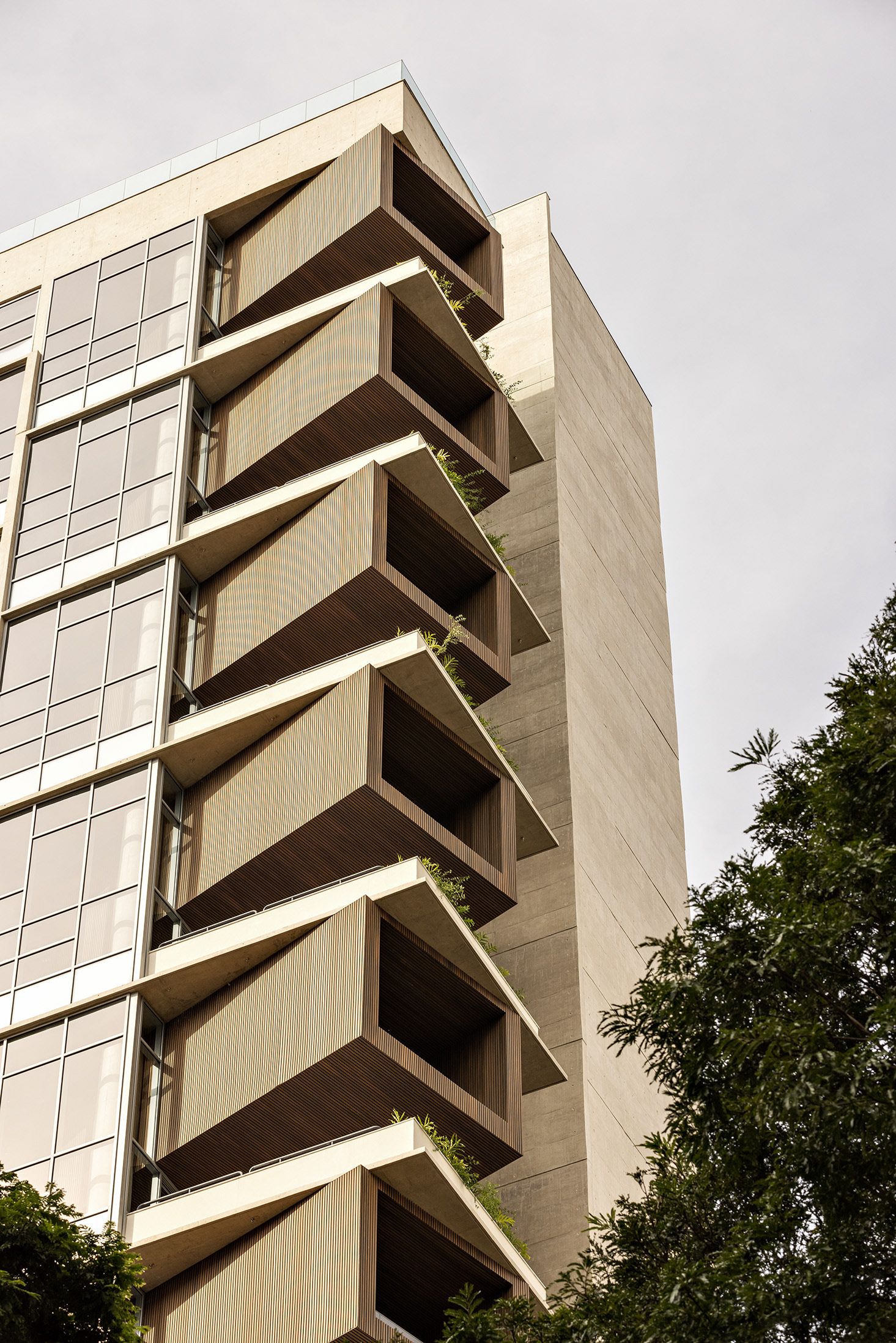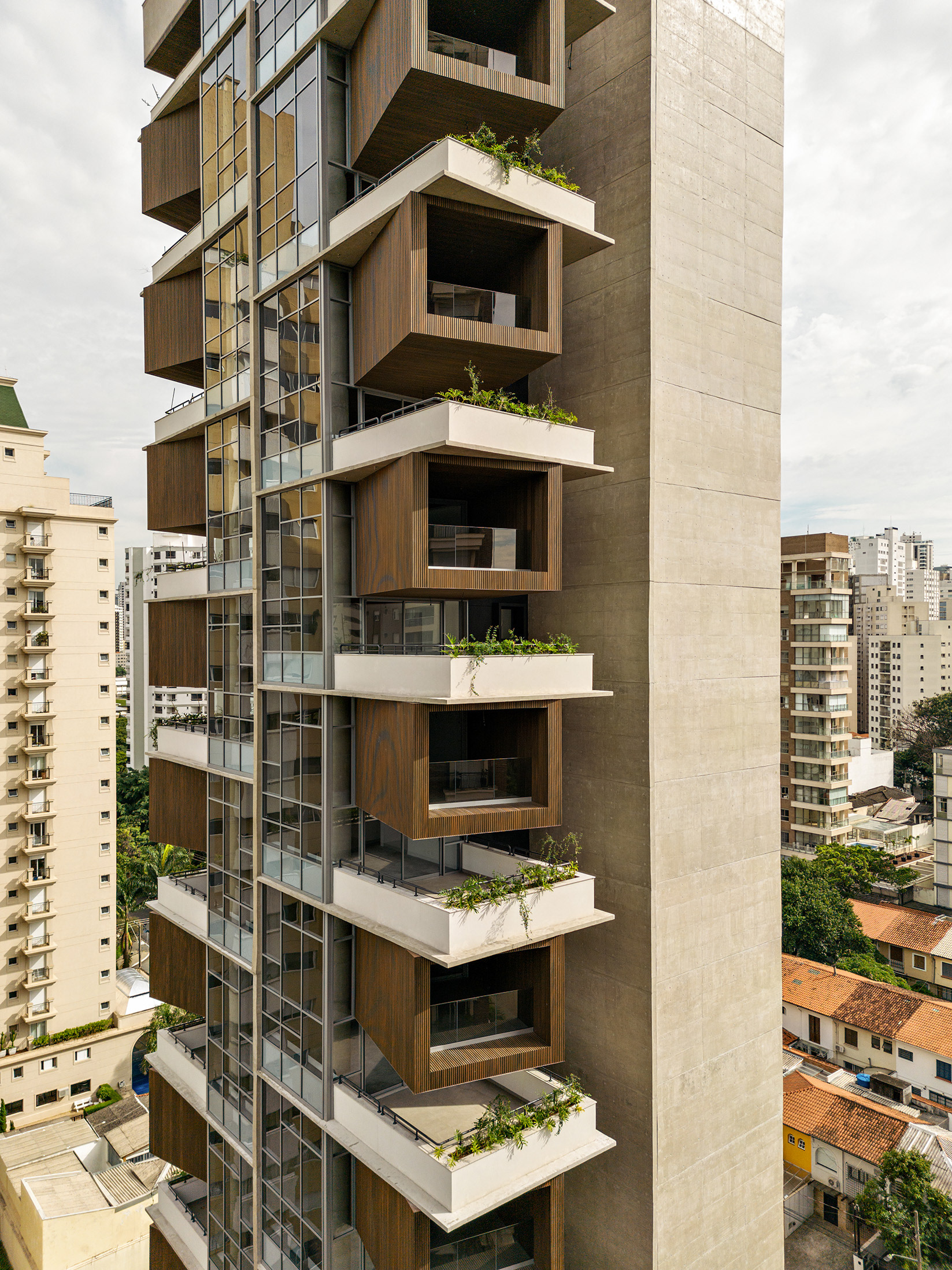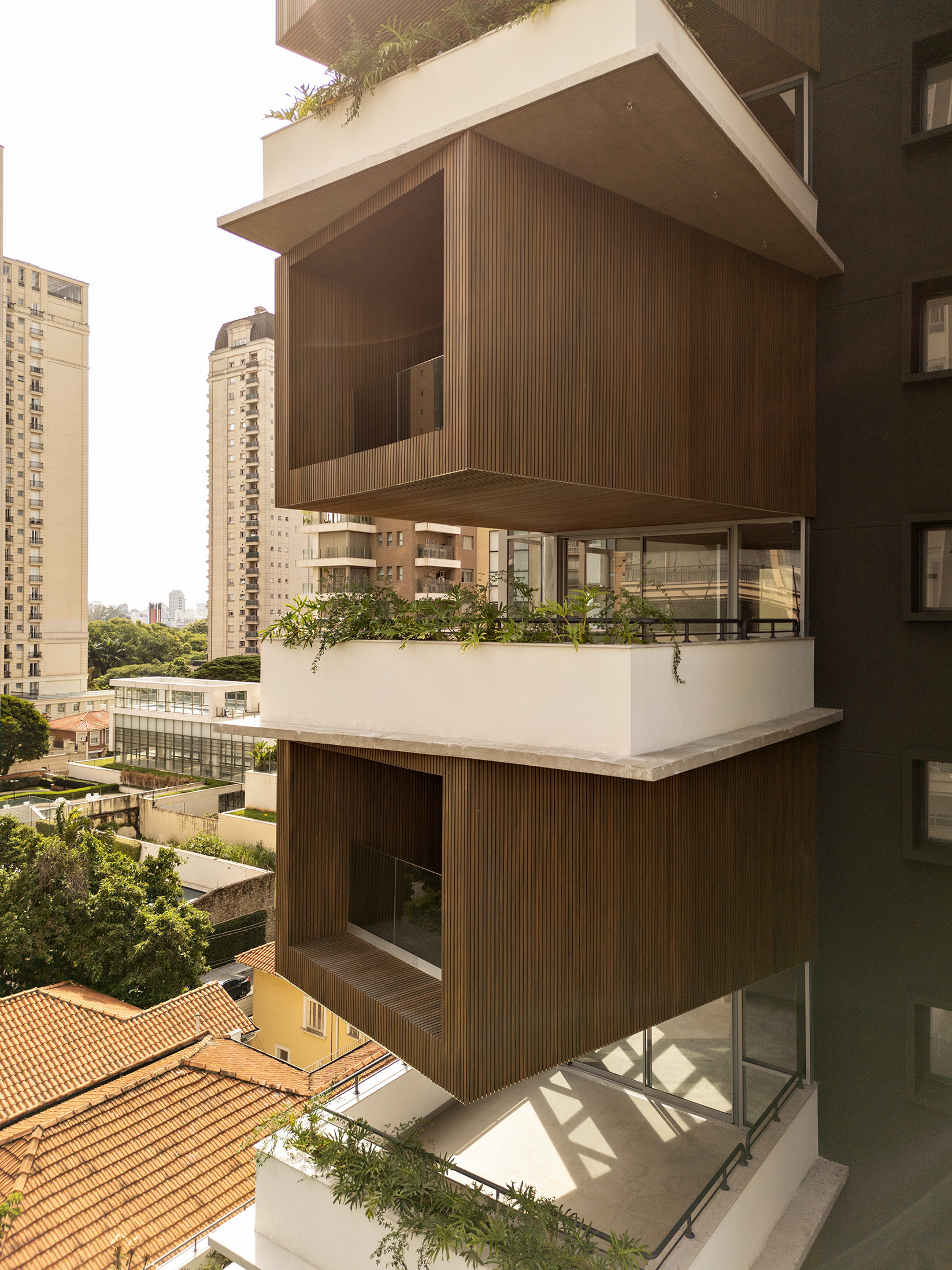 Localizado próximo ao Parque do Ibirapuera, pensamos que seria muito interessante se as áreas sociais dos apartamentos pudessem ter uma vista para o parque. Um desafio adicional foi proporcionar também espaços com pé direito duplo Para alcançar este objetivo, a solução foi buscar as frestas visuais entre os edifícios vizinhos. Desta maneira, os apartamentos de 185m², em pavimentos com um único apartamento, foram organizados em três prumadas: a leste, concentramos os dormitórios em plantas-tipo, em cuja porção frontal acomoda-se a escada de incêndio do prédio, marcando-o com um grande e sólido elemento em concreto aparente; a oeste, as áreas sociais organizadas em plantas invertidas entre si, conformando um elemento mais transparente, contrastando com a prumada dos quartos; e, no centro, de forma mais recuada e atuando como um elemento de separação entre as demais prumadas, temos a cozinha dos apartamentos e o elevador social.