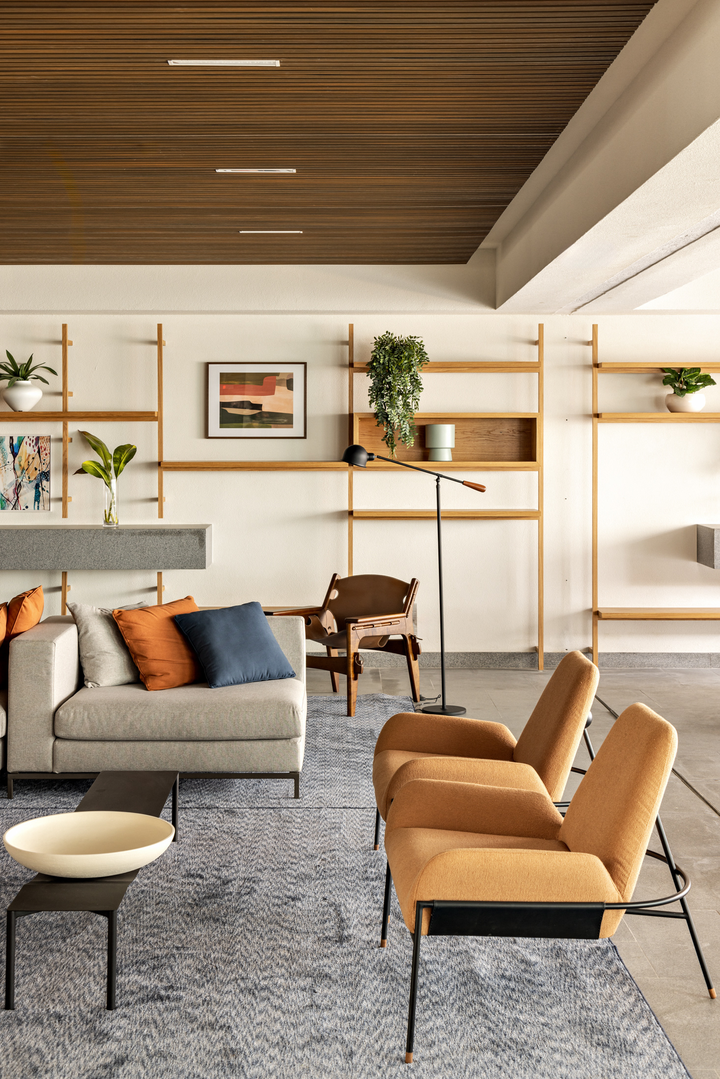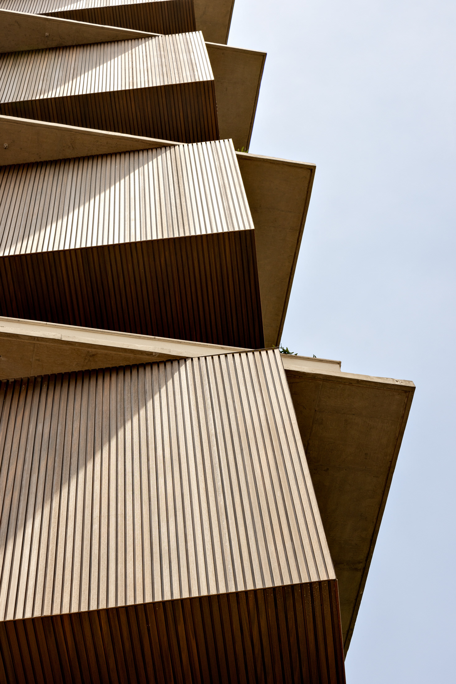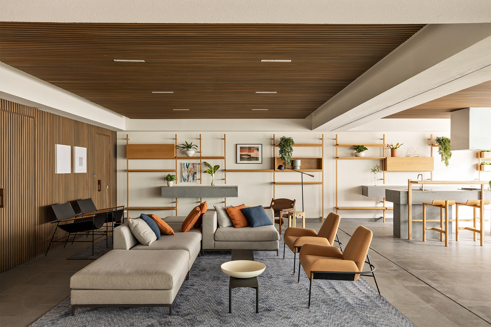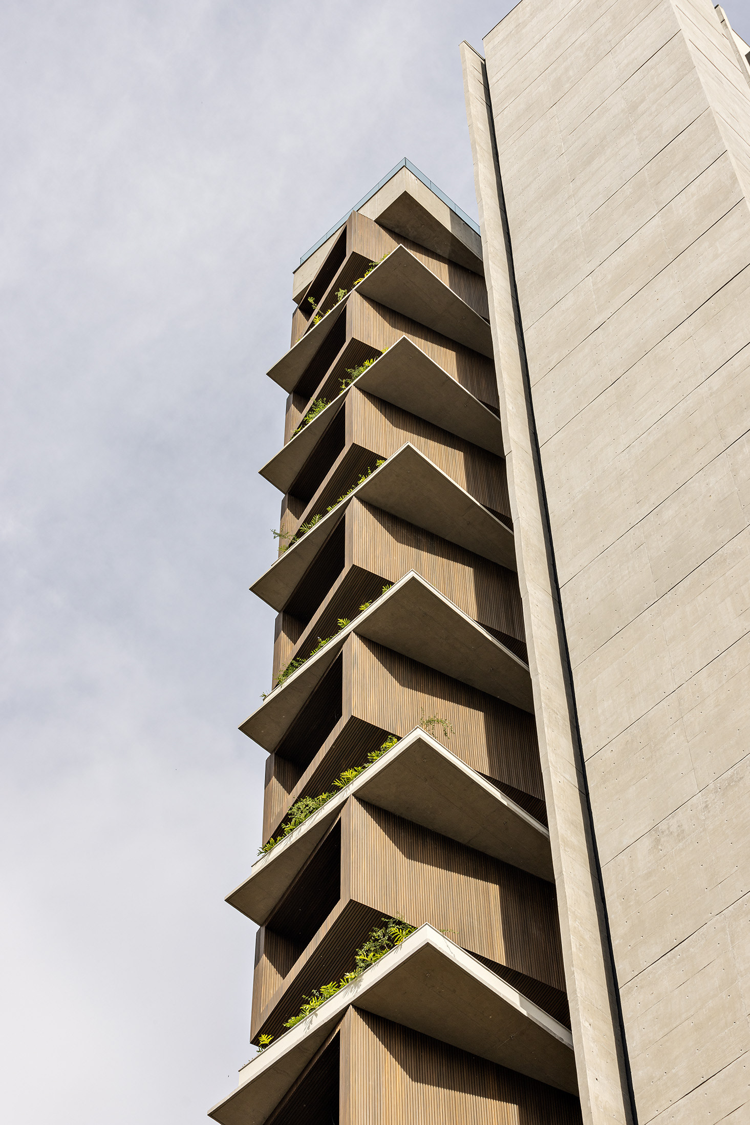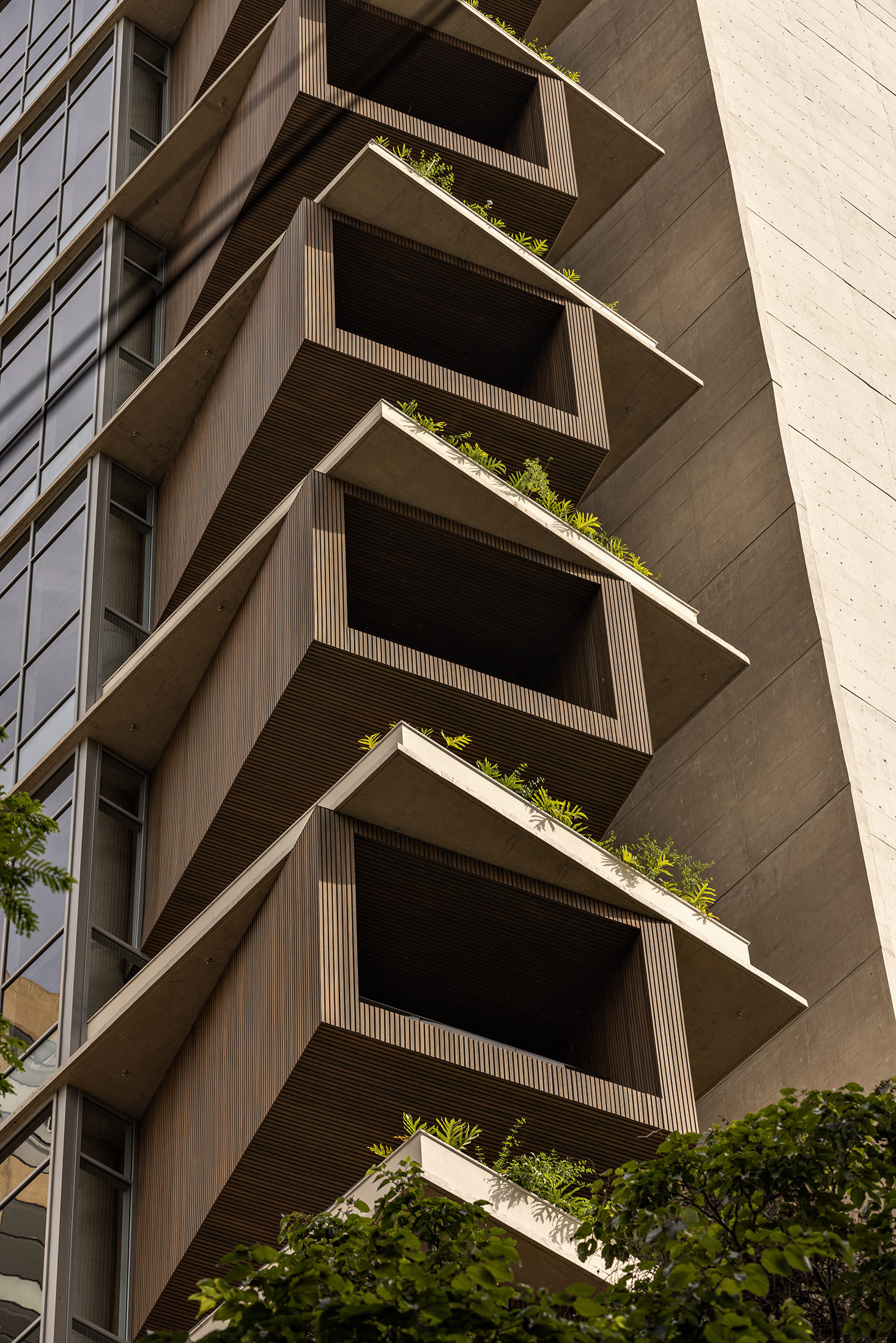 Localizado próximo ao Parque do Ibirapuera, pensamos que seria muito interessante se as áreas sociais dos apartamentos pudessem ter uma vista para o parque. Um desafio adicional foi proporcionar também espaços com pé direito duplo Para alcançar este objetivo, a solução foi buscar as frestas visuais entre os edifícios vizinhos. Desta maneira, os apartamentos de 185m², em pavimentos com um único apartamento, foram organizados em três prumadas: a leste, concentramos os dormitórios em plantas-tipo, em cuja porção frontal acomoda-se a escada de incêndio do prédio, marcando-o com um grande e sólido elemento em concreto aparente; a oeste, as áreas sociais organizadas em plantas invertidas entre si, conformando um elemento mais transparente, contrastando com a prumada dos quartos; e, no centro, de forma mais recuada e atuando como um elemento de separação entre as demais prumadas, temos a cozinha dos apartamentos e o elevador social.