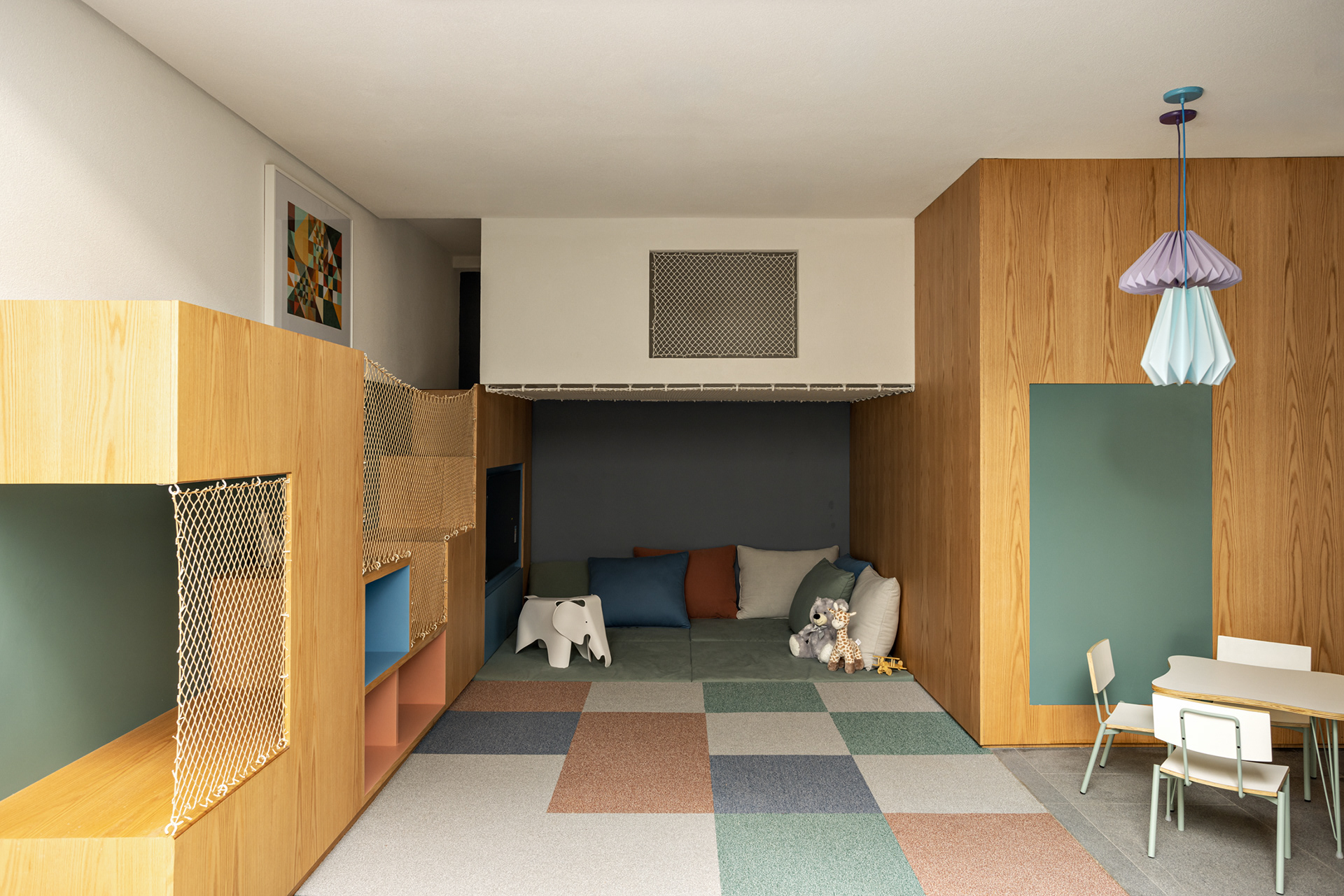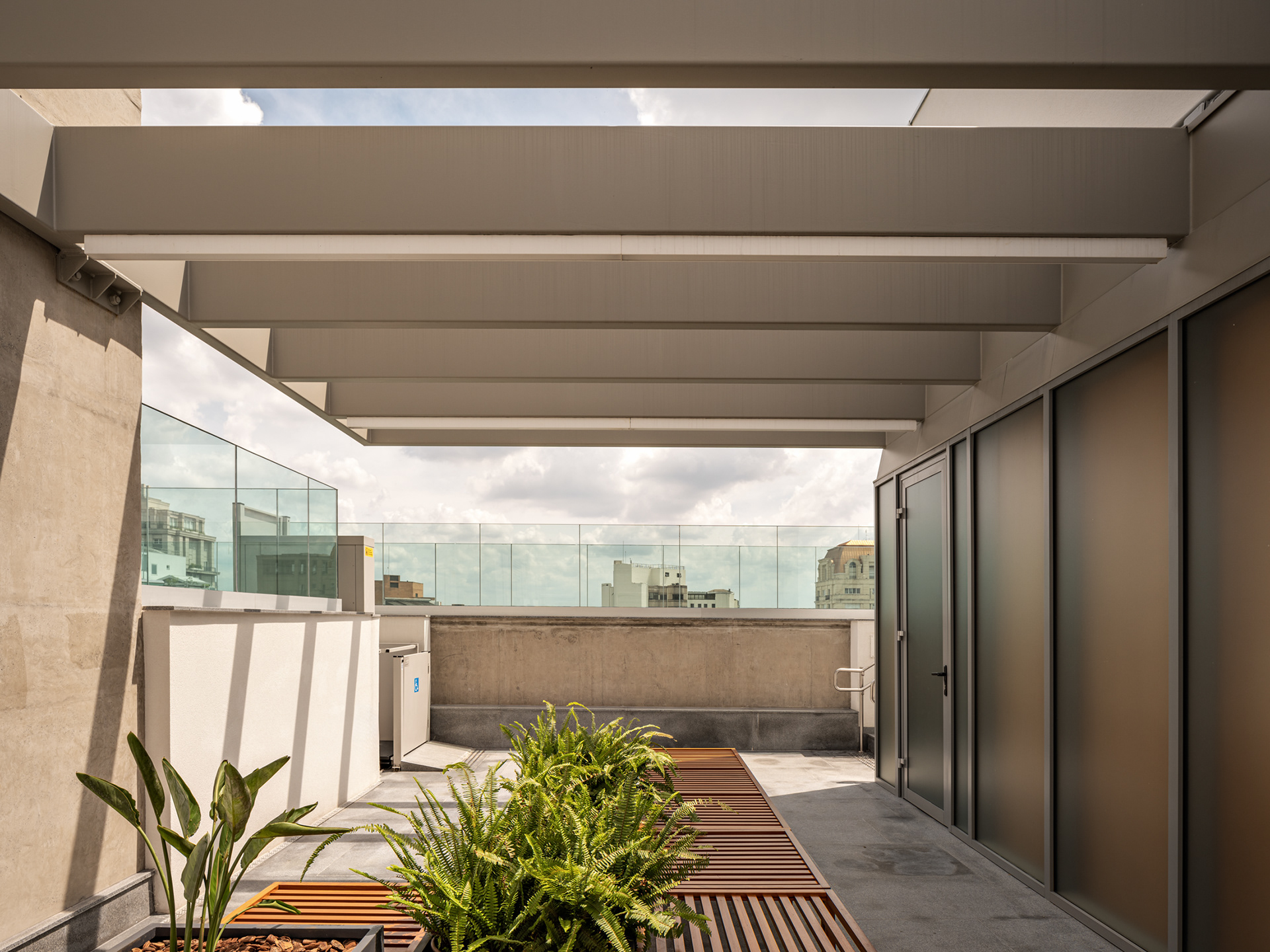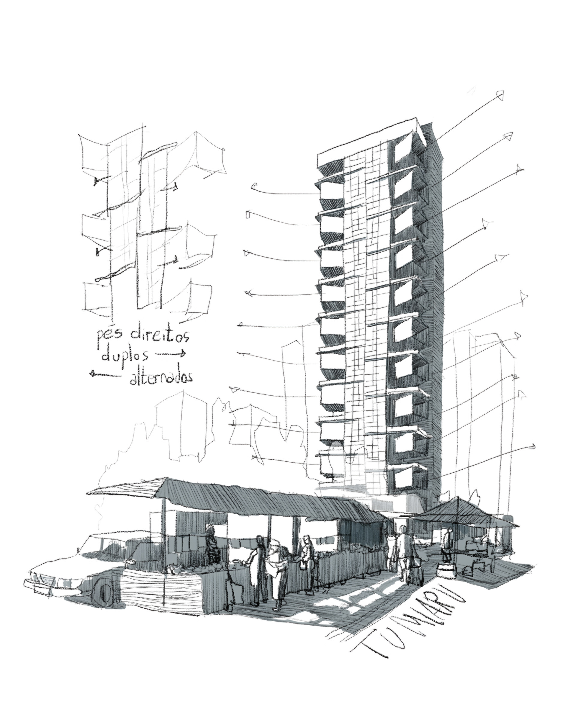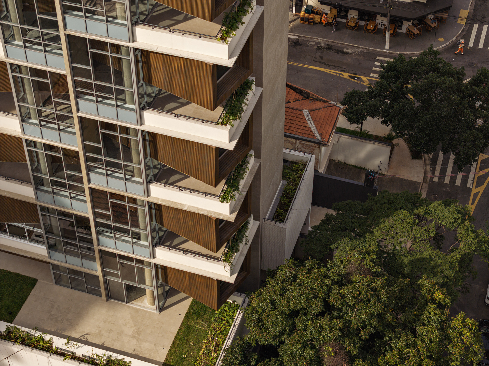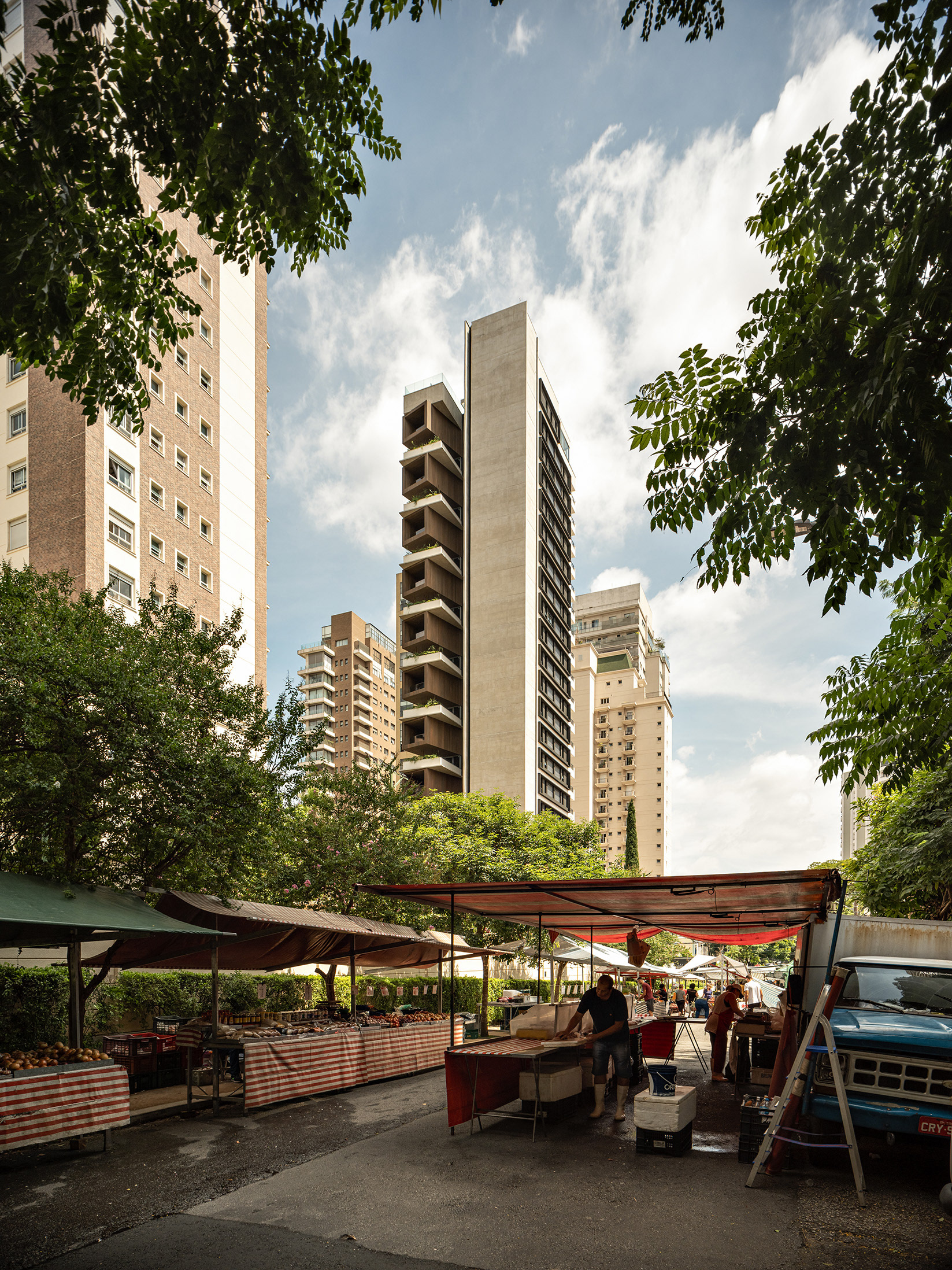 Ao formar o terreno para o prédio, uma casa remanescente da ocupação original acabou por não ser incorporada, resultando num grande recorte e impondo uma faixa estreita e não edificável junto à esquina. Desta maneira, esta faixa ficou praticamente isolada, o que permitiu que abríssemos este terreno como uma pequena praça urbana, um espaço verde para todos. Adicionalmente, a ideia de que o pavimento térreo fosse o mais aberto para a cidade, verde e sem muros e grades ostensivas também se repete na entrada principal do edifício: um simpático jardim se soma à calçada, enquanto os limites de acesso acontecem de maneira afastada. Temos sempre claro que a paisagem e a vida urbanas são também decorrentes dos projetos individuais, e não apenas do planejamento público. Desta maneira, ceder um espaço à cidade é, em última instância, criar um cidade mais humana, melhorar a vida de todos, não apenas dos moradores do novo edifício.