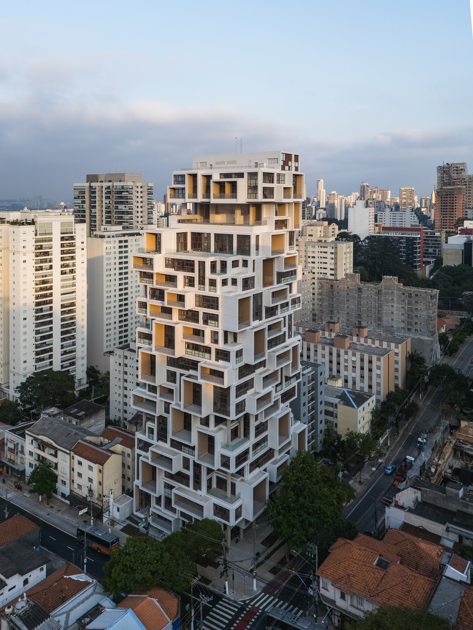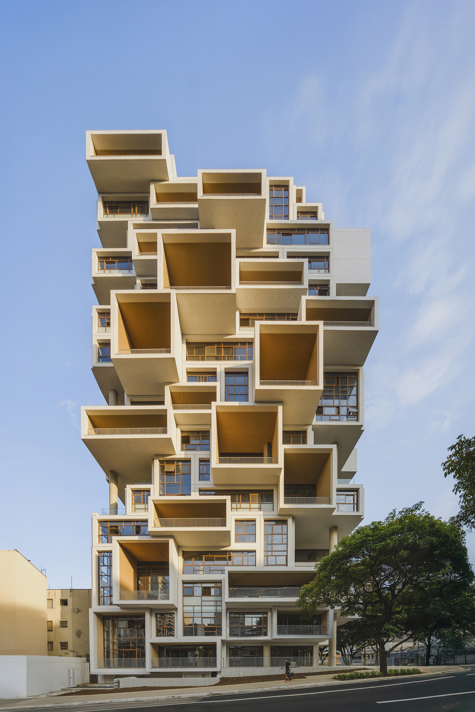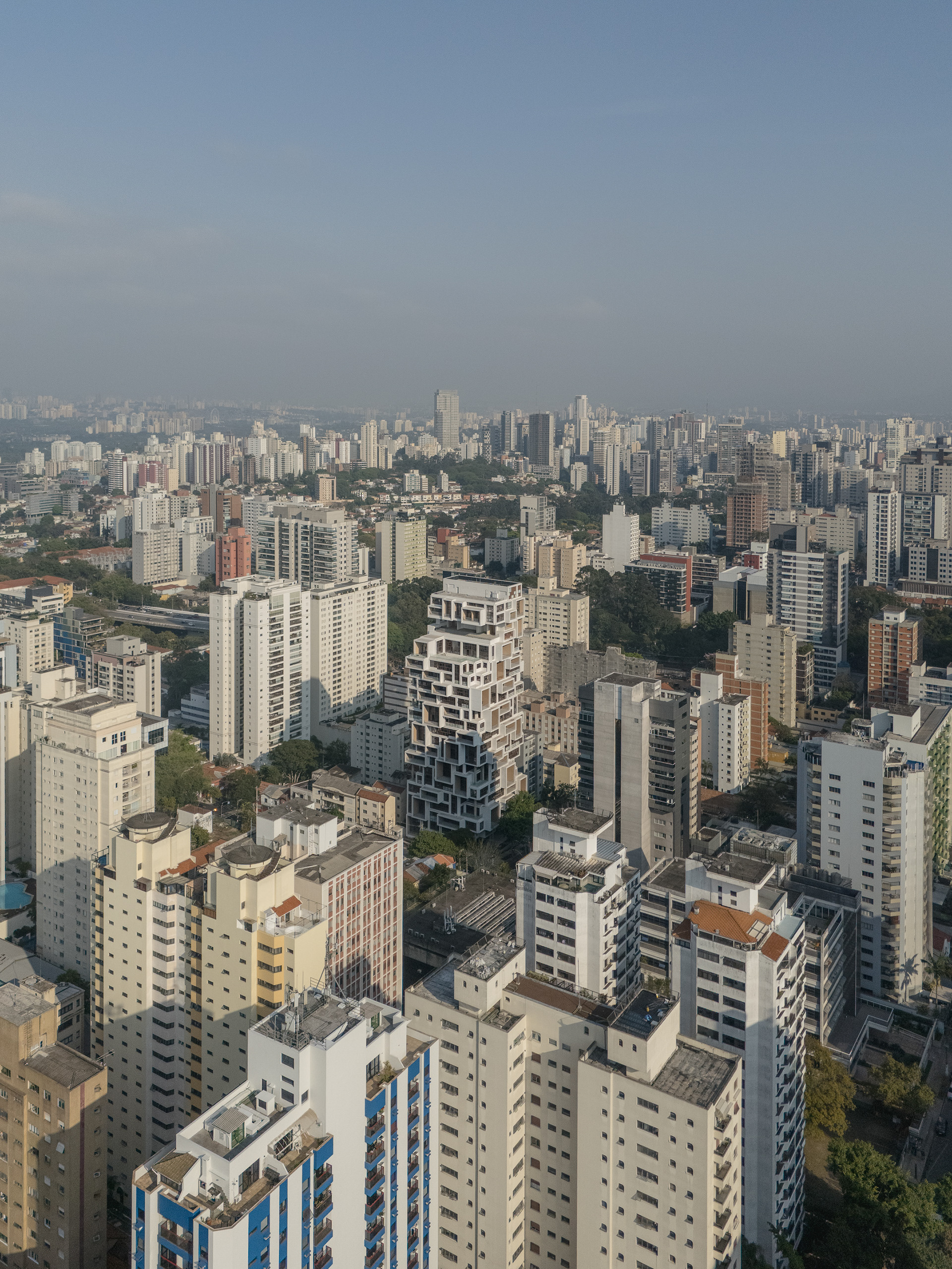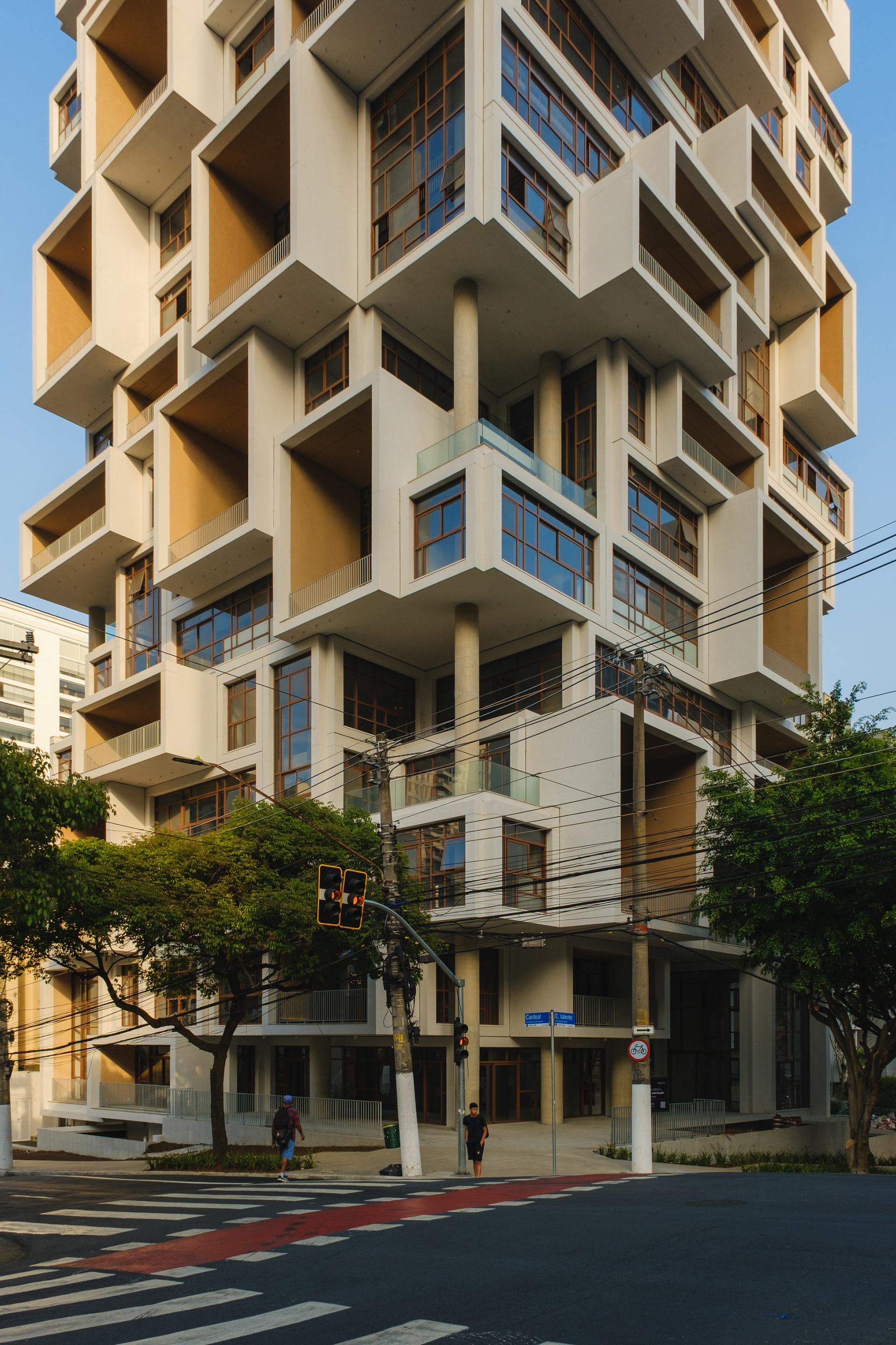 A volumetria da edificação foi concebida através de retângulos de pés direitos simples ou duplos, projetados para frente, que são as varandas, computadas pela legislação andar a andar. Sobre essas varandas, extensas jardineiras com árvores grandes e projeto de Rodrigo Oliveira busca trazer o paisagismo para os diferentes níveis do prédio, ao mesmo tempo que colabora com a vegetação da Cardeal Arcoverde, que é bem escassa. Os mesmos volumes das varandas, quase zerados, compõem com panos de caixilharia que ora abrem como maxim-ar, ora abrem de correr o aspecto geral do prédio. No térreo, amplos recuos trazem uma abertura necessária para pedestres nessa importante esquina, que atualmente sofre com calçadas mínimas.