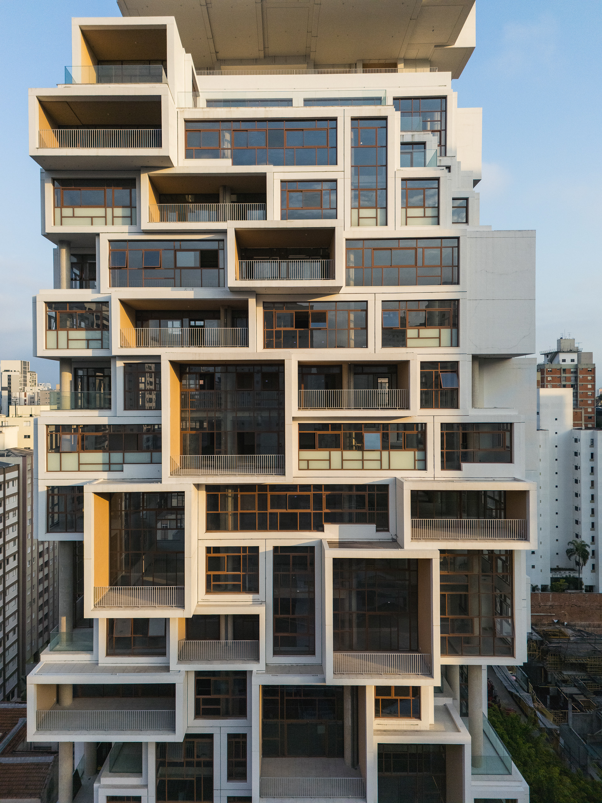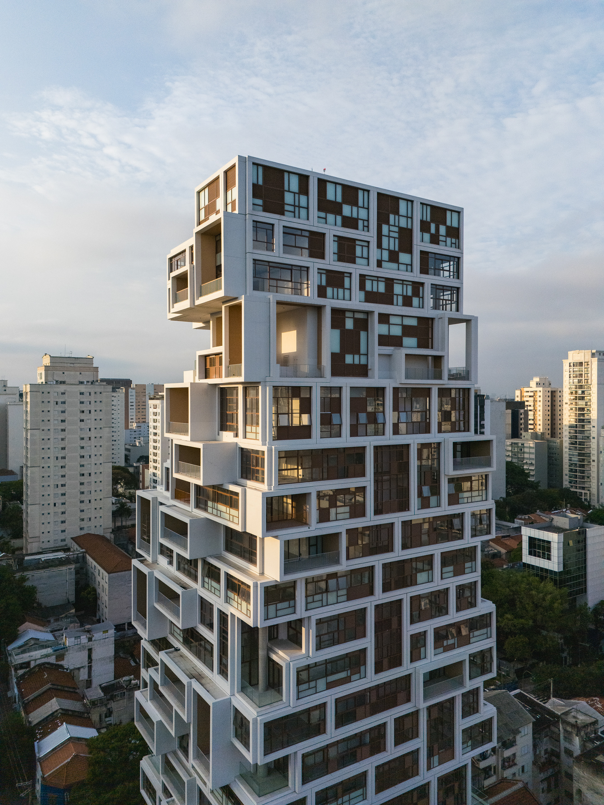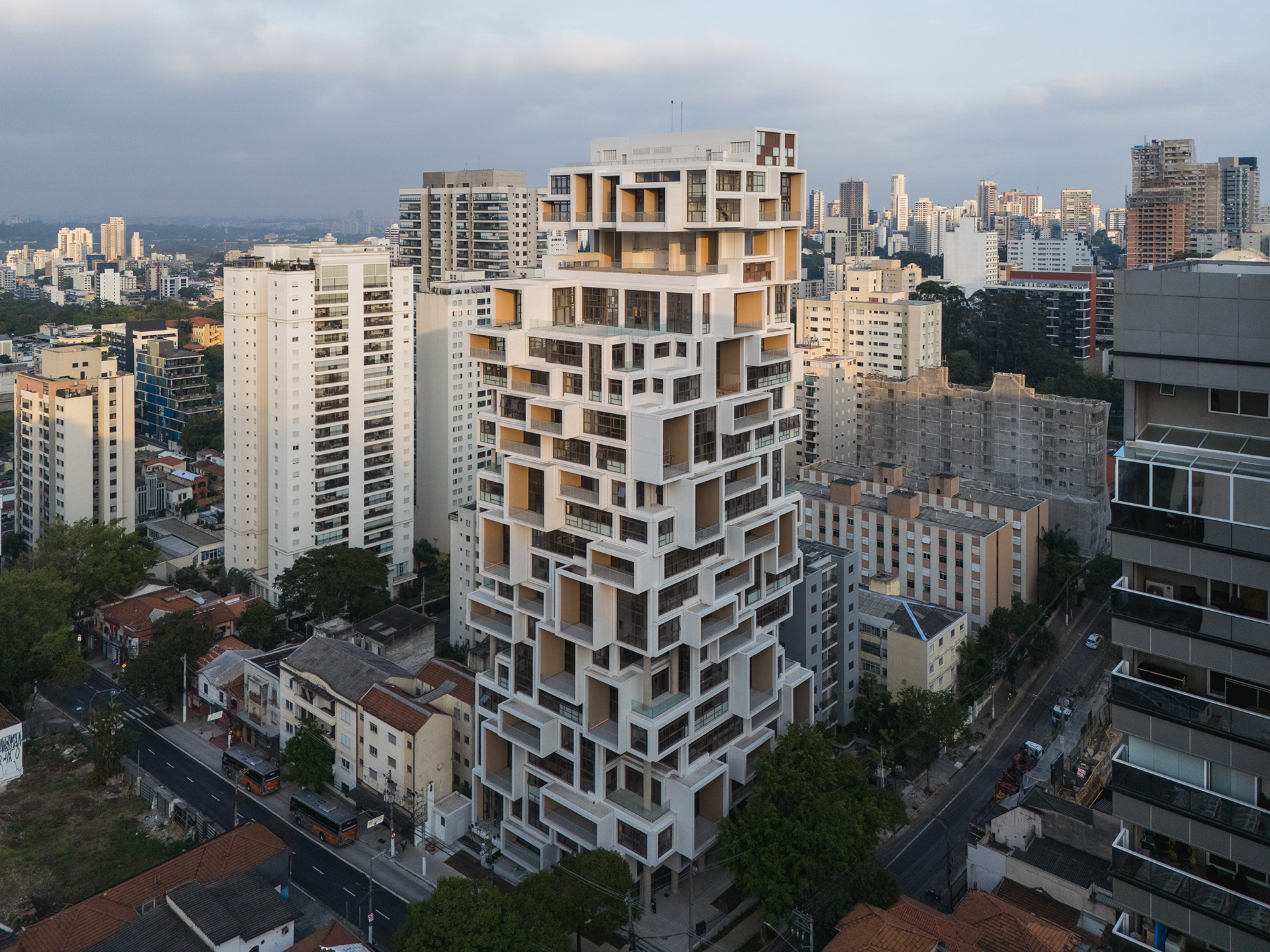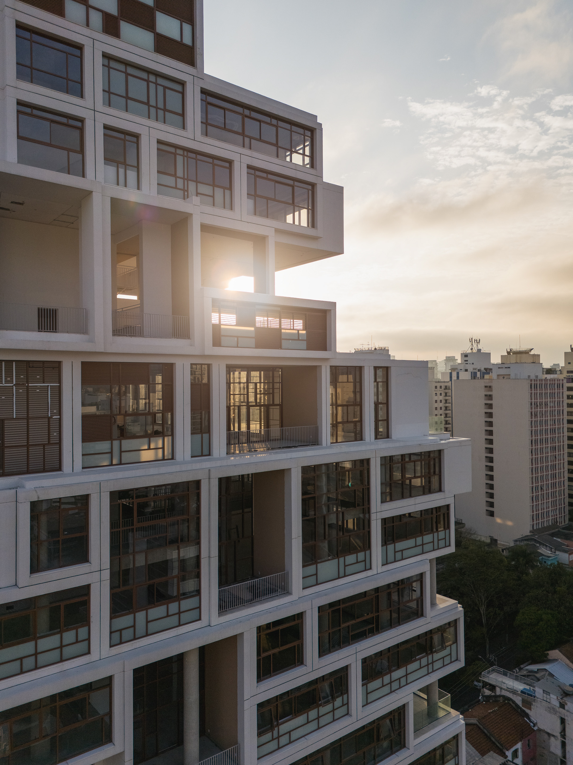 A volumetria da edificação foi concebida através de retângulos de pés direitos simples ou duplos, projetados para frente, que são as varandas, computadas pela legislação andar a andar. Sobre essas varandas, extensas jardineiras com árvores grandes e projeto de Rodrigo Oliveira busca trazer o paisagismo para os diferentes níveis do prédio, ao mesmo tempo que colabora com a vegetação da Cardeal Arcoverde, que é bem escassa. Os mesmos volumes das varandas, quase zerados, compõem com panos de caixilharia que ora abrem como maxim-ar, ora abrem de correr o aspecto geral do prédio. No térreo, amplos recuos trazem uma abertura necessária para pedestres nessa importante esquina, que atualmente sofre com calçadas mínimas.