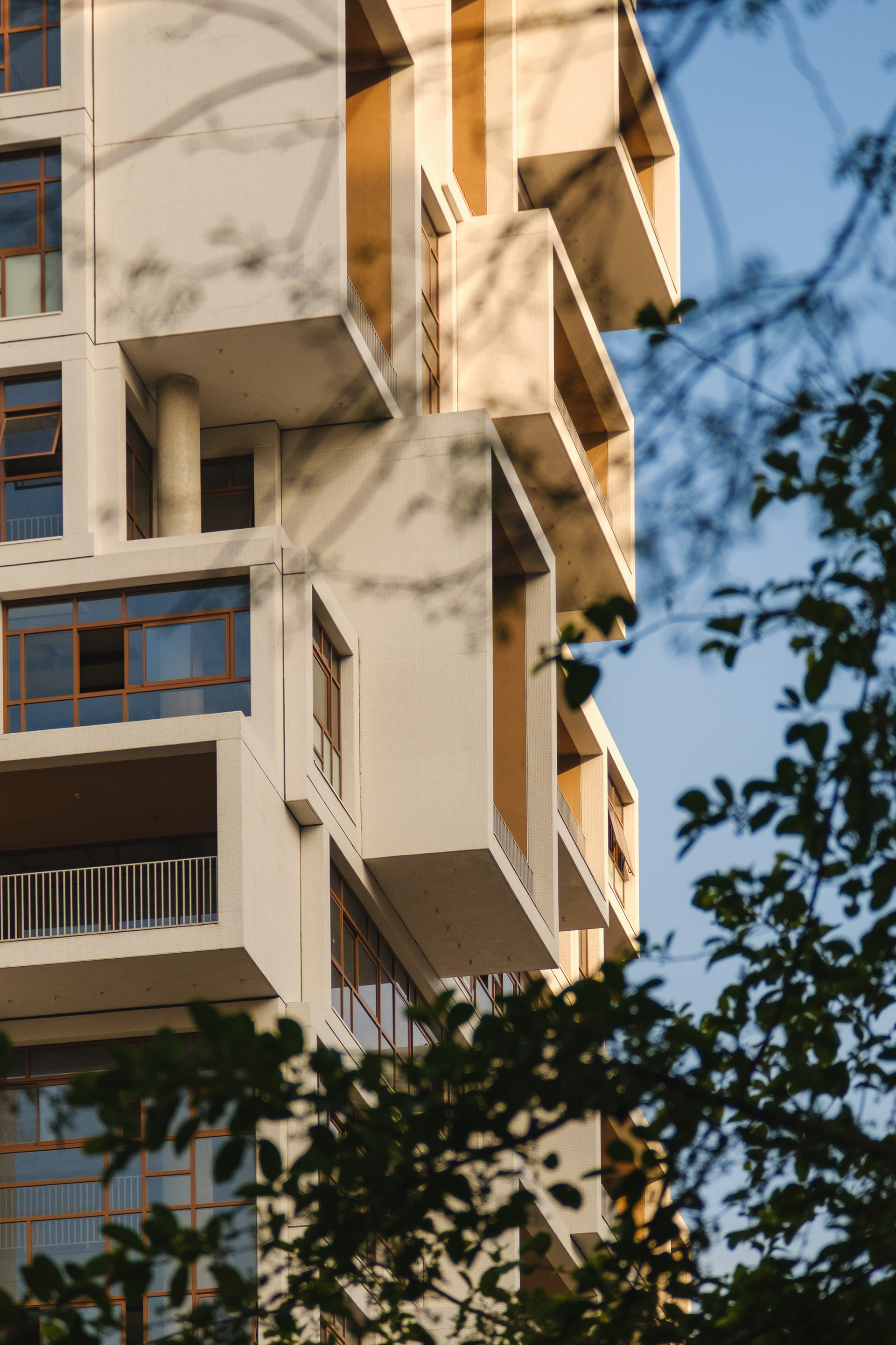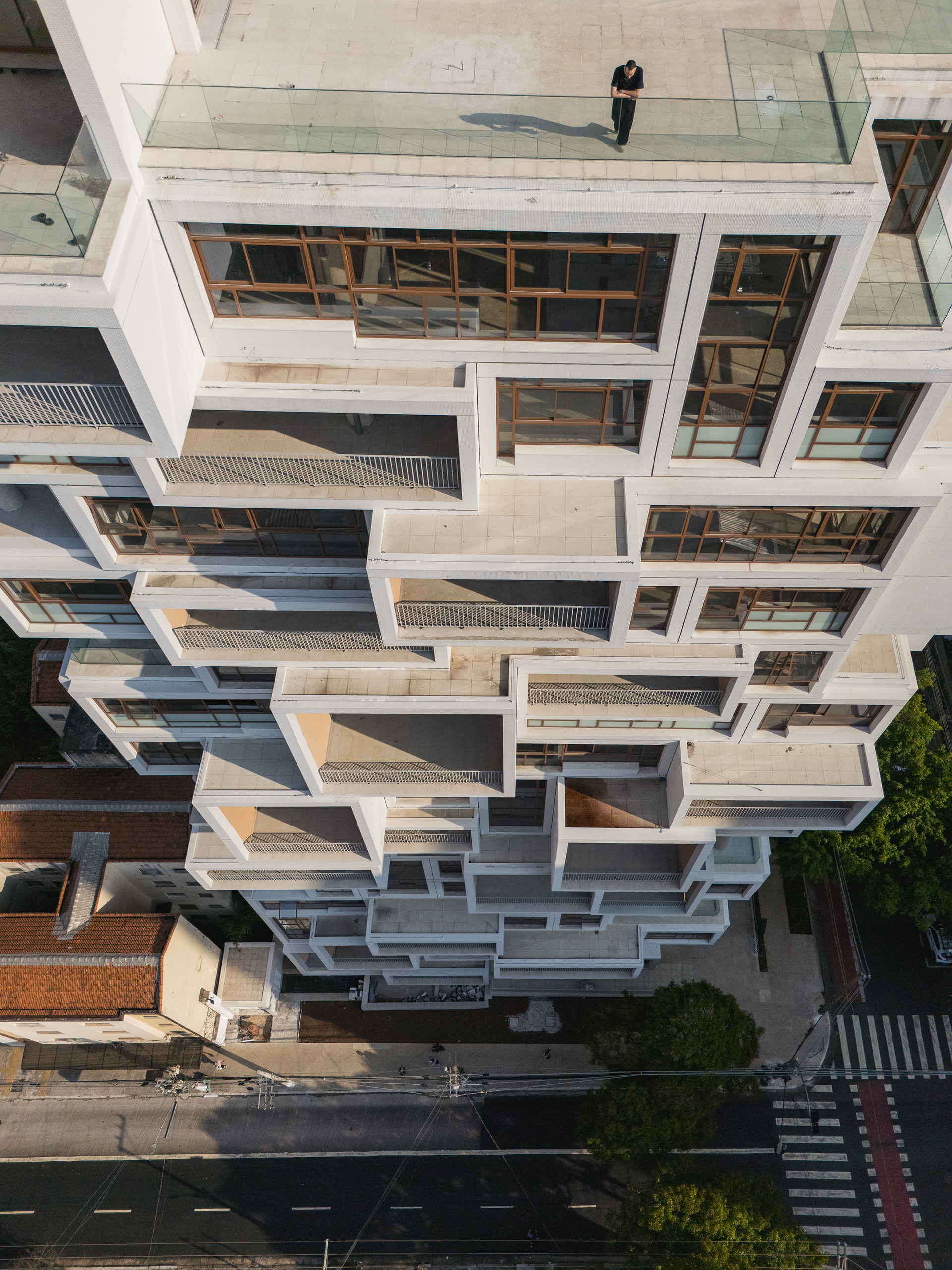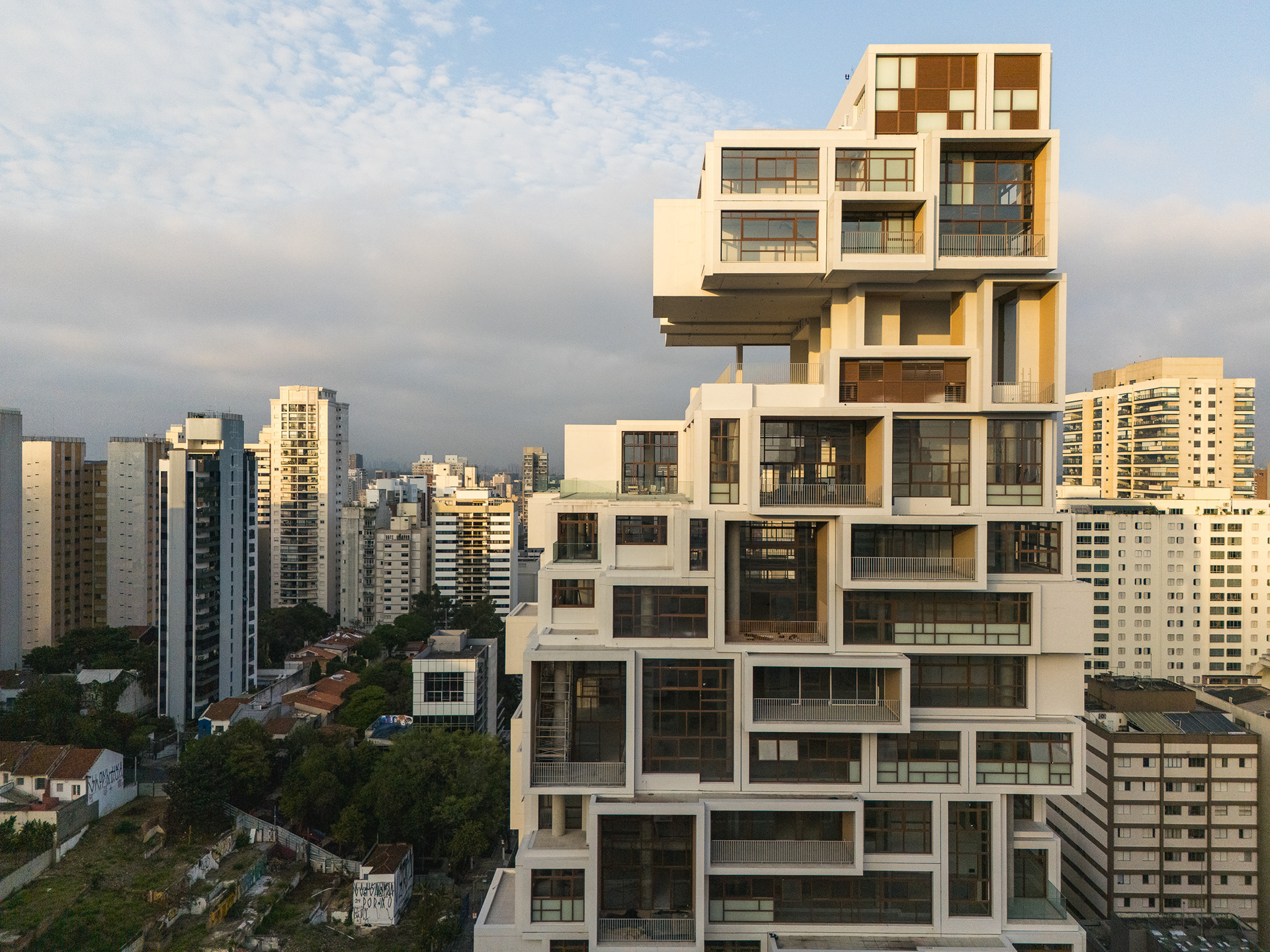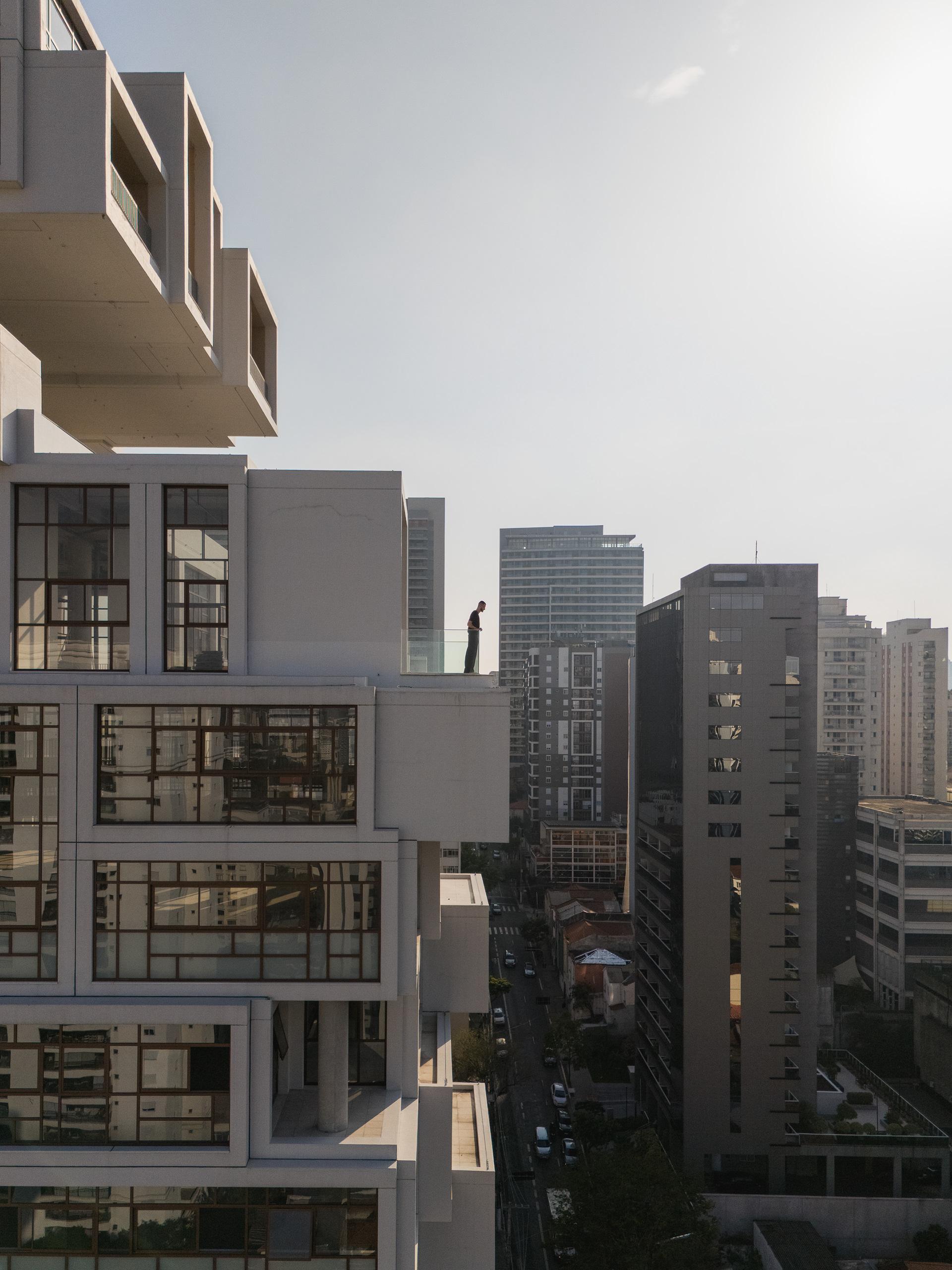 A volumetria da edificação foi concebida através de retângulos de pés direitos simples ou duplos, projetados para frente, que são as varandas, computadas pela legislação andar a andar. Sobre essas varandas, extensas jardineiras com árvores grandes e projeto de Rodrigo Oliveira busca trazer o paisagismo para os diferentes níveis do prédio, ao mesmo tempo que colabora com a vegetação da Cardeal Arcoverde, que é bem escassa. Os mesmos volumes das varandas, quase zerados, compõem com panos de caixilharia que ora abrem como maxim-ar, ora abrem de correr o aspecto geral do prédio. No térreo, amplos recuos trazem uma abertura necessária para pedestres nessa importante esquina, que atualmente sofre com calçadas mínimas.