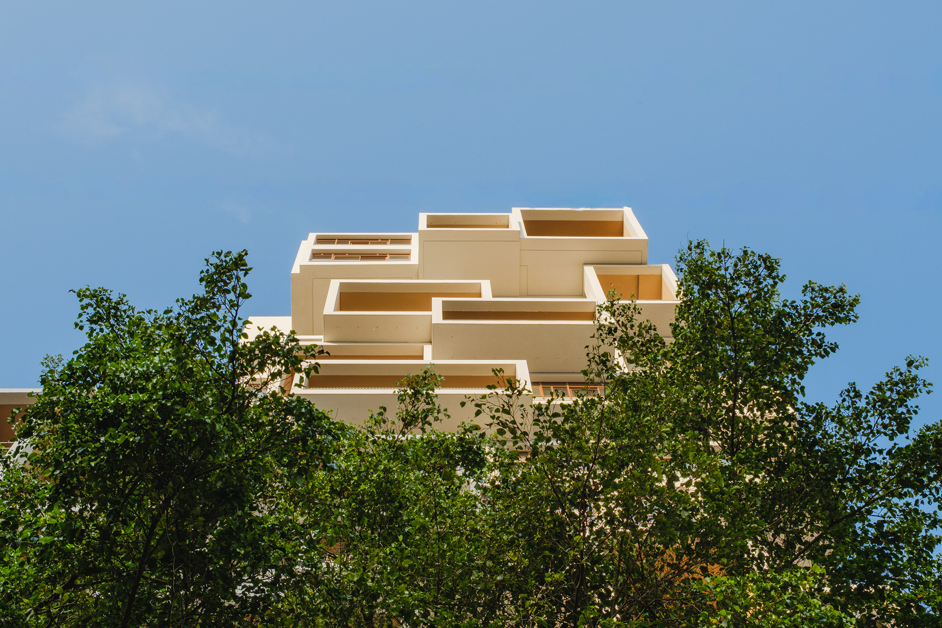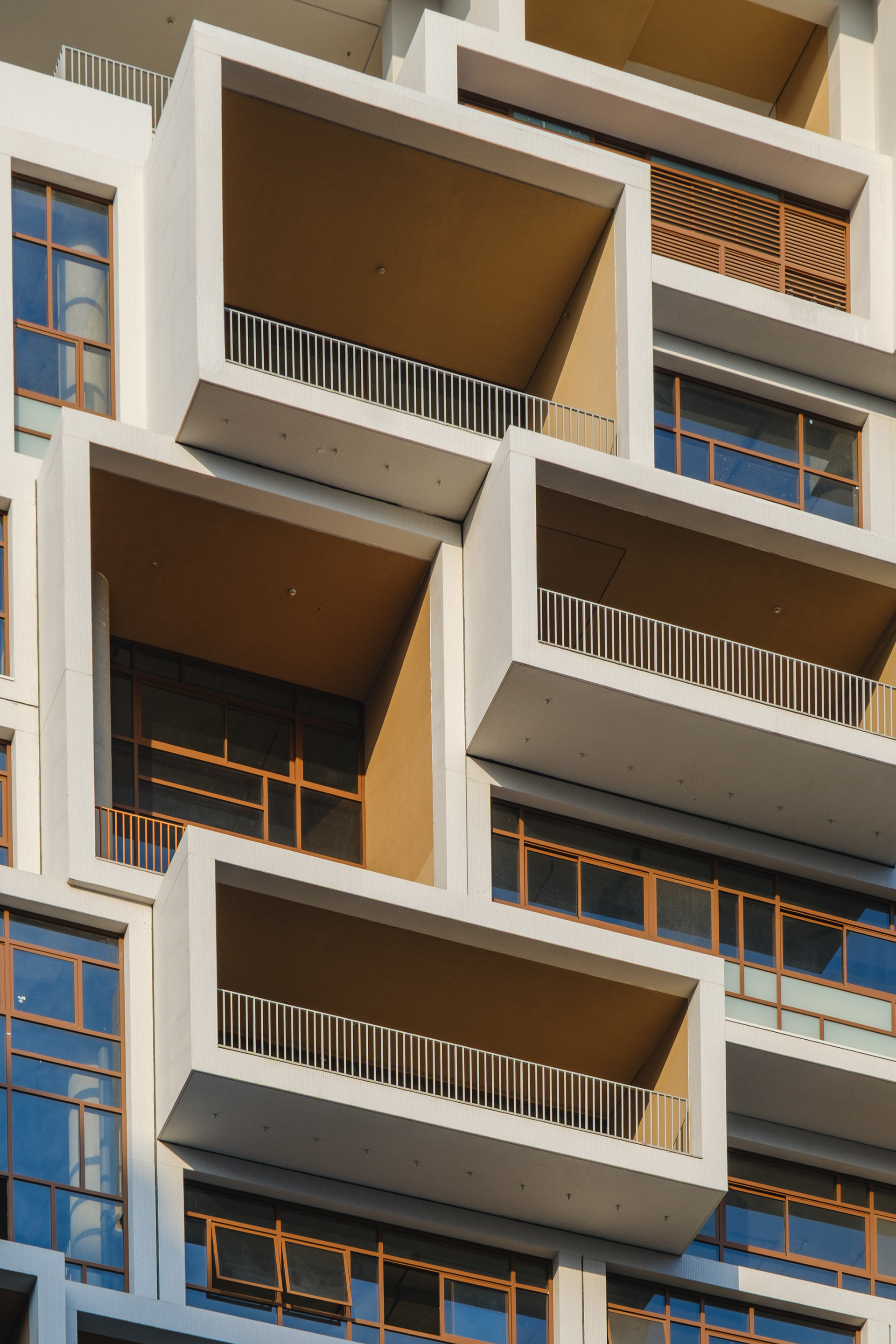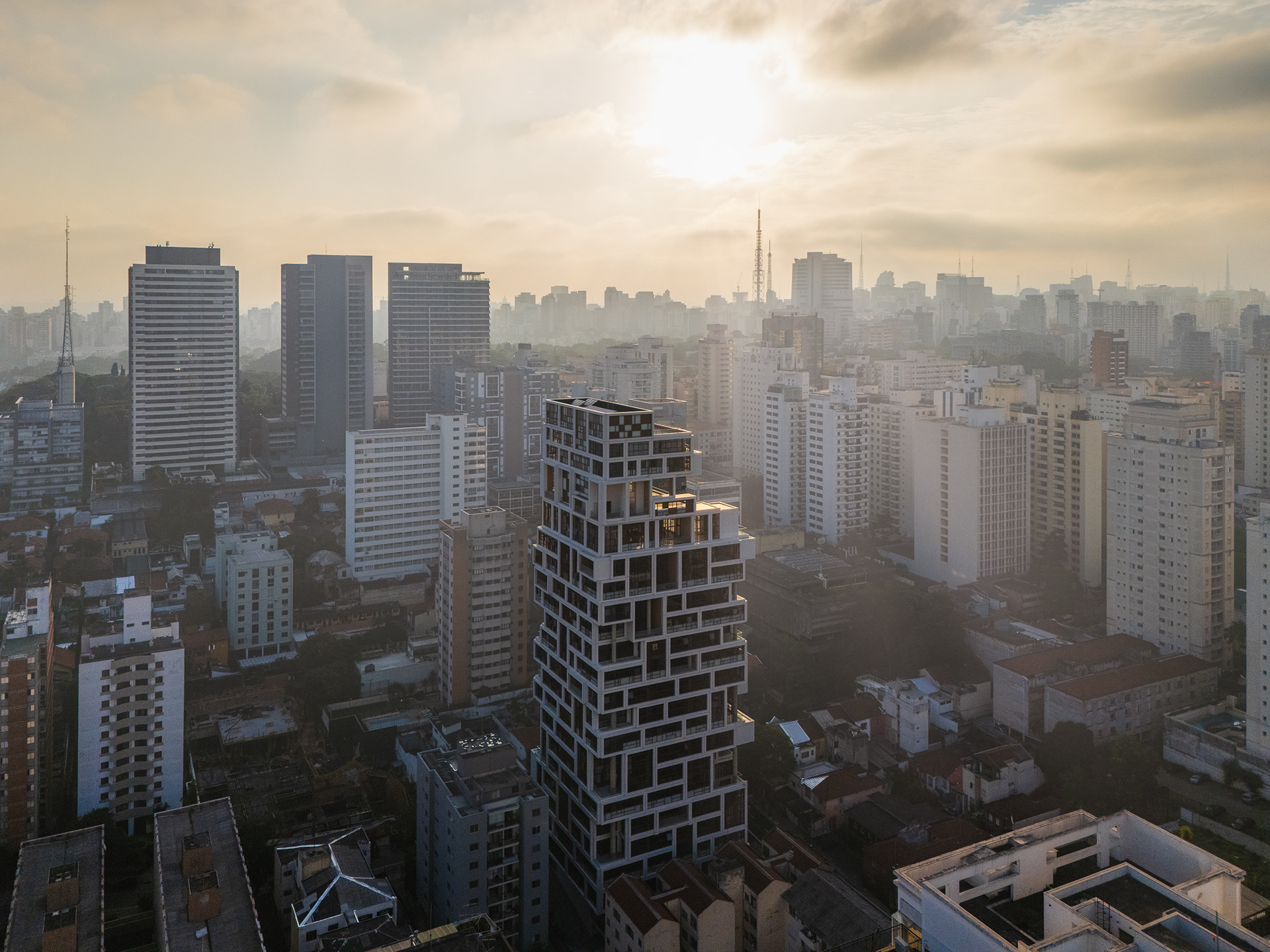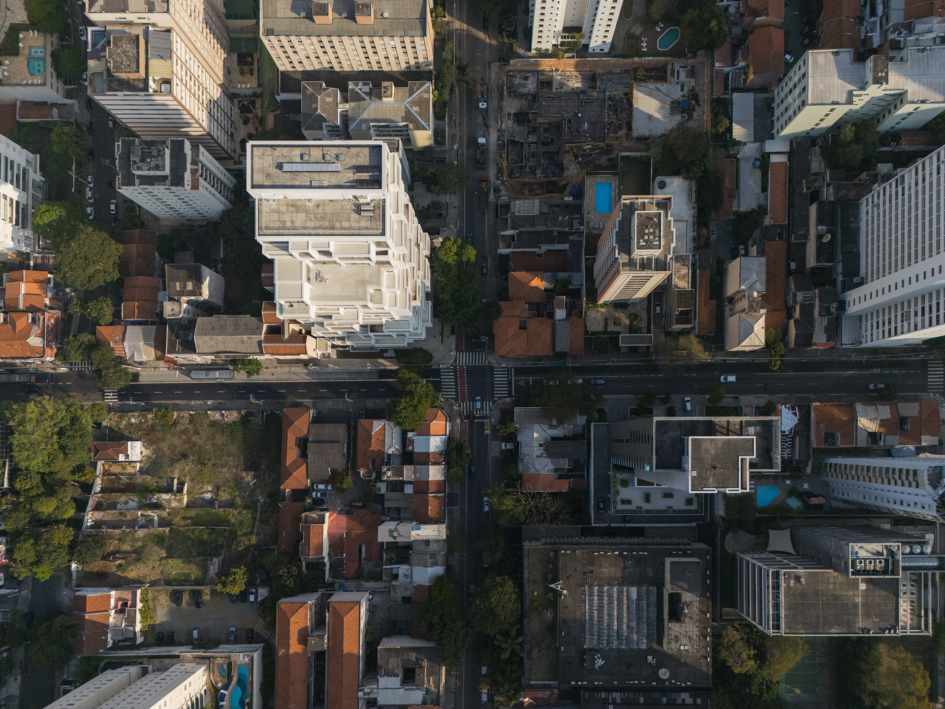 A volumetria da edificação foi concebida através de retângulos de pés direitos simples ou duplos, projetados para frente, que são as varandas, computadas pela legislação andar a andar. Sobre essas varandas, extensas jardineiras com árvores grandes e projeto de Rodrigo Oliveira busca trazer o paisagismo para os diferentes níveis do prédio, ao mesmo tempo que colabora com a vegetação da Cardeal Arcoverde, que é bem escassa. Os mesmos volumes das varandas, quase zerados, compõem com panos de caixilharia que ora abrem como maxim-ar, ora abrem de correr o aspecto geral do prédio. No térreo, amplos recuos trazem uma abertura necessária para pedestres nessa importante esquina, que atualmente sofre com calçadas mínimas.