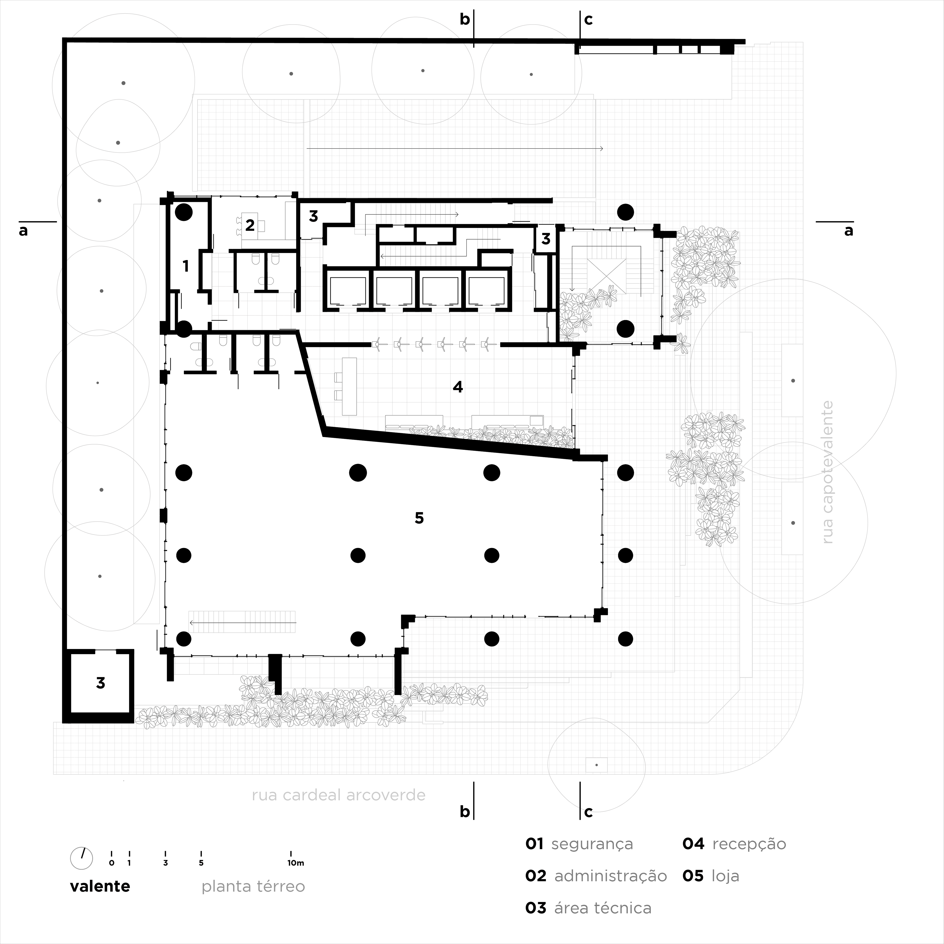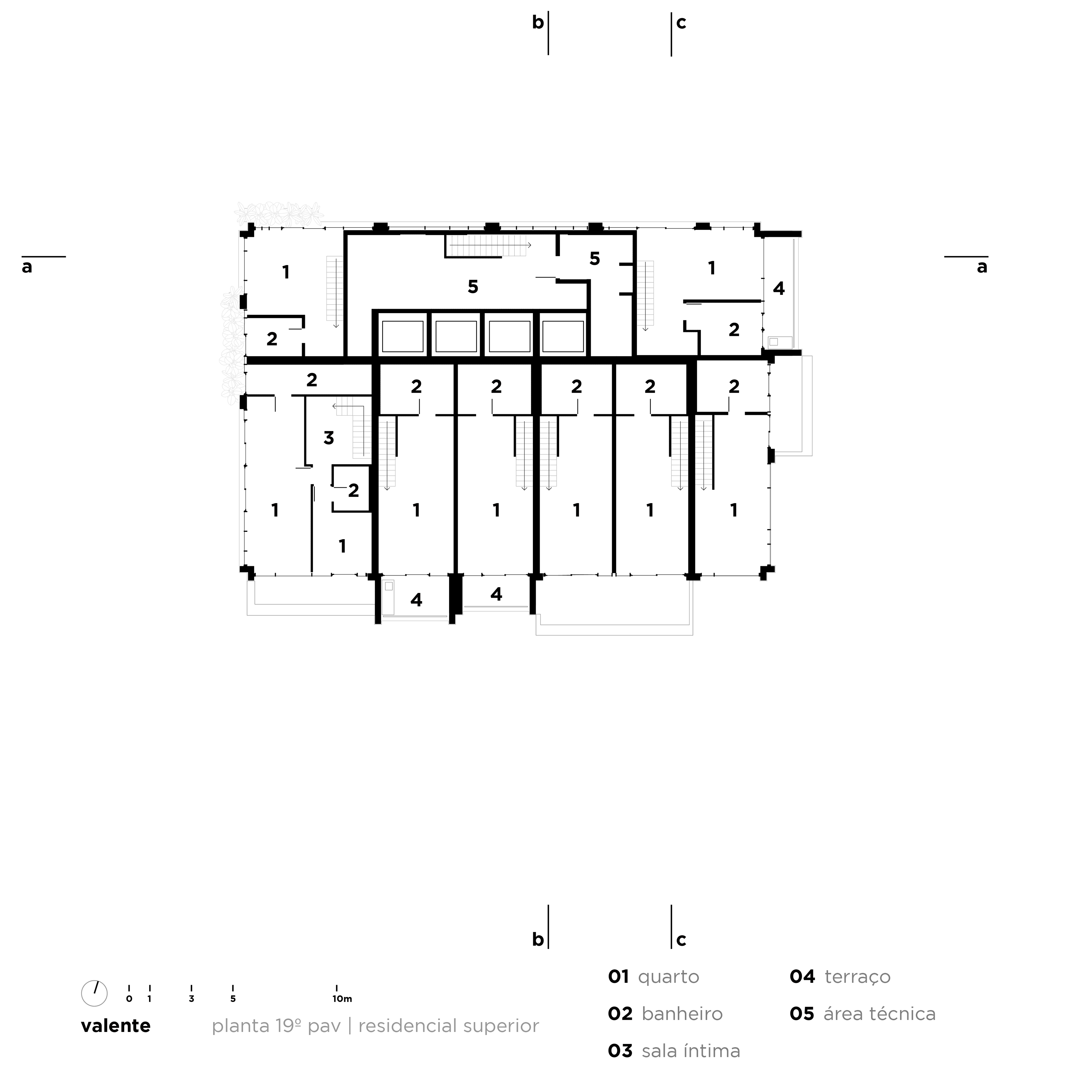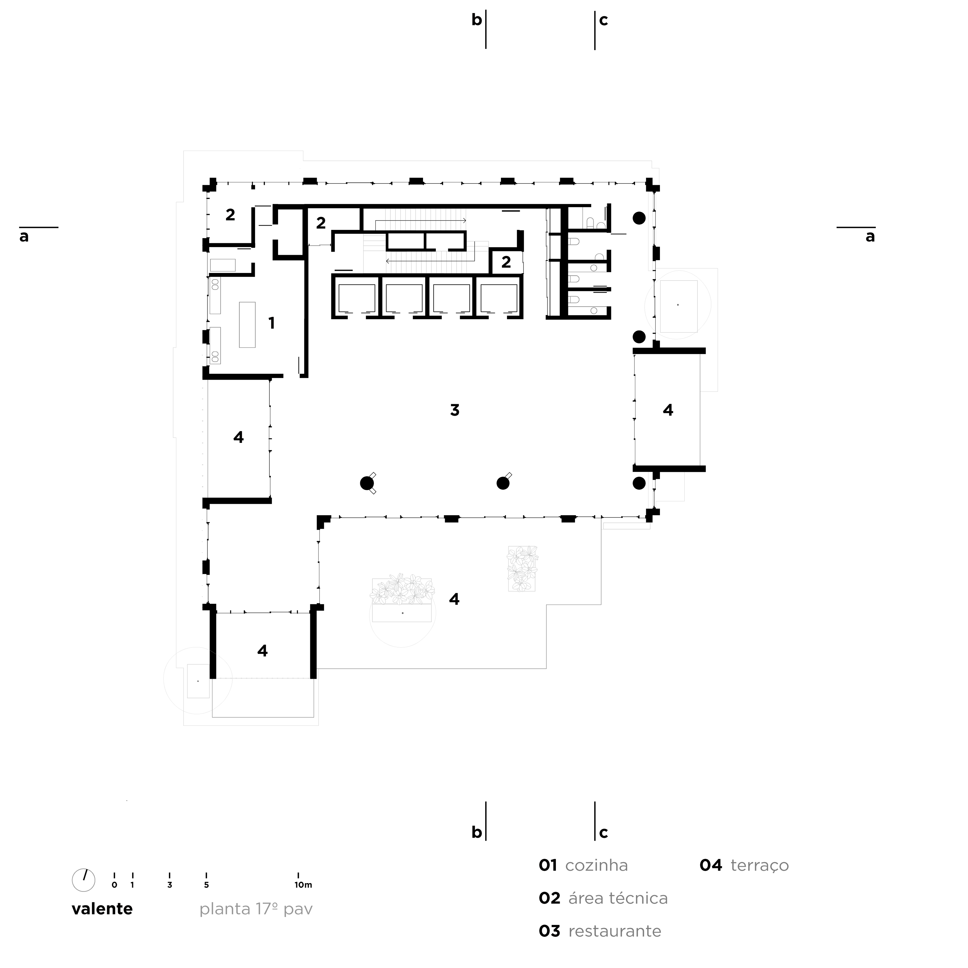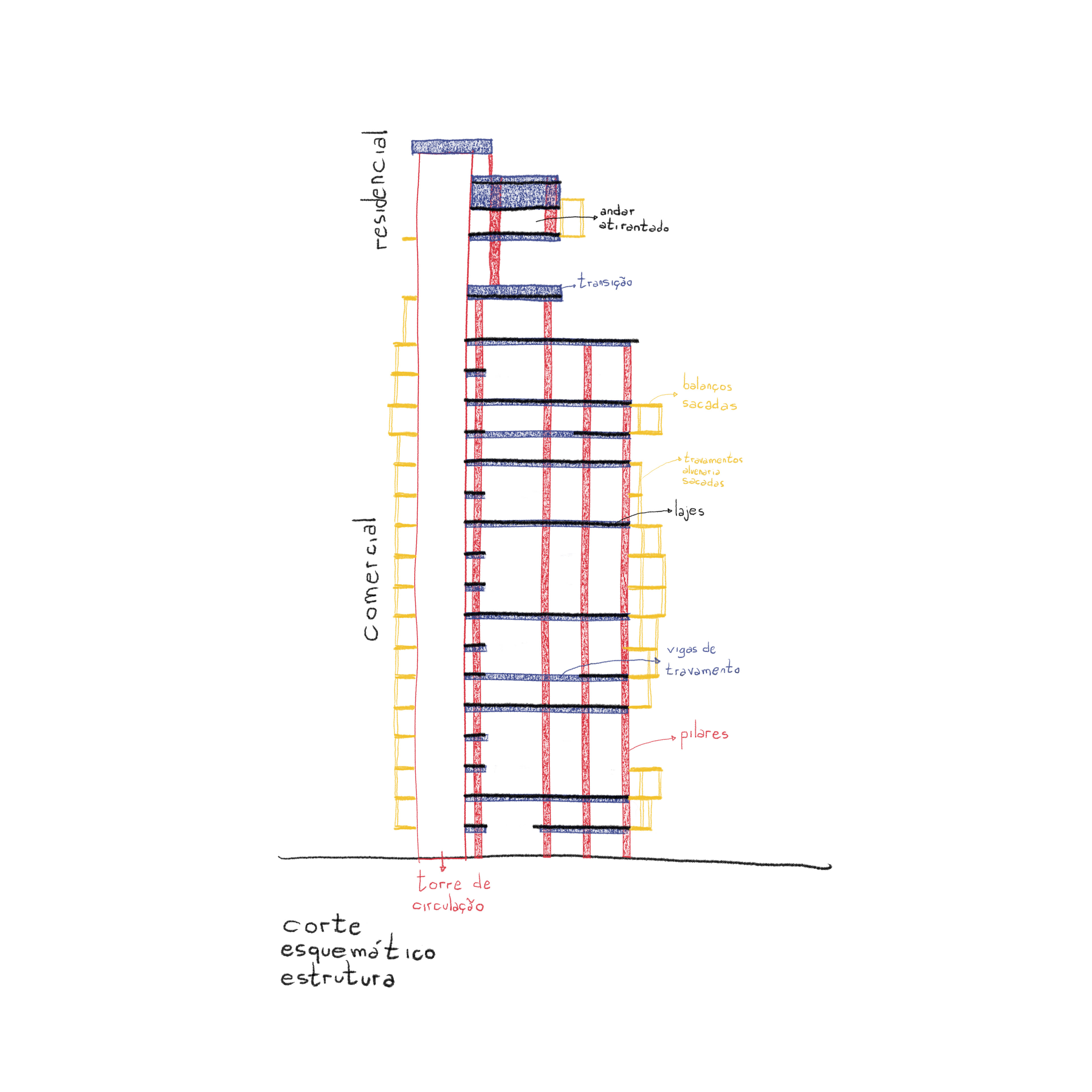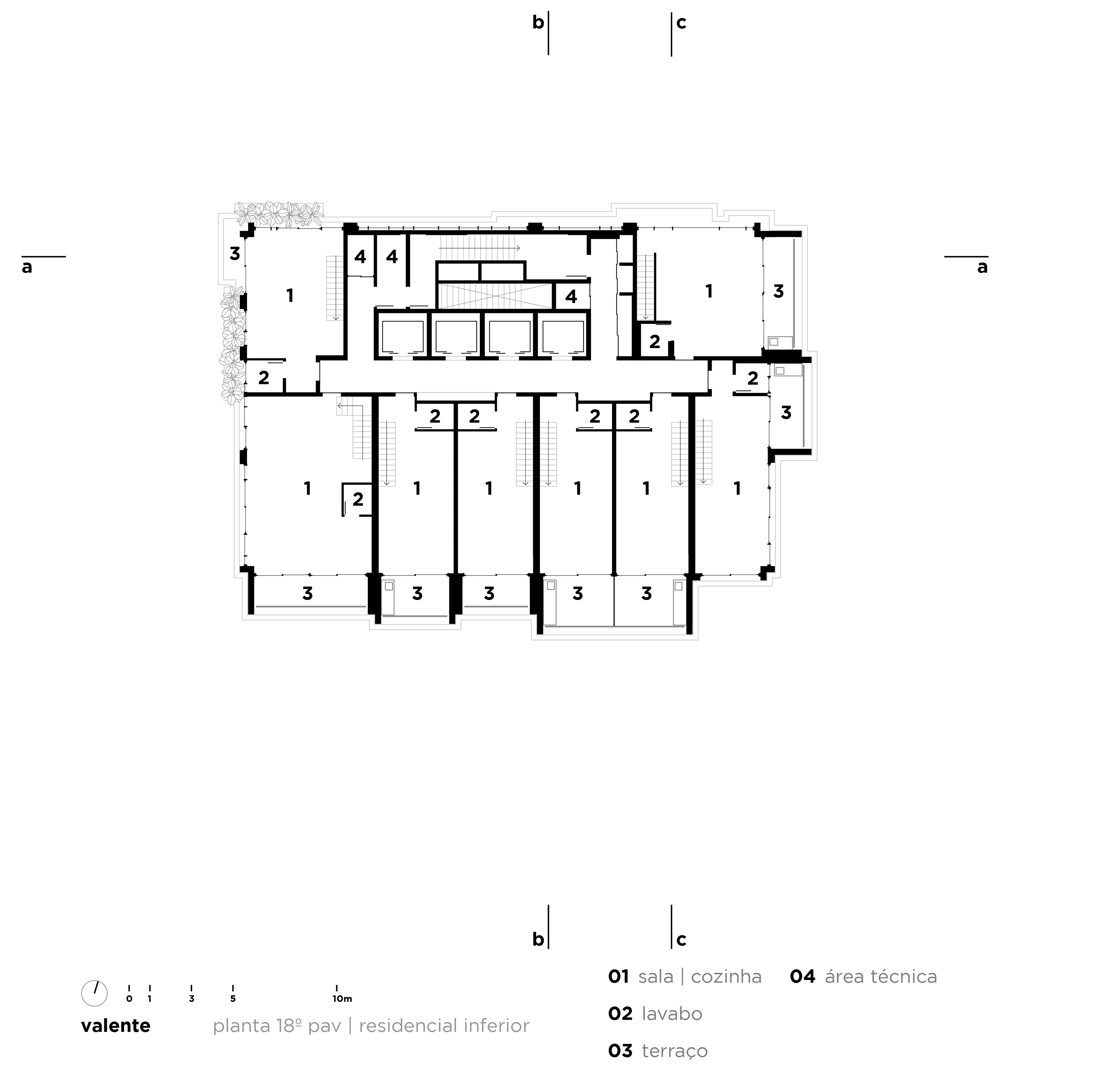 Após o estudo de algumas versões e diferentes organizações levando em conta complexidades de corpo de bombeiros e legislação, chegamos a uma ocupação que tem fachada ativa e hall no pavimento térreo, três triplex consecutivos, três duplex e um espaço com pé direito e meio que se abre para uma praça no 17 pavimento, com muito verde em uma praça suspensa no 18 andar, que se trata de um coringa – é pensado para um restaurante que aproveite a praça e a exuberante vista que se tem dessa altura, mas apenas com o locatário final validaremos essa proposta. Os últimos dois andares são apartamentos residenciais para locação, com diversos tamanhos e layouts.